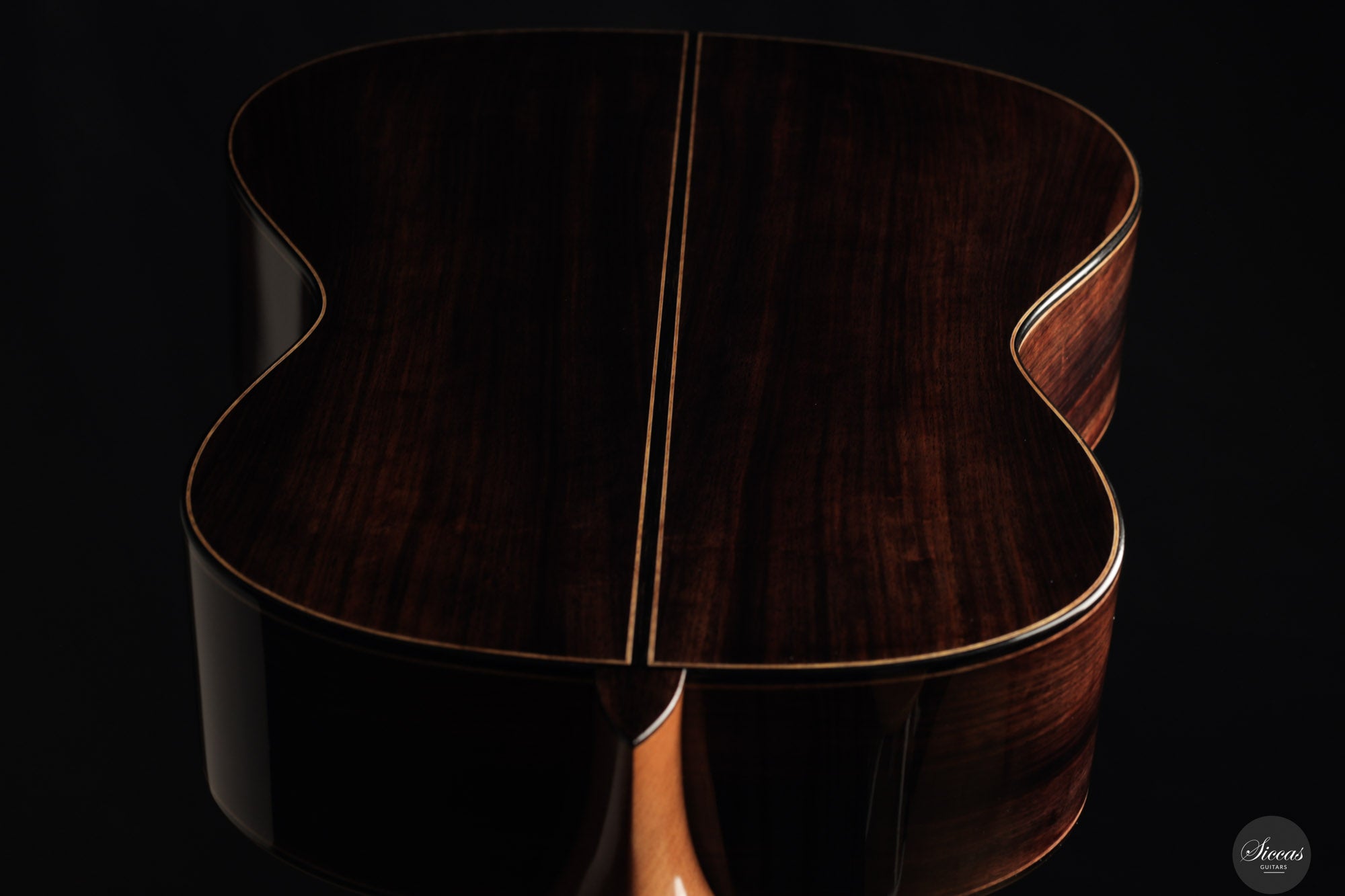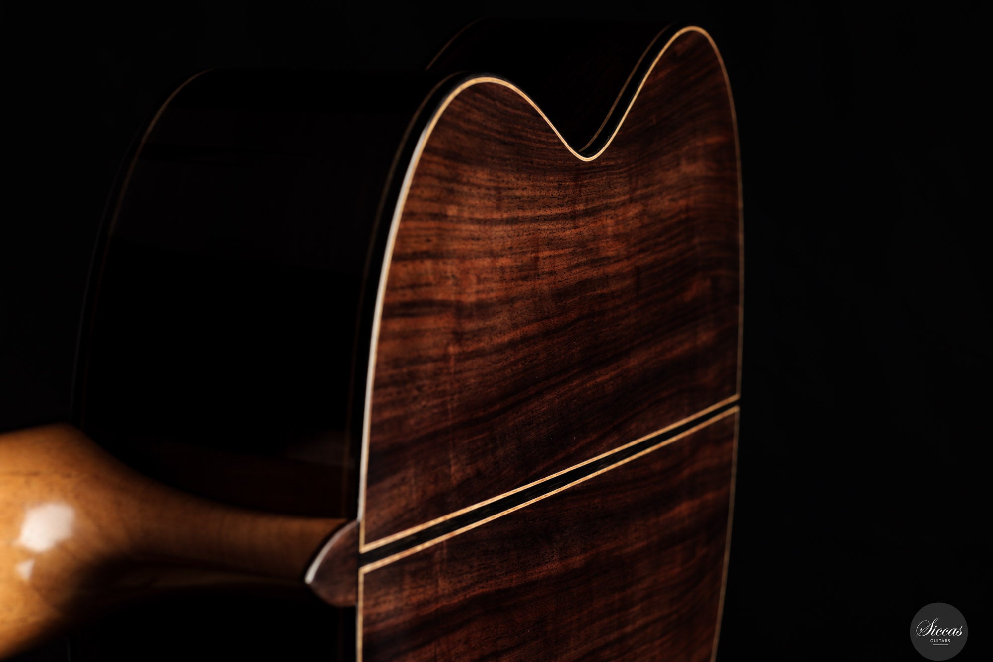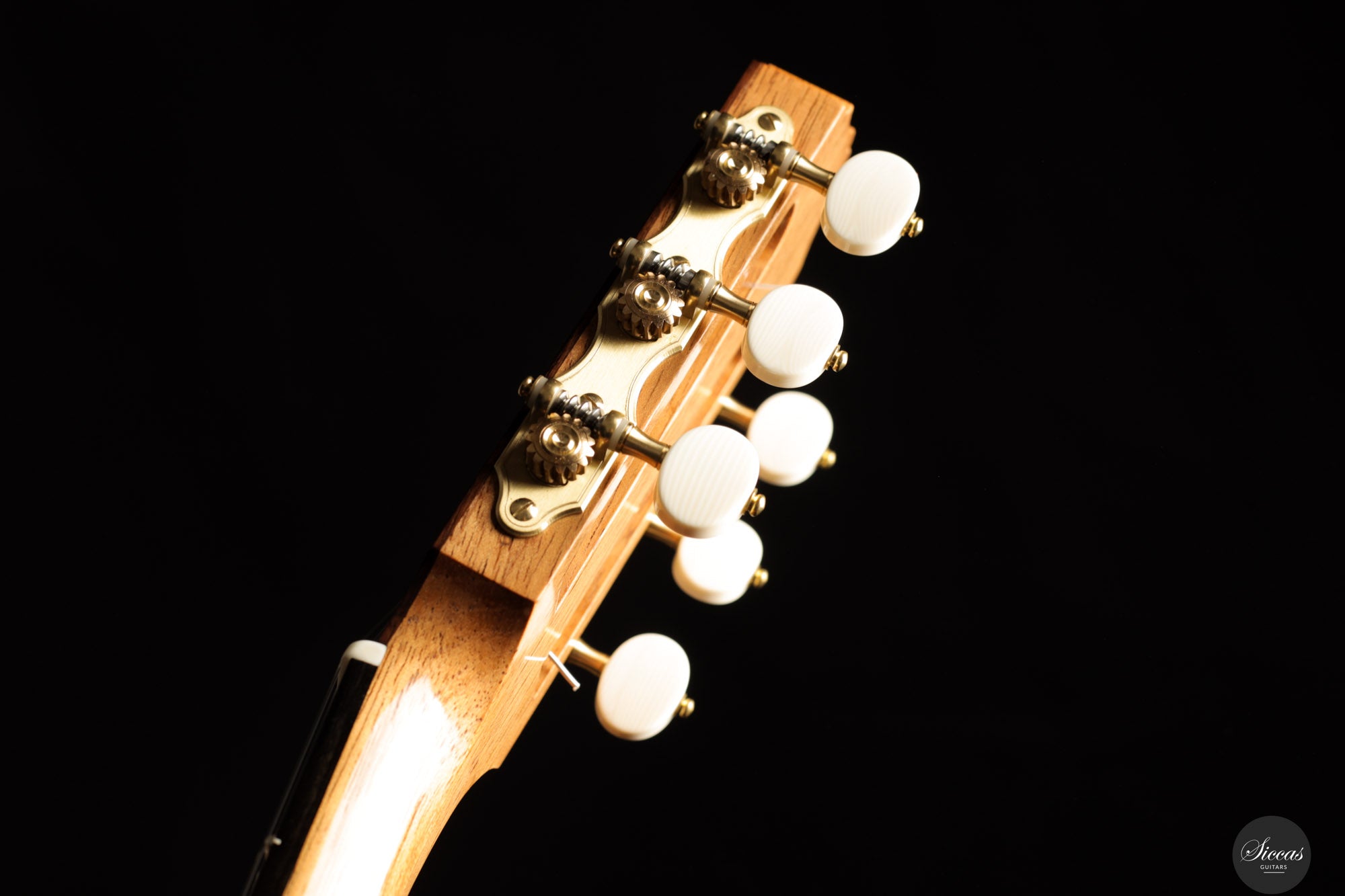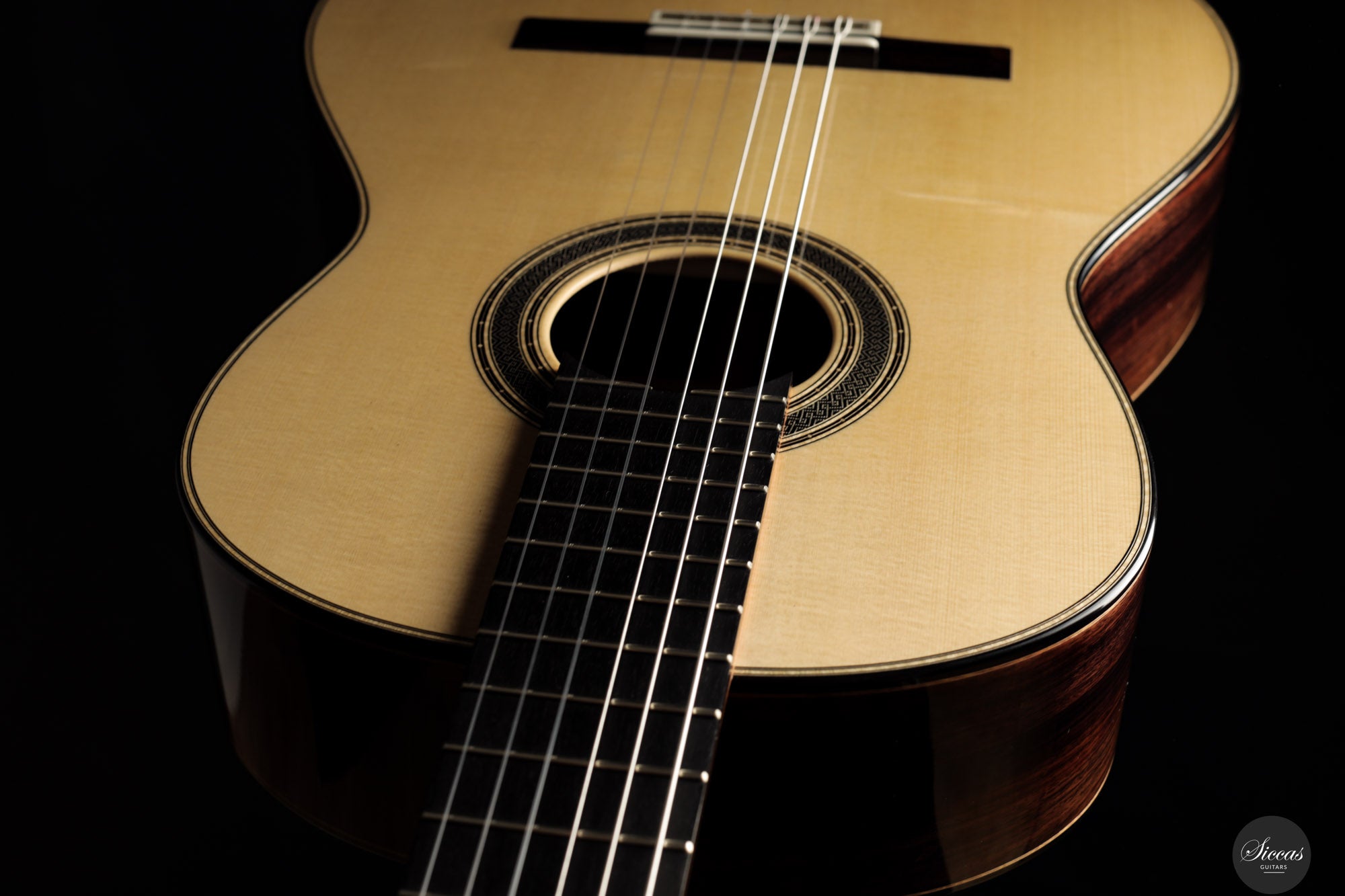This 2025 concert guitar, numbered 14, marks a further step in Dantone’s evolution as a maker. It features a five-fan bracing system, a departure from the seven-fan layout he employed earlier, with the goal of achieving greater projection and tonal purity. Some of the braces are made of local spruce while others are of aged larch, complemented by an under-bridge sound bar. With its spruce top and Indian rosewood back and sides, the instrument has an air body resonance around G, offering a powerful yet elegant voice. The rosette design has been simplified to emphasize the natural beauty of the wood, and the slightly elevated fingerboard, with increased ebony thickness, allows both improved comfort in the higher positions and future adjustability while preserving a traditional appearance. The result is a guitar with a brilliant, full sound, remarkable clarity between voices, and a very wide dynamic range. It offers both immediate response and ample headroom, making it suitable for intimate playing as well as concert projection. This instrument demonstrates how Dantone’s work, inspired by Torres and Bouchet, has matured into a personal style of great distinction.