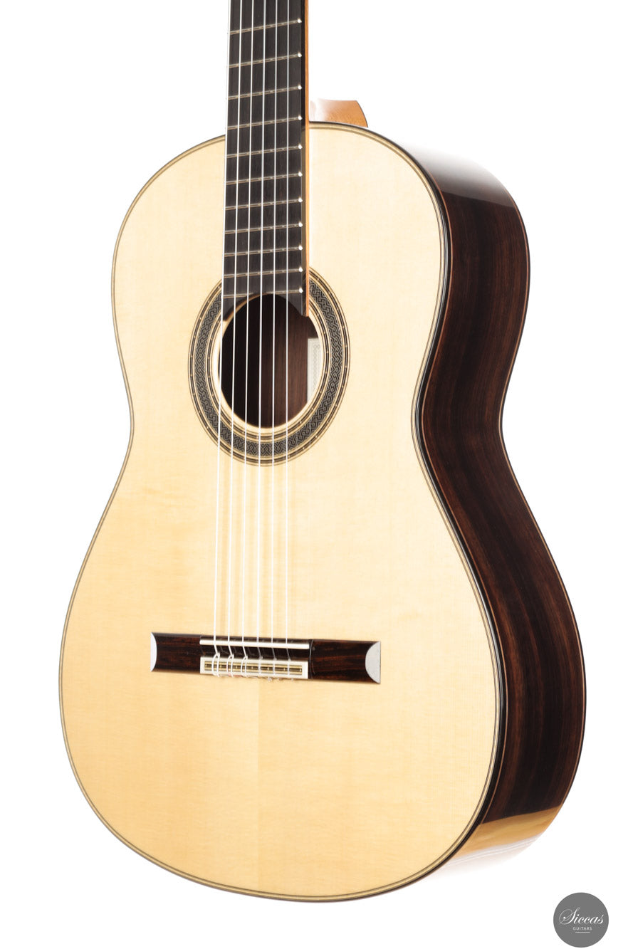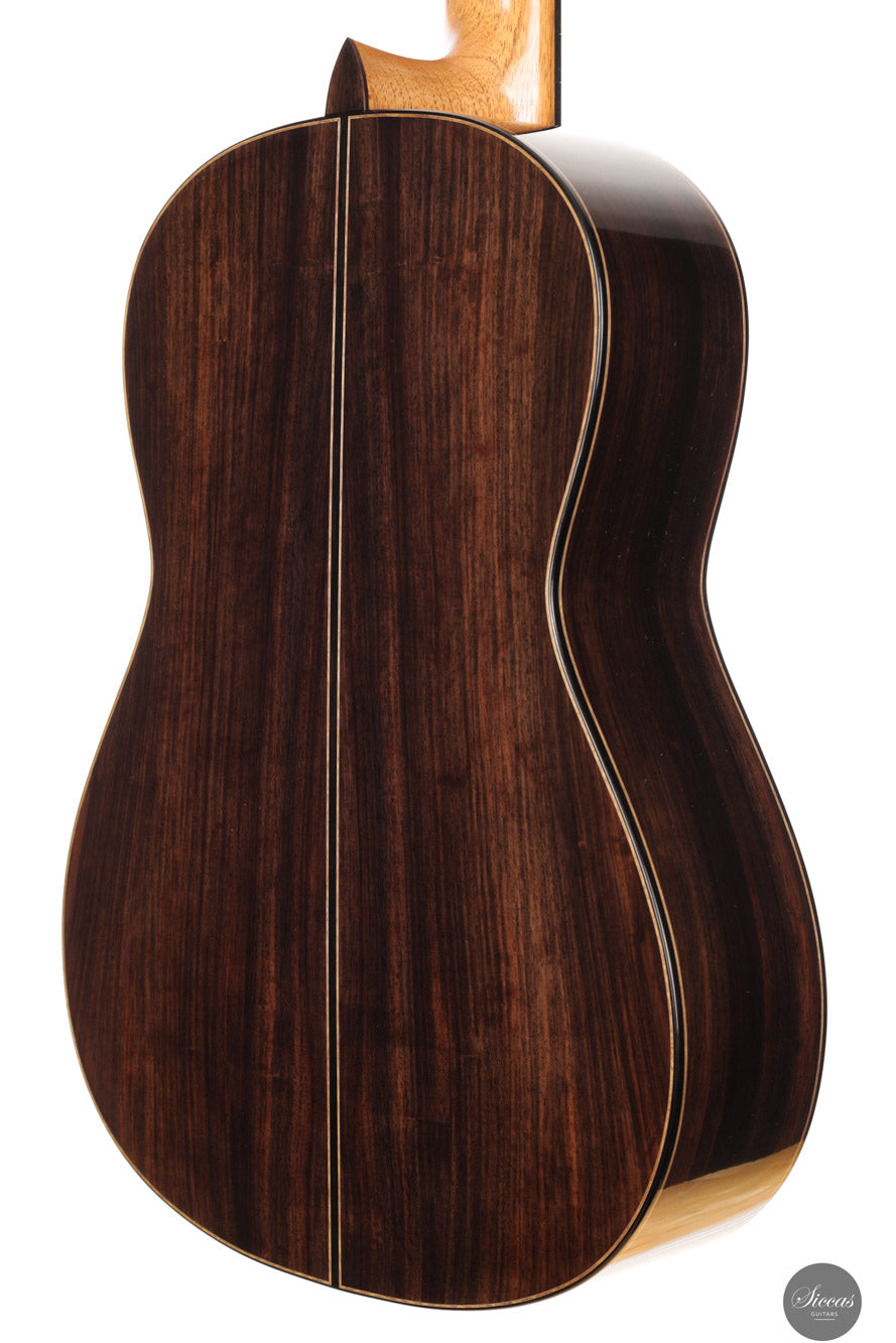 The Raffaele Dantone No. 14 from 2025 illustrates the Italian luthier’s ongoing refinement of traditional concepts into a distinctive personal voice. Built with a spruce top and Indian rosewood back and sides, it employs a newly developed five-fan bracing system of spruce and aged larch, supported by an under-bridge bar, to achieve both projection and tonal purity. Its air resonance around G provides depth and stability, while the slightly elevated ebony fingerboard ensures comfort in higher positions without departing from a classical aesthetic. The guitar responds with brilliance, fullness, and clarity, offering a wide dynamic range and excellent separation of voices. Immediate in attack yet with ample reserves, it adapts equally well to intimate and large settings, reflecting Dantone’s ability to blend Torres and Bouchet traditions with his own matured style.