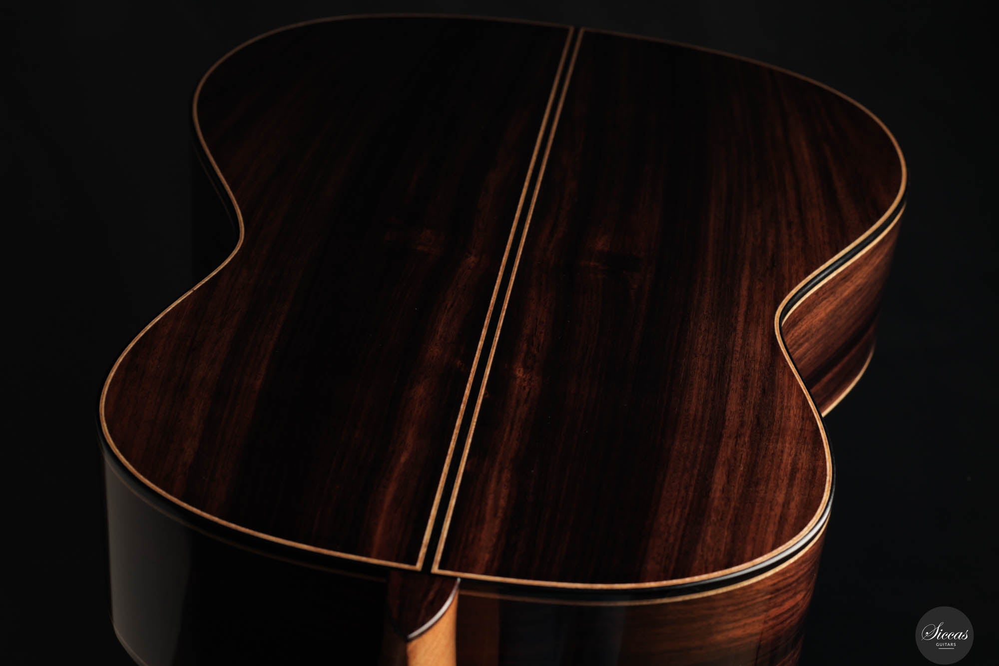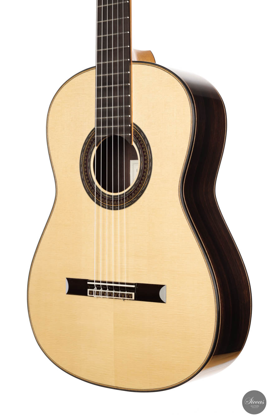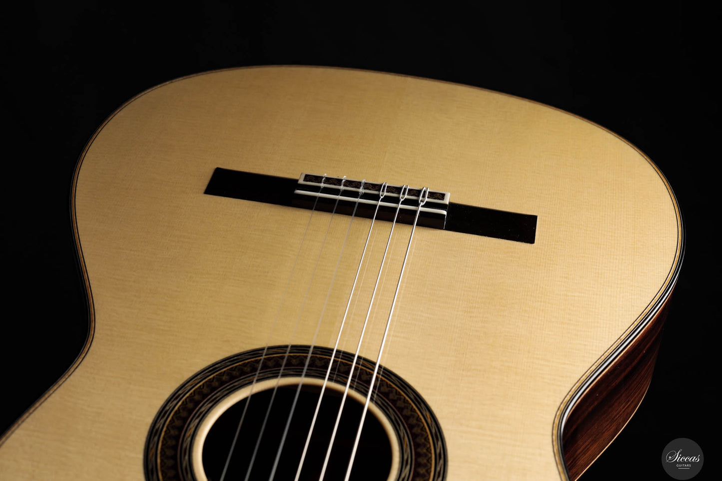 This 2025 No. 11 guitar is a wonderful example of Raffaele Dantone’s talent and dedication to his craft. Inspired by the traditional fan bracing of Antonio de Torres, he has taken the design further by incorporating thicker sides, enhancing structural stability and notably improving projection and tonal depth. The spruce top and Indian rosewood back and sides are beautifully crafted, showcasing Raffaele’s refined aesthetic sensibilities and precision. The result is an instrument with crystal-clear trebles that soar effortlessly, and deep, full-bodied basses with a main resonance around F#, providing excellent balance and richness across the registers.
