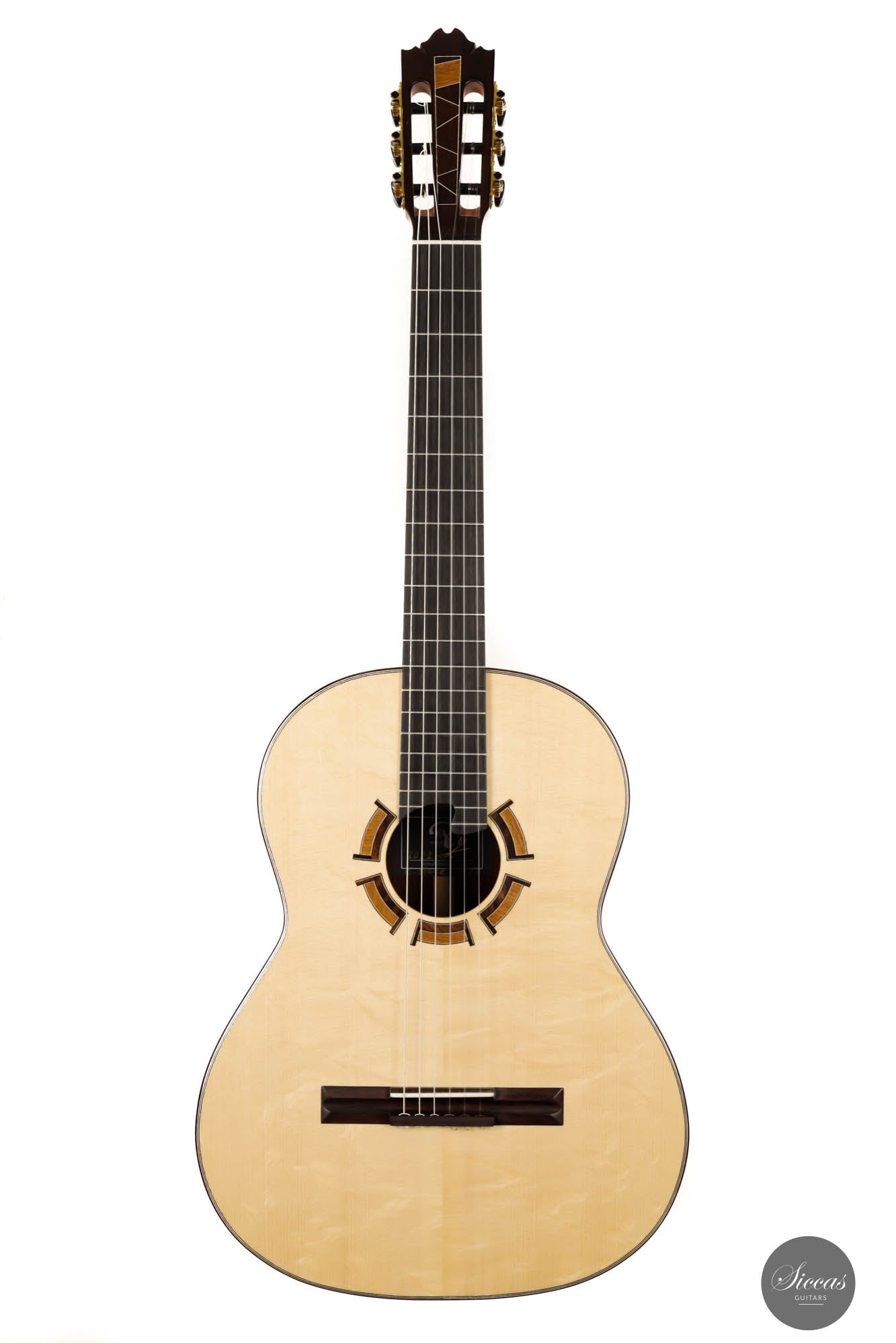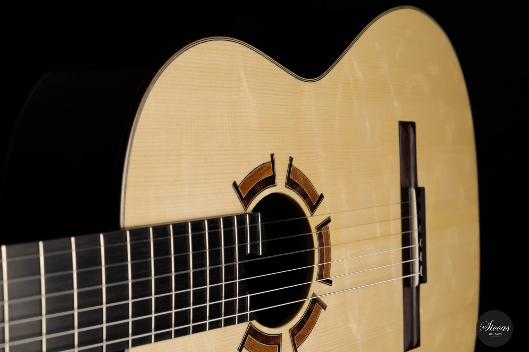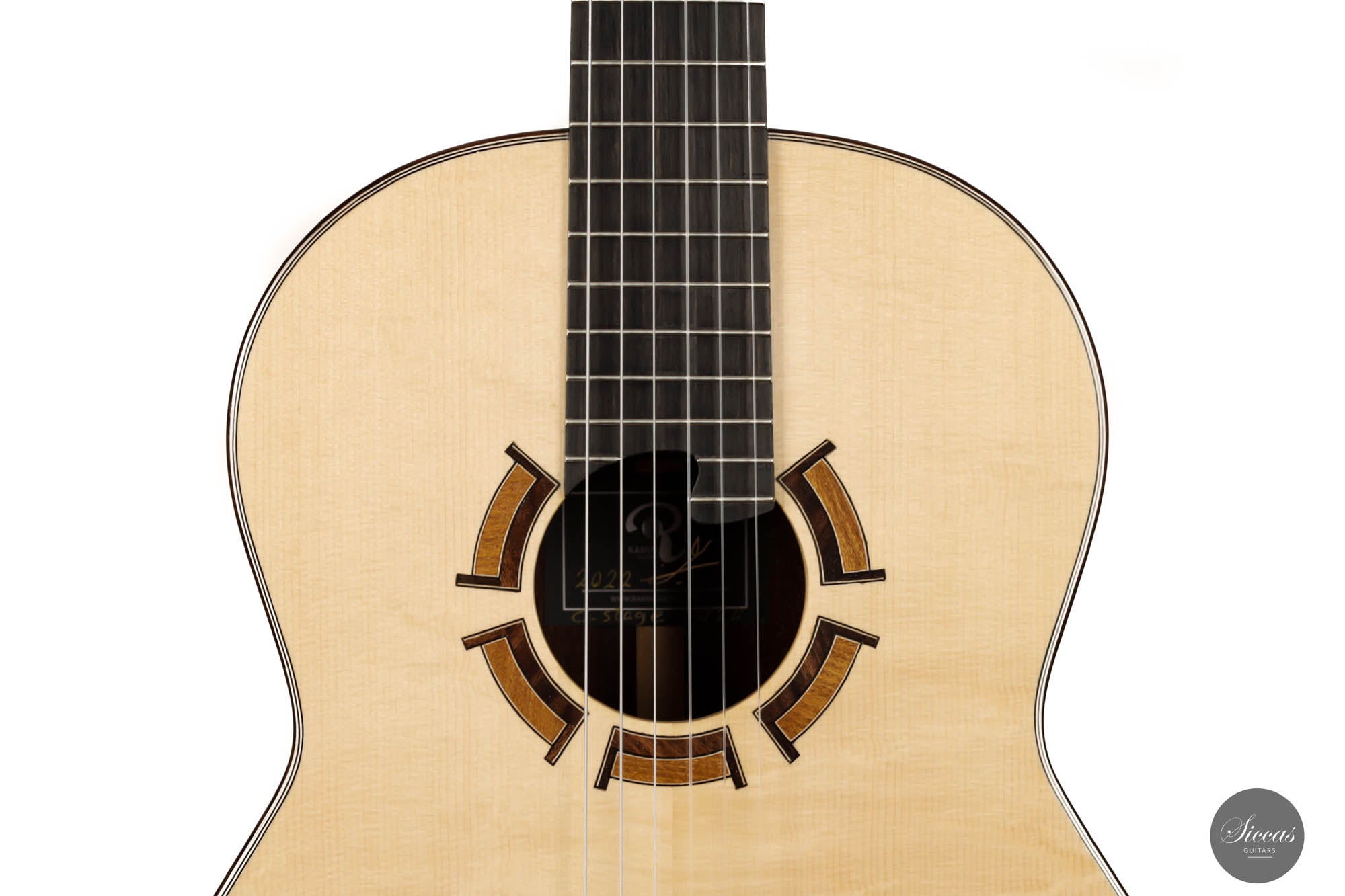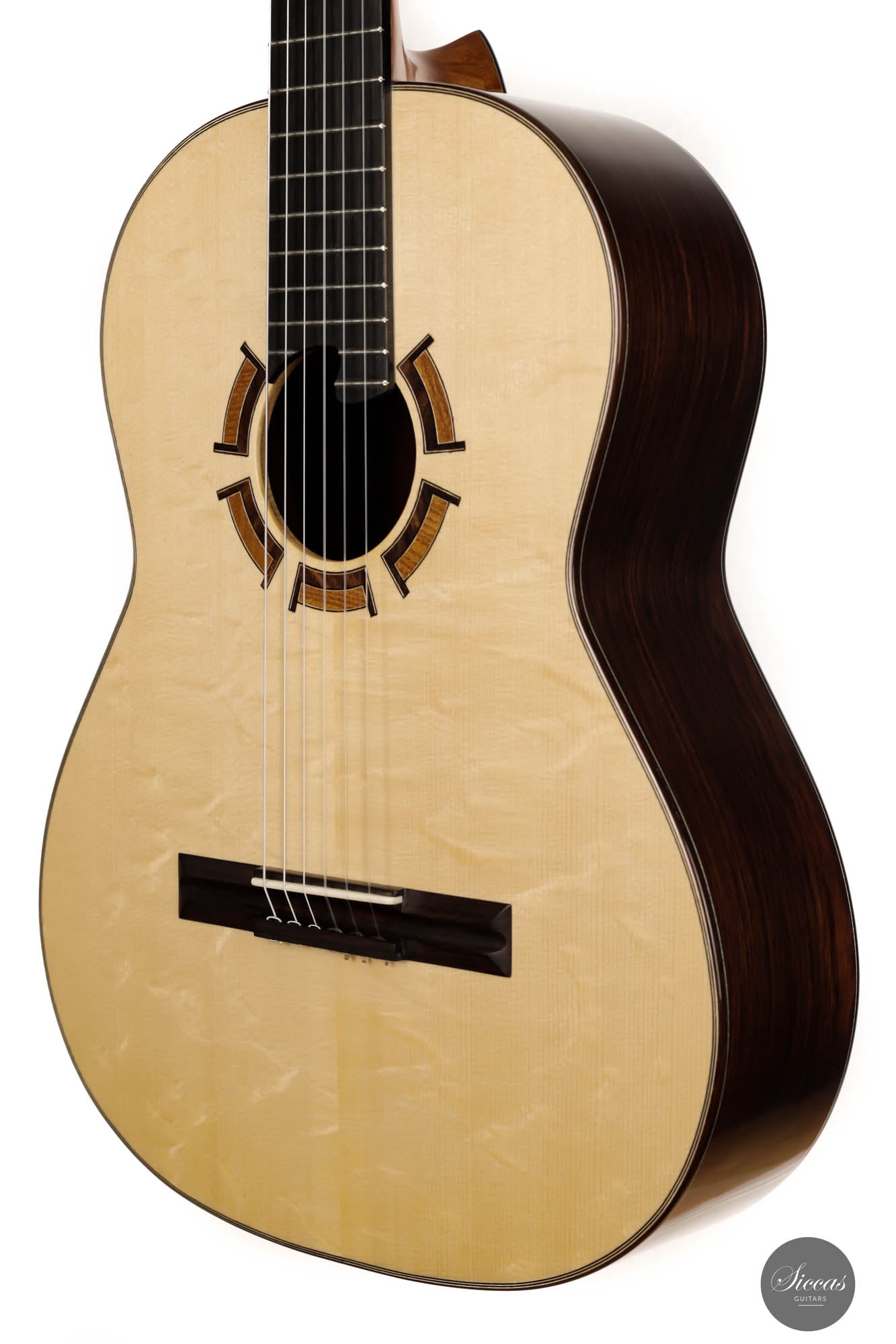 This guitar, no. 424 is a beautiful-sounding instrument in all regards. It has a beautiful bearclaw spruce soundboard and precious Amazonas rosewood back and sides which are a treat to the eyes. As a traditionally built instrument, it also has several advantages of the modern concert instrument, such as a unique design sound port and an outstanding volume that will easily fulfill the needs of concert performers in any situation. Moreover, it has an exceptional balance between every voice of this instrument. The responsive basses do not overpower the other voices and vice versa. This guitar is a budget-friendly instrument that offers a vast range of possibilities for the guitarist to explore.