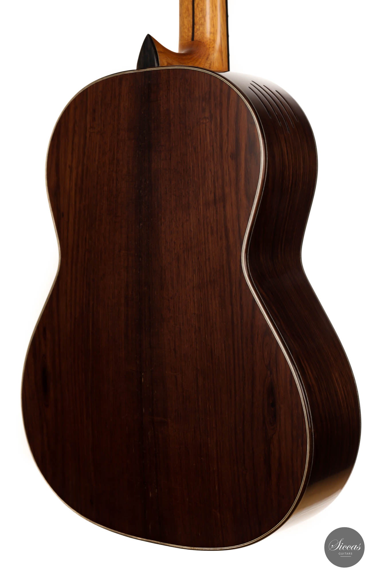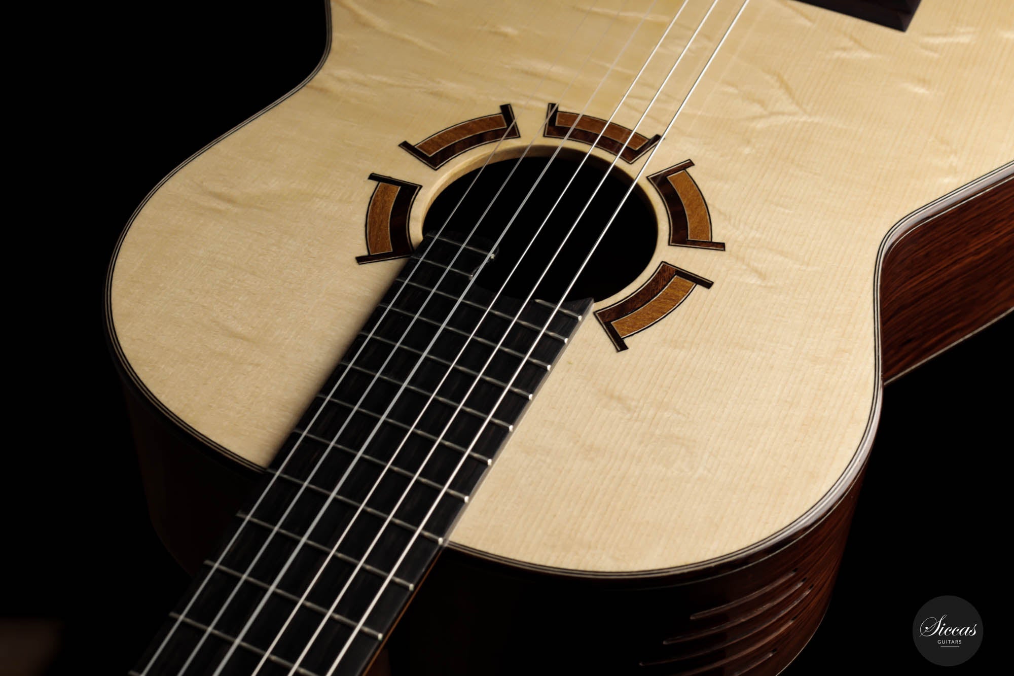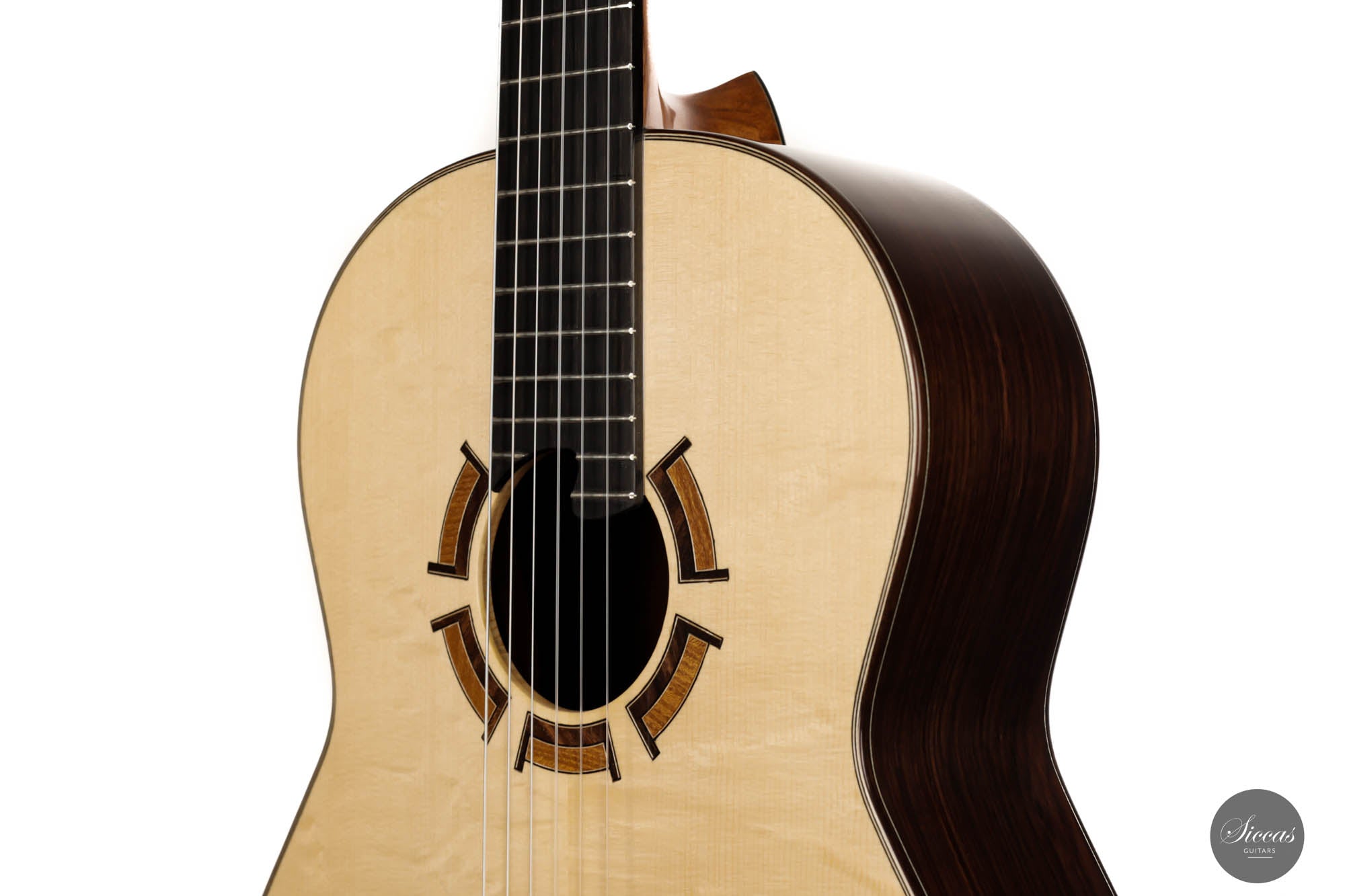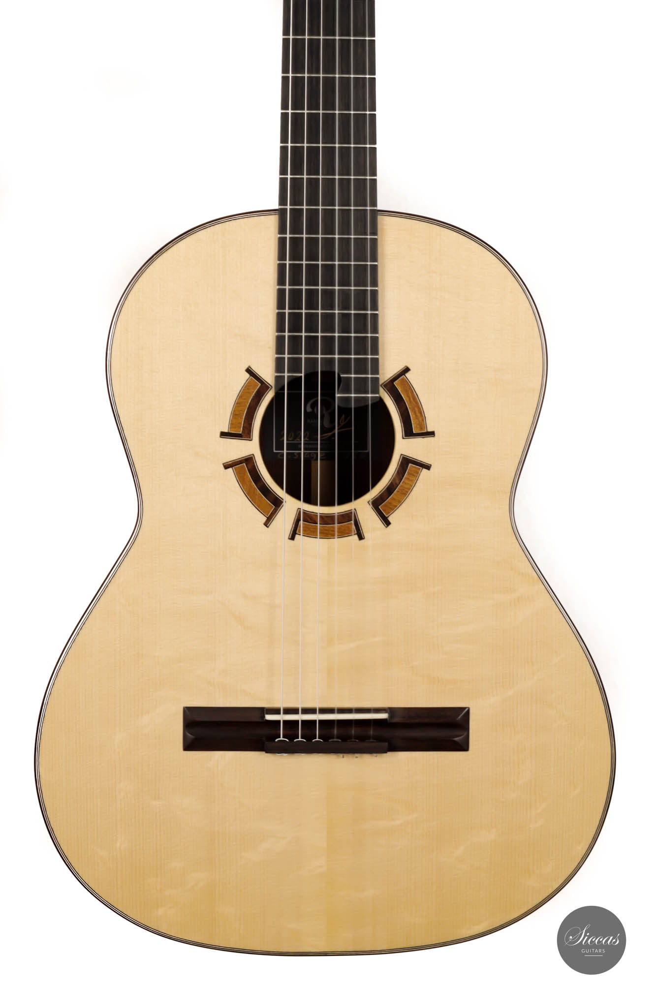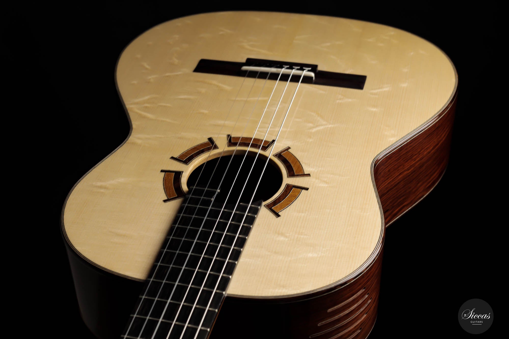 This guitar, no. 424 is a beautiful-sounding instrument in all regards. It has a beautiful bearclaw spruce soundboard and precious Amazonas rosewood back and sides which are a treat to the eyes. As a traditionally built instrument, it also has several advantages of the modern concert instrument, such as a unique design sound port and an outstanding volume that will easily fulfill the needs of concert performers in any situation. Moreover, it has an exceptional balance between every voice of this instrument. The responsive basses do not overpower the other voices and vice versa. This guitar is a budget-friendly instrument that offers a vast range of possibilities for the guitarist to explore.