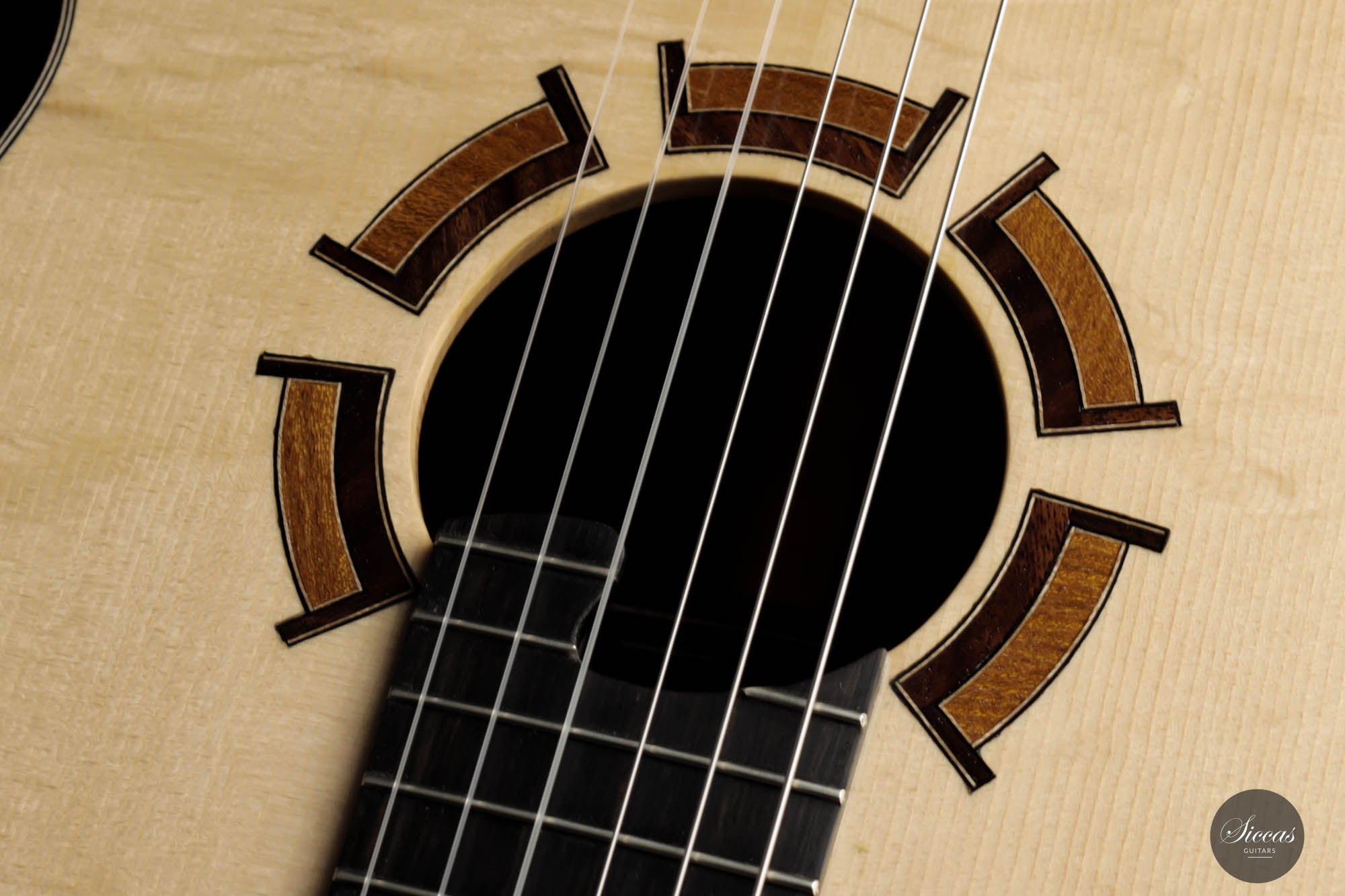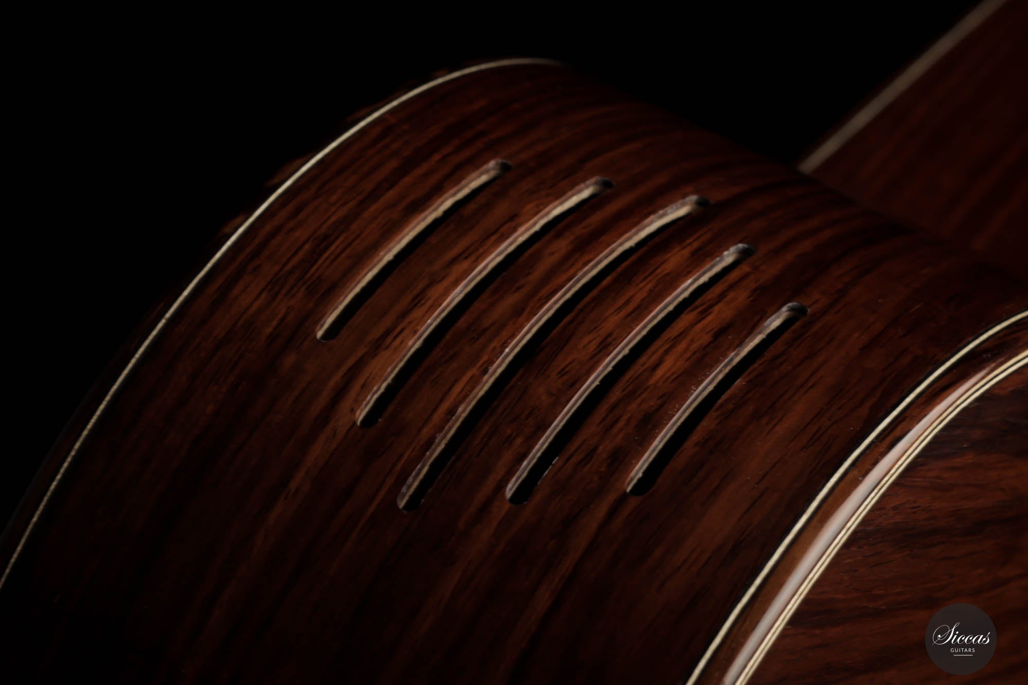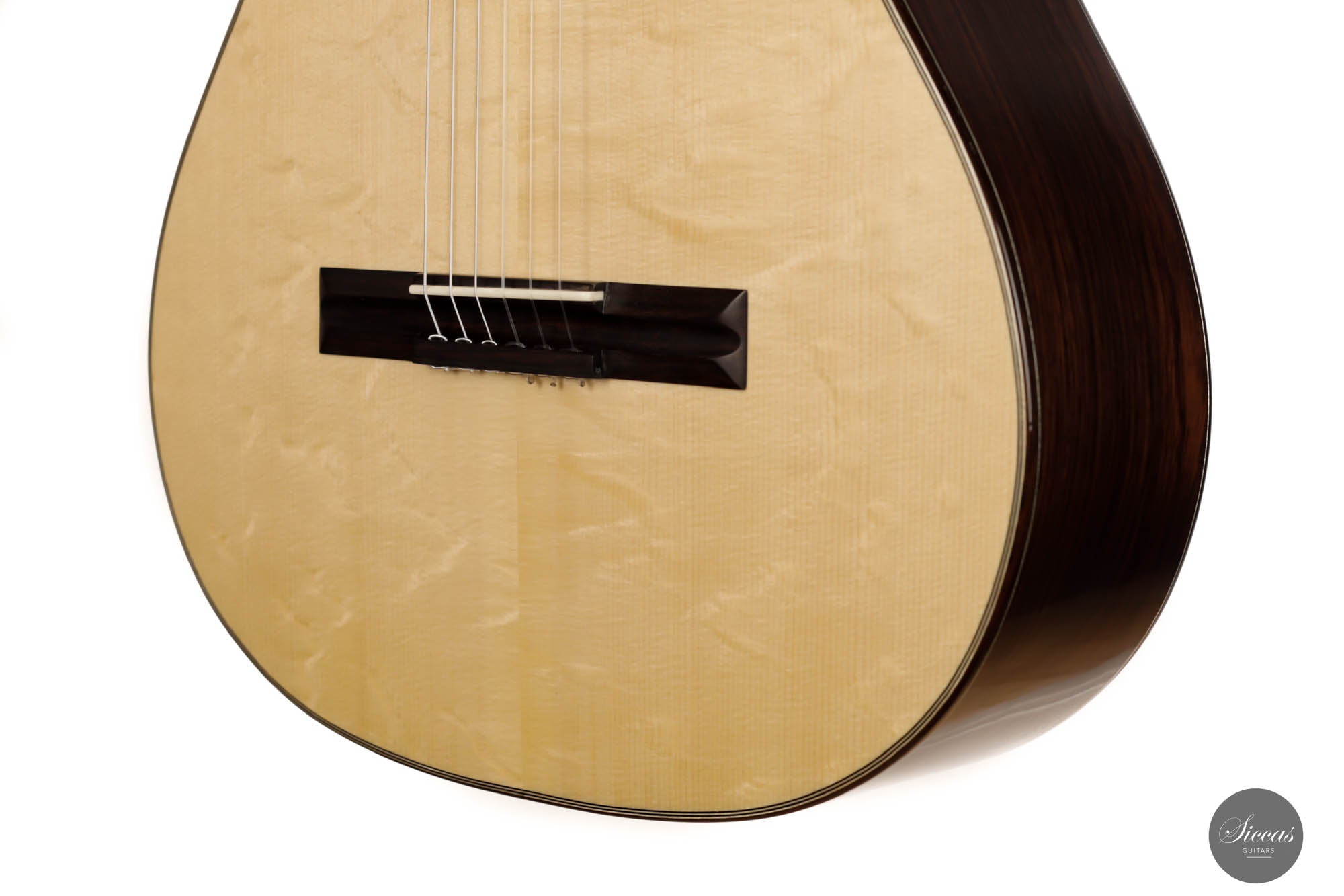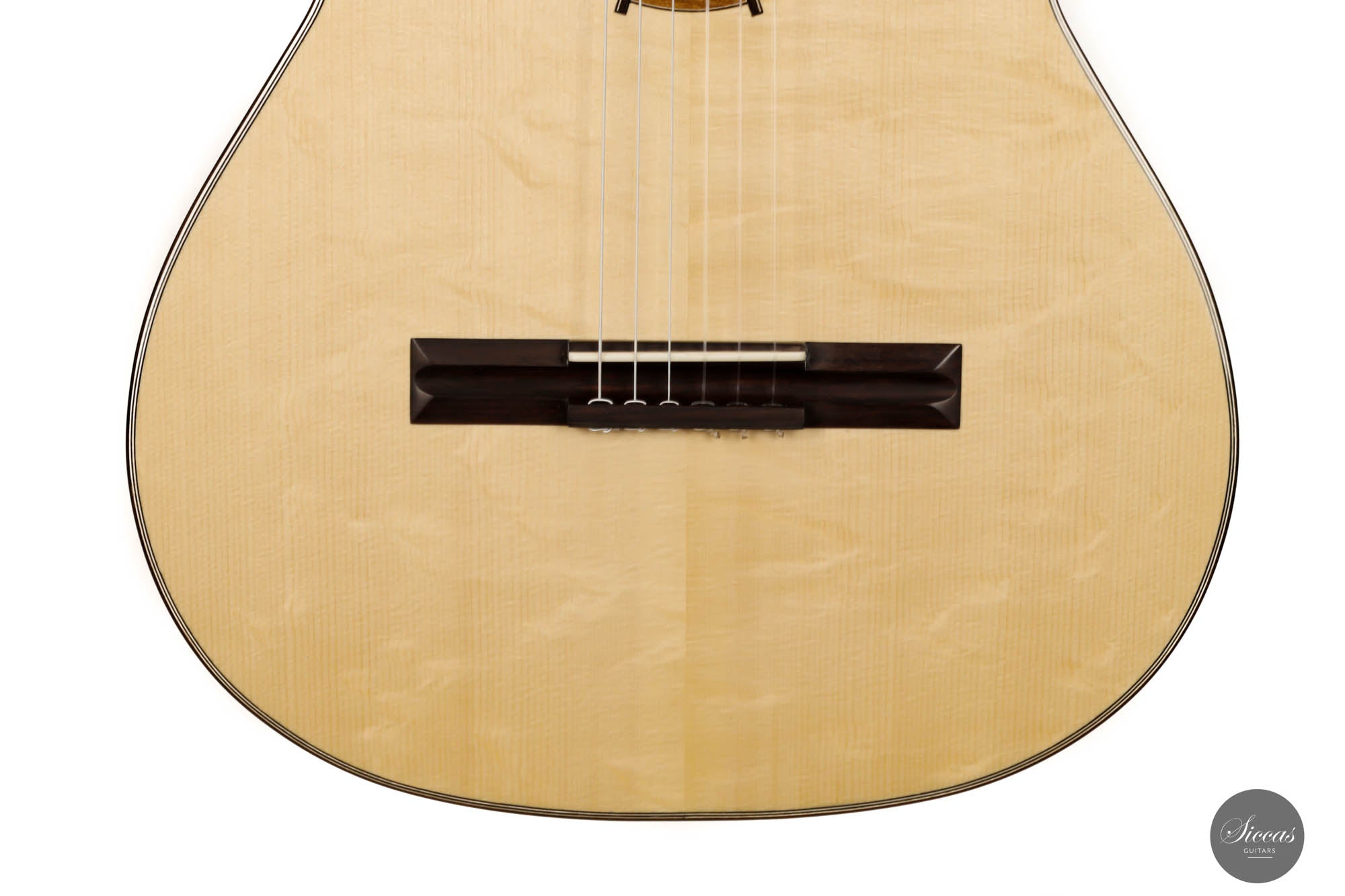This guitar, no. 424 is a beautiful-sounding instrument in all regards. It has a beautiful bearclaw spruce soundboard and precious Amazonas rosewood back and sides which are a treat to the eyes. As a traditionally built instrument, it also has several advantages of the modern concert instrument, such as a unique design sound port and an outstanding volume that will easily fulfill the needs of concert performers in any situation. Moreover, it has an exceptional balance between every voice of this instrument. The responsive basses do not overpower the other voices and vice versa. This guitar is a budget-friendly instrument that offers a vast range of possibilities for the guitarist to explore.