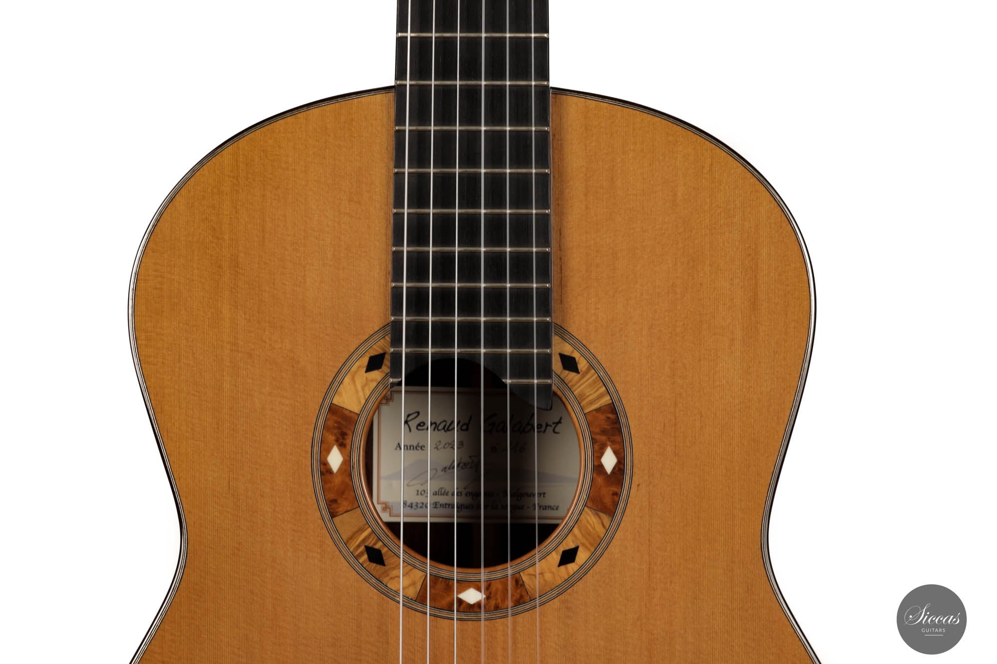 The latest guitar crafted by Renaud Galabert is a true masterpiece of lutherie. Built in 2023 and bearing the number 116, this guitar boasts a stunning combination of cedar double-top and cocobolo back and sides. The result is an instrument that is visually breathtaking, sonically powerful, and versatile.
