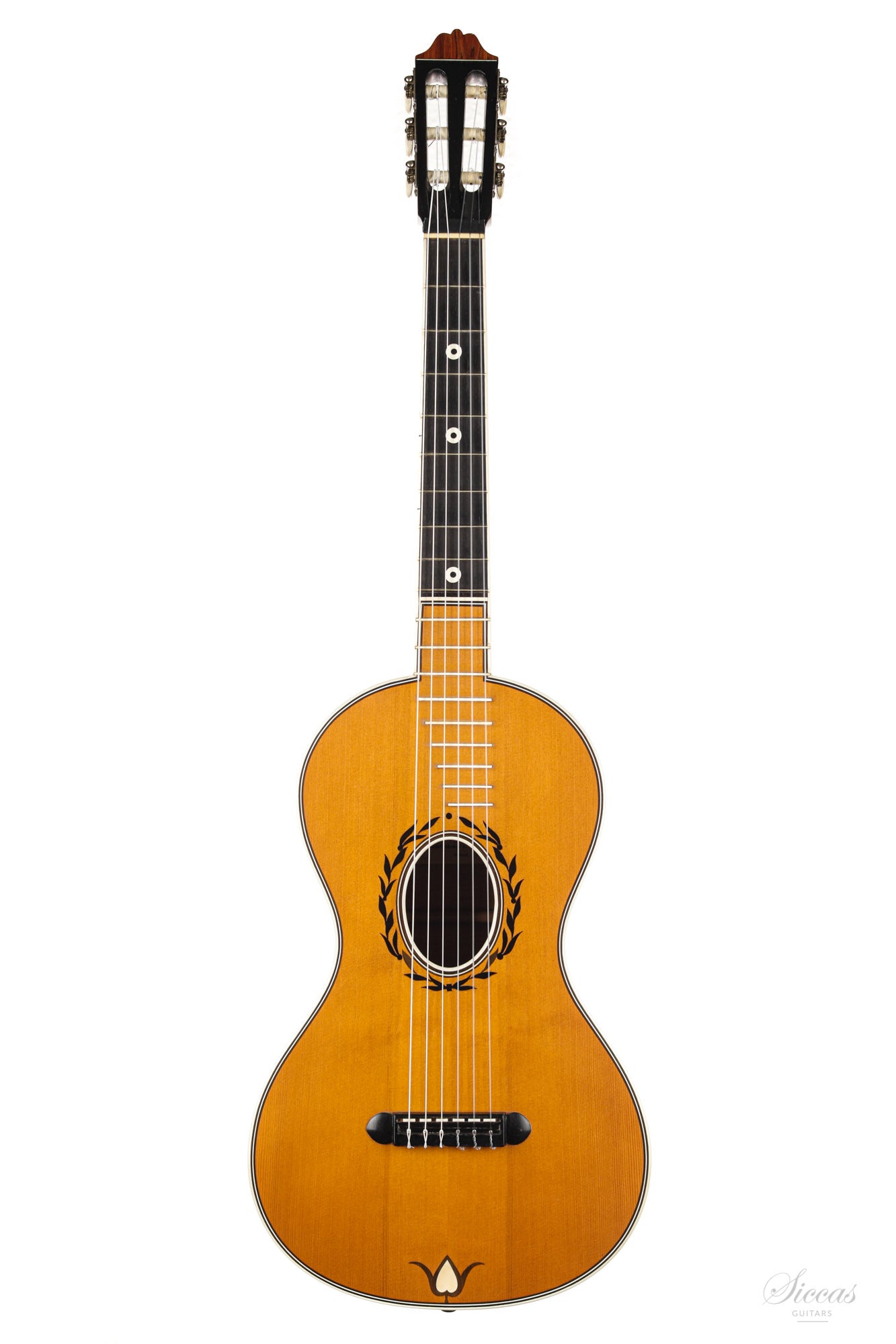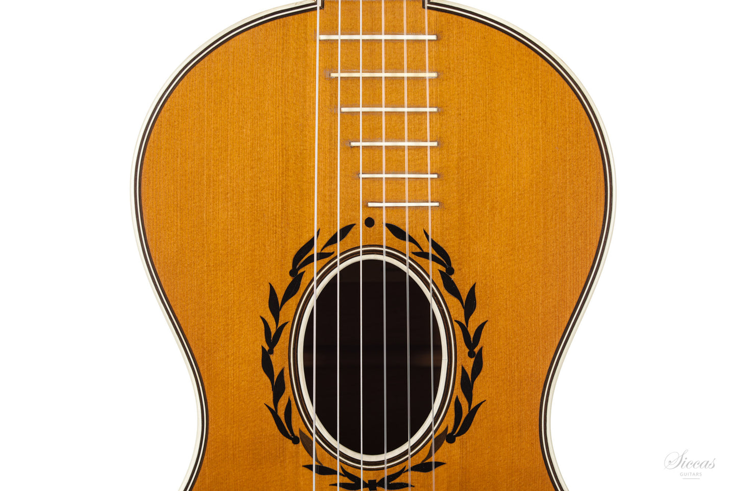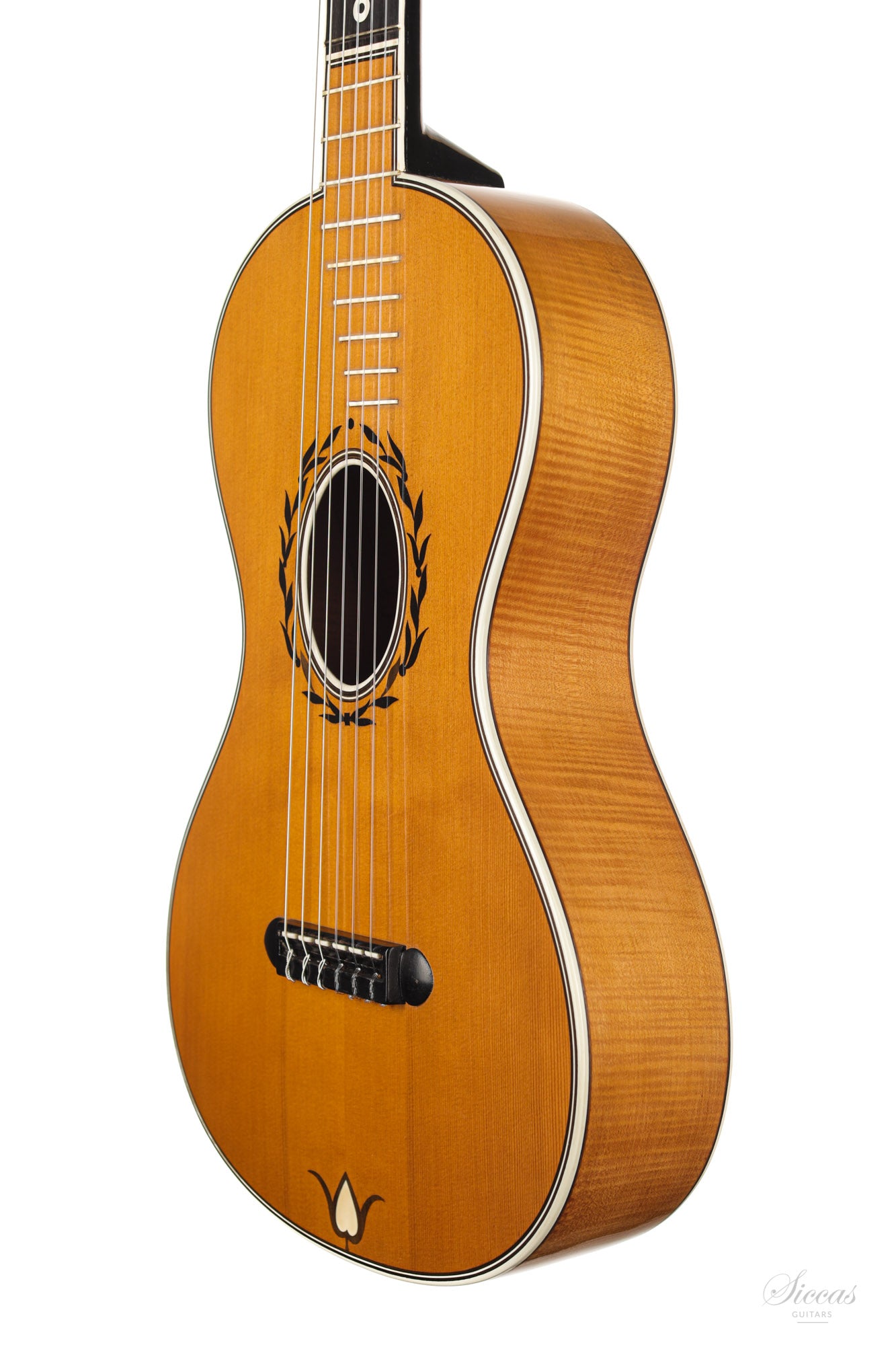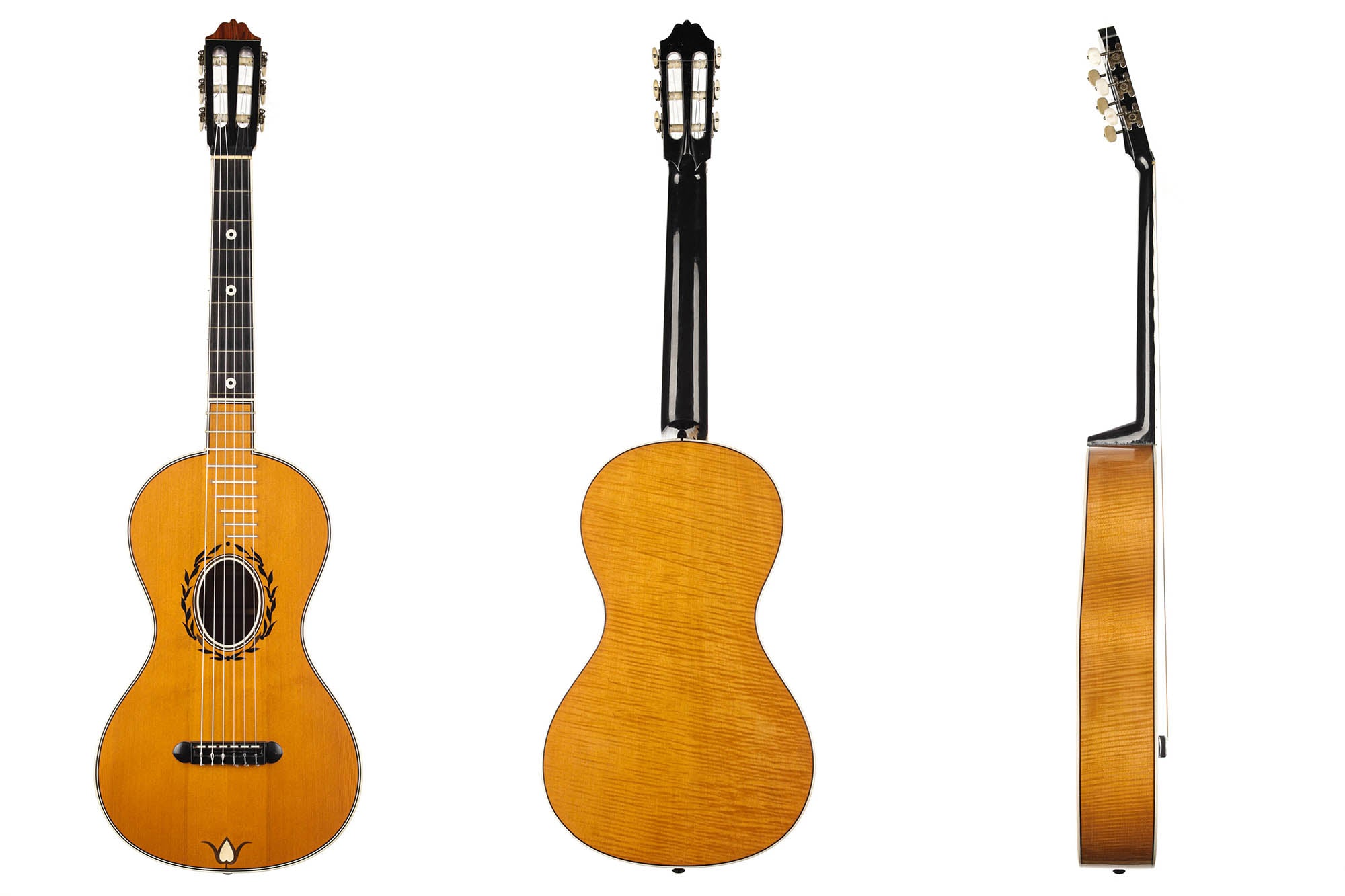 The sound of this guitar is soft and clear, with a very romantic character. A relatively narrow neck offers a playing comfort close to that offered by 19th-century guitars. Finally, the volume of this instrument is quite impressive and it is ready to be played immediately.