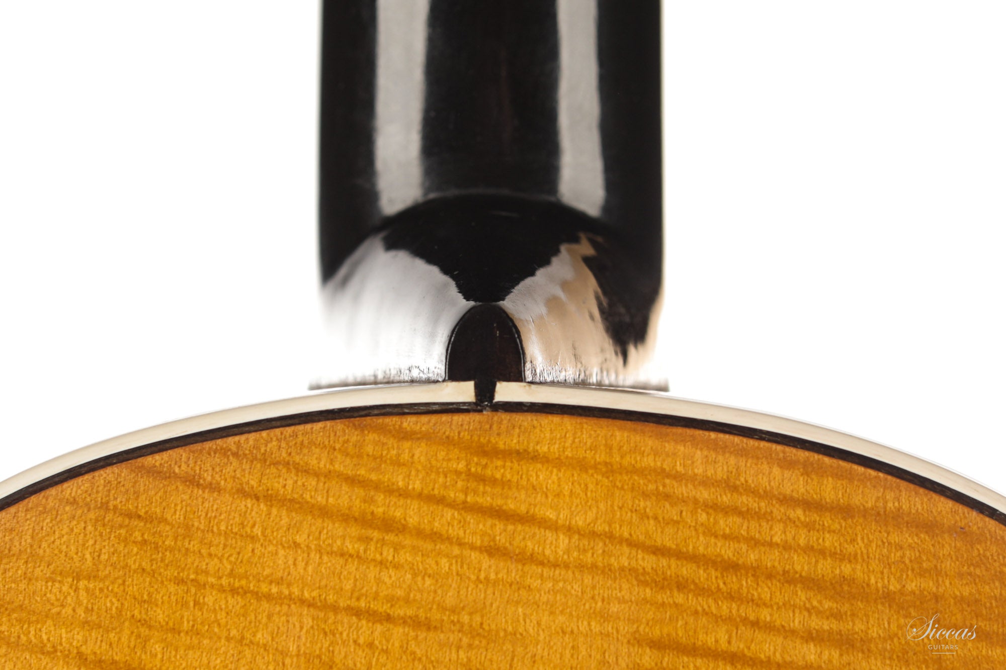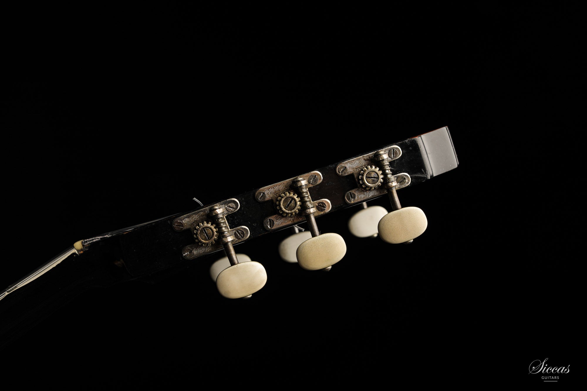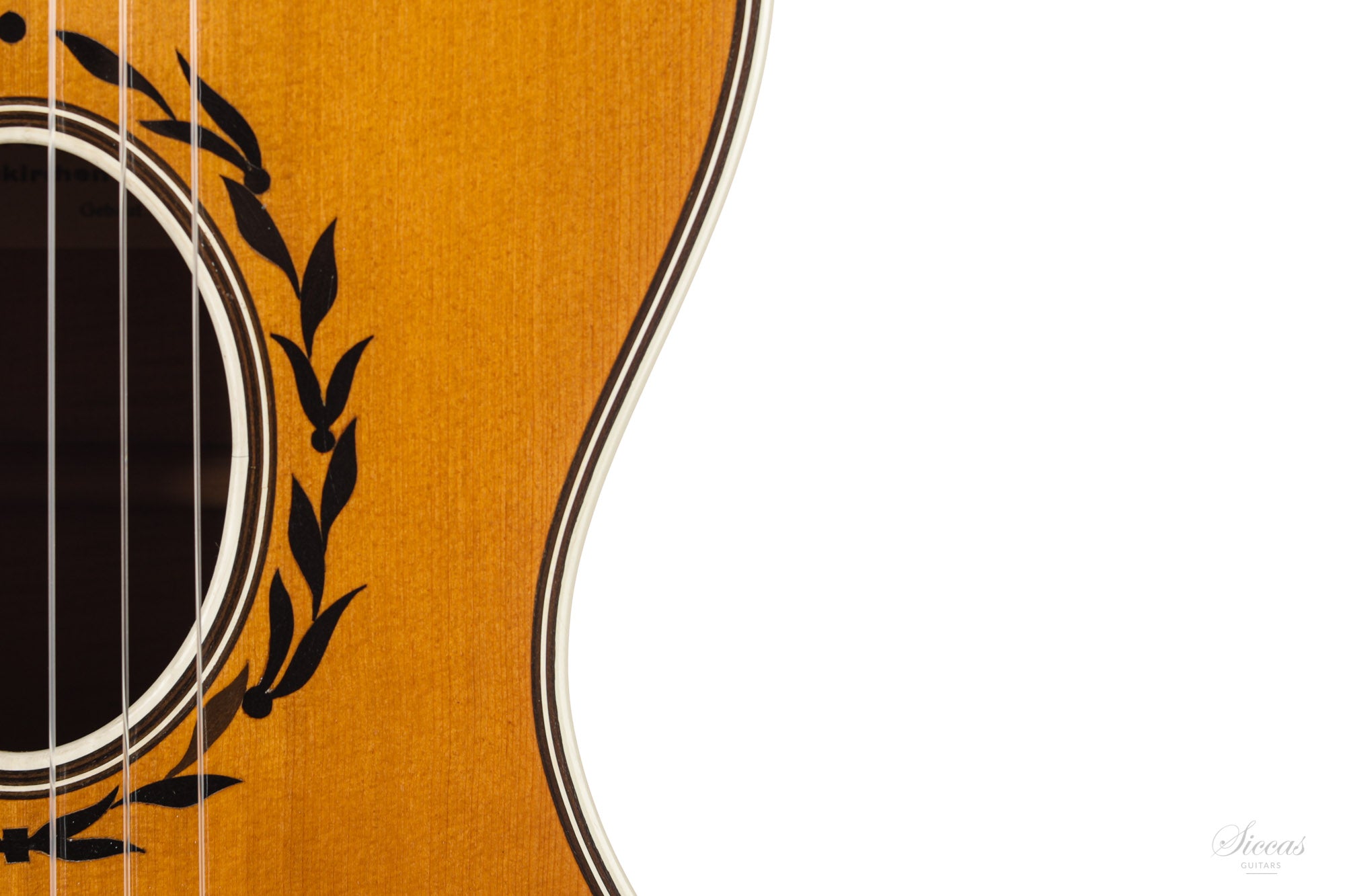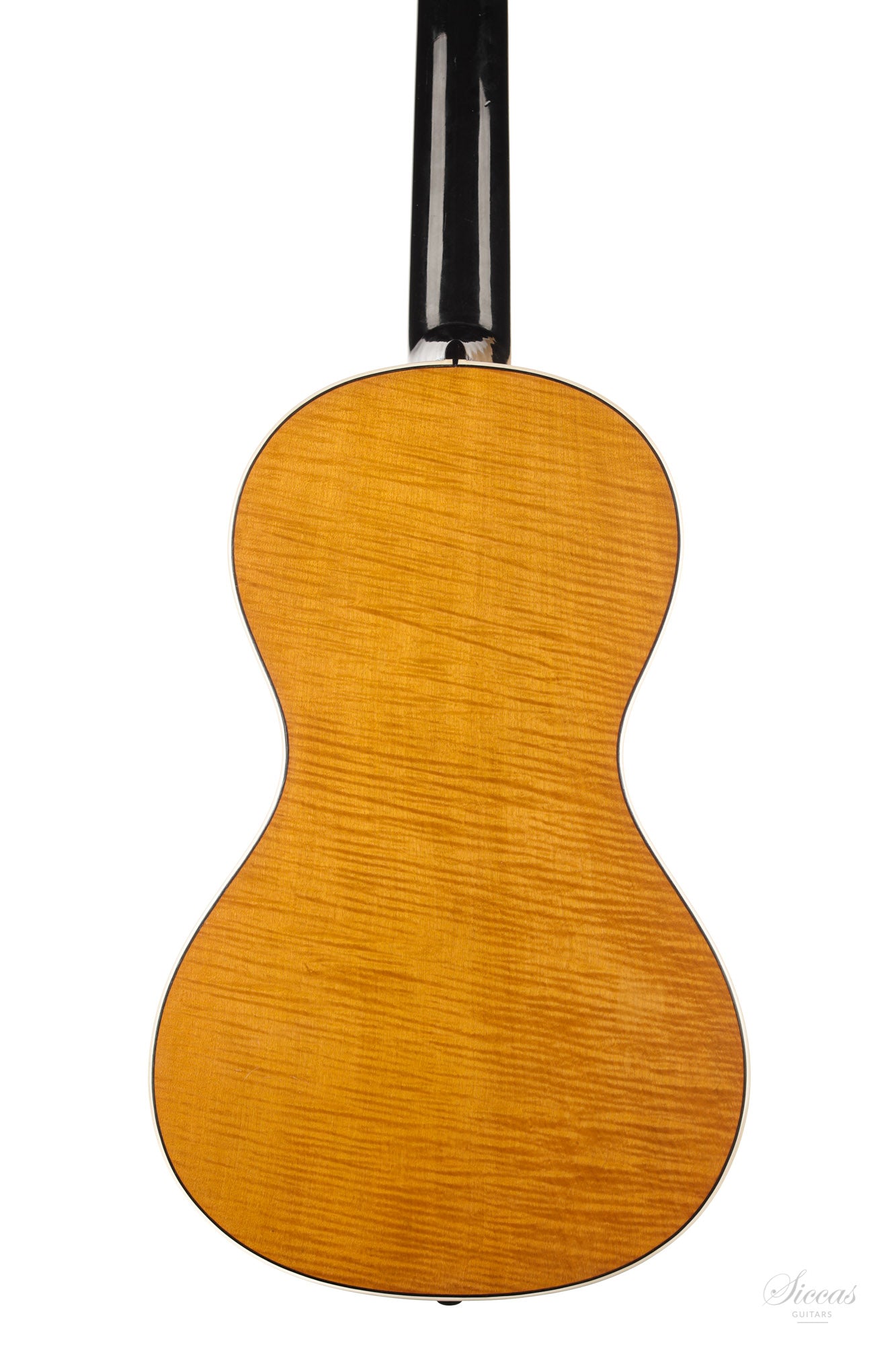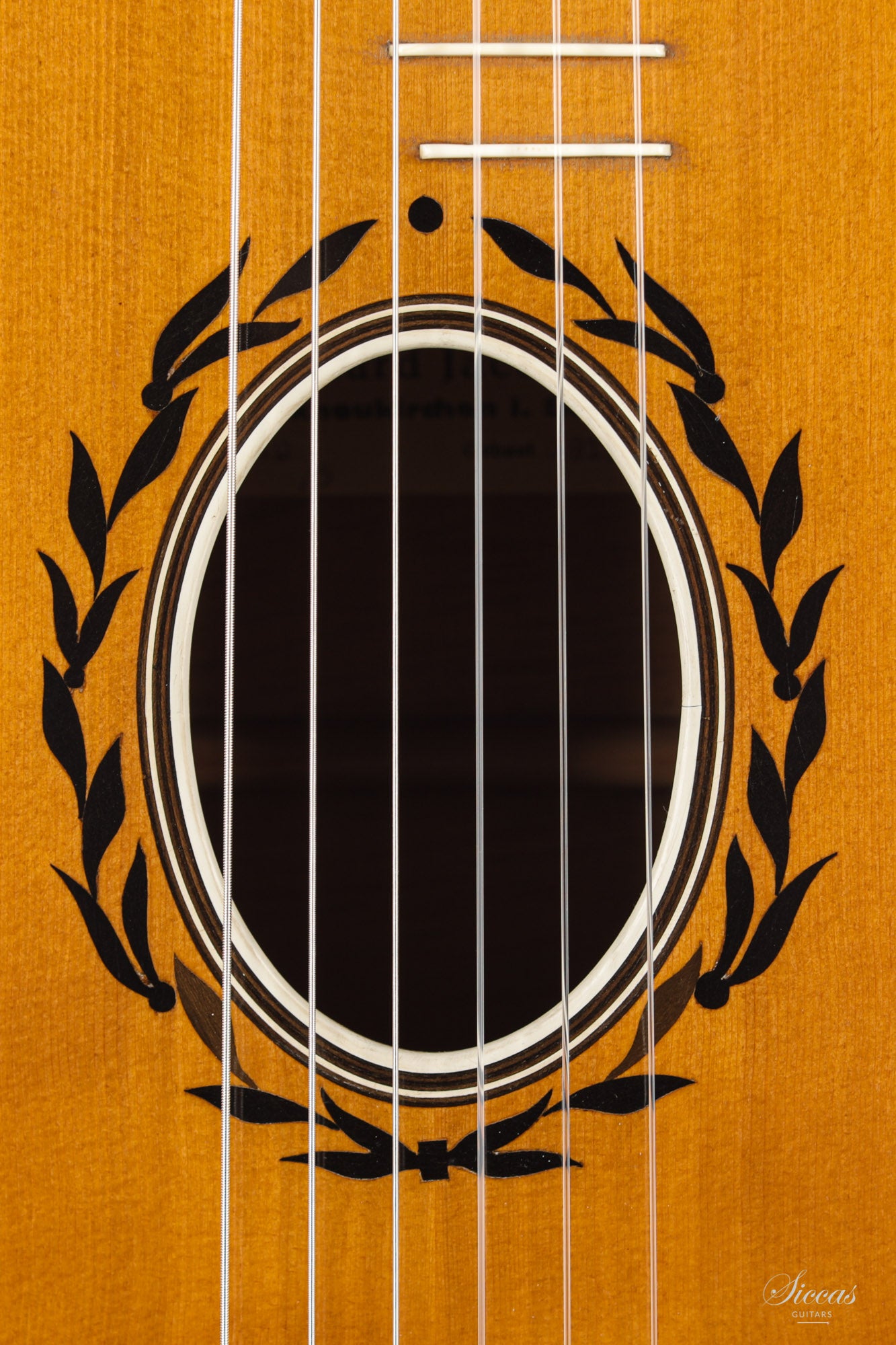 This beautiful “Lady Model”, sized like a romantic guitar, was built in 1919. It is just incredible, in which perfect condition it remained over the last one hundred years. No cracks nor repairs have to be notified, and only minimal playing marks can be seen on the top. This is therefore a highly decorated and rare instrument in absolutely outstanding condition. The top is bordered by white and black inlays made of Galalith and probably dark-stained pearwood. Around the soundhole, the purfling inlays are made in the same arrangement and enriched by floral motifs. These, along with the bridge, the head, and the lower bout inlay are reminiscent of the Art Deco style. The maple back is made of one single piece, which is a noticeable feature. To sum up, it is a dream guitar in outstanding condition, which we received from its first owner.
