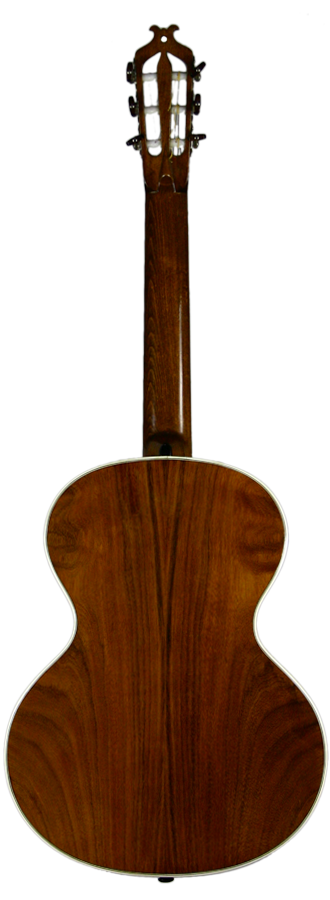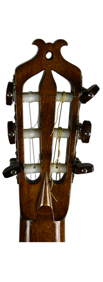 Richard Jacob Weissgerber has built around 3500 instruments of unique beauty. This guitar which was constructed in 1923 by Richard Jacob does also belong to these instruments. The two-piece top is made of nut brown stained spruce wood. It is framed by white and black purflings which consist of Galalith and another component which is most probably dark stained pear wood. The same arrangement of purflings can be found around the sound hole, beyond which the fingerboard protrudes. The two-piece back is vaulted and consists of a fine Indian Rosewood just like the ribs as well. A beautiful guitar in very good condition.