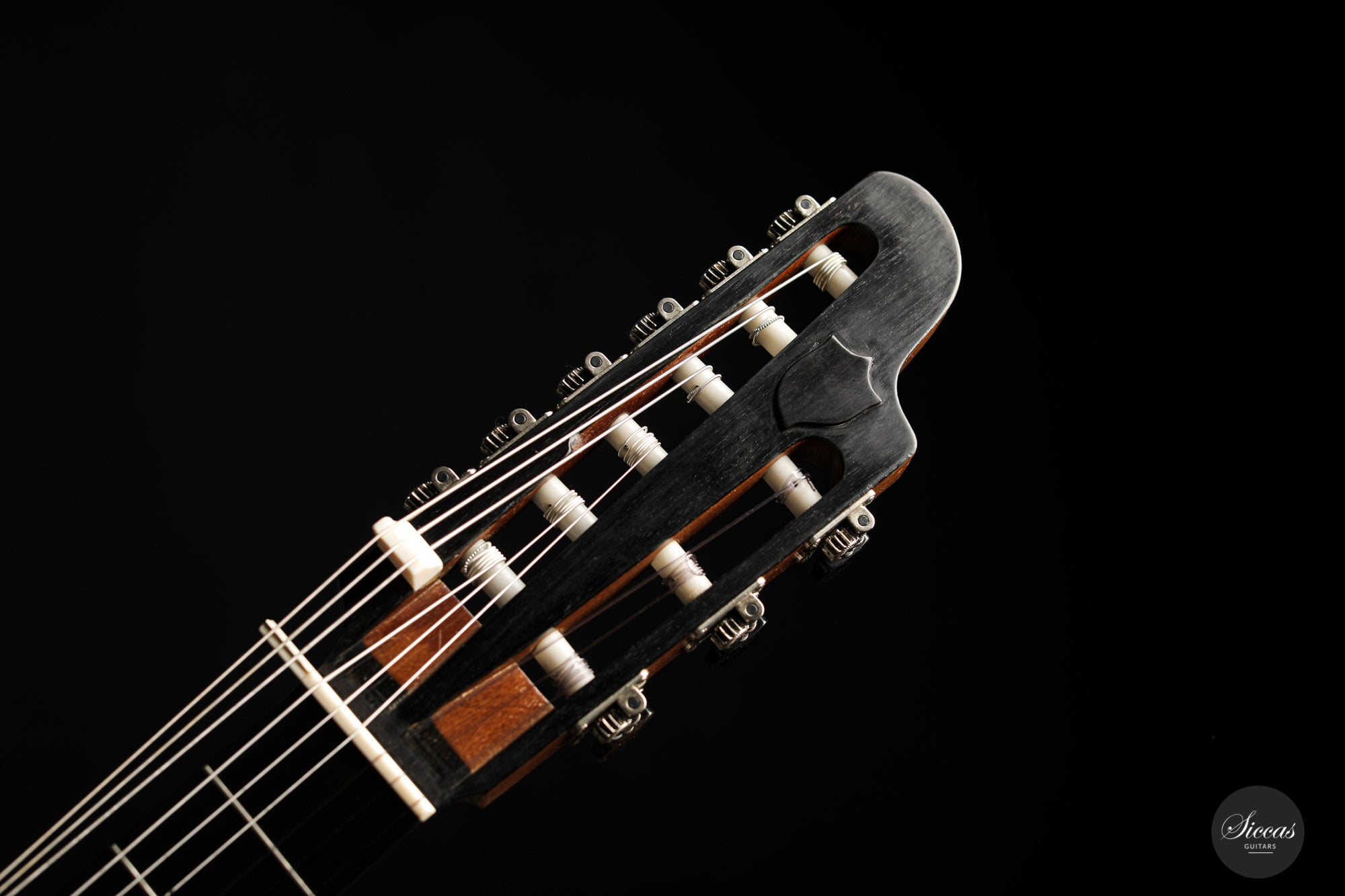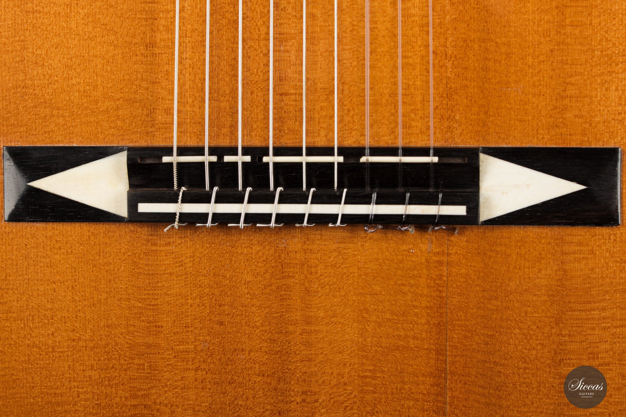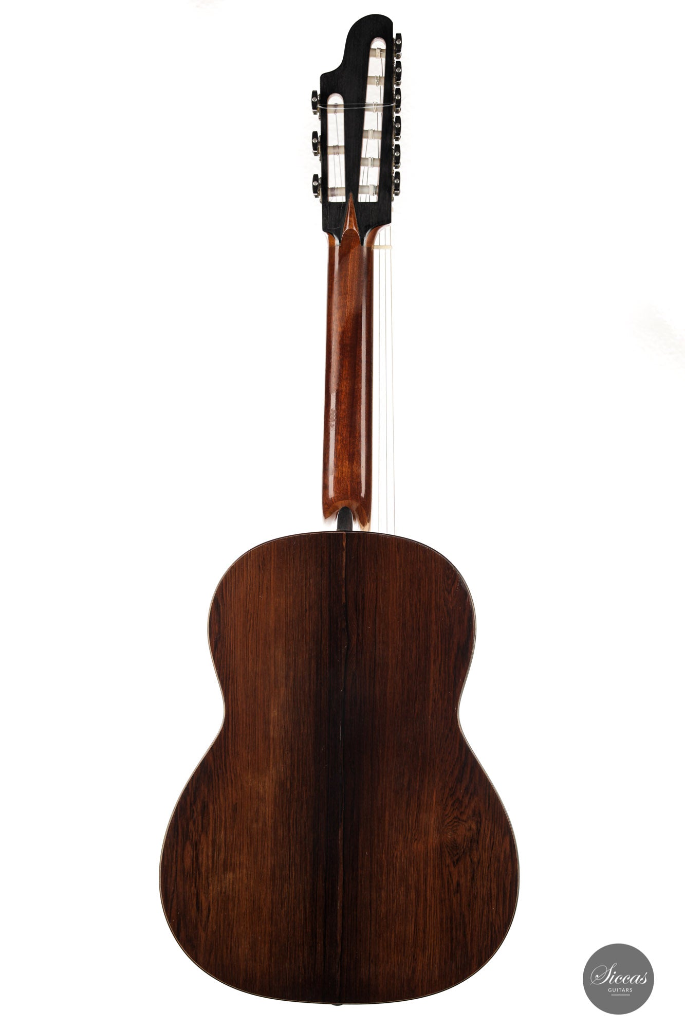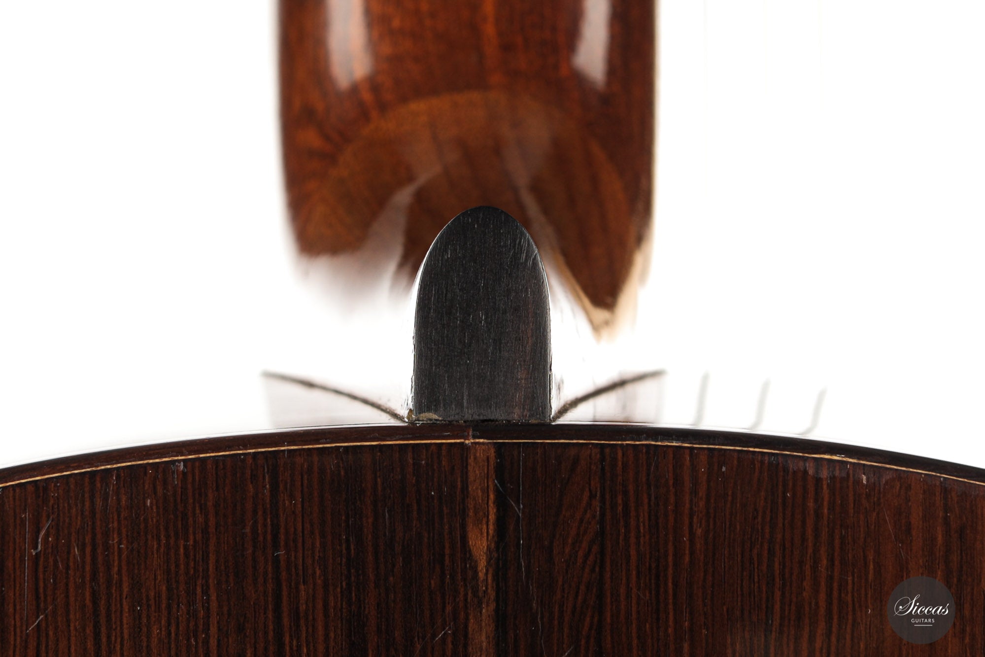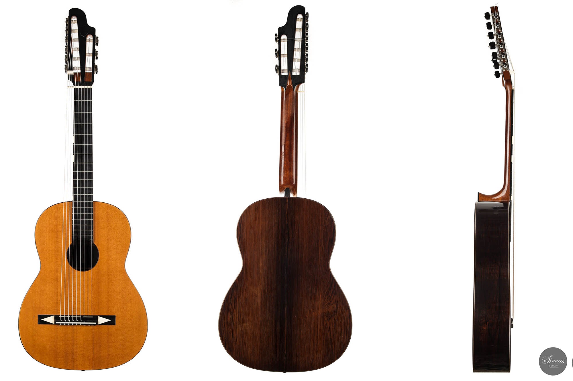 This very interesting model is a 9-string Torres model from 1932 with five fan struts. It is a very rare and well preserved instrument, built with a magnificent set of Rio rosewood (Pre Cites) for back and sides and with a well aged spruce top. Its condition is excellent with only two thin, well repaired cracks on the top. The original Rubner machine heads have been replaced by newer Rubner tuners, and the bridge has been slightly modified to get an optimal string angle. The nut has been modified to a wider one, so that the free-swinging strings can also be played half a tone higher. This extends the bass range by another 8 tones compared to a 6-string guitar. In addition, the overtones of the free-swinging strings considerably enrich the overall sound character of the guitar.
