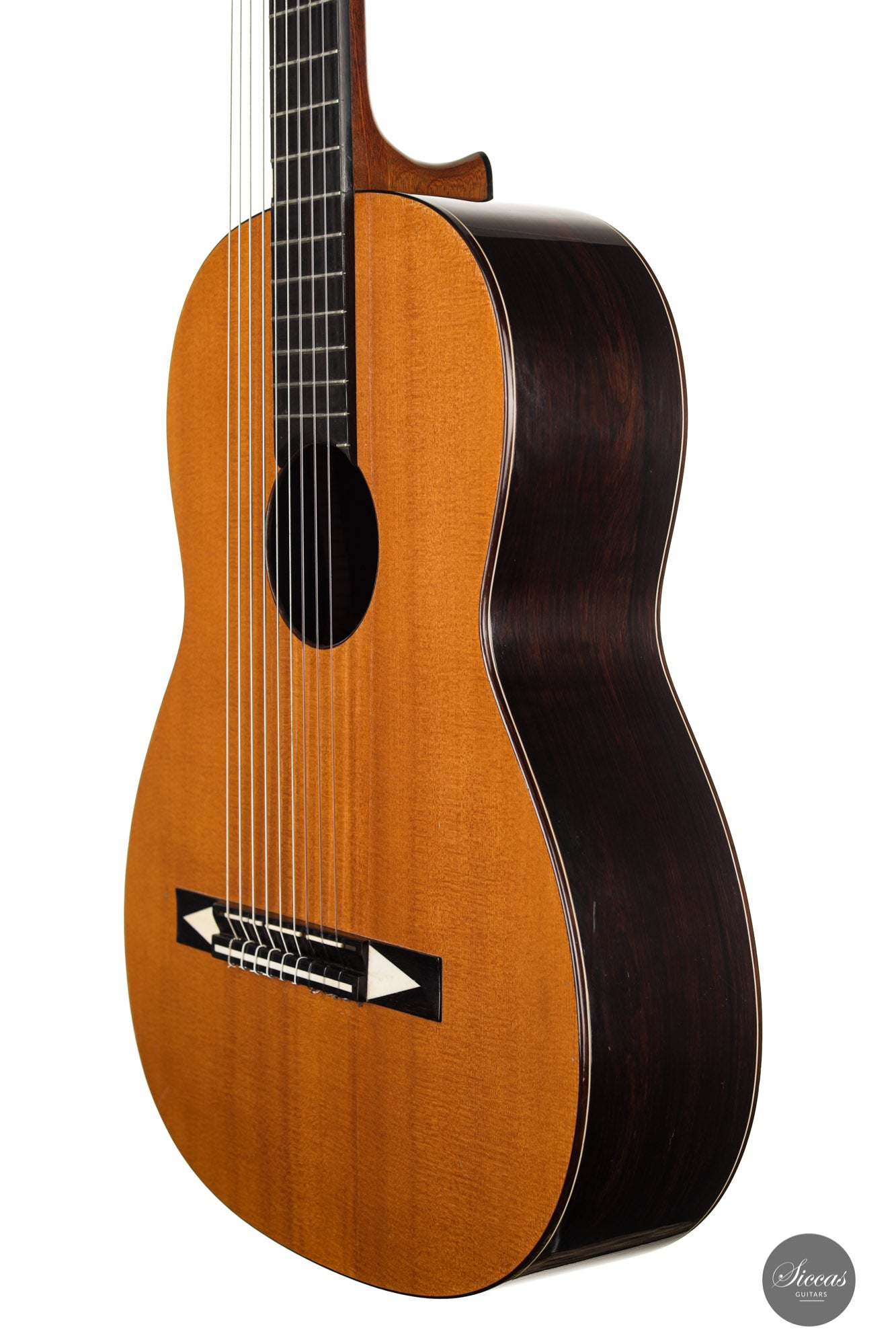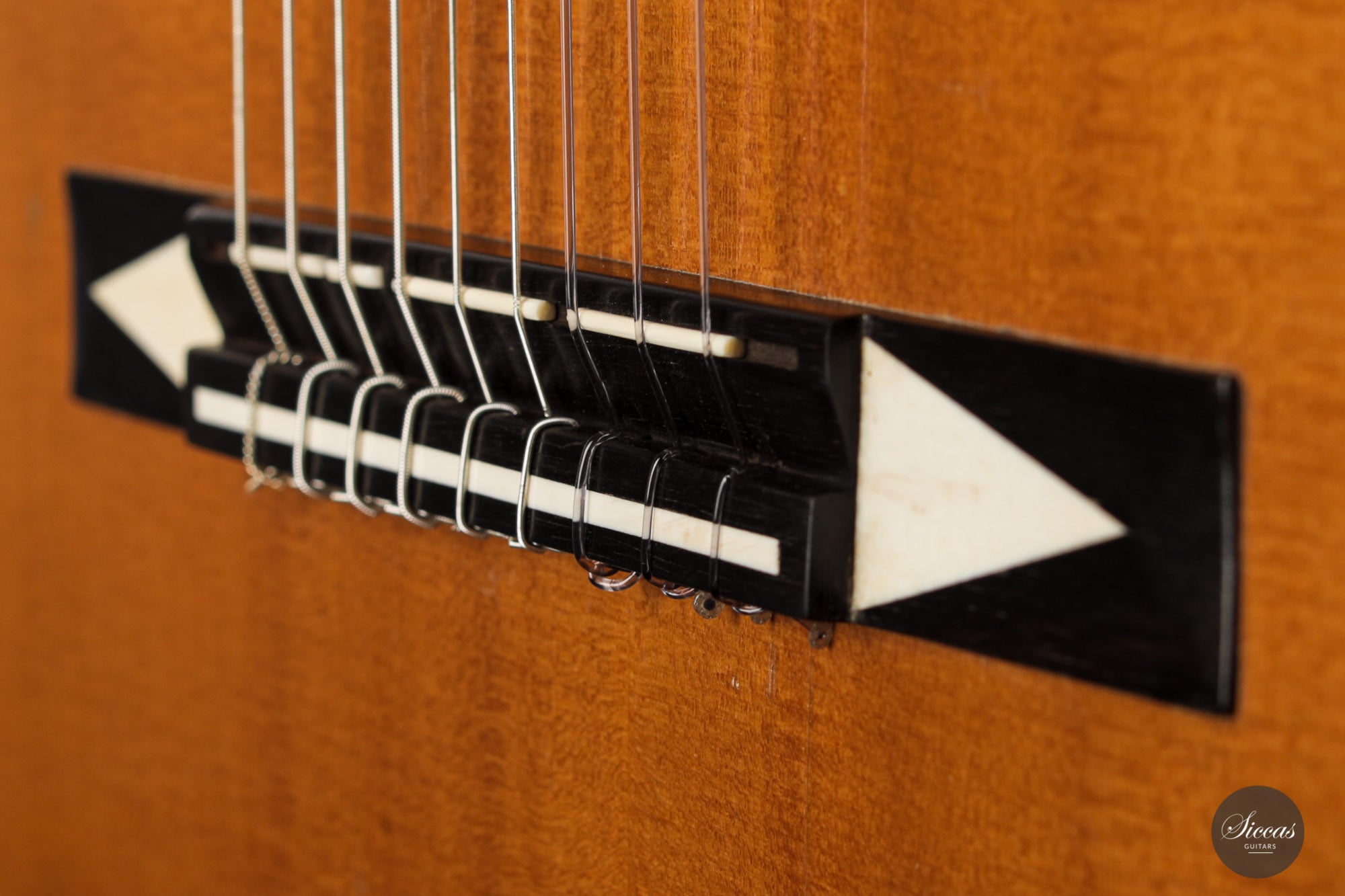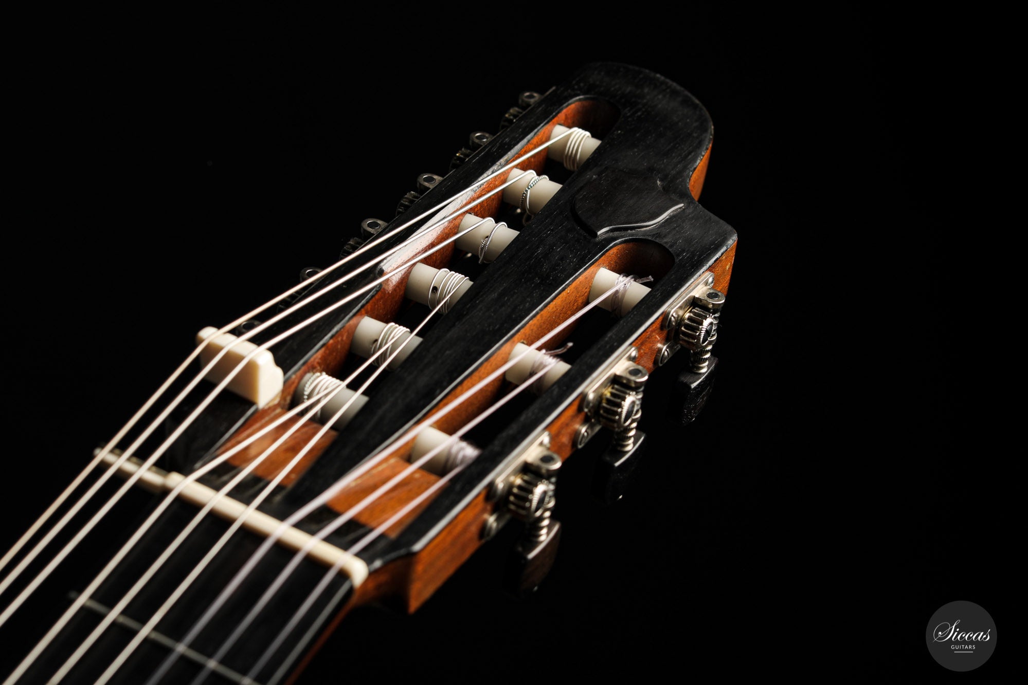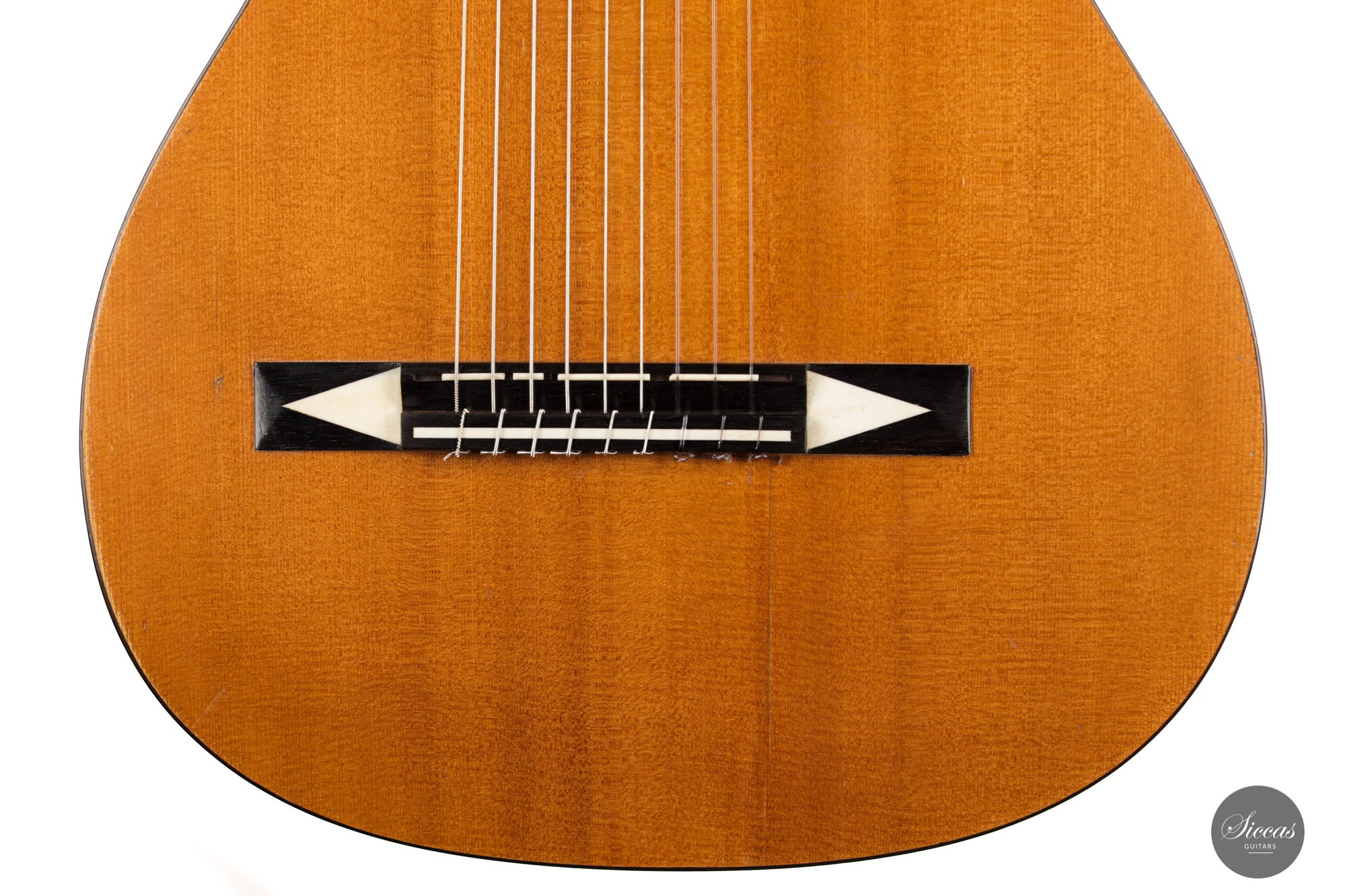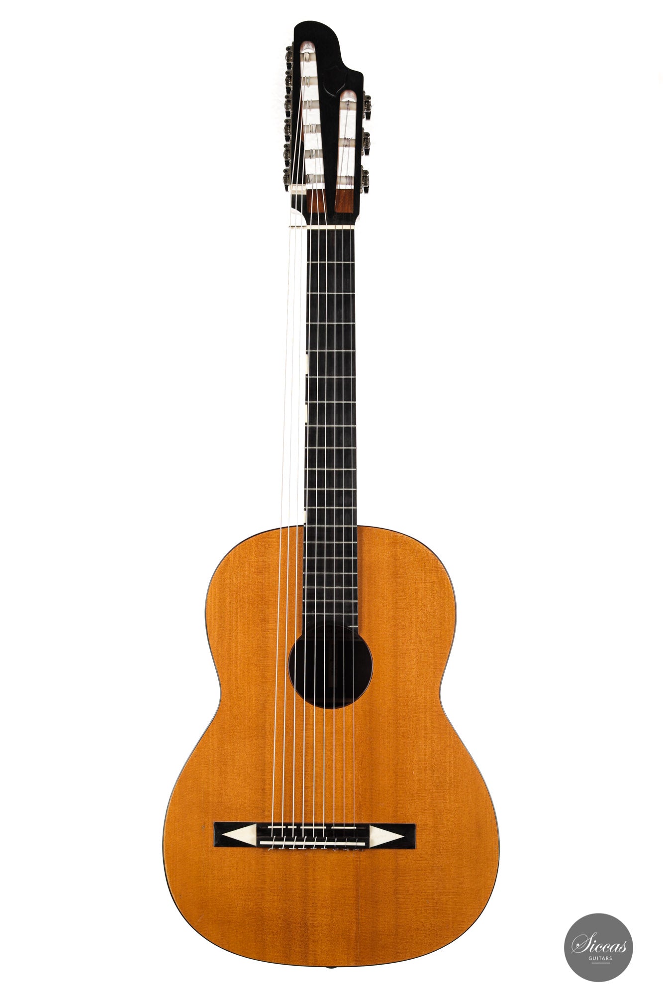 This very interesting model is a 9-string Torres model from 1932 with five fan struts. It is a very rare and well preserved instrument, built with a magnificent set of Rio rosewood (Pre Cites) for back and sides and with a well aged spruce top. Its condition is excellent with only two thin, well repaired cracks on the top. The original Rubner machine heads have been replaced by newer Rubner tuners, and the bridge has been slightly modified to get an optimal string angle. The nut has been modified to a wider one, so that the free-swinging strings can also be played half a tone higher. This extends the bass range by another 8 tones compared to a 6-string guitar. In addition, the overtones of the free-swinging strings considerably enrich the overall sound character of the guitar.