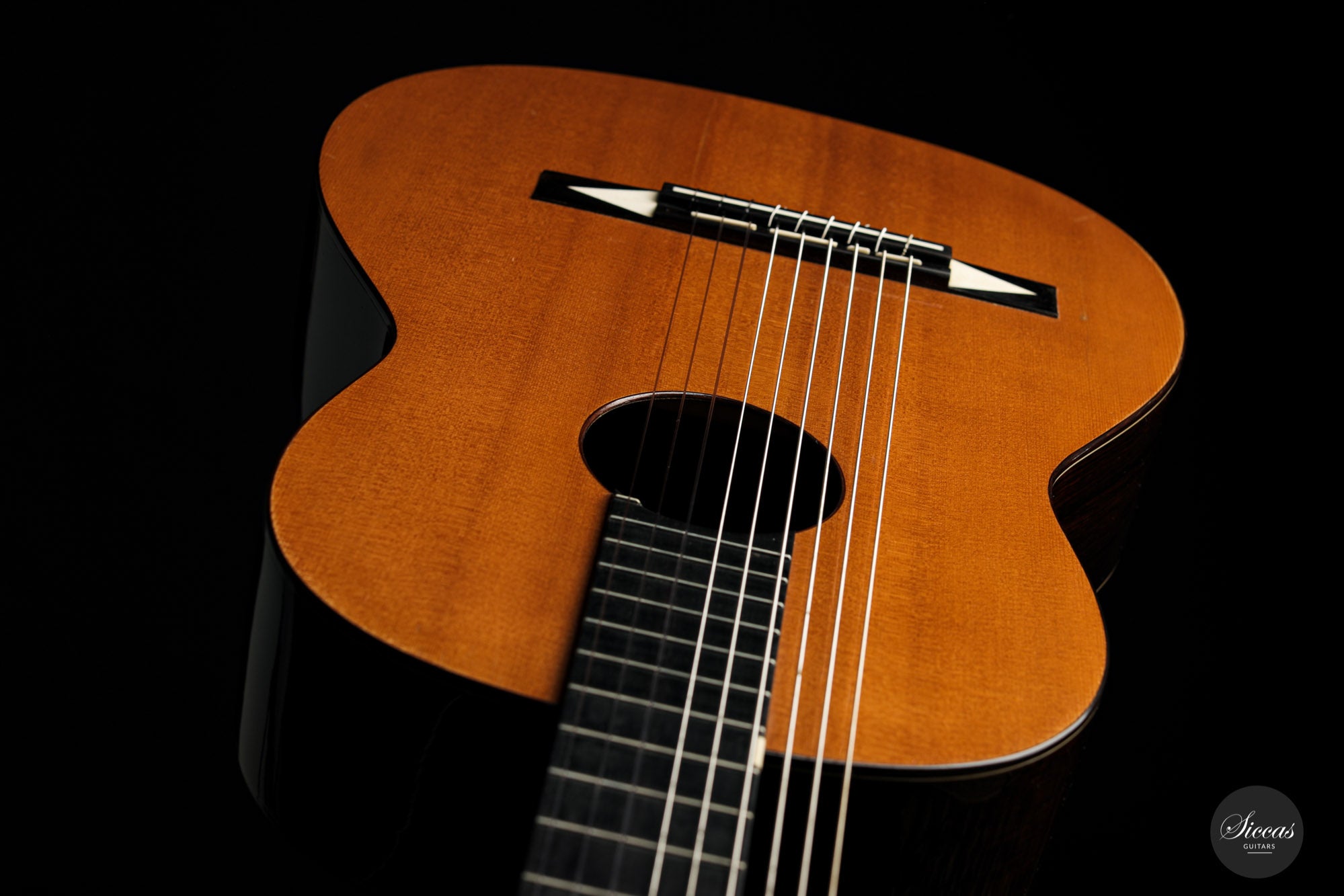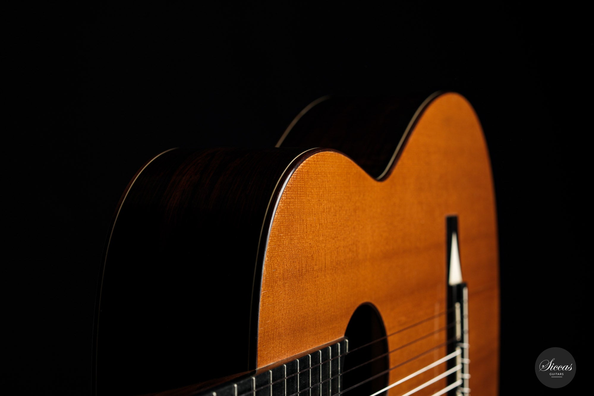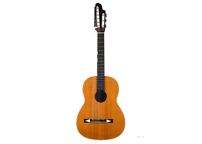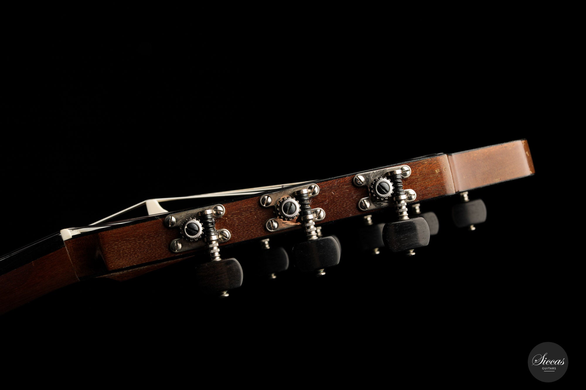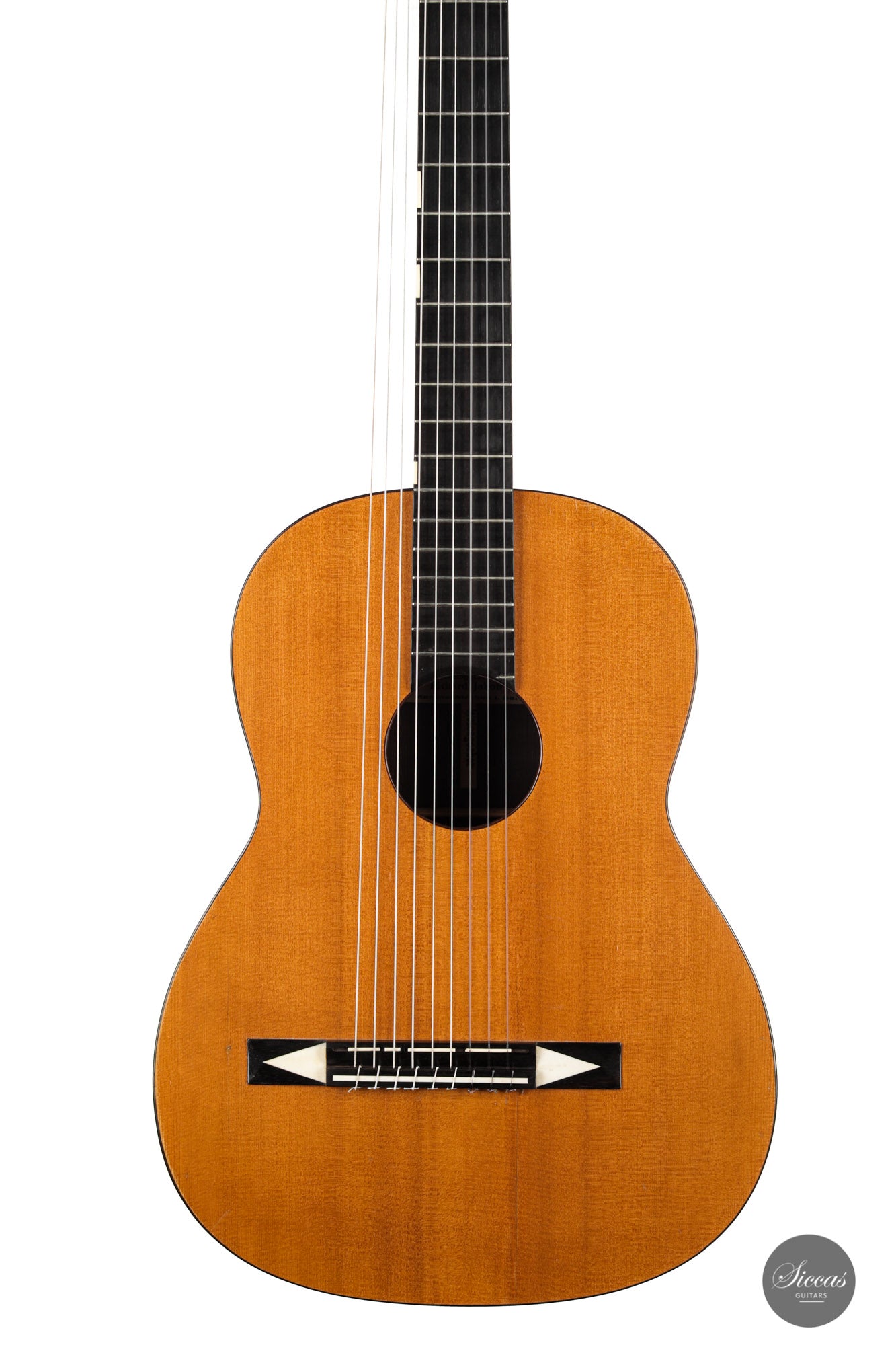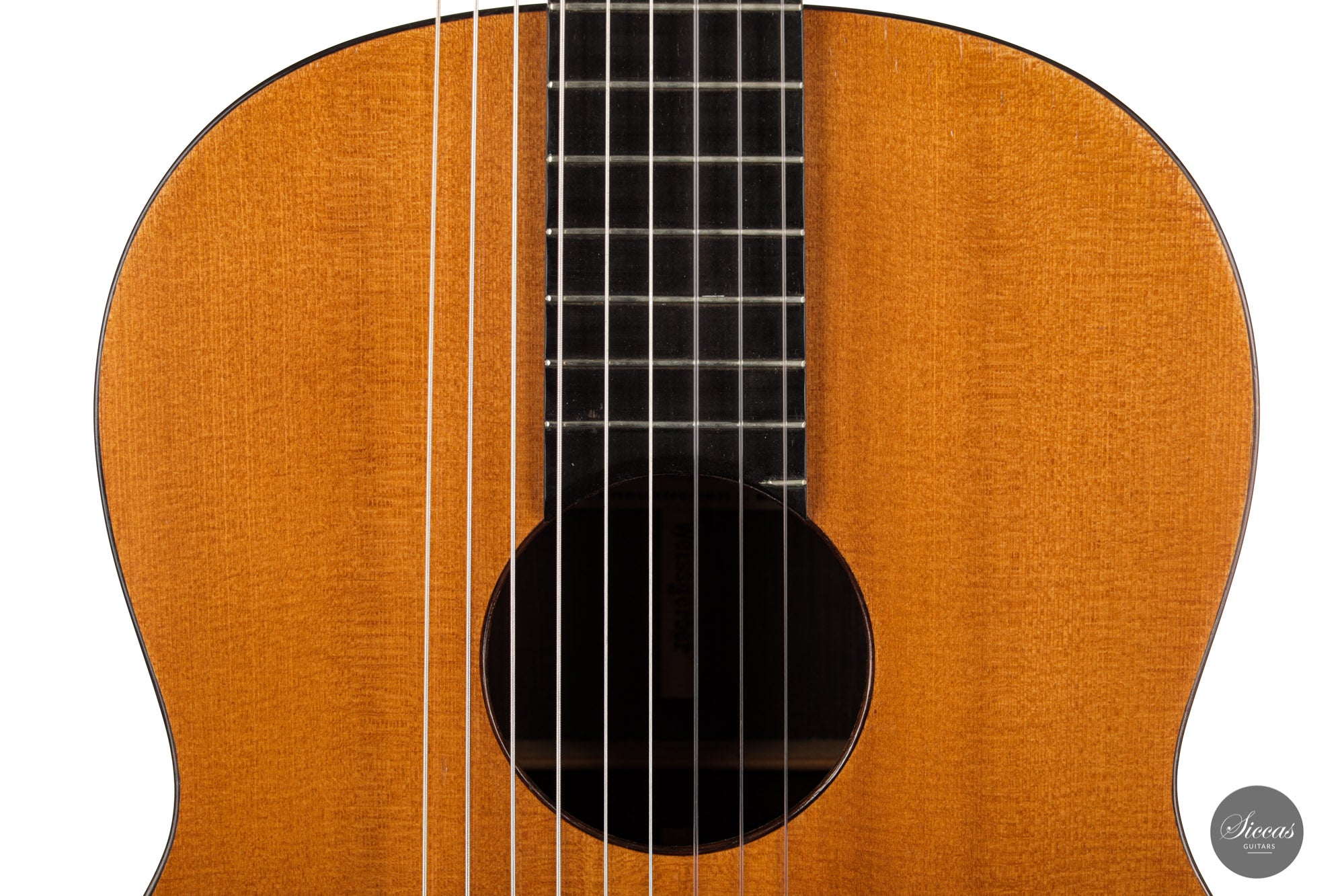 This very interesting model is a 9-string Torres model from 1932 with five fan struts. It is a very rare and well preserved instrument, built with a magnificent set of Rio rosewood (Pre Cites) for back and sides and with a well aged spruce top. Its condition is excellent with only two thin, well repaired cracks on the top. The original Rubner machine heads have been replaced by newer Rubner tuners, and the bridge has been slightly modified to get an optimal string angle. The nut has been modified to a wider one, so that the free-swinging strings can also be played half a tone higher. This extends the bass range by another 8 tones compared to a 6-string guitar. In addition, the overtones of the free-swinging strings considerably enrich the overall sound character of the guitar.