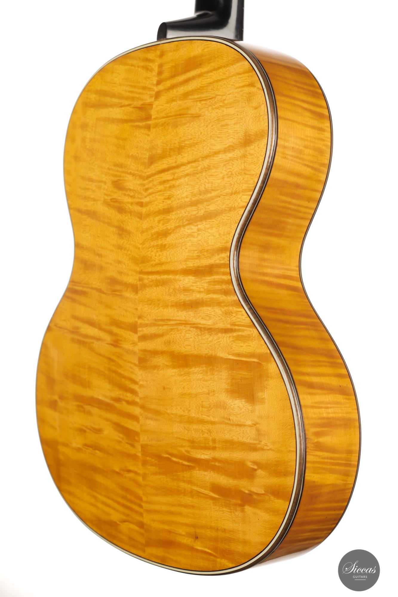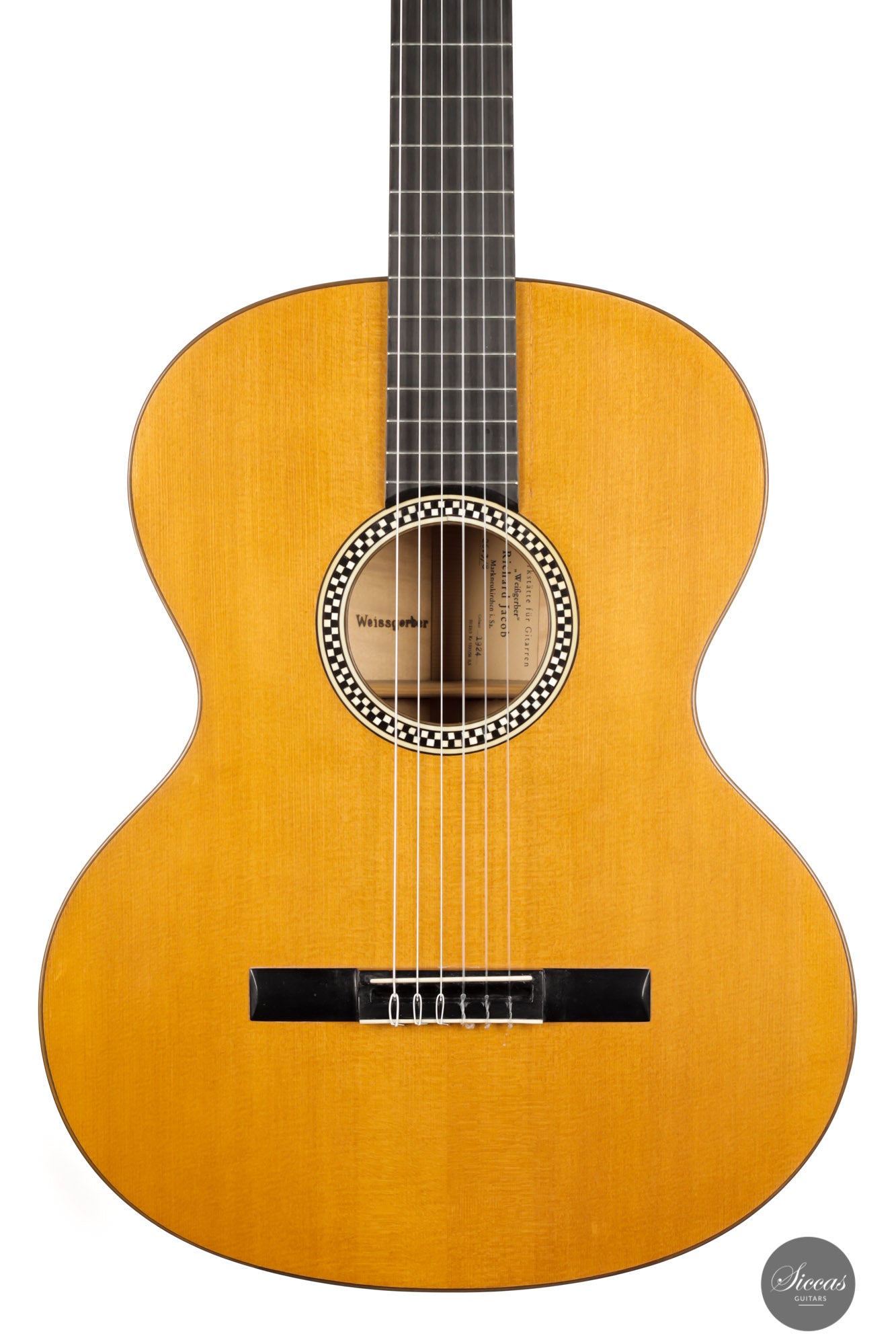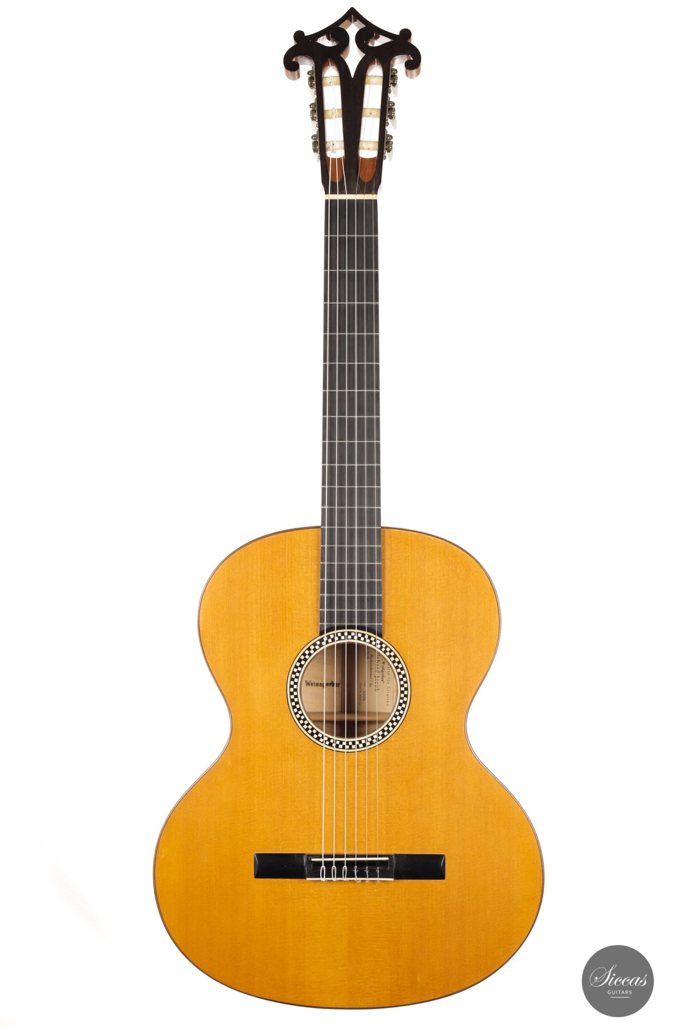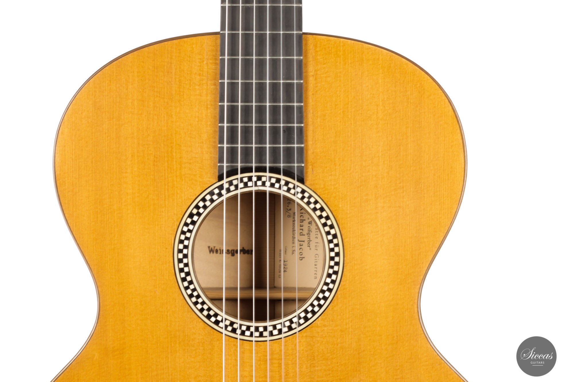 Built in 1924 and bearing the number 26 3./8, this guitar displays a unique design with a thin maple body, strongly arched back, wide Viennese plantilla, and of course, a fantastic carved head. This design, called in German "Großes Wiener Konzert-Modell", still has a fair share of Spanish influence with a three-fan bracing and a Spanish-style bridge as we know it today. It is important to note that these features are cutting-edge designs for a 1924 Germany-made guitar. To round off the exciting picture of this fascinating historical piece, it features a checkerboard rosette, the most sought-after of Weissgerber's ornaments.