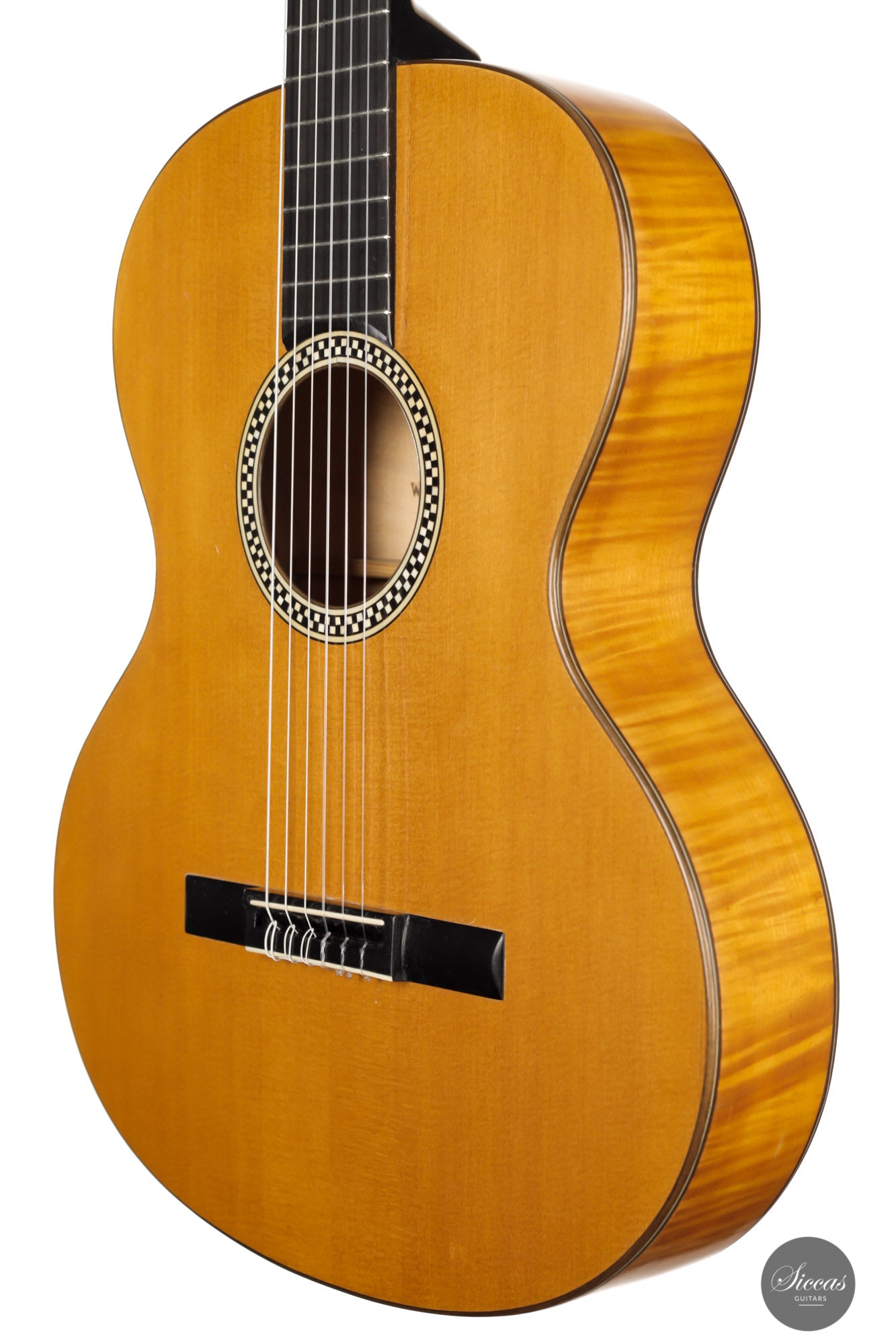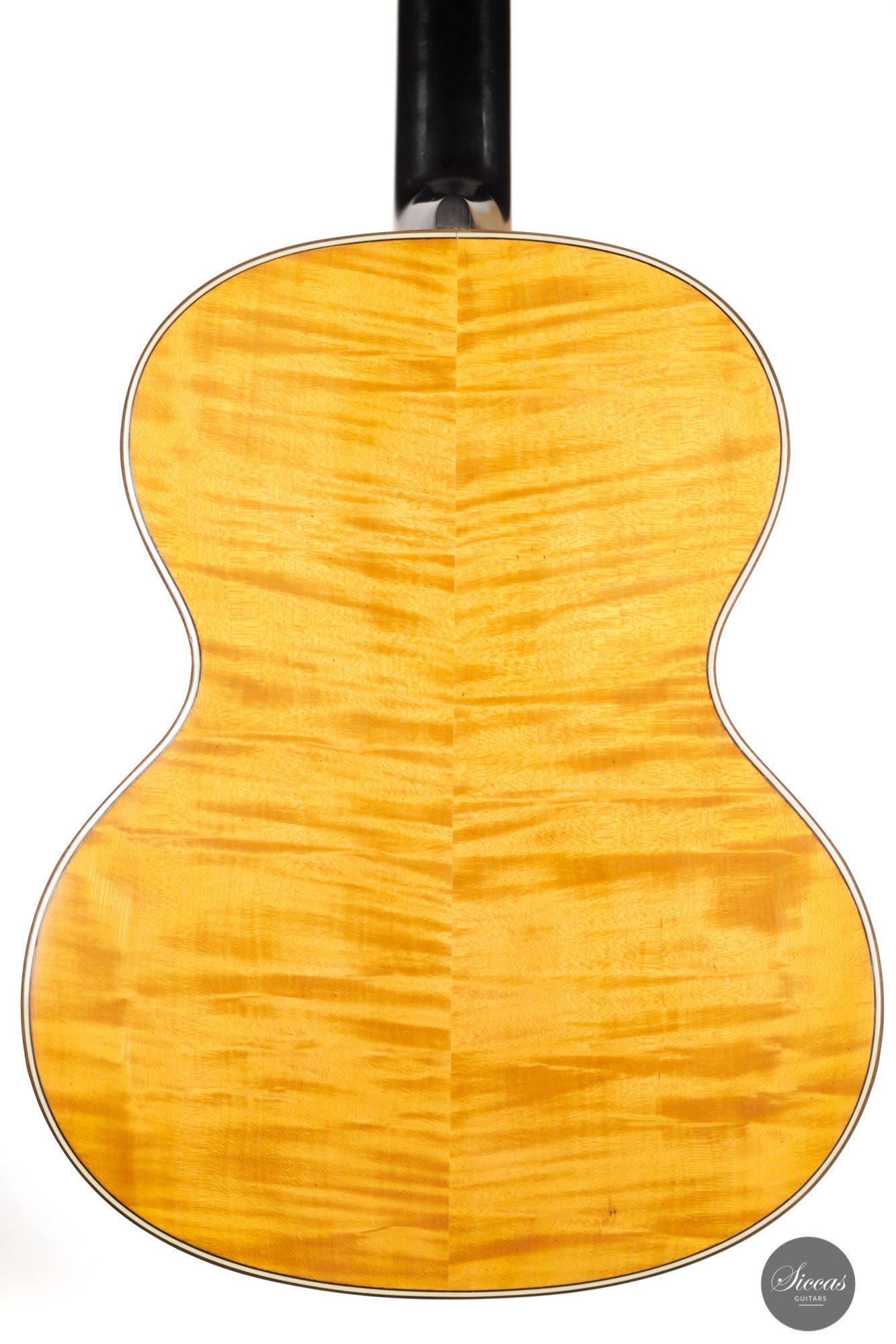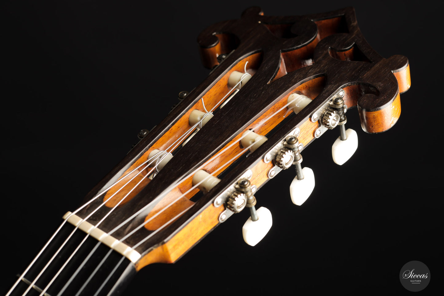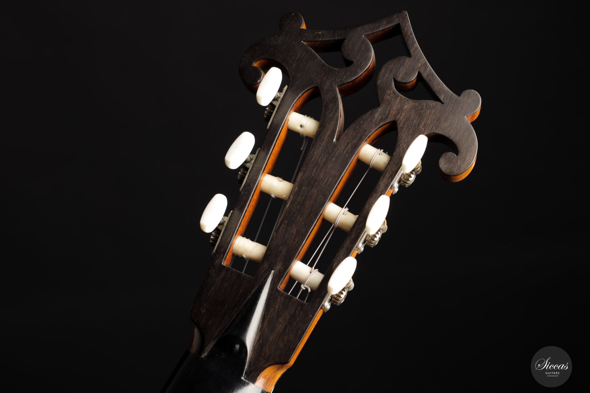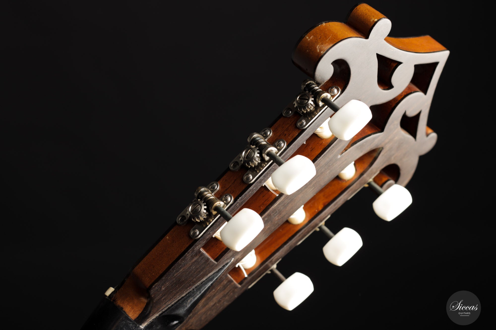 Built in 1924 and bearing the number 26 3./8, this guitar displays a unique design with a thin maple body, strongly arched back, wide Viennese plantilla, and of course, a fantastic carved head. This design, called in German "Großes Wiener Konzert-Modell", still has a fair share of Spanish influence with a three-fan bracing and a Spanish-style bridge as we know it today. It is important to note that these features are cutting-edge designs for a 1924 Germany-made guitar. To round off the exciting picture of this fascinating historical piece, it features a checkerboard rosette, the most sought-after of Weissgerber's ornaments.