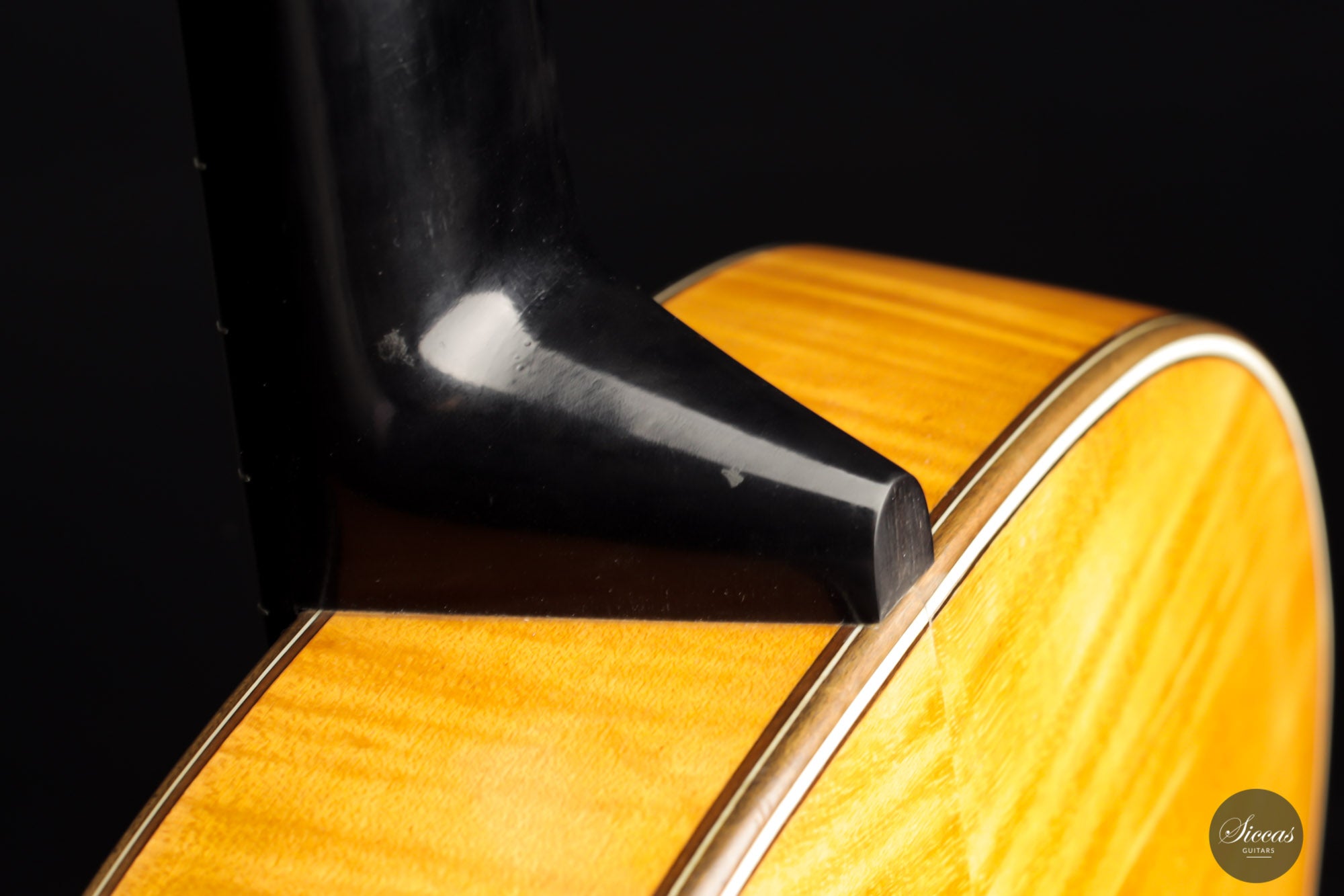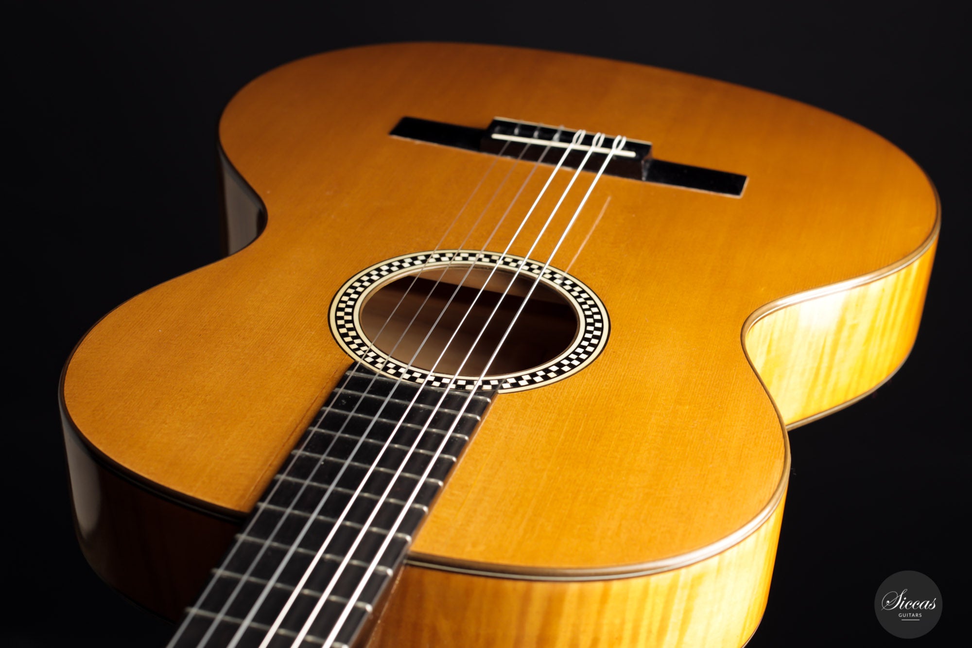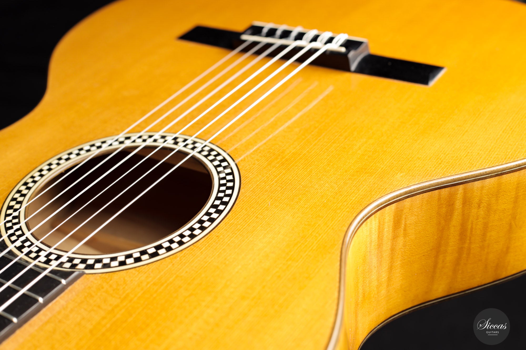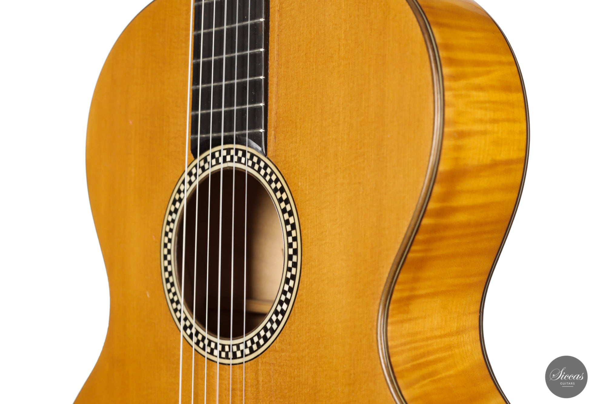 Built in 1924 and bearing the number 26 3./8, this guitar displays a unique design with a thin maple body, strongly arched back, wide Viennese plantilla, and of course, a fantastic carved head. This design, called in German "Großes Wiener Konzert-Modell", still has a fair share of Spanish influence with a three-fan bracing and a Spanish-style bridge as we know it today. It is important to note that these features are cutting-edge designs for a 1924 Germany-made guitar. To round off the exciting picture of this fascinating historical piece, it features a checkerboard rosette, the most sought-after of Weissgerber's ornaments.