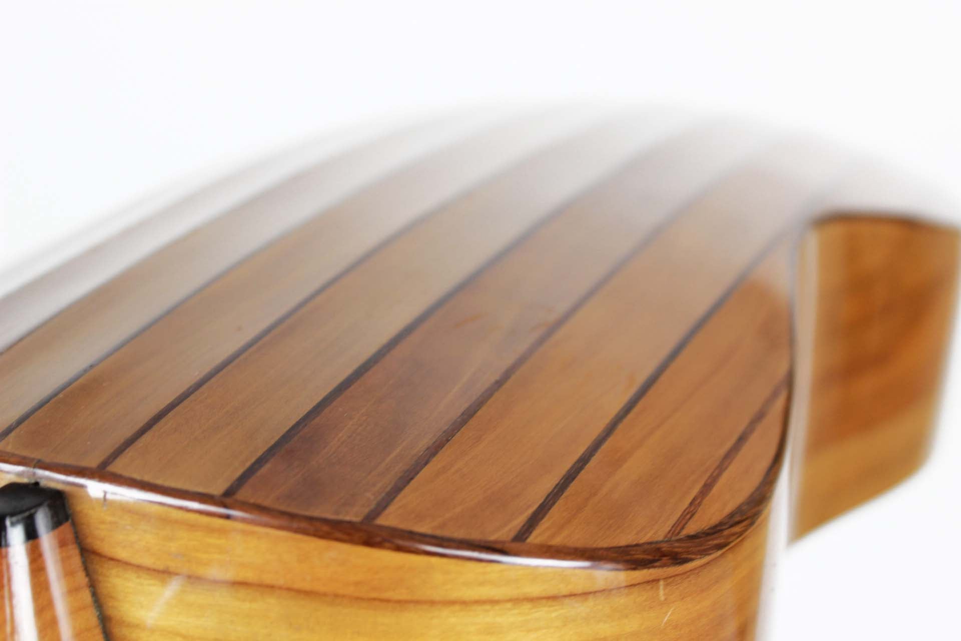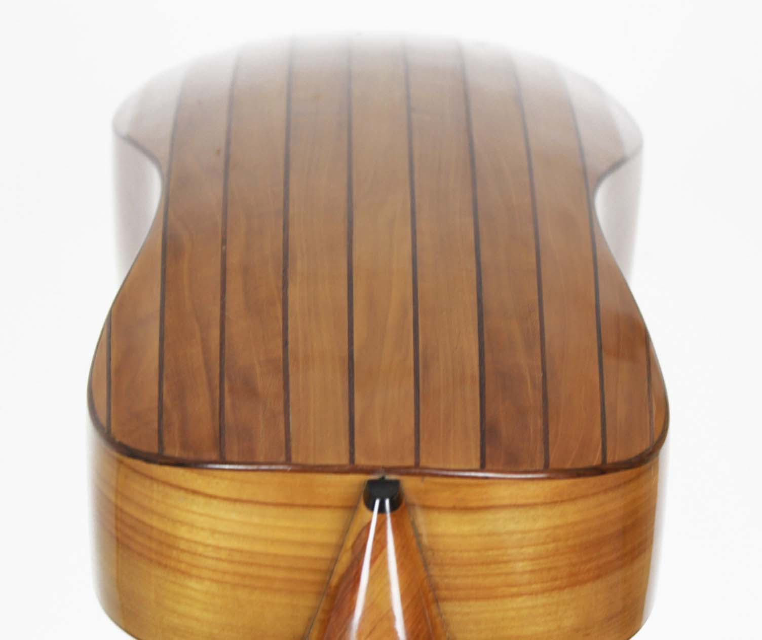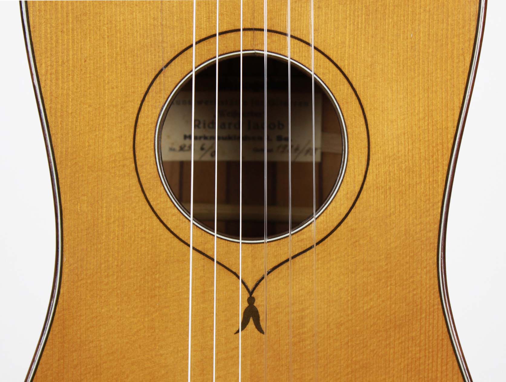 This instrument is a Tielke model, which was constructed in 1924 and finished in 1948 by one of the most important German luthiers: Richard Jacob Weissgerber. The penciled inscription on the crossbar above the sound hole shows the serial number 25.6/0. The two-piece top is made of nut-brown stained spruce wood. On height of the sound hole on the left side is a repaired crack that was cleated with some little pieces of spruce wood. The eleven-piece back is vaulted and consists of beautiful cherrywood just like the sides. The overall condition is very good for the age of this guitar. The finish and the tuning machines are original and the guitar comes with its original case.