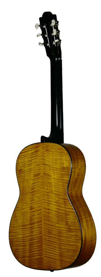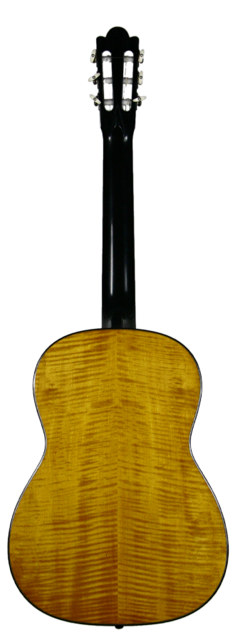 Richard Jacob Weissgerber has built around 3500 instruments of unique beauty. During the first years he also sold instruments to middlemen, which attached their own labels to the guitars. This Torres-Model from the later period was made in 1927 and corresponds to the typical Concert-Model of the late 1920’s. Miguel Llobet said about his guitars: “This is one of the few German guitars with a Spanish sound”. A special feature of those models from this time is the characteristic rosette consisting of ring patterns. The rosette is made of ebony and galalith. From 1933 onwards, most soundholes were only bordered by simple wood shavings. The top of this guitar is made of spruce and back and the sides are made of maple. The neck is that was made by Christoph Sembdner in the tradition of Richard Jacob. The neck is made from mahogany and is colored black. Also the head consists of mahagony and has an attached head plate on its front-side. A beautiful guitar in mint condition and has no repairs and no cracks.