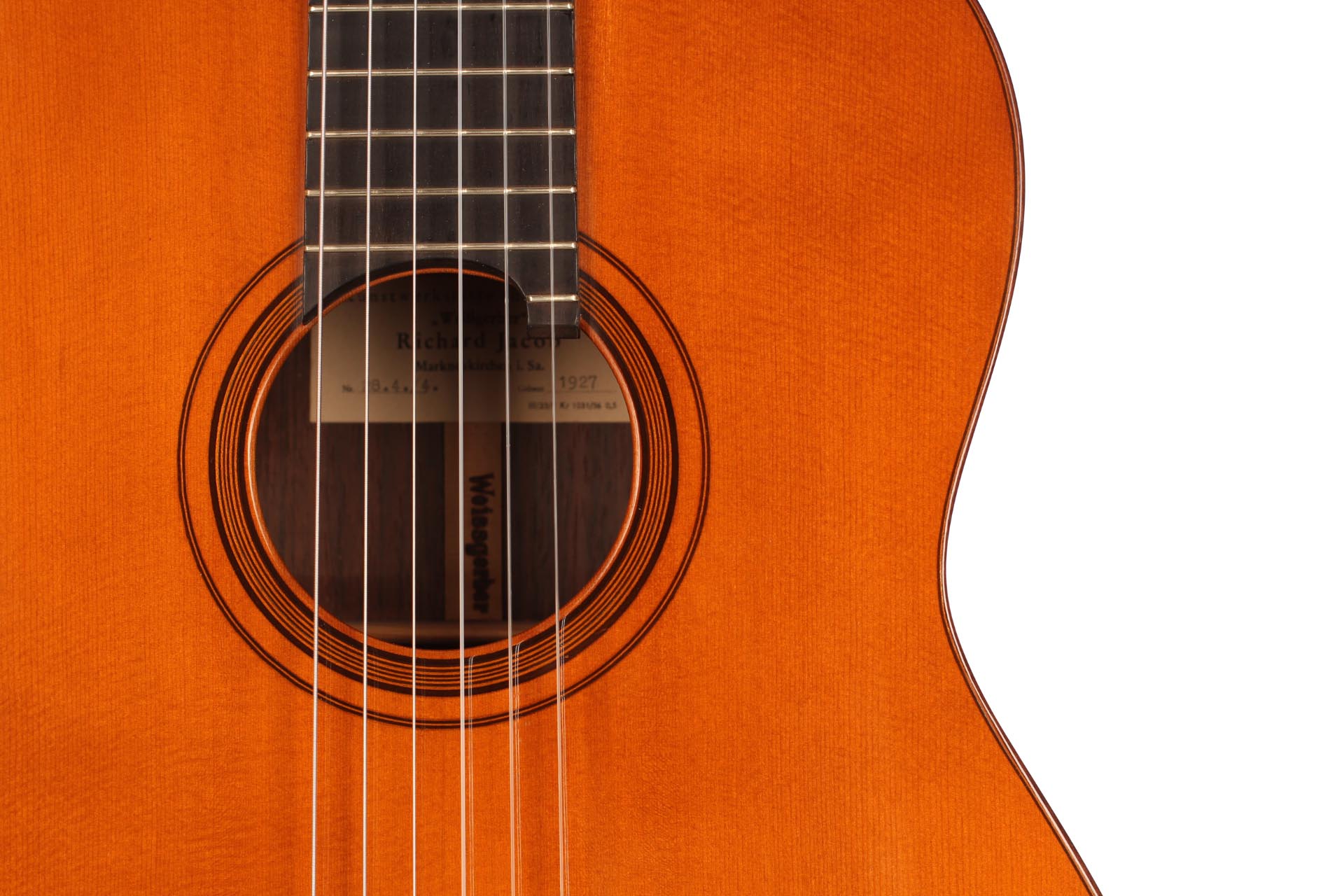 This beautiful 1927 Concert model is in amazing condition and built with the finest Rio rosewood. The guitar has a short well-repaired hairline crack on the bottom part of the top. The pencilled inscription on the crossbar above the sound hole has the serial number 28.4/4. It is a fine and sensible instrument with an incredibly sweet and rounded tone. The colour possibilities are endless, and the playability is perfect. It is probably the best guitar from Richard Weissgerber that ever entered our shop. The tuners a top-class Rodgers and a hard-shell case is included.