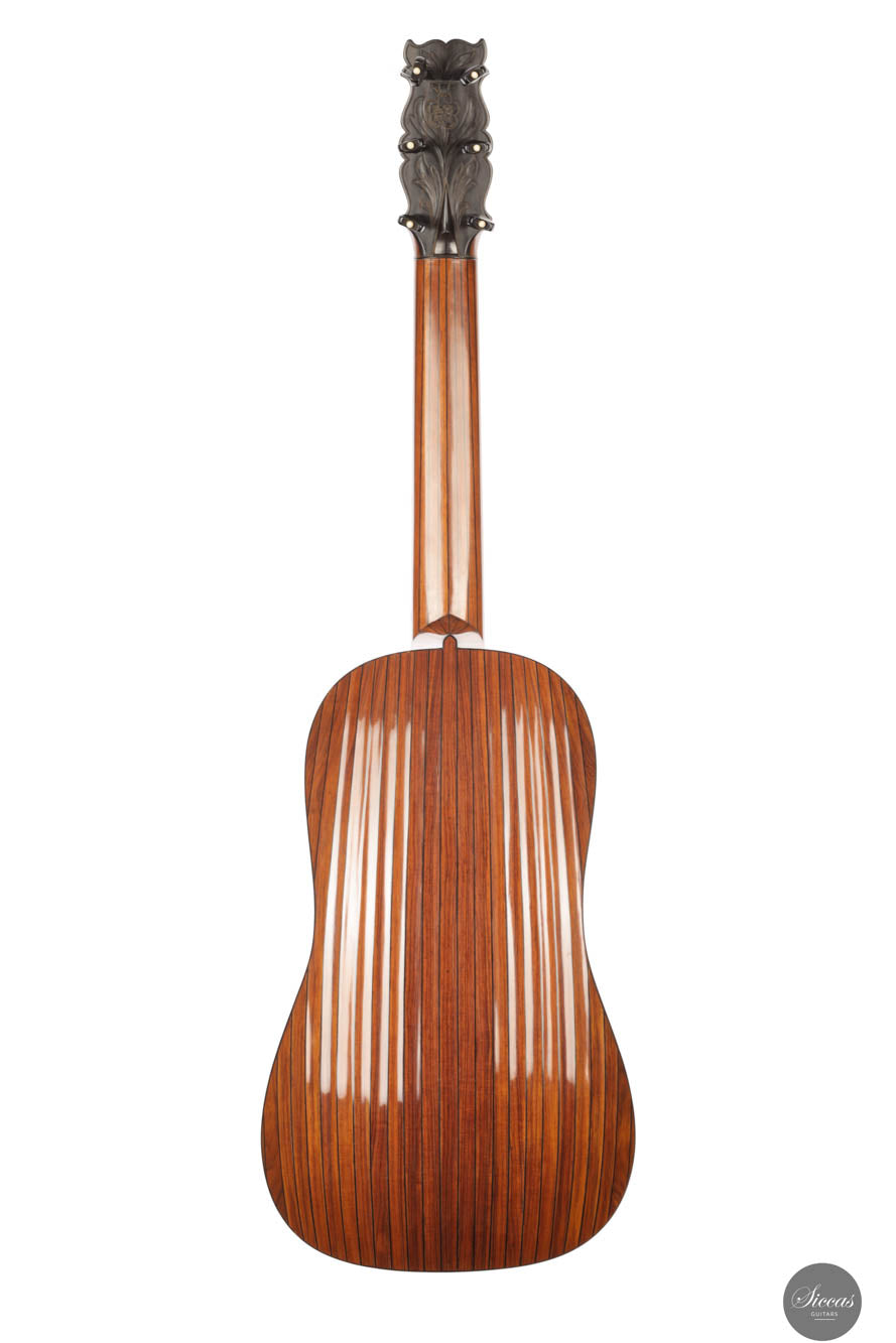 This stunning historical instrument by Weissgerber is not just a guitar—it is a true work of art. According to Richard Jacob’s daughter, who watched him in fascination as he worked during her childhood, the back of the Vihuela was assembled through a long, intricate, and highly complex process. This particular instrument belongs to the later generation of Weissgerber vihuelas and features an impressive 21-rib construction, a testament to the builder’s meticulous craftsmanship.