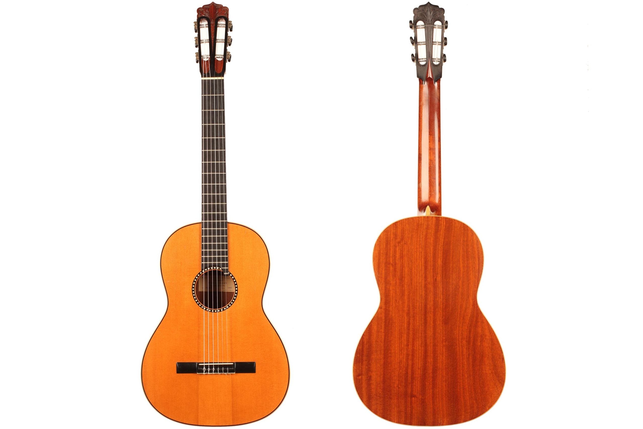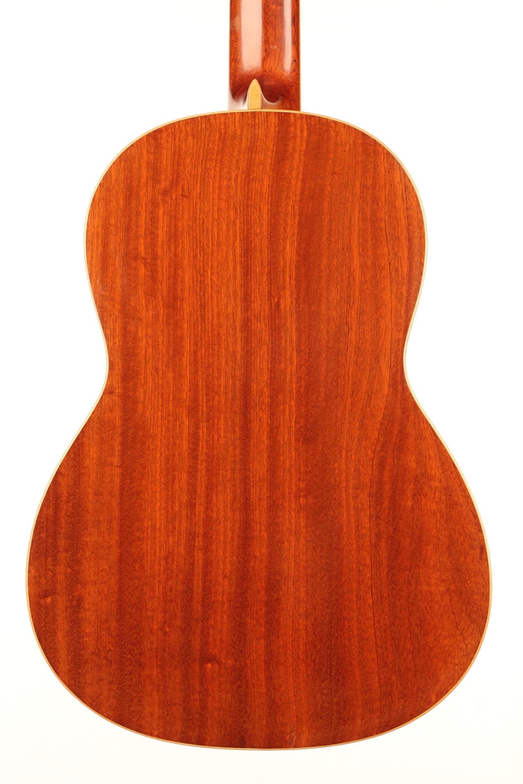 This beautiful Richard Jacob “Weissgerber” Spanish concert model was built in 1943. It has an elegant carved head-plate in the style of Francisco Simplicio, as well as a carved Ebony back plate. The top is free from cracks and has still its original varnish. The fluted one-piece Mahogany back has only one very small repaired crack at the bottom and four discreet repaired hairline cracks can be found on the sides. This guitar is very spontaneous and has a clear sweet tone. It is very fine and comfortable to play, very sensitive to the player’s stroke. This highly collectable guitar is definitely ready to be picked up and played.
