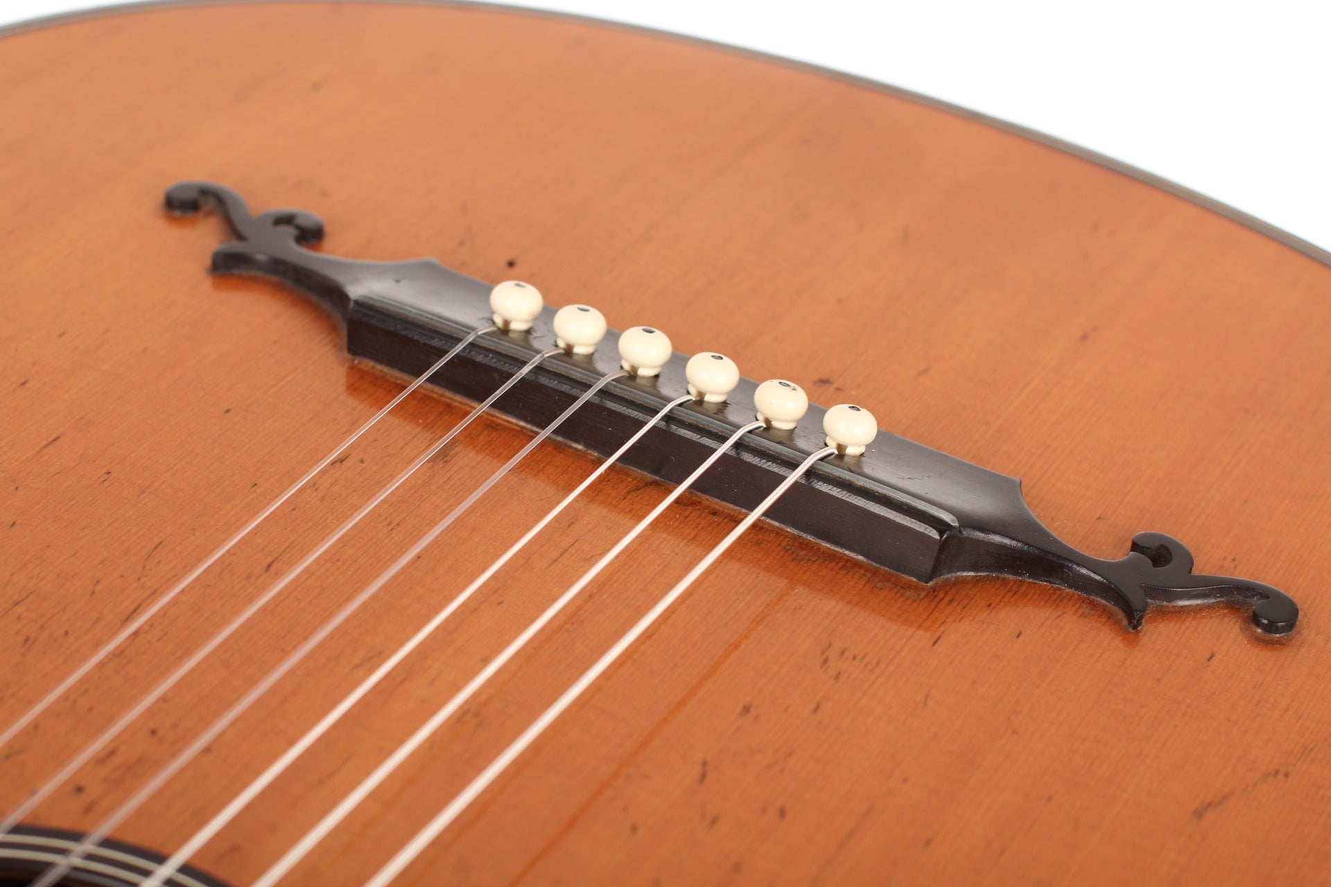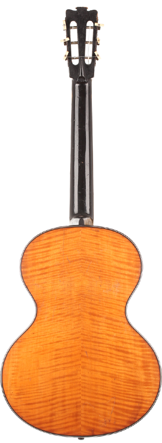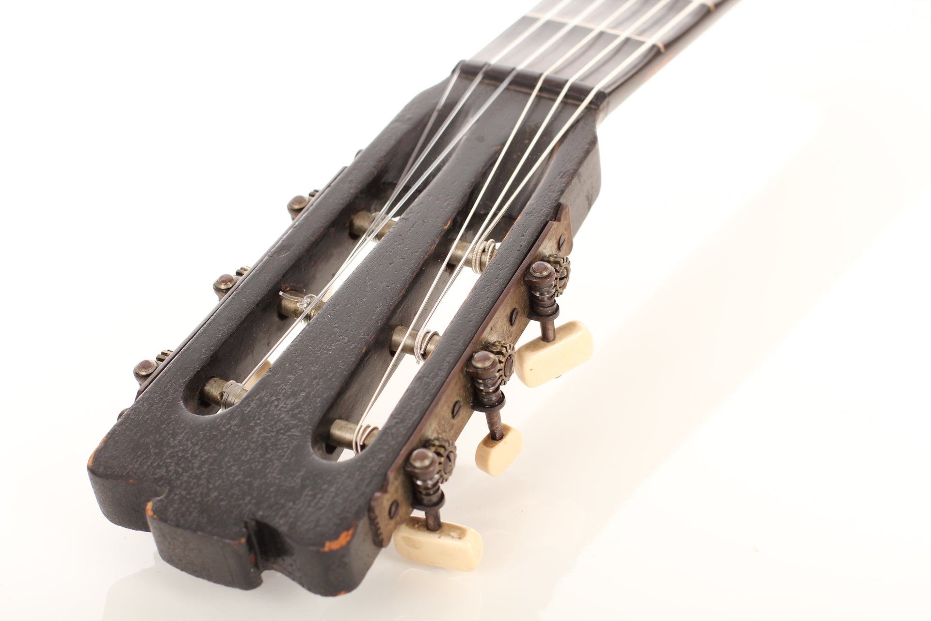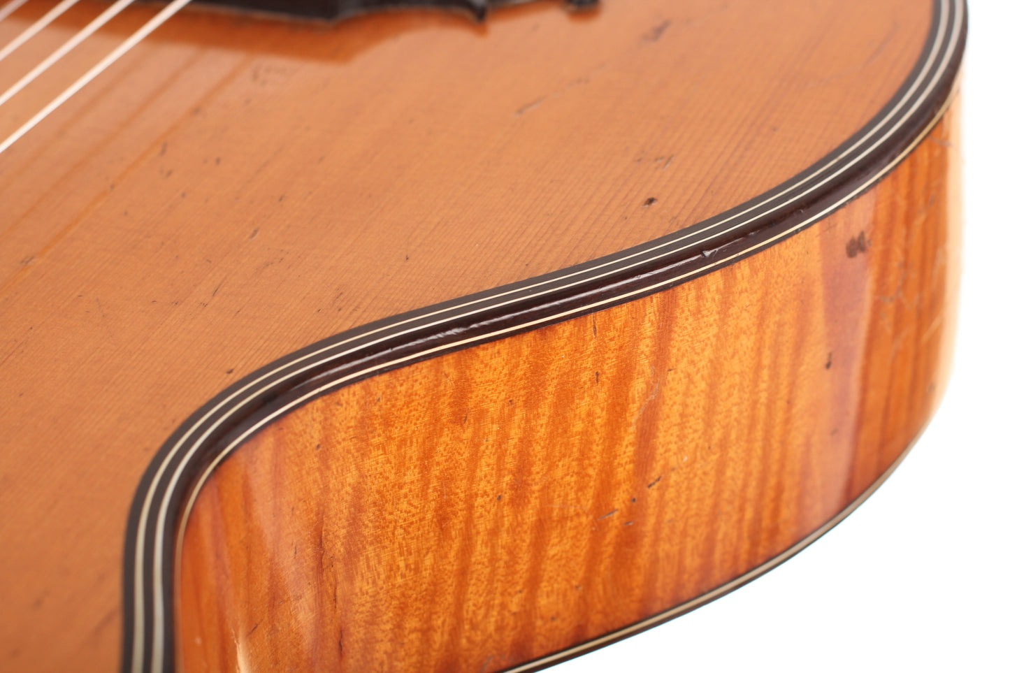 Richard Jacob Weissgerber has built around 3500 instruments of unique beauty. During the first years he also sold instruments to middlemen, which attached their own labels to the guitars. This Viennesse Model which was constructed in 1917 by Richard Jacob does also belong to these instruments. The penciled inscription on the crossbar above the sound hole has the serial number 16.5/4. The two-piece top is made of nut-brown stained spruce wood. On height of the fretboard, on the left side, is a repaired crack that was cleated with some little pieces of spruce wood. You can also find one repaired crack on the back. The overall condition is very good for the age of this guitar. The finish and the tuning machines are original and the guitar. A hardshell case is included.