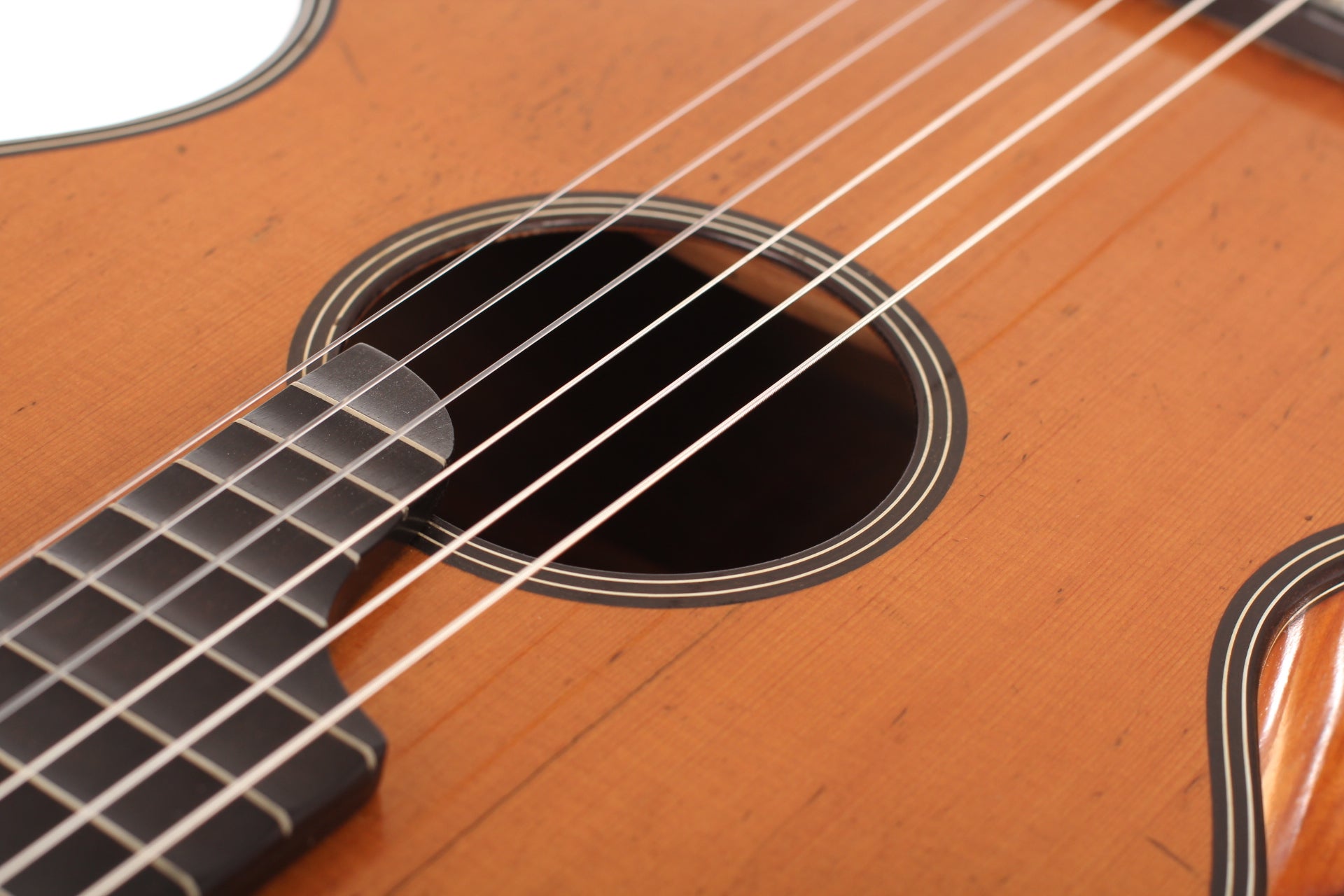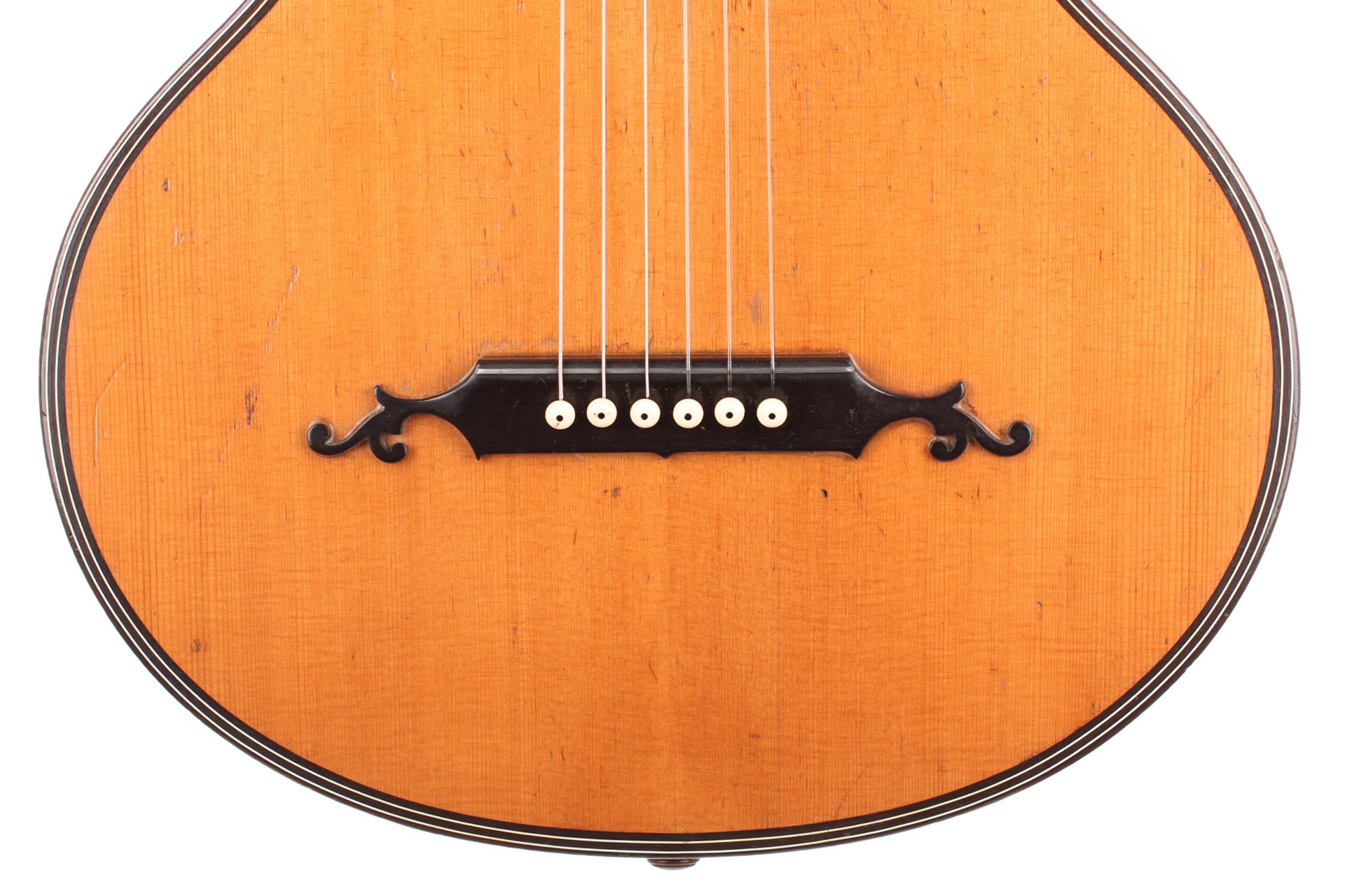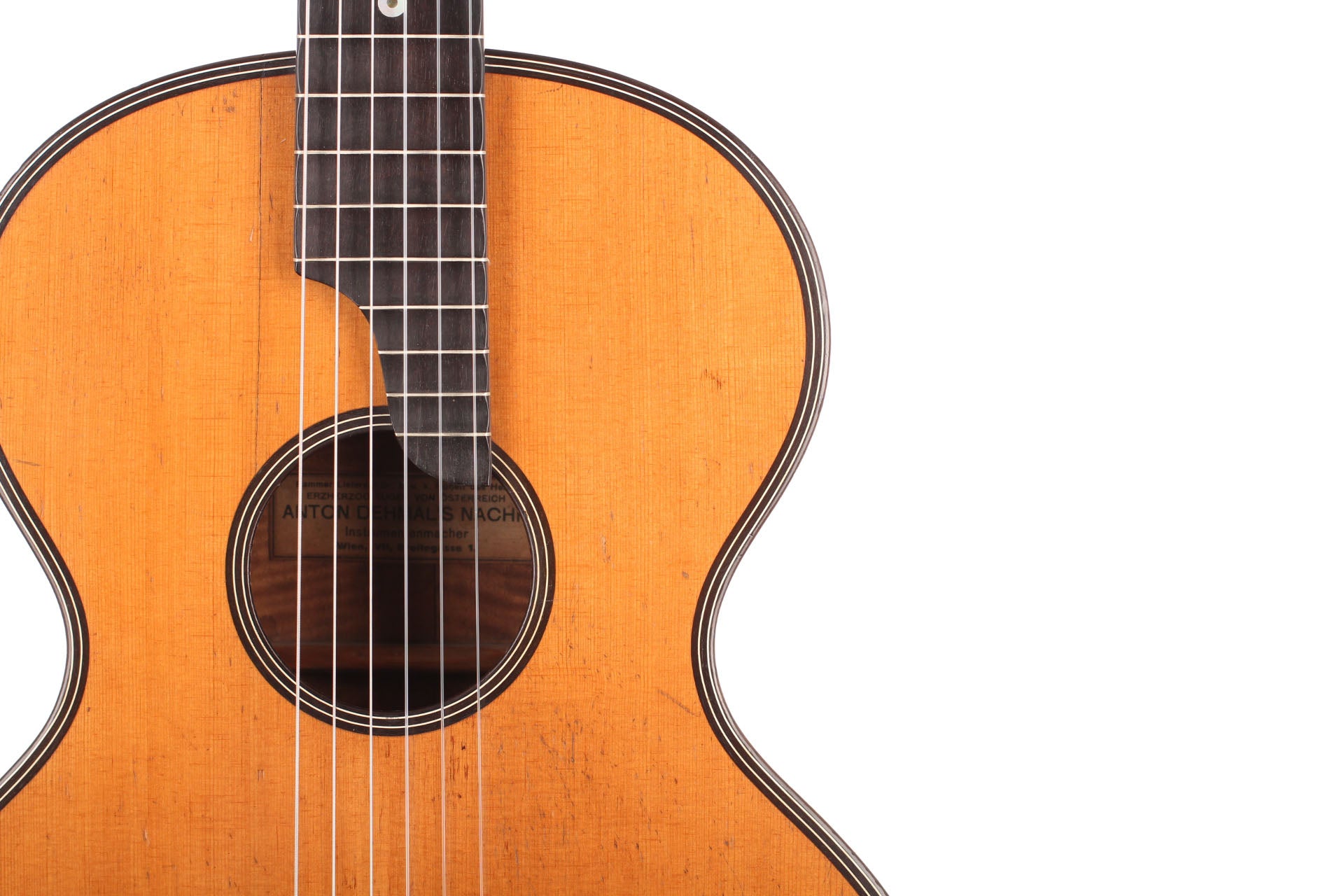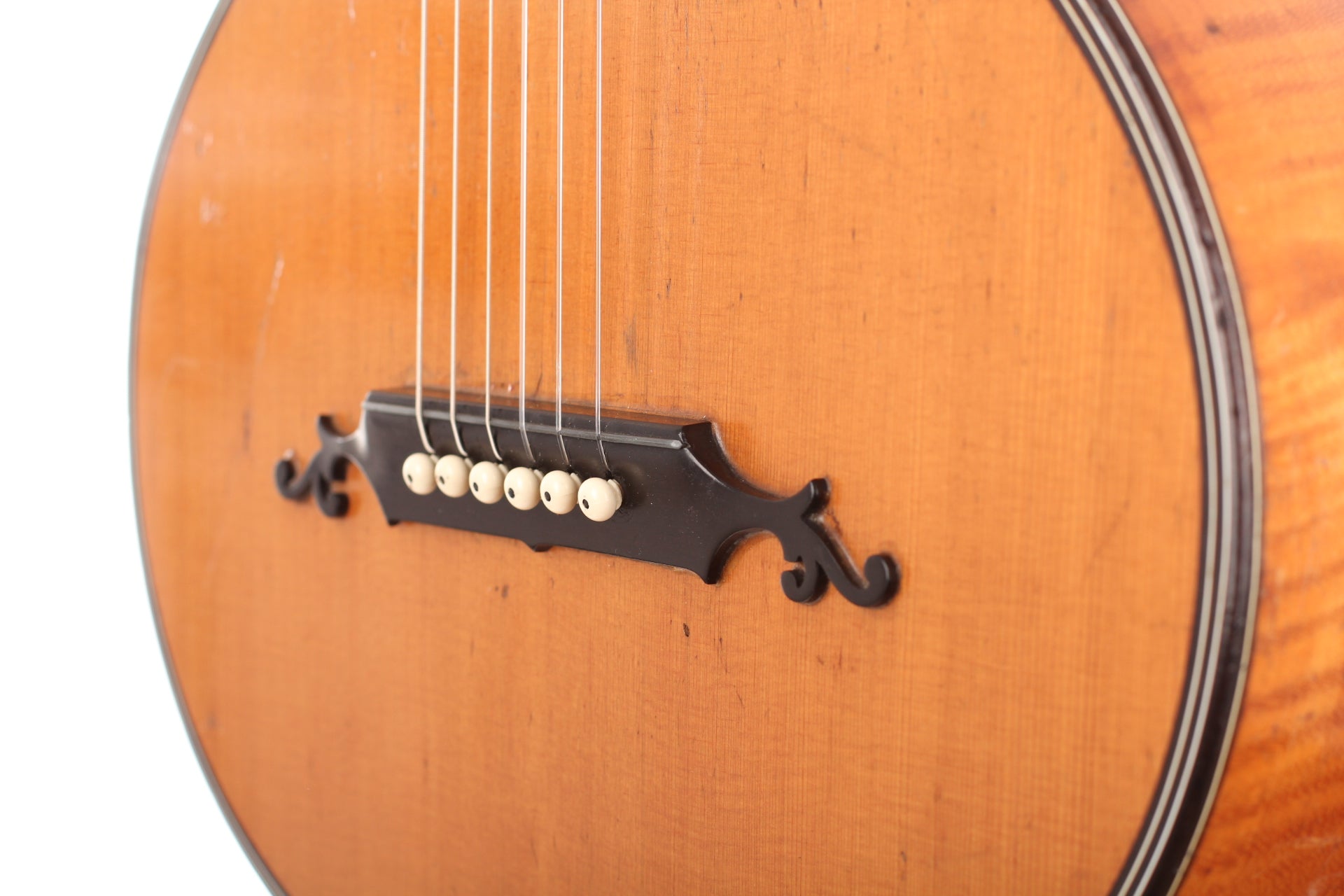 Richard Jacob Weissgerber has built around 3500 instruments of unique beauty. During the first years he also sold instruments to middlemen, which attached their own labels to the guitars. This Viennesse Model which was constructed in 1917 by Richard Jacob does also belong to these instruments. The penciled inscription on the crossbar above the sound hole has the serial number 16.5/4. The two-piece top is made of nut-brown stained spruce wood. On height of the fretboard, on the left side, is a repaired crack that was cleated with some little pieces of spruce wood. You can also find one repaired crack on the back. The overall condition is very good for the age of this guitar. The finish and the tuning machines are original and the guitar. A hardshell case is included.