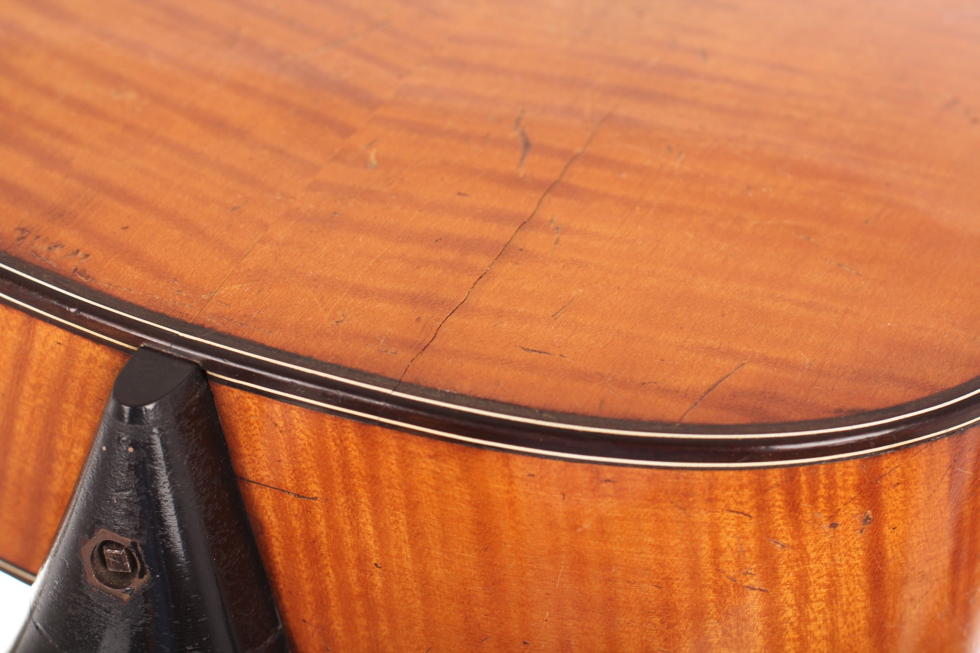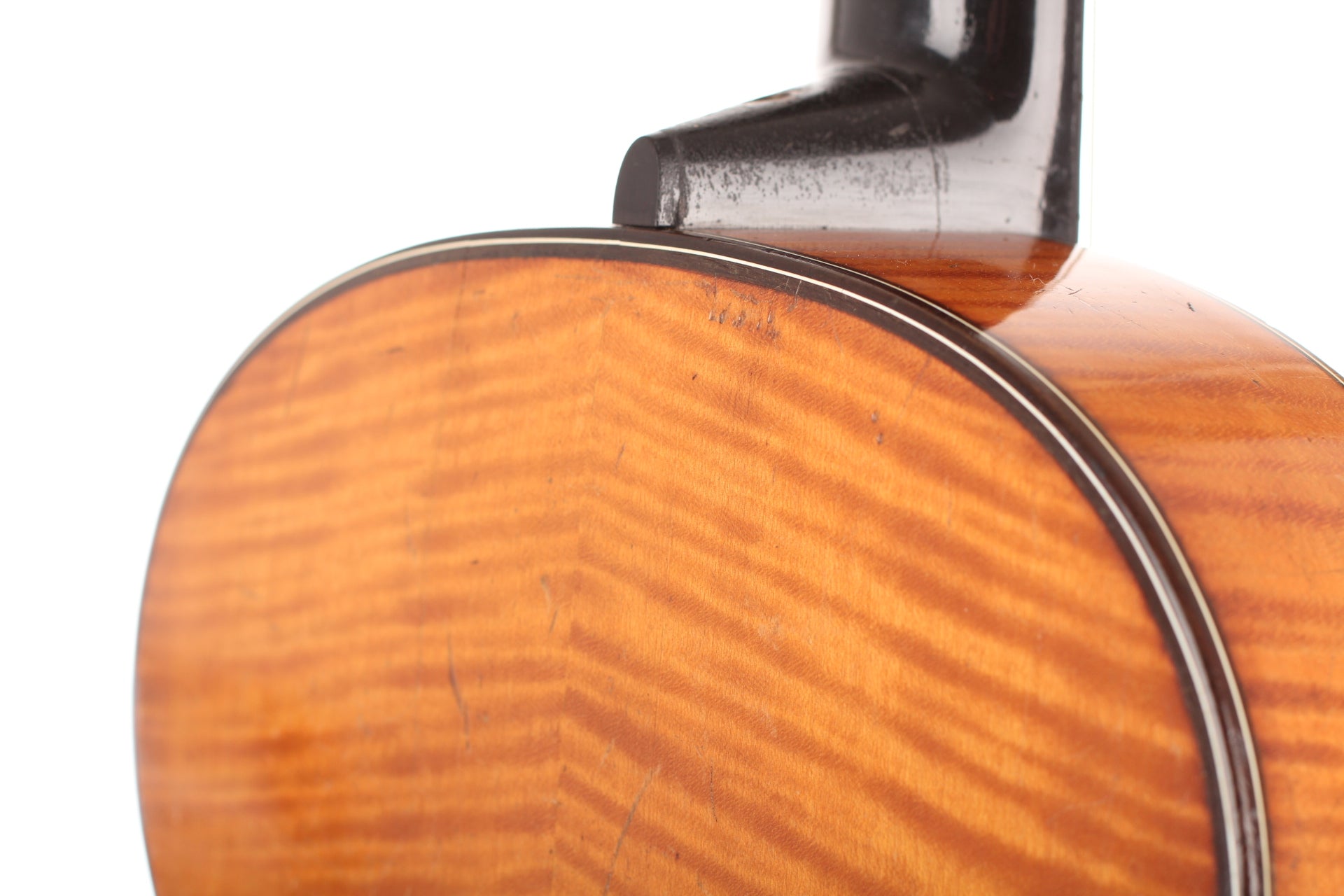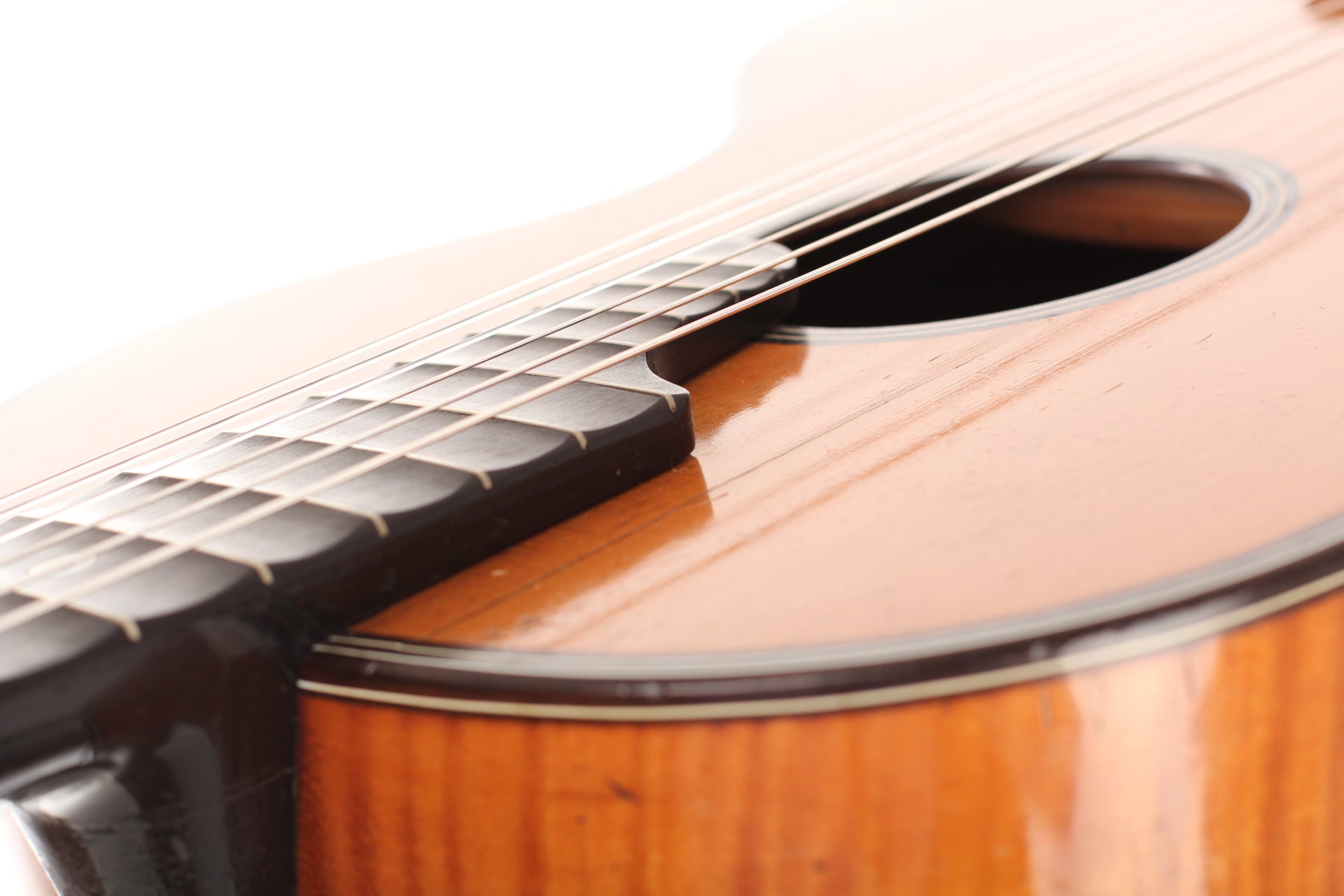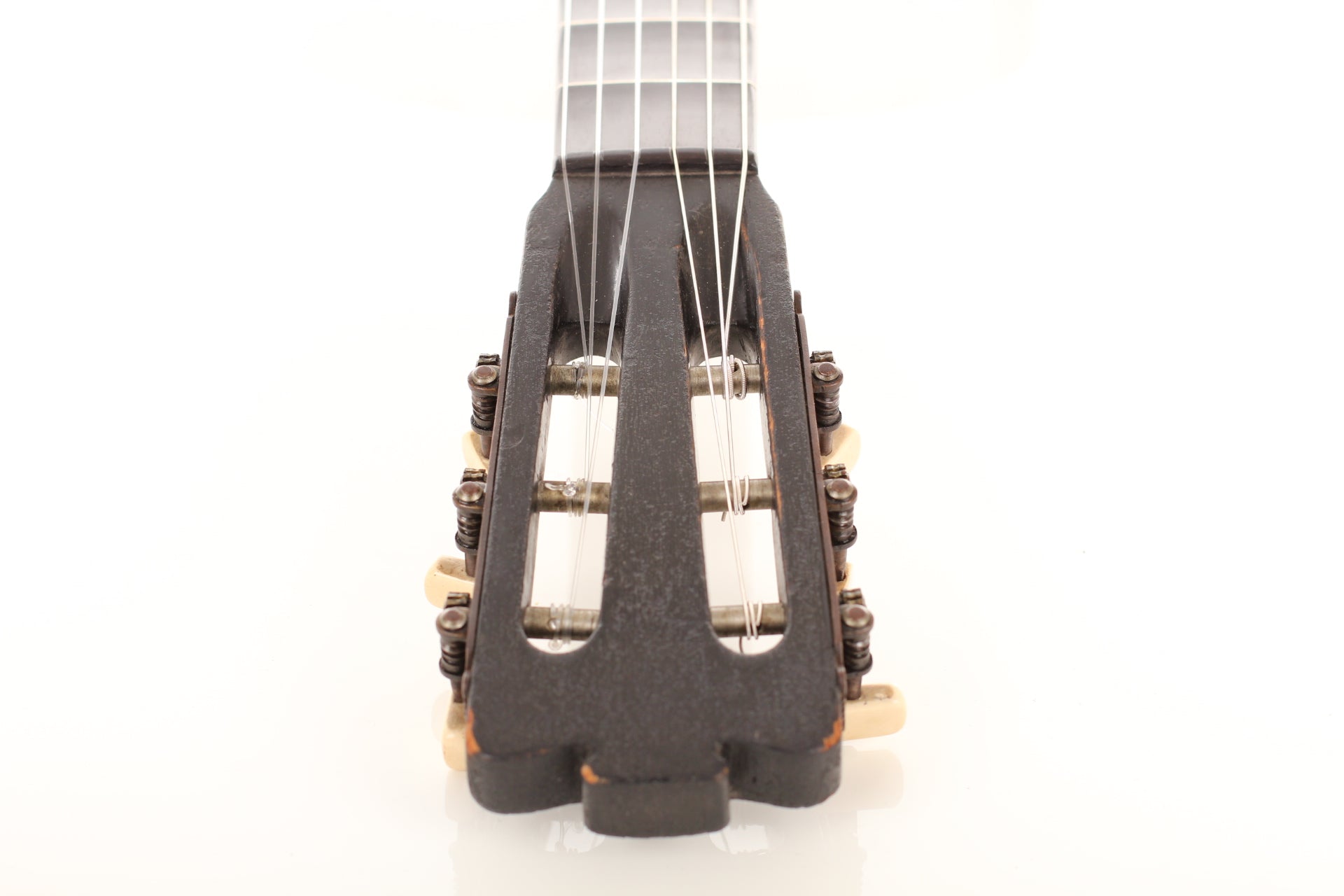 Richard Jacob Weissgerber has built around 3500 instruments of unique beauty. During the first years he also sold instruments to middlemen, which attached their own labels to the guitars. This Viennesse Model which was constructed in 1917 by Richard Jacob does also belong to these instruments. The penciled inscription on the crossbar above the sound hole has the serial number 16.5/4. The two-piece top is made of nut-brown stained spruce wood. On height of the fretboard, on the left side, is a repaired crack that was cleated with some little pieces of spruce wood. You can also find one repaired crack on the back. The overall condition is very good for the age of this guitar. The finish and the tuning machines are original and the guitar. A hardshell case is included.