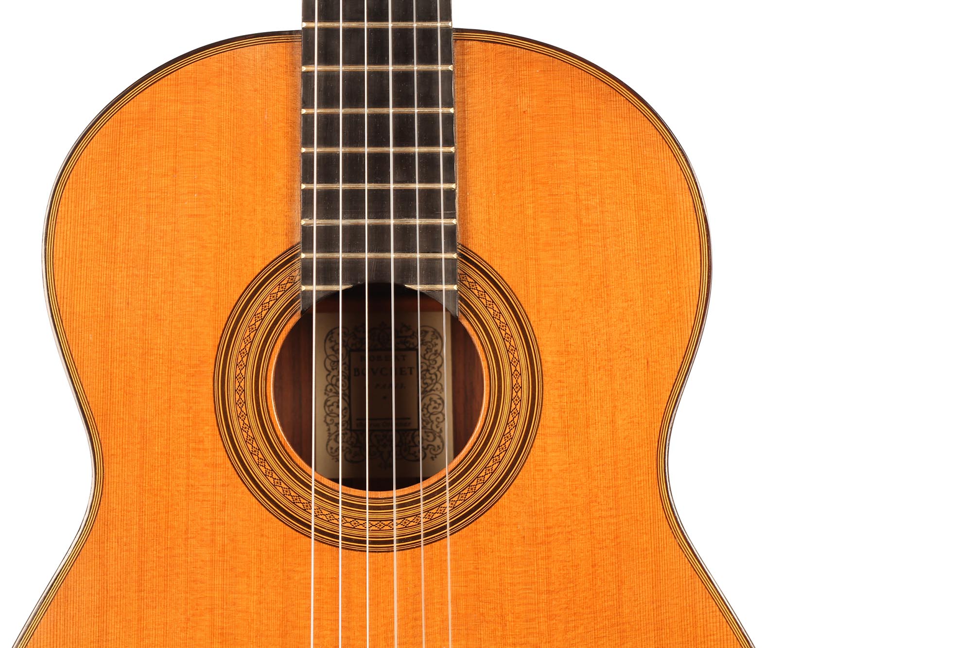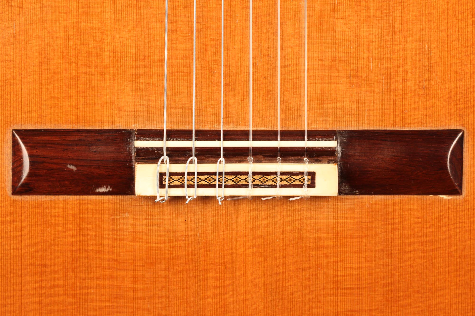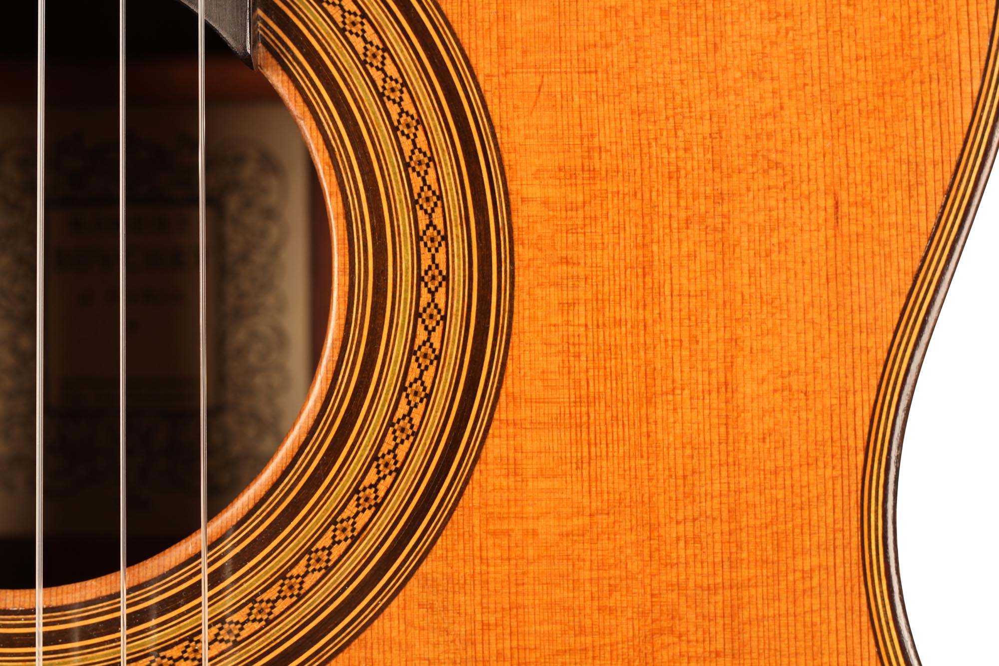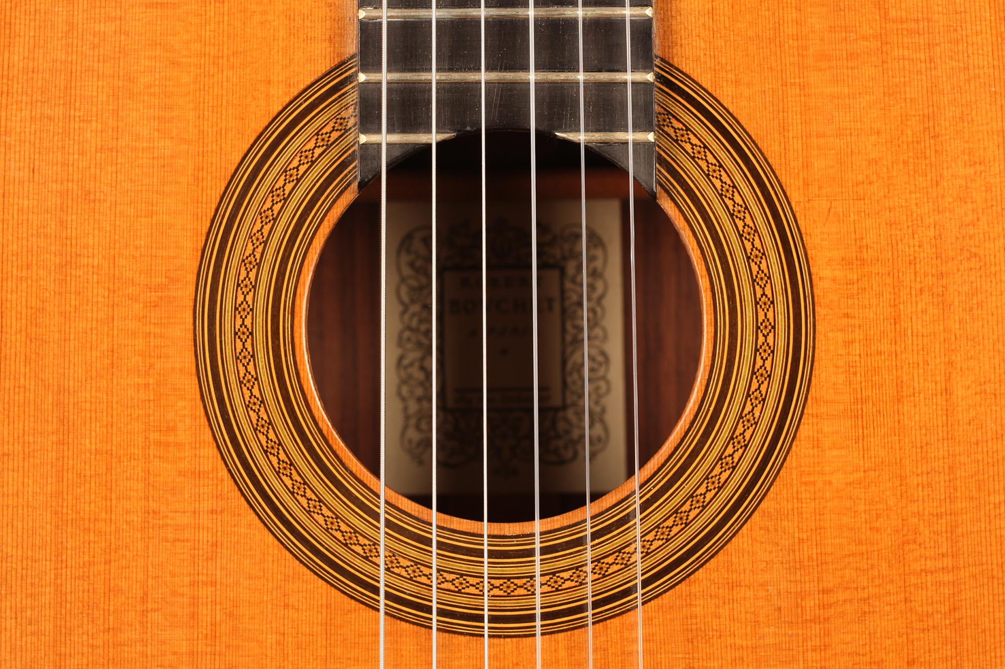 This 1977 guitar with the number 147 is one of his youngest instruments and was built when he was at the height of his knowledge and skill. Two features make this instrument a rarity: it is the only cedar top guitar R. Bouchet has ever built. It is in a pristine original condition, free of cracks. Even the varnish and the mechanics are original.