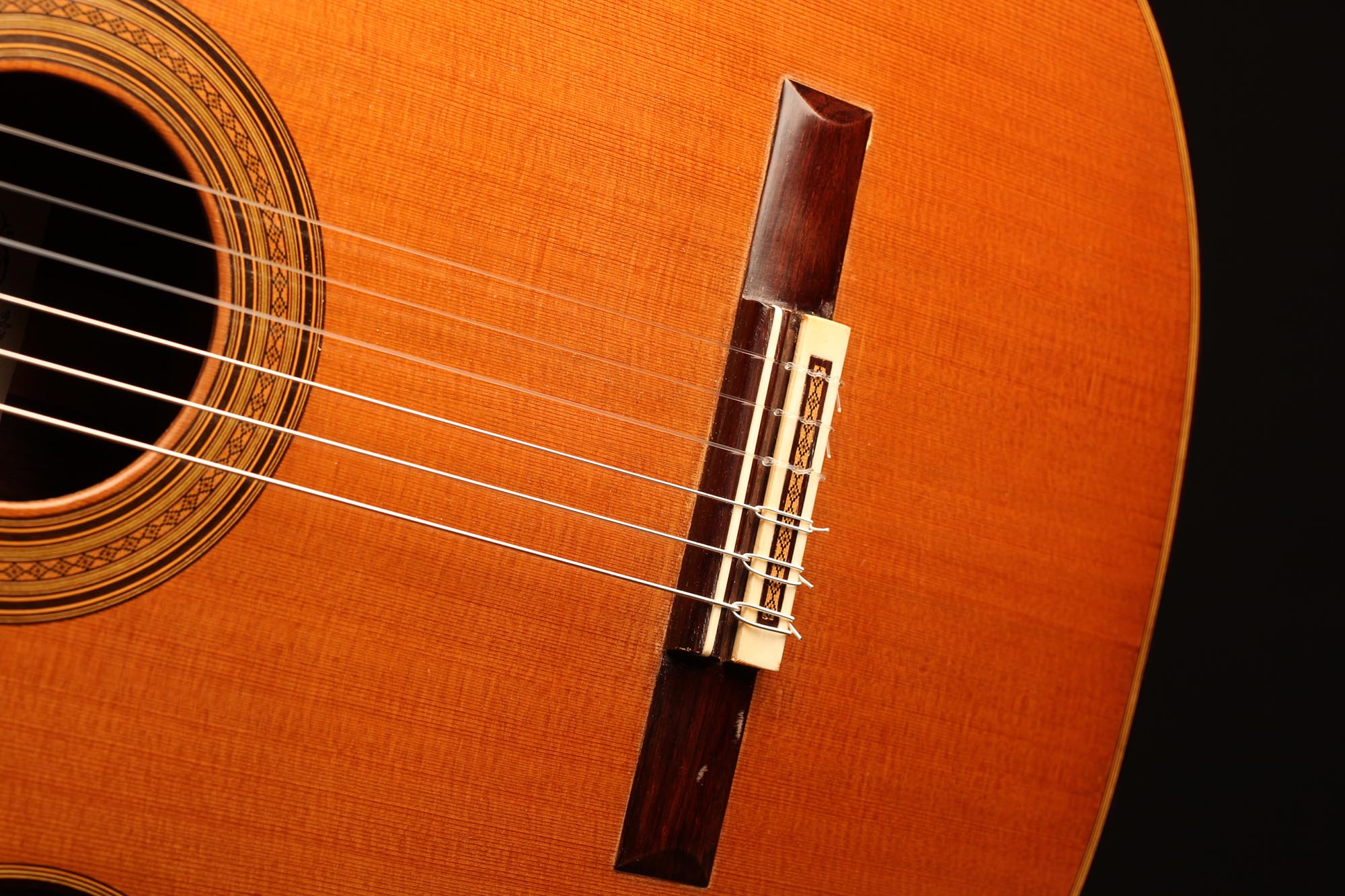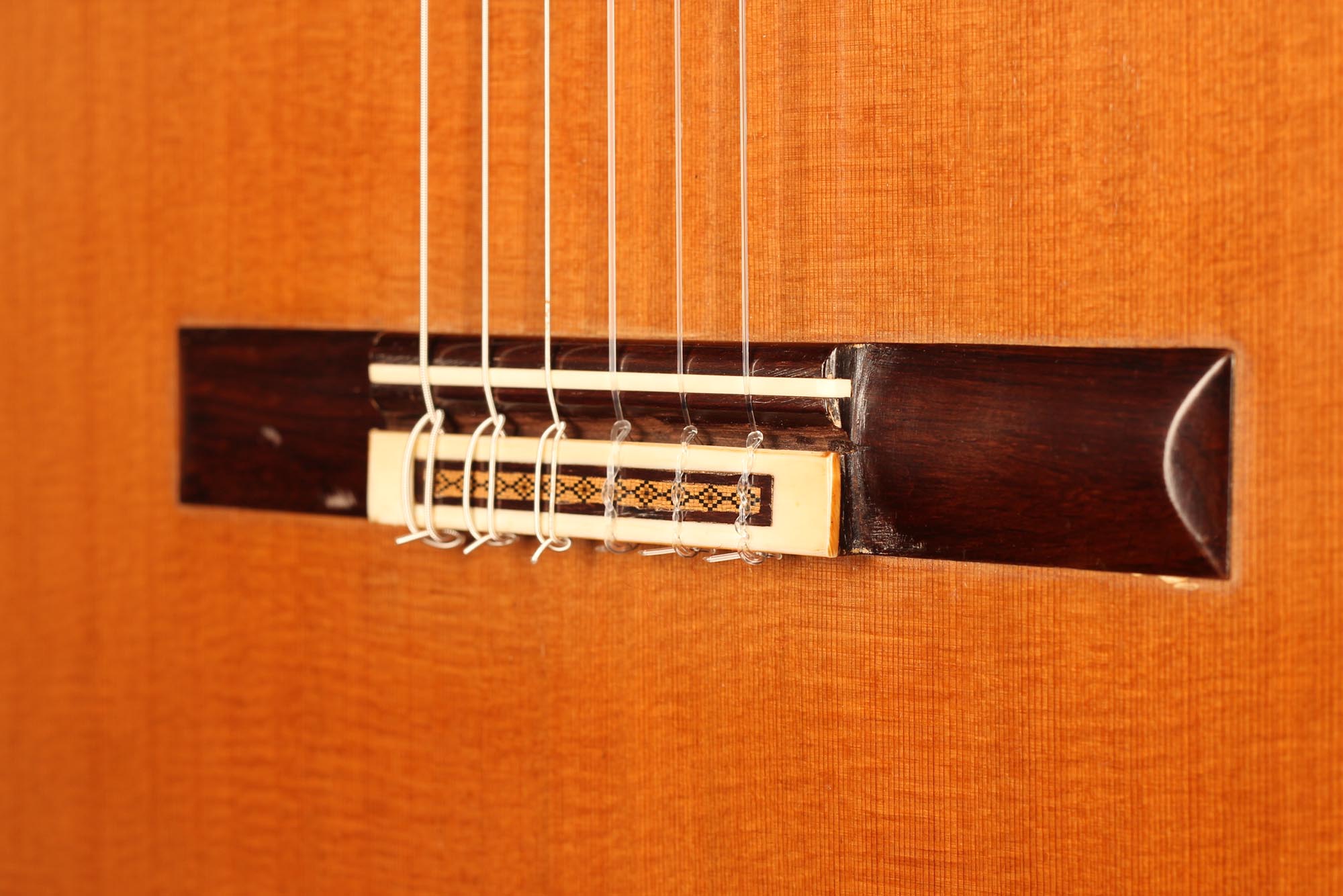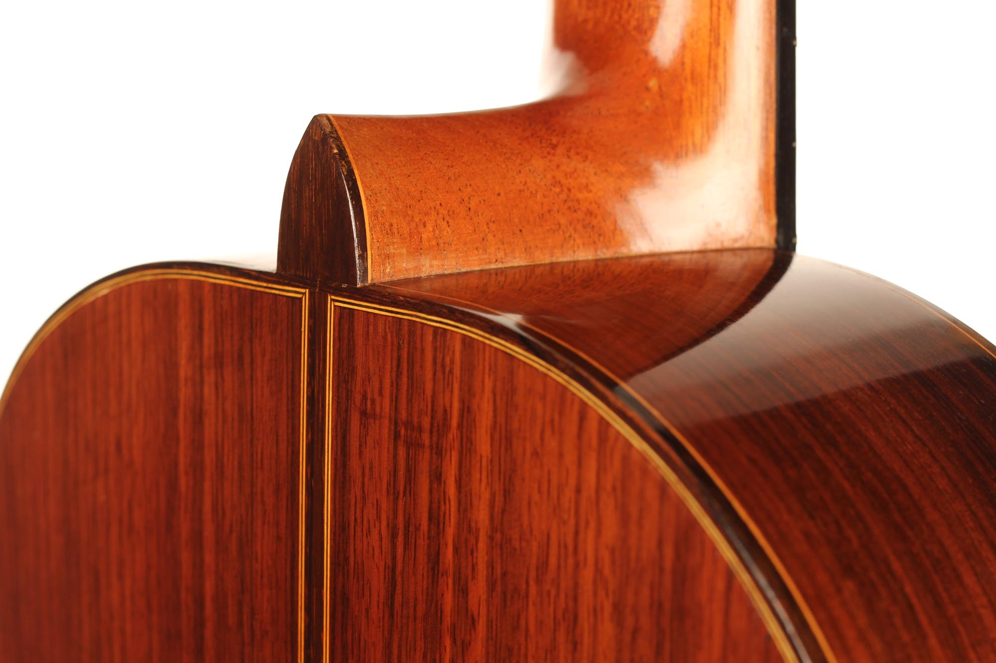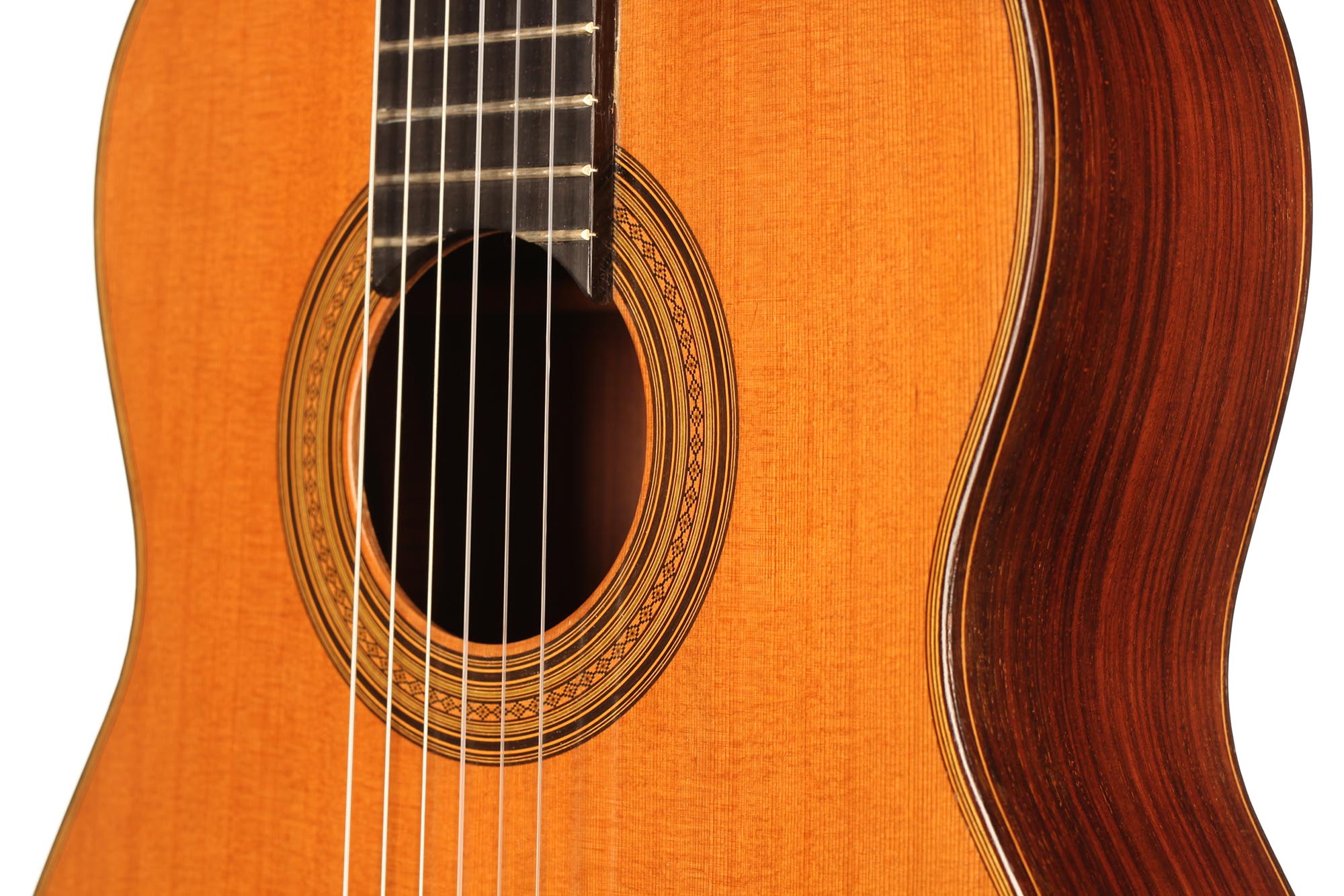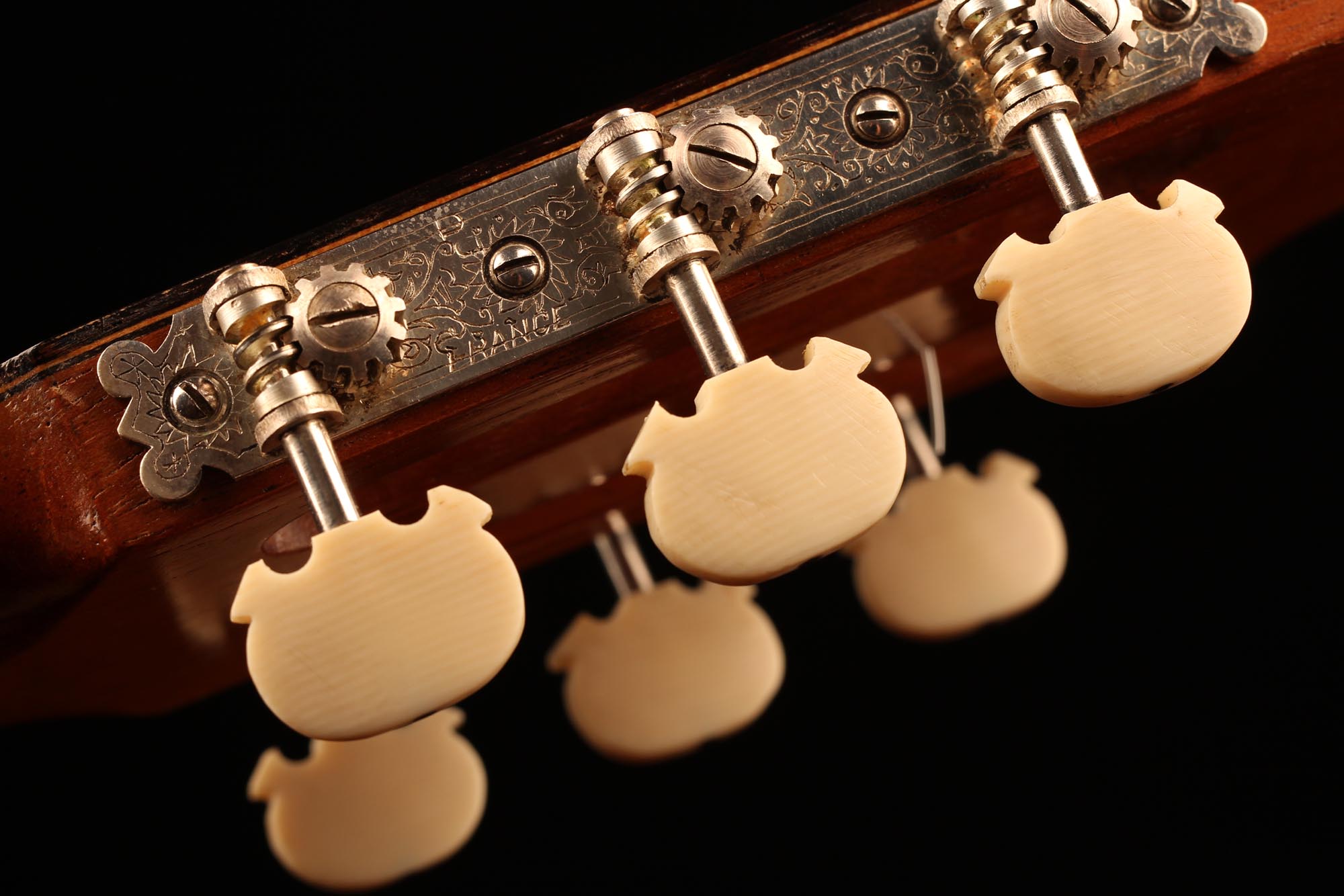 This 1977 guitar with the number 147 is one of his youngest instruments and was built when he was at the height of his knowledge and skill. Two features make this instrument a rarity: it is the only cedar top guitar R. Bouchet has ever built. It is in a pristine original condition, free of cracks. Even the varnish and the mechanics are original.