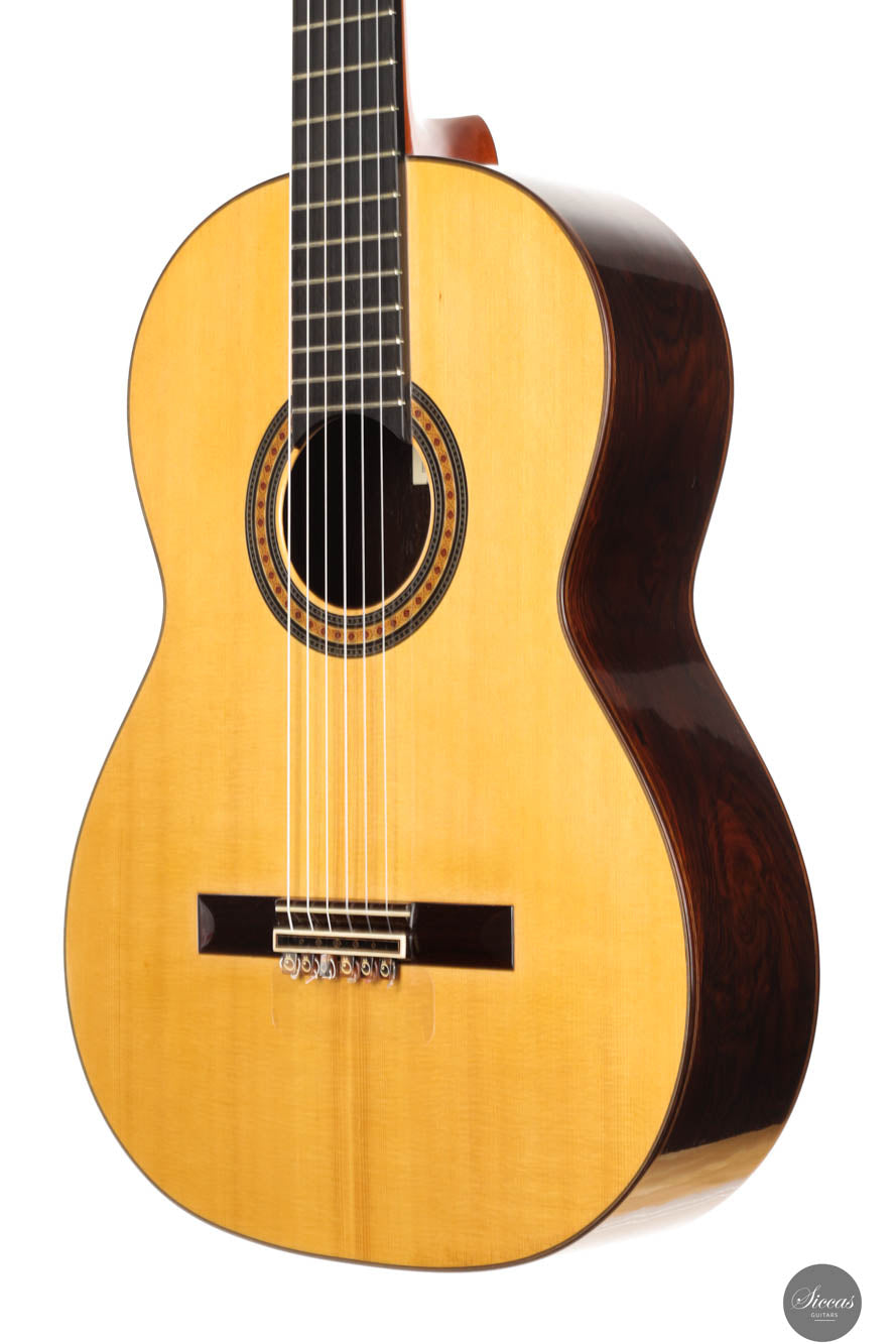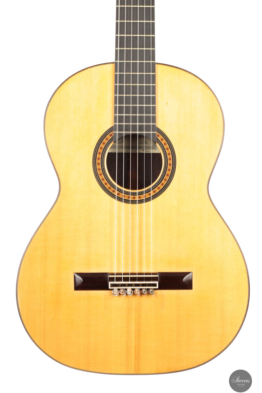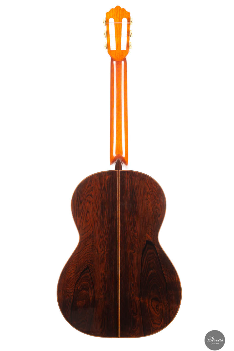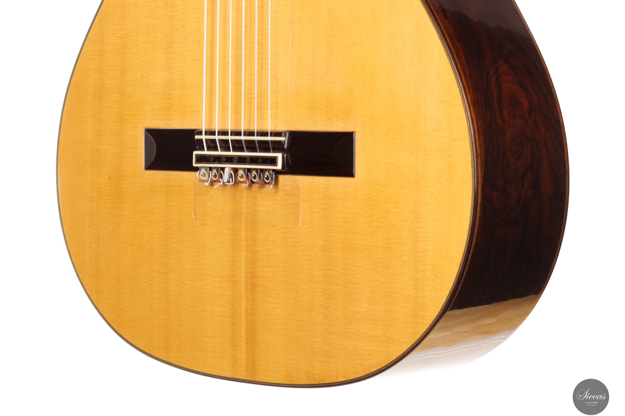 The spruce top has developed a rich, mature color over time, creating a striking contrast with the dark, Brazilian rosewood used for the back and sides. But this guitar is much more than a visual masterpiece or a collector’s item: it is a superb concert instrument with breathtaking sound characteristics. The tone is mature, perfectly balanced, and powerful, with an almost endless sustain. Deep, rounded basses blend seamlessly with the rich, overtone-filled trebles, offering a sound that is both open and full of character. Despite its long scale length, the guitar is very comfortable to play thanks to its well-shaped neck profile and responsive soundboard. The condition of this guitar is excellent, showing only normal wear and nail marks on the top and light scratches on the back.