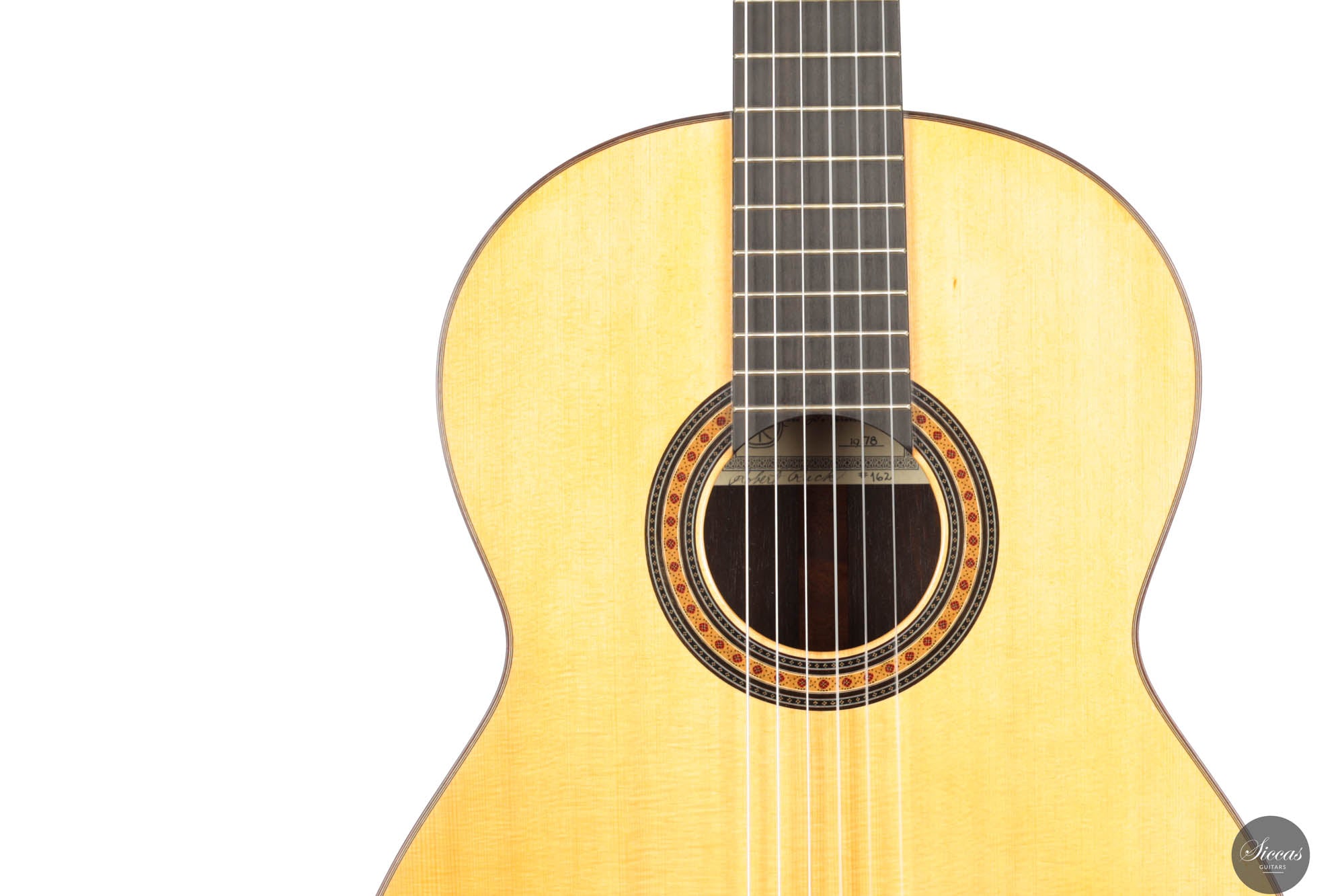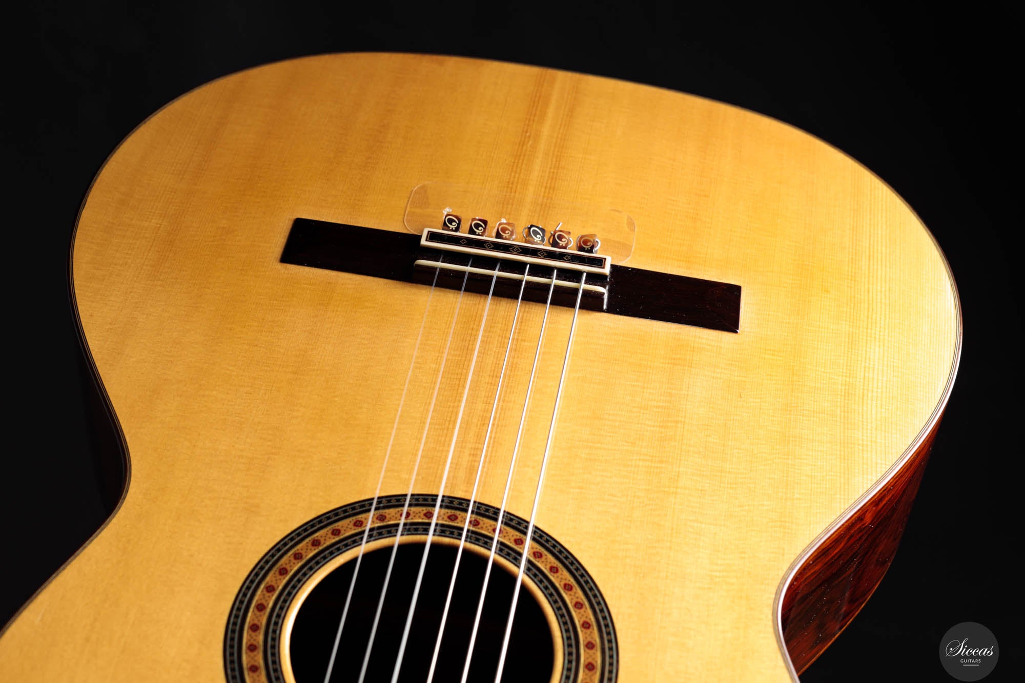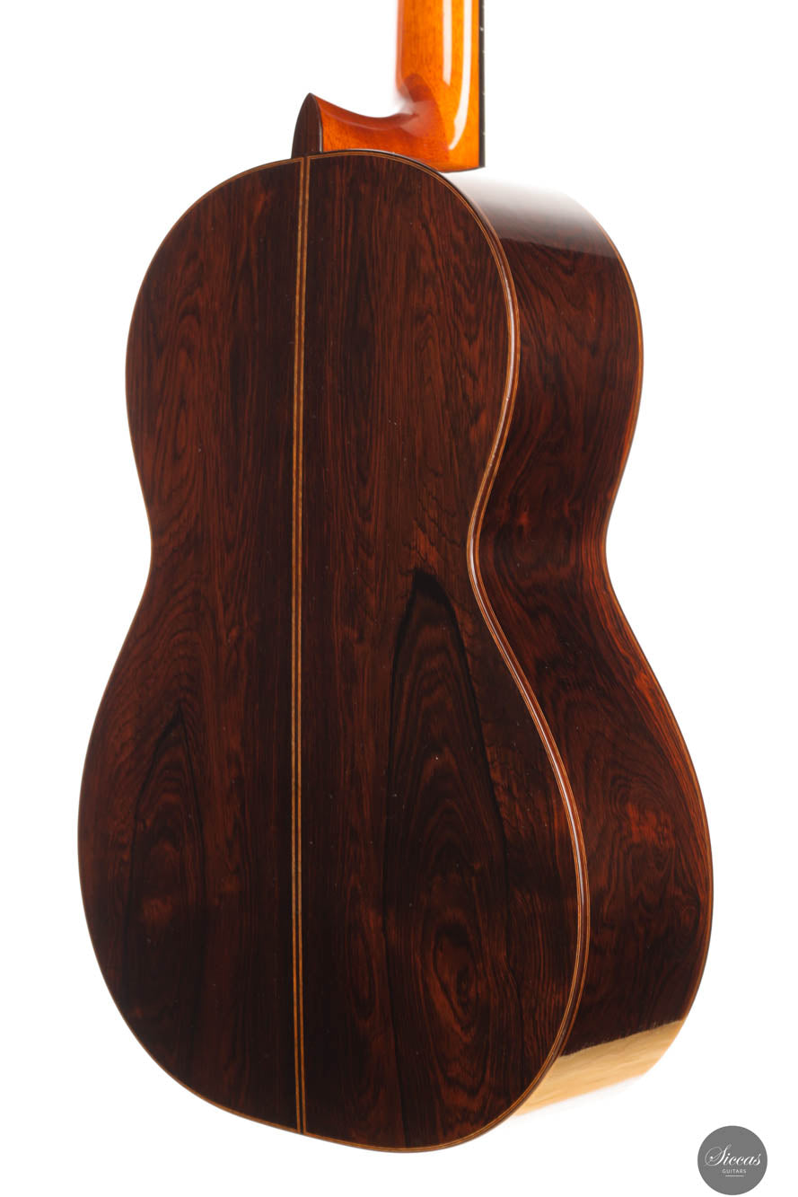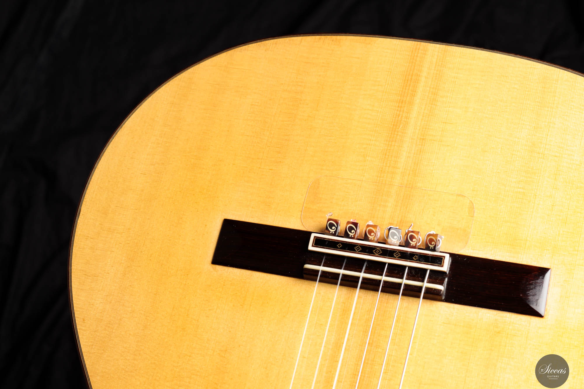 The spruce top has developed a rich, mature color over time, creating a striking contrast with the dark, Brazilian rosewood used for the back and sides. But this guitar is much more than a visual masterpiece or a collector’s item: it is a superb concert instrument with breathtaking sound characteristics. The tone is mature, perfectly balanced, and powerful, with an almost endless sustain. Deep, rounded basses blend seamlessly with the rich, overtone-filled trebles, offering a sound that is both open and full of character. Despite its long scale length, the guitar is very comfortable to play thanks to its well-shaped neck profile and responsive soundboard. The condition of this guitar is excellent, showing only normal wear and nail marks on the top and light scratches on the back.