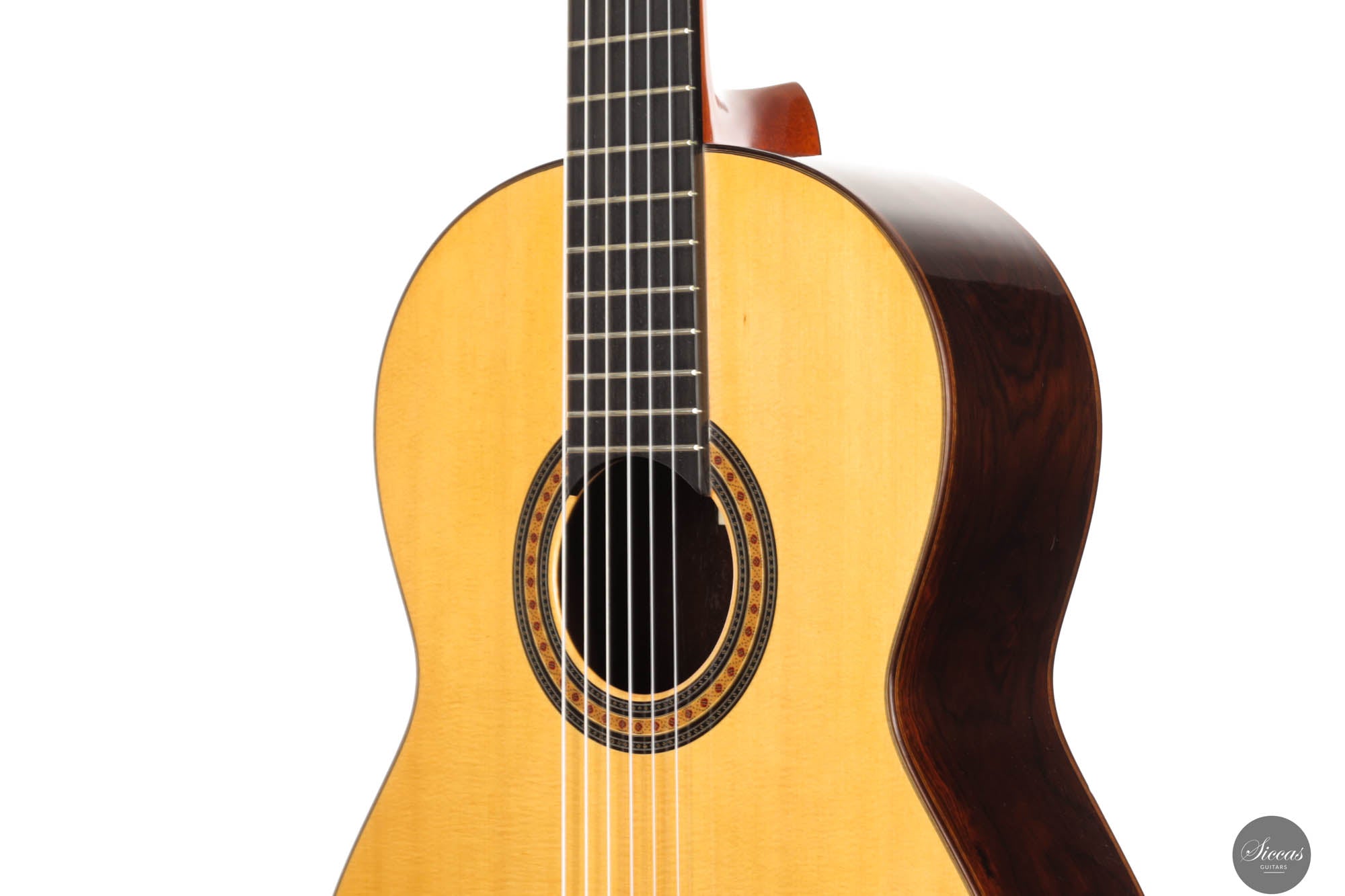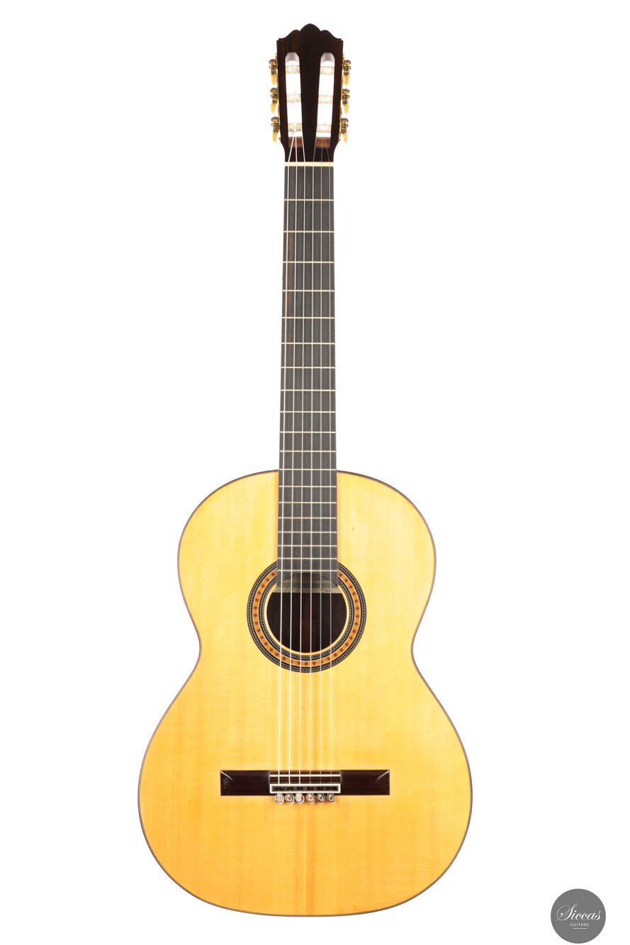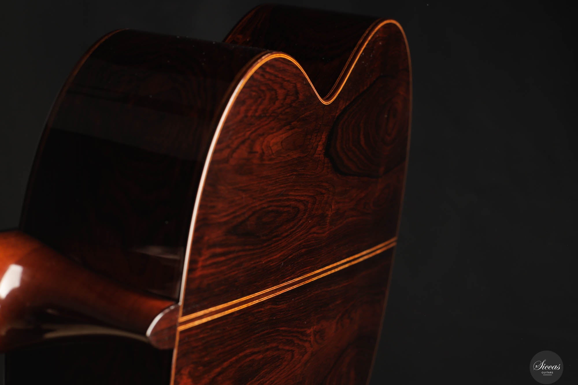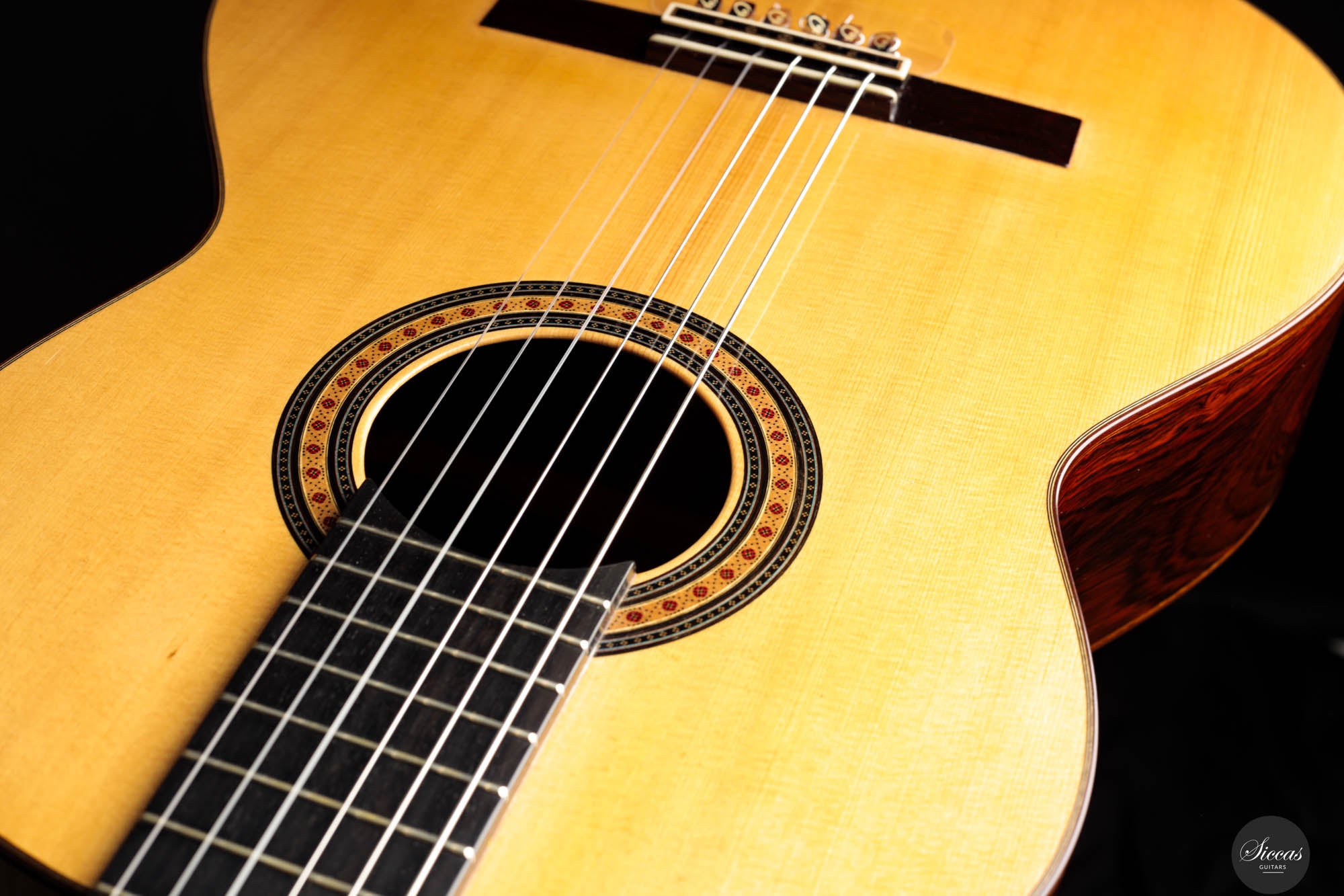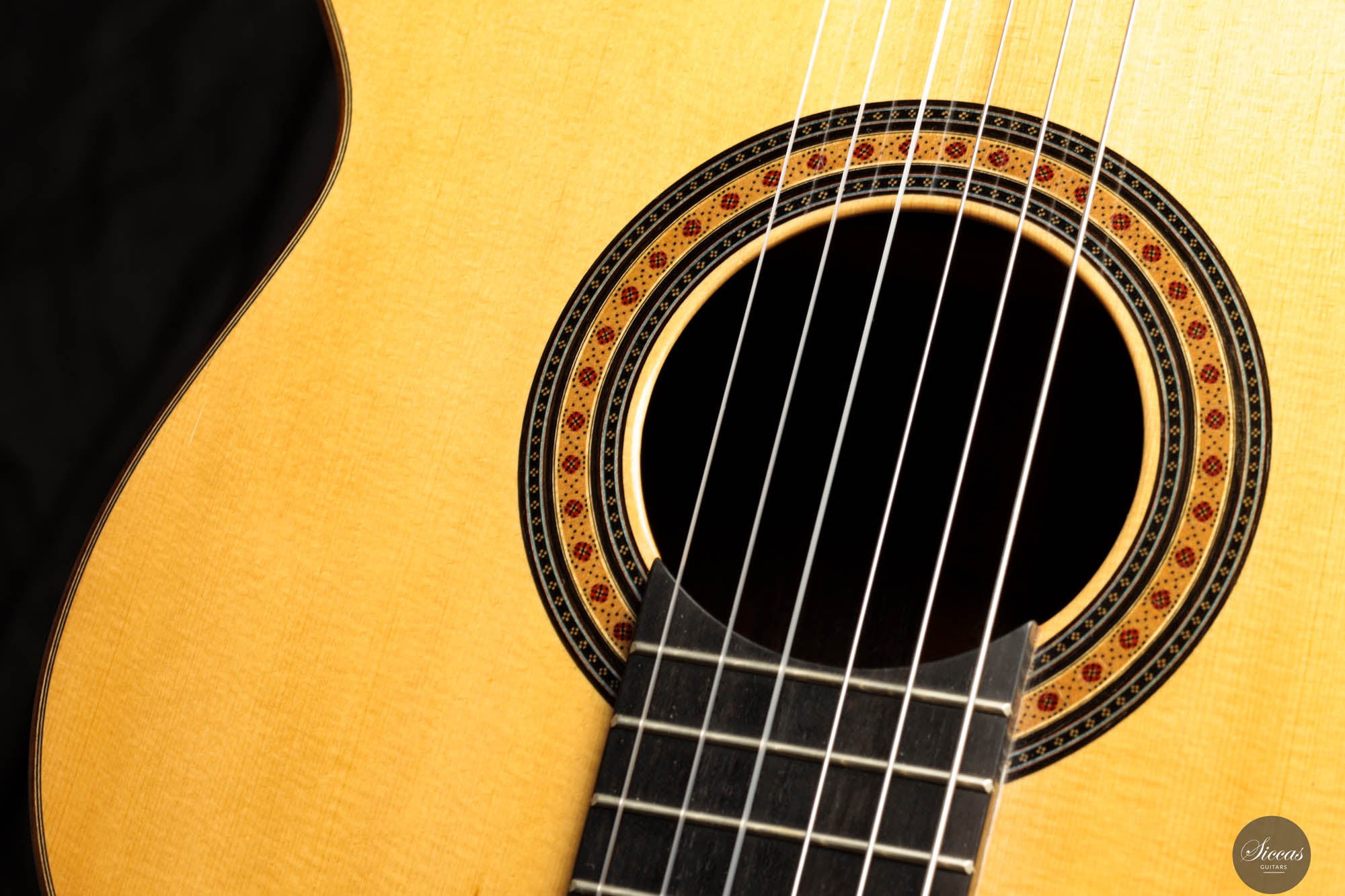 The spruce top has developed a rich, mature color over time, creating a striking contrast with the dark, Brazilian rosewood used for the back and sides. But this guitar is much more than a visual masterpiece or a collector’s item: it is a superb concert instrument with breathtaking sound characteristics. The tone is mature, perfectly balanced, and powerful, with an almost endless sustain. Deep, rounded basses blend seamlessly with the rich, overtone-filled trebles, offering a sound that is both open and full of character. Despite its long scale length, the guitar is very comfortable to play thanks to its well-shaped neck profile and responsive soundboard. The condition of this guitar is excellent, showing only normal wear and nail marks on the top and light scratches on the back.