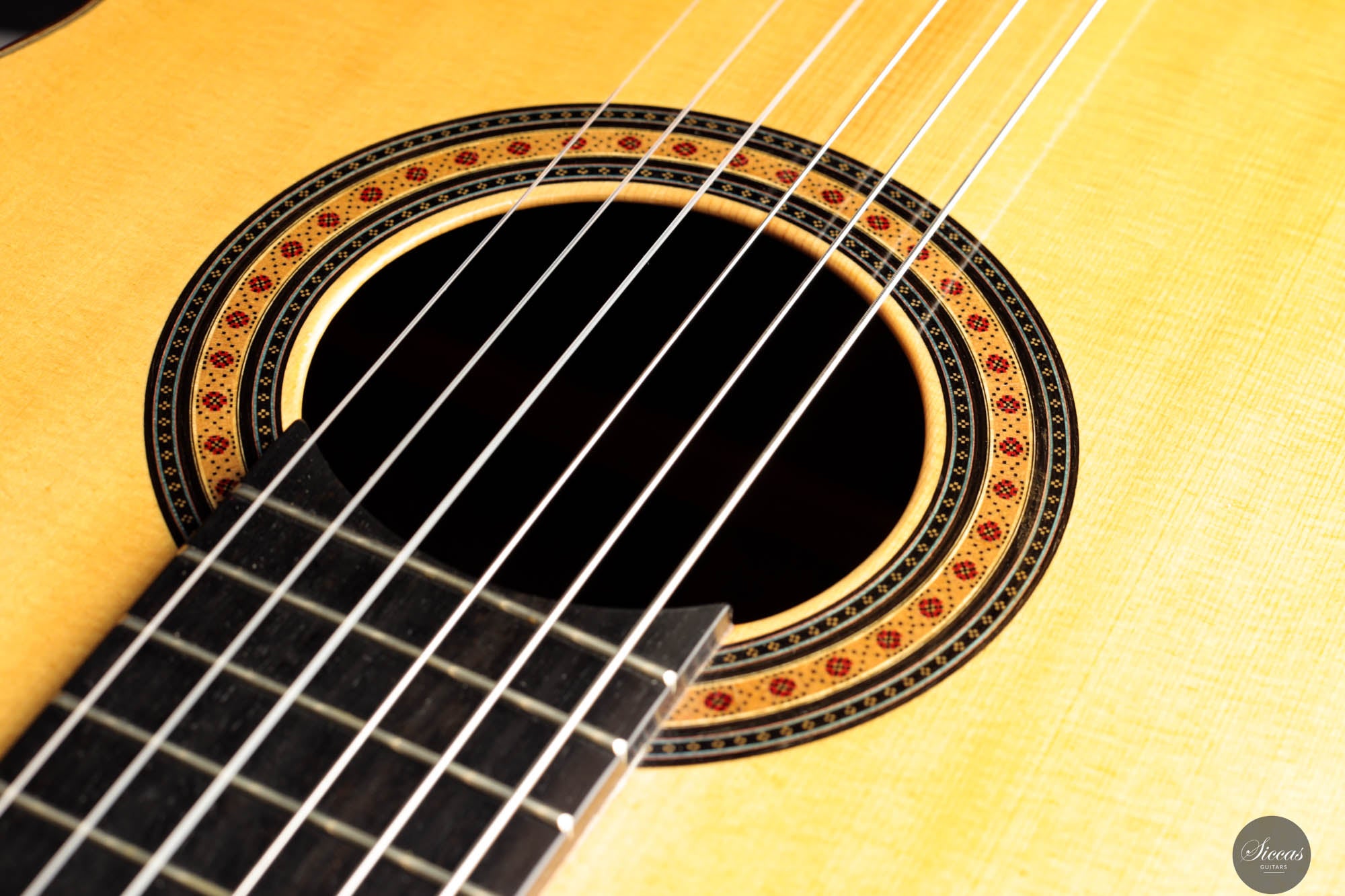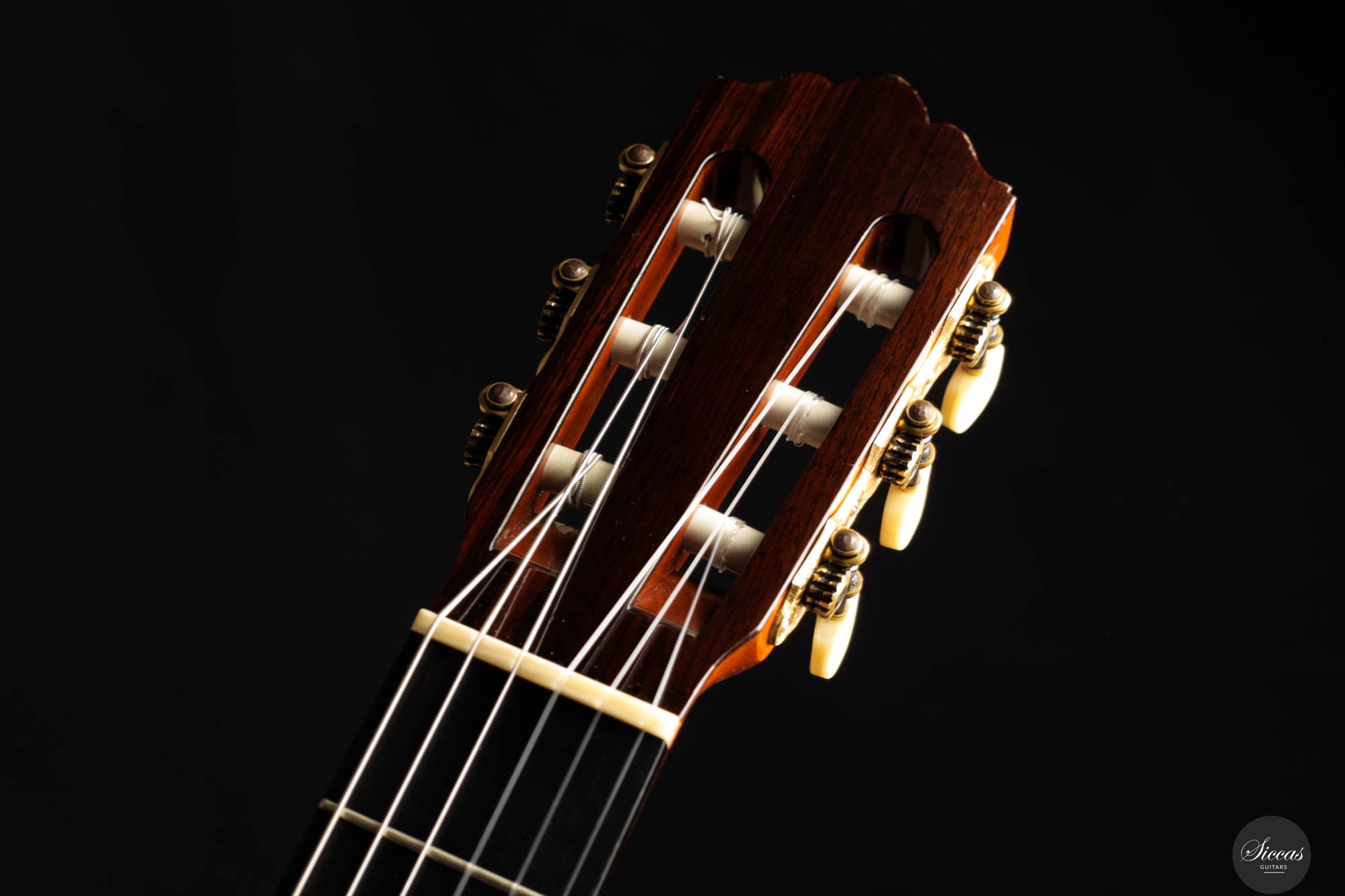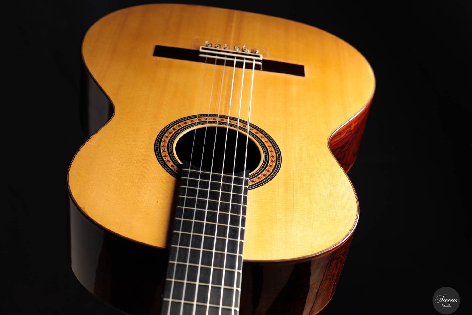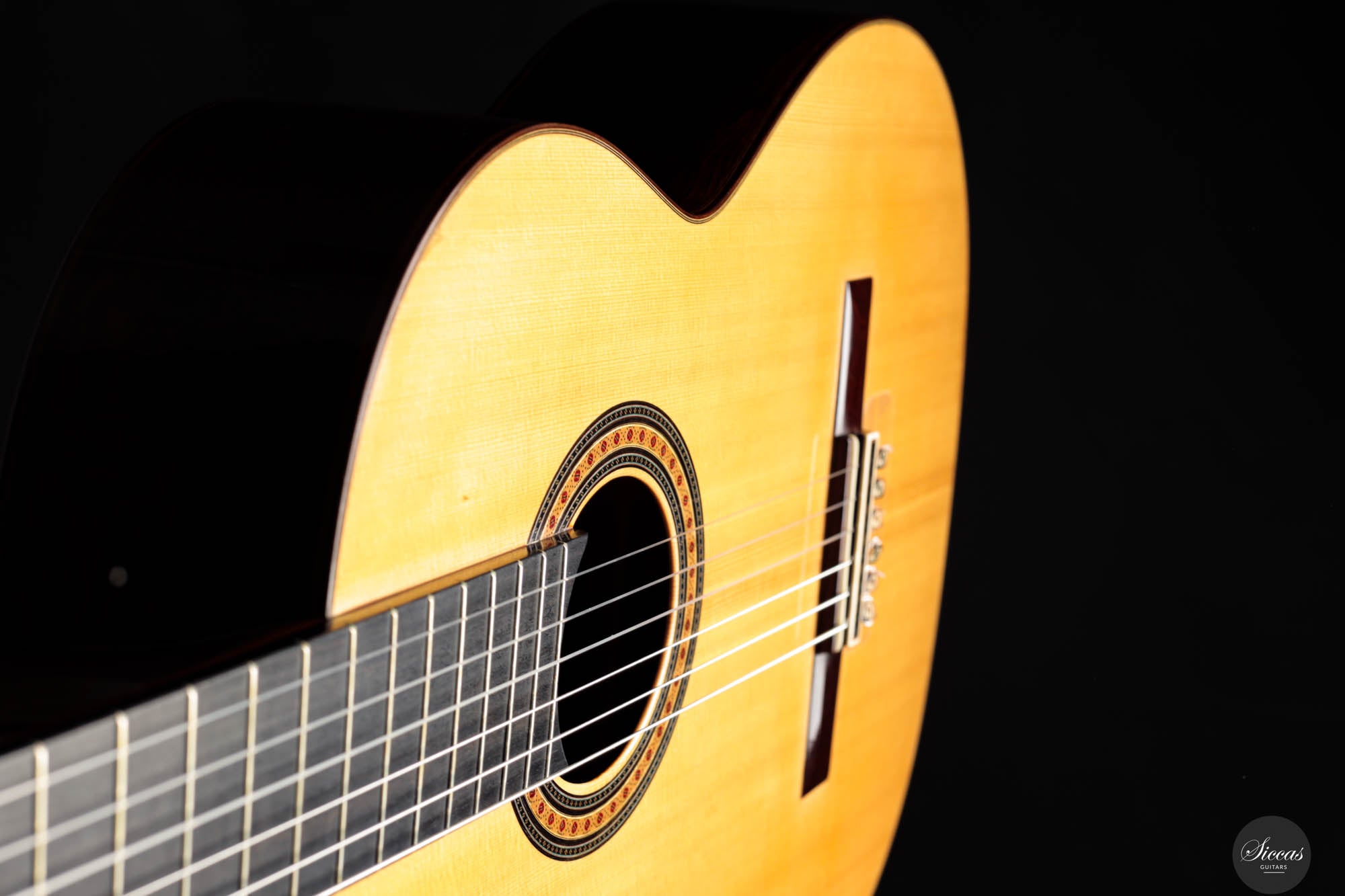 The spruce top has developed a rich, mature color over time, creating a striking contrast with the dark, Brazilian rosewood used for the back and sides. But this guitar is much more than a visual masterpiece or a collector’s item: it is a superb concert instrument with breathtaking sound characteristics. The tone is mature, perfectly balanced, and powerful, with an almost endless sustain. Deep, rounded basses blend seamlessly with the rich, overtone-filled trebles, offering a sound that is both open and full of character. Despite its long scale length, the guitar is very comfortable to play thanks to its well-shaped neck profile and responsive soundboard. The condition of this guitar is excellent, showing only normal wear and nail marks on the top and light scratches on the back.