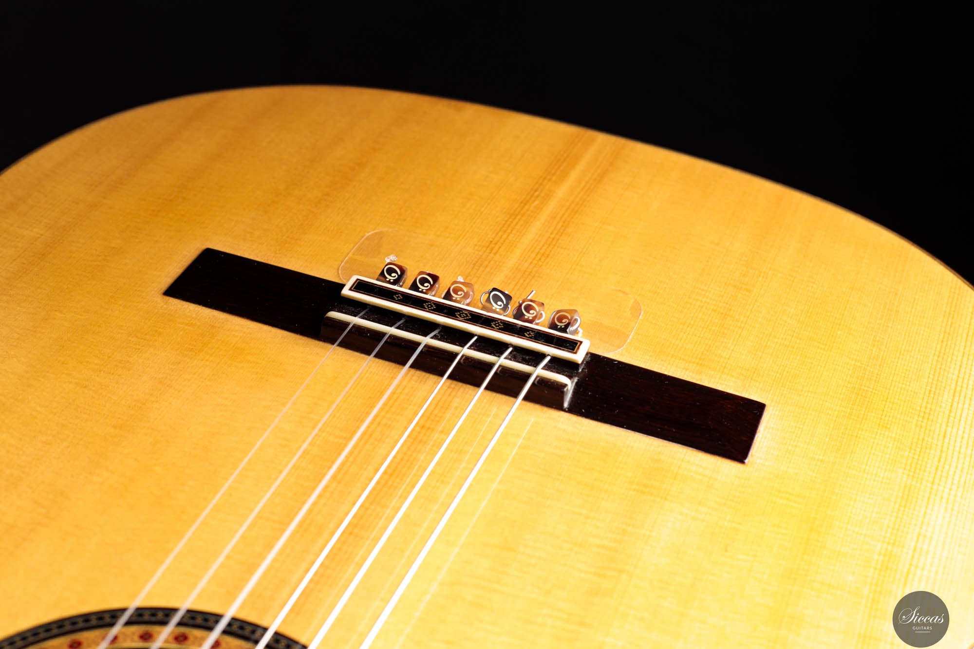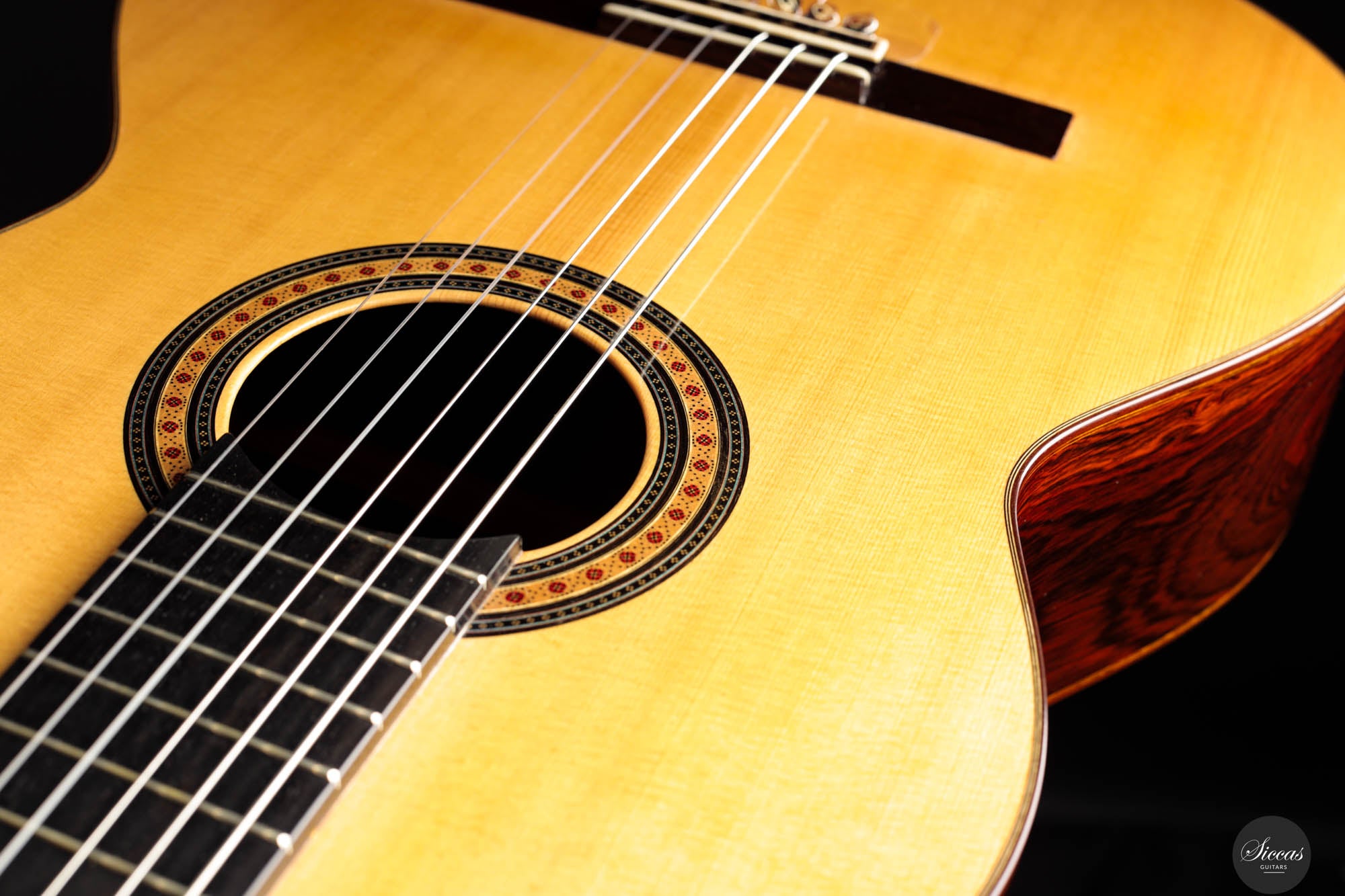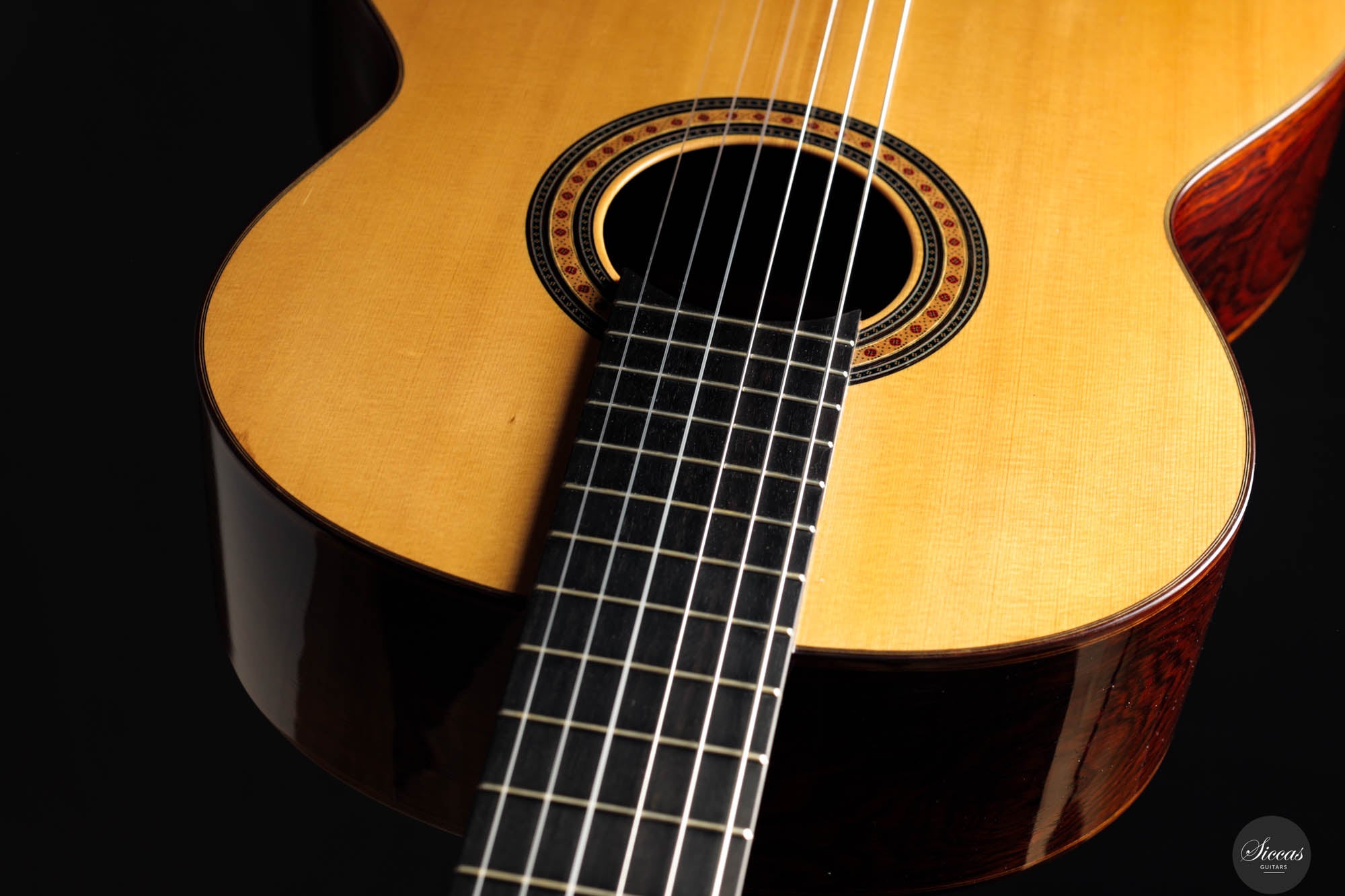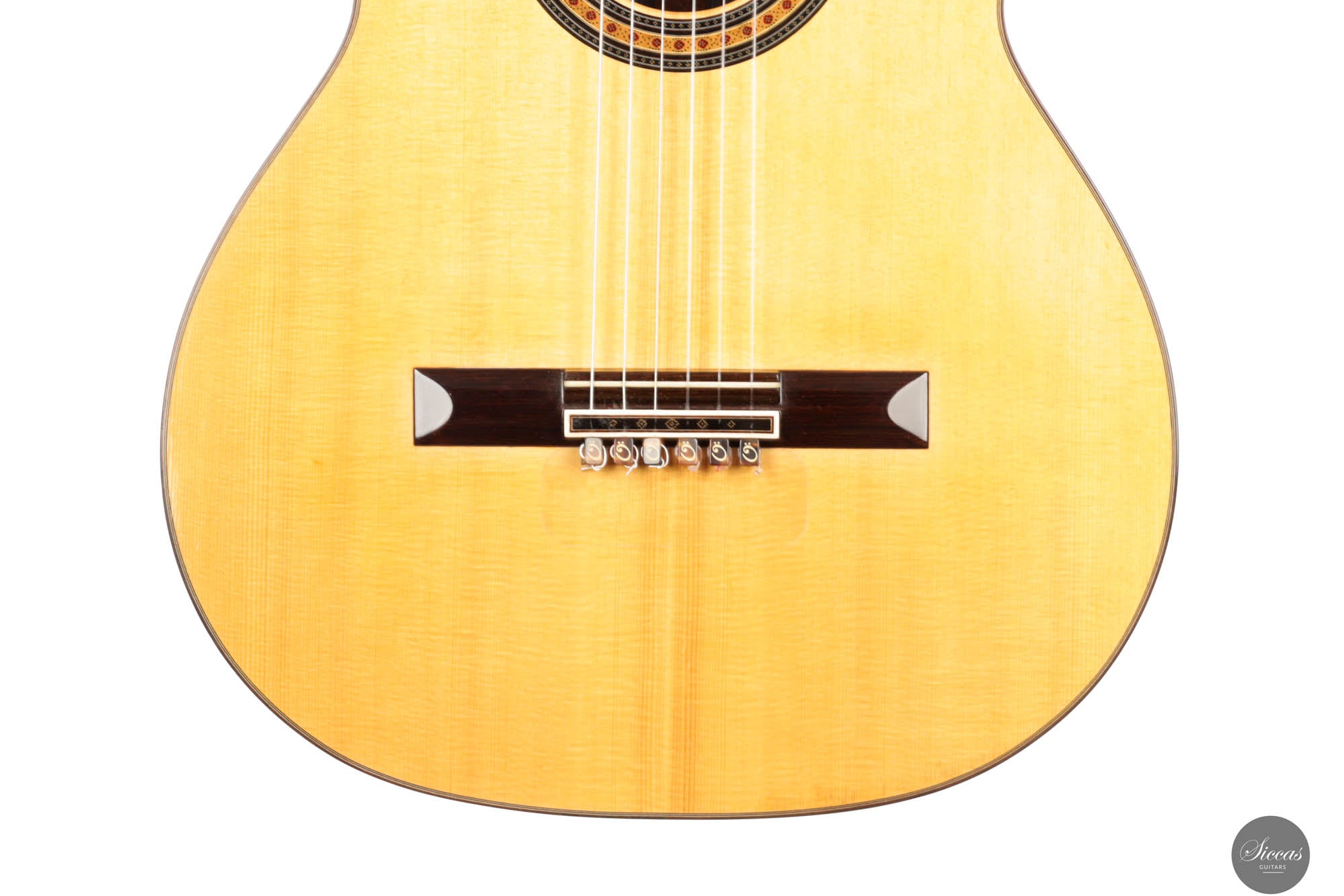 The spruce top has developed a rich, mature color over time, creating a striking contrast with the dark, Brazilian rosewood used for the back and sides. But this guitar is much more than a visual masterpiece or a collector’s item: it is a superb concert instrument with breathtaking sound characteristics. The tone is mature, perfectly balanced, and powerful, with an almost endless sustain. Deep, rounded basses blend seamlessly with the rich, overtone-filled trebles, offering a sound that is both open and full of character. Despite its long scale length, the guitar is very comfortable to play thanks to its well-shaped neck profile and responsive soundboard. The condition of this guitar is excellent, showing only normal wear and nail marks on the top and light scratches on the back.