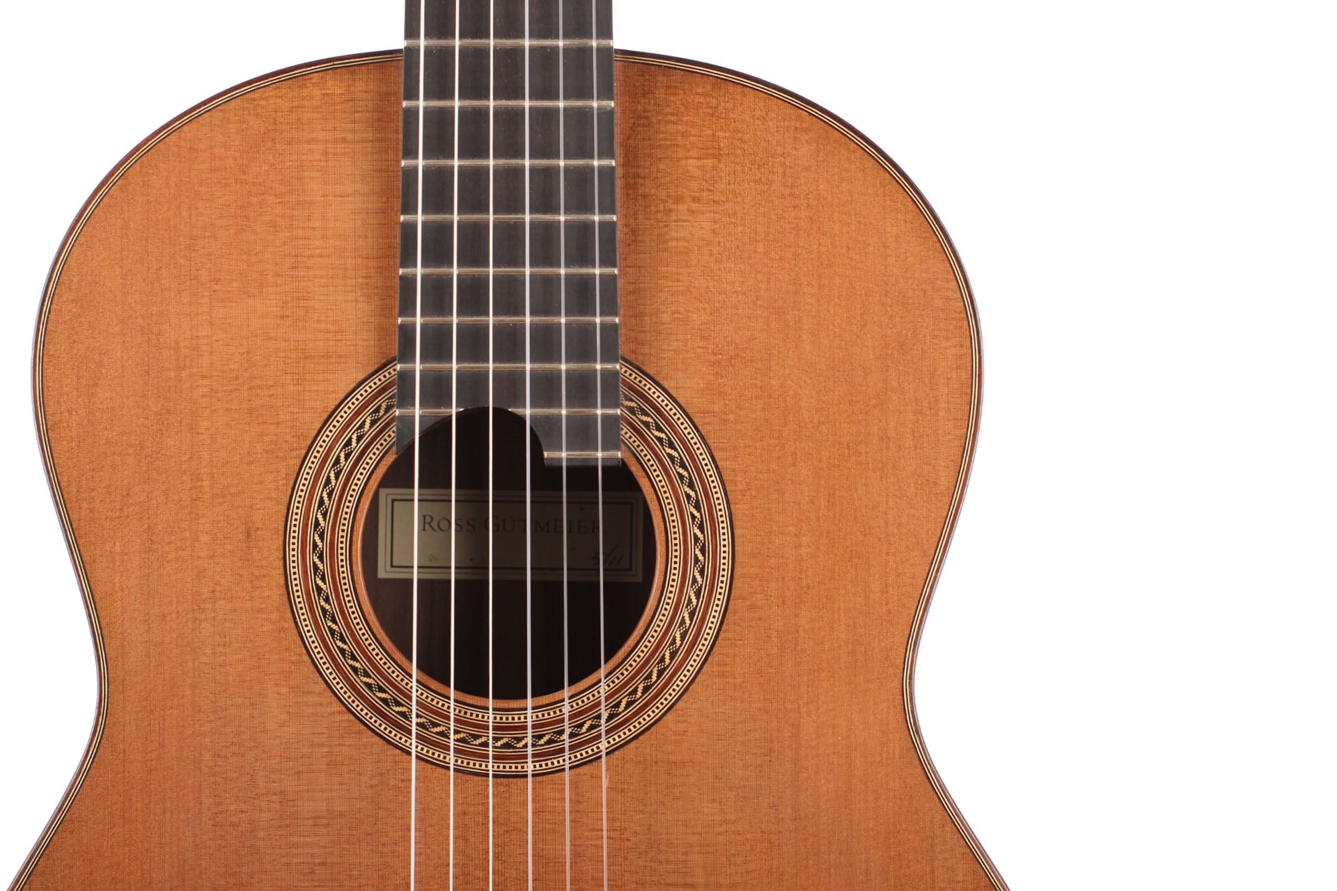 Ross Gütmeier lives in Baltimore and began in 1993 to build classical guitars after discovering a book about lutherie while he was learning to play classical guitar. Around 2005 he get known internationally for his double-top guitars but he builds also traditional guitars in the style of Santos Hernandez. This guitar was built in 2011 and has a cedar double-top. It has a very strong sound and projection. The fretboard is modestly elevated to improve the playability of higher notes. Playbility is a dream! The condition is very good. The tuning machines are made by Rubner. A hardshell case is included.