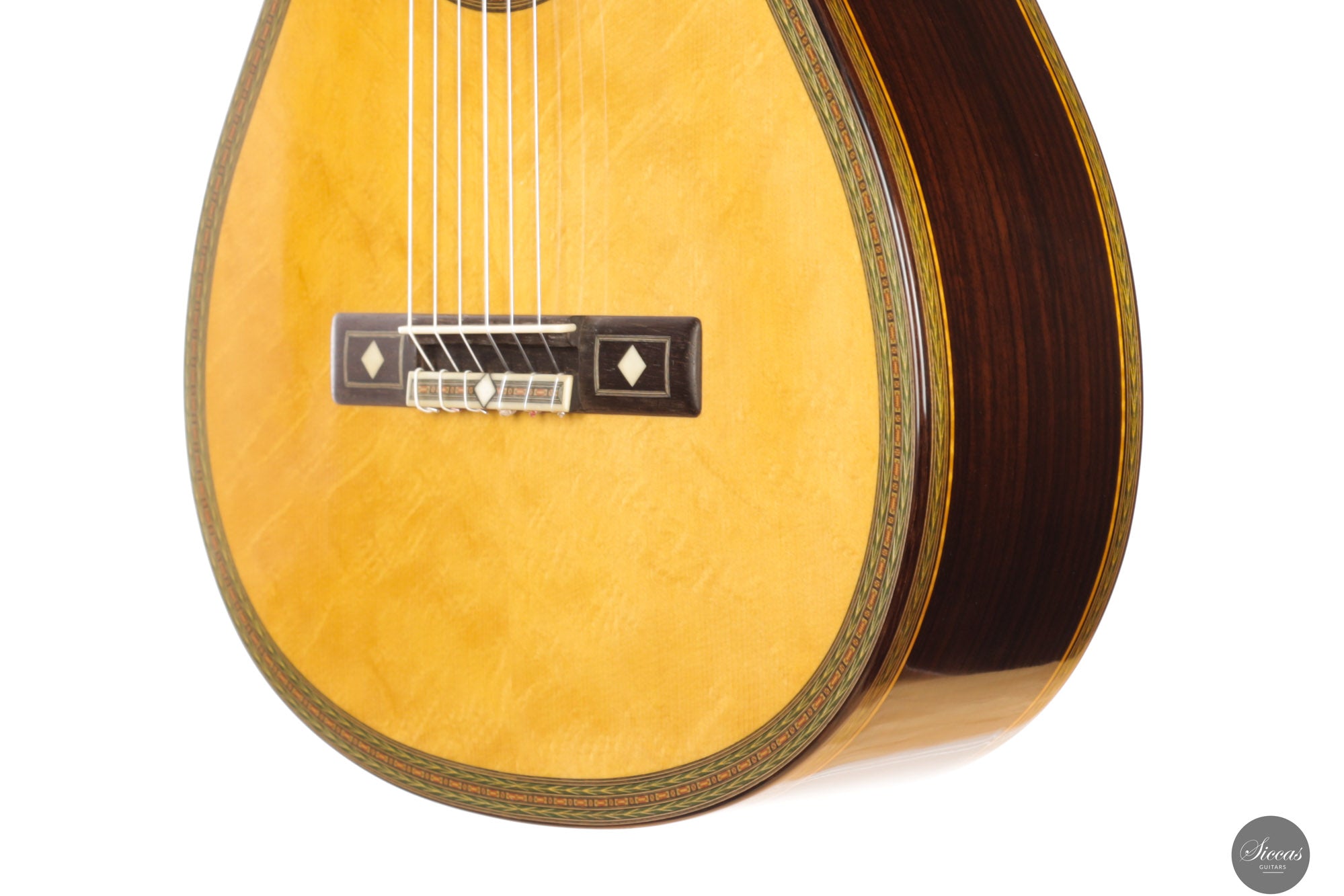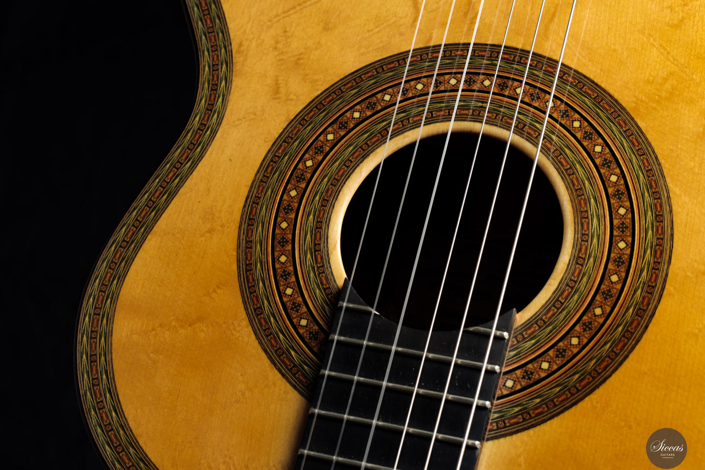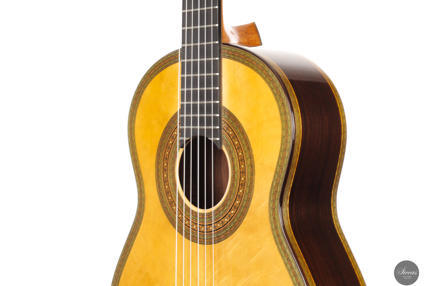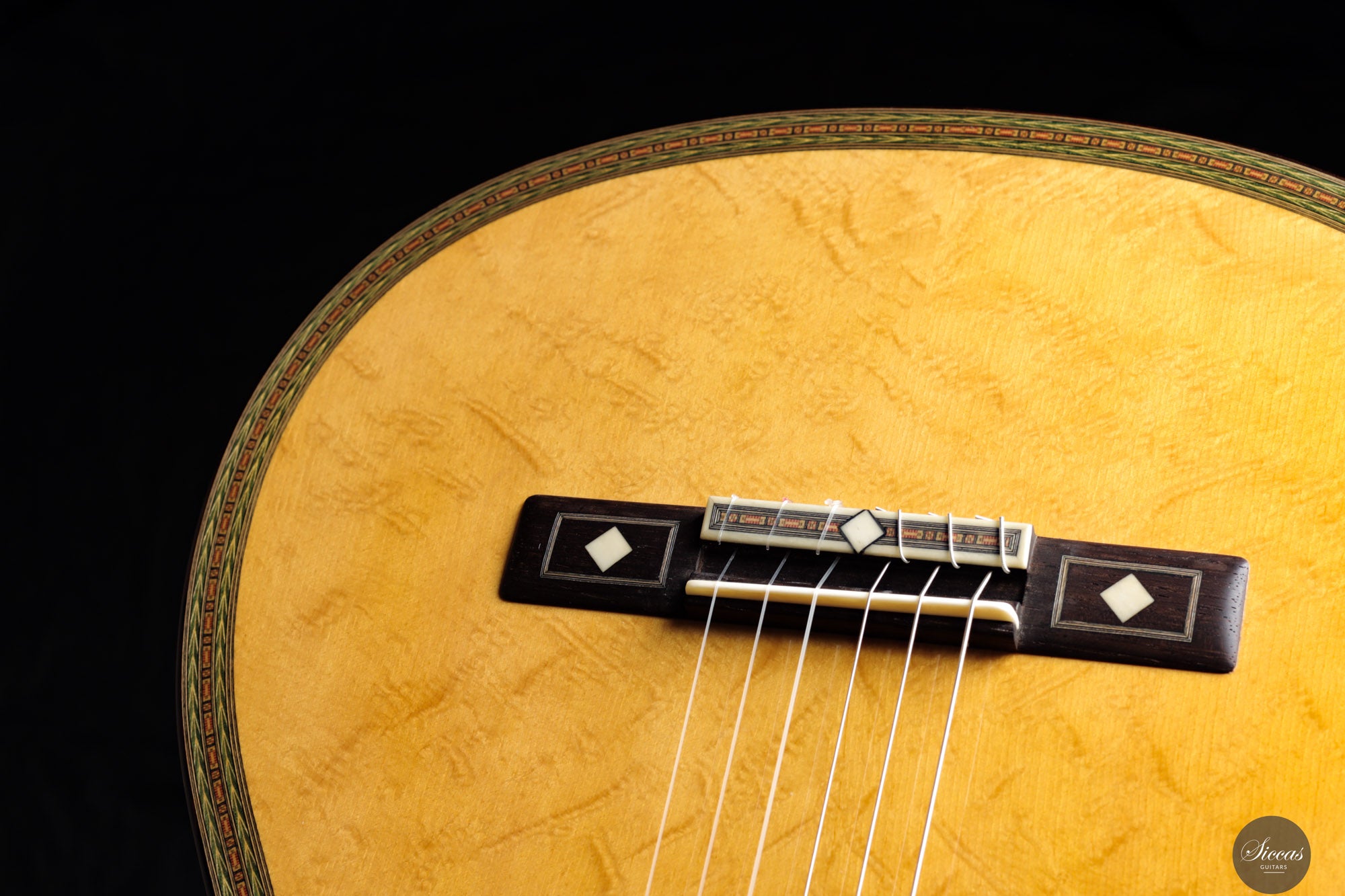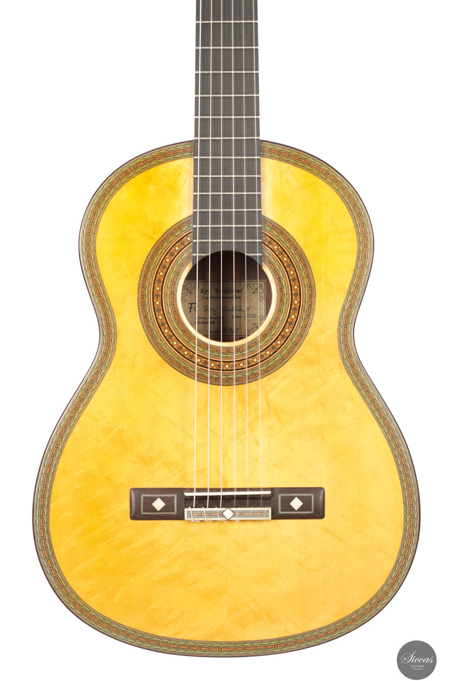 This 2010 guitar is Roy Fankhänel’s Meisterstück and reflects the culmination of his experience, skill, and artistic vision. Inspired by the work of Antonio de Torres, the instrument features intricate ornamentation on the rosette and purflings, decorative inlays on the bridge, and a finely carved headstock. A detailed V-joint at the neck-to-headstock connection further highlights Fankhänel’s commitment to time-honored construction methods.