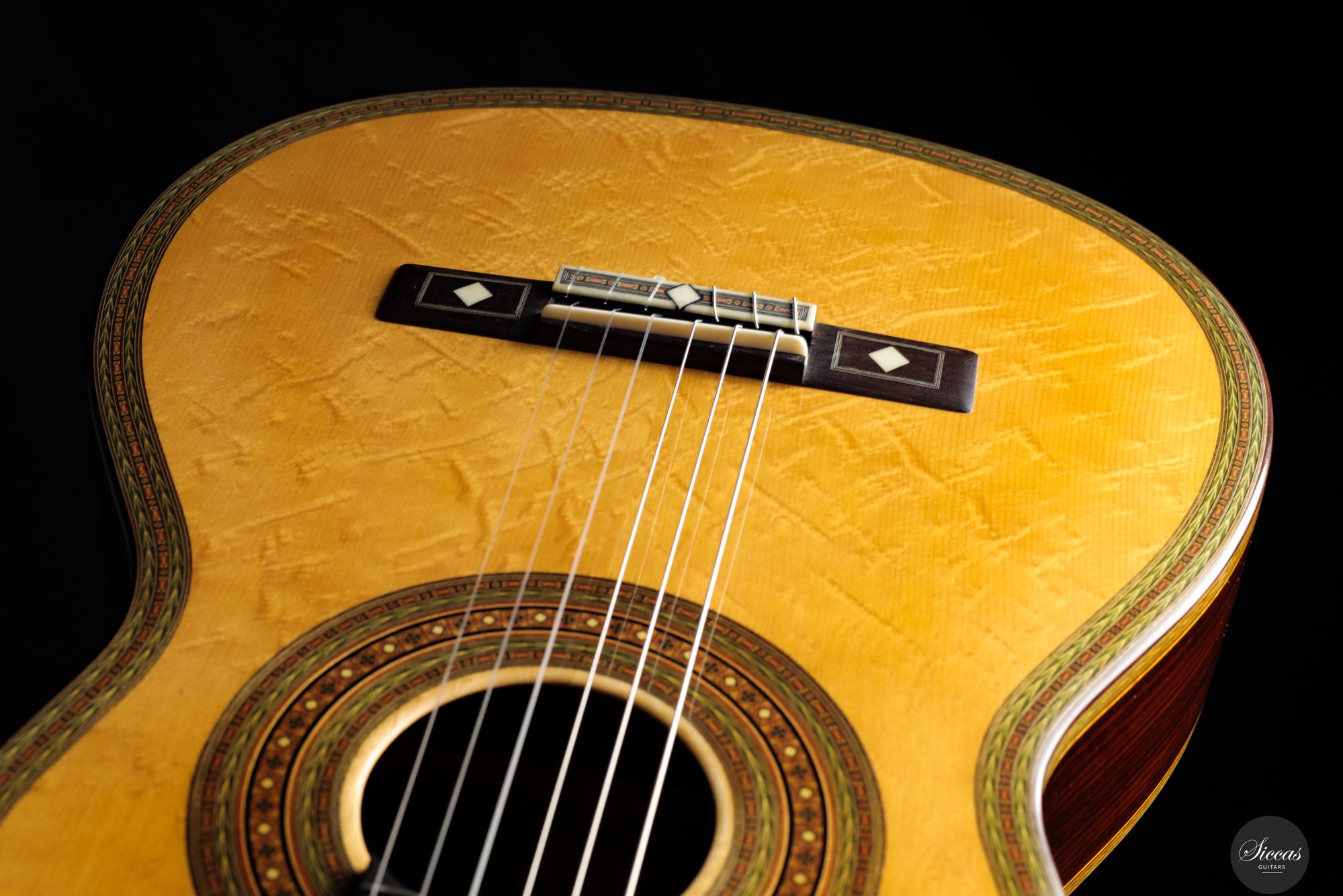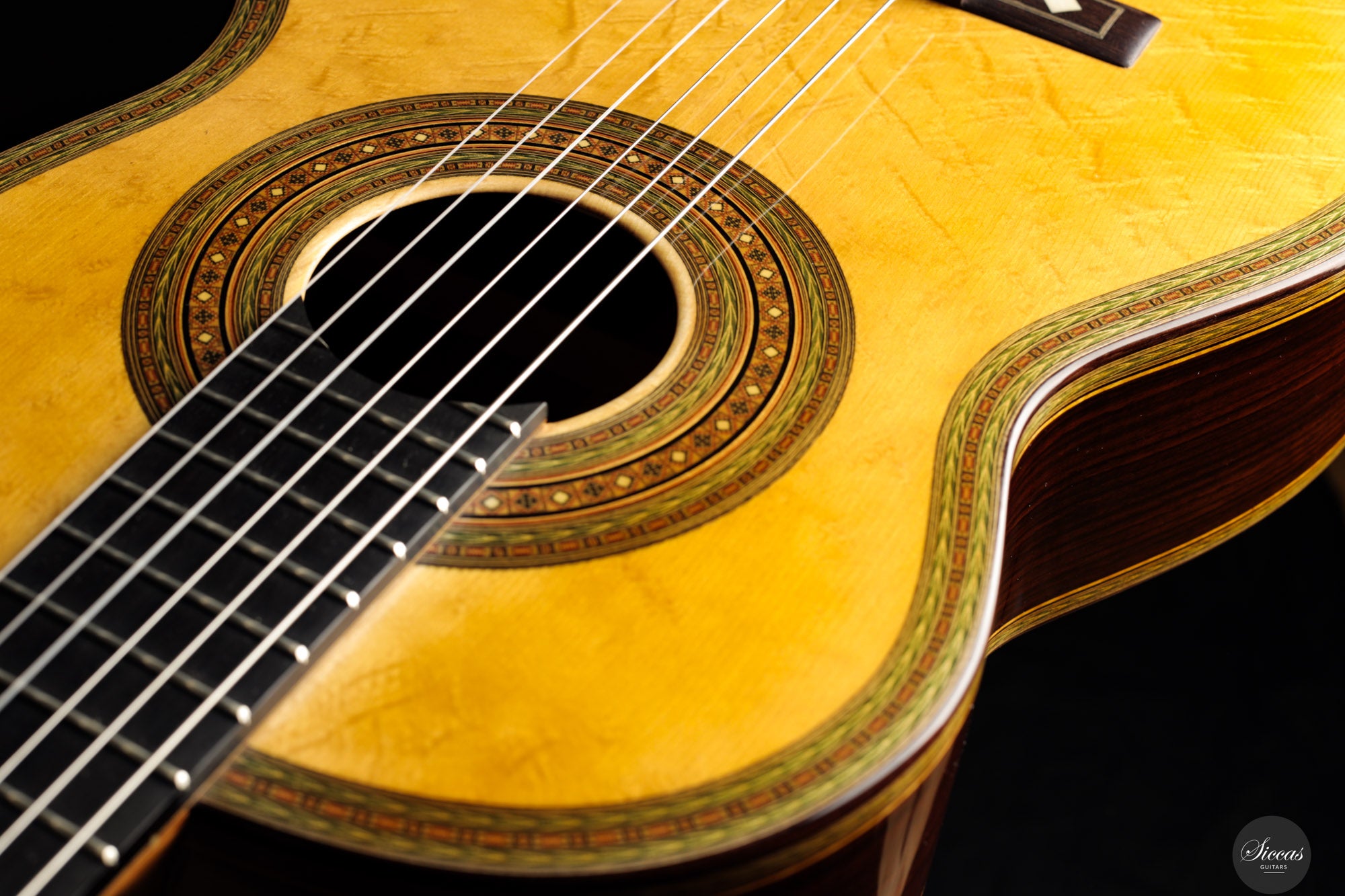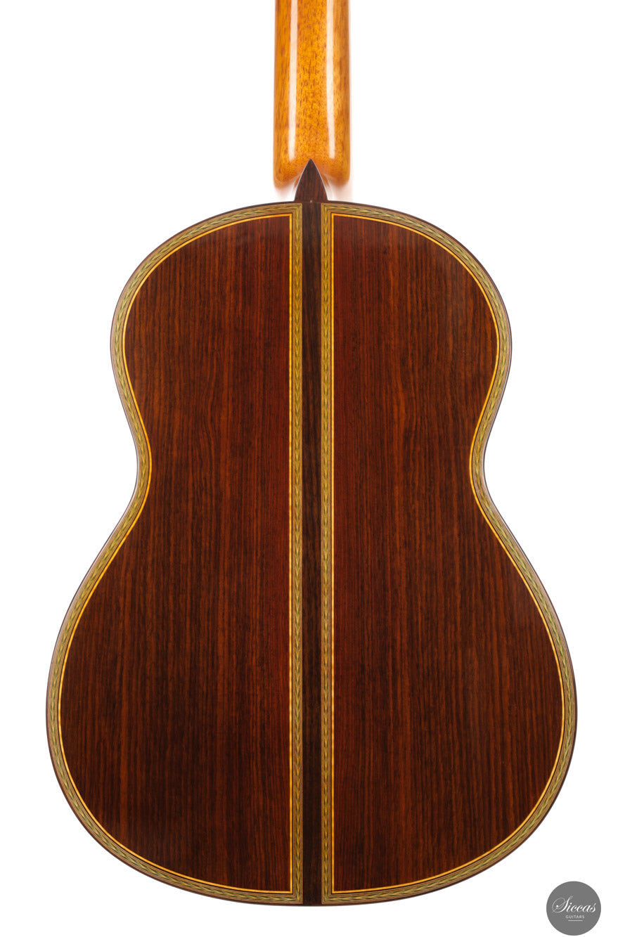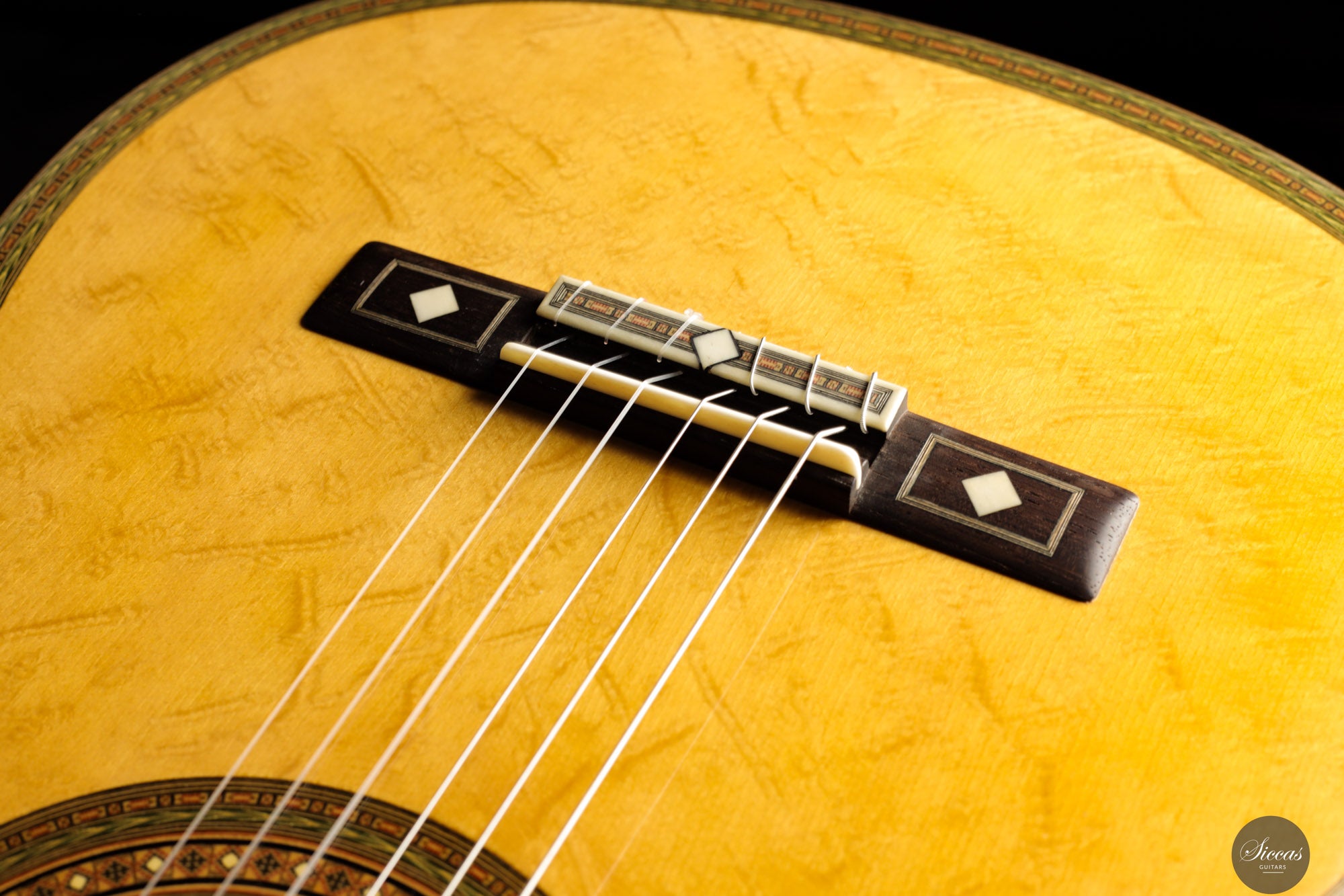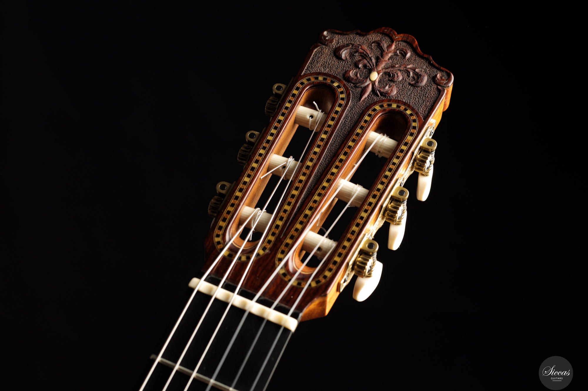 This 2010 guitar is Roy Fankhänel’s Meisterstück and reflects the culmination of his experience, skill, and artistic vision. Inspired by the work of Antonio de Torres, the instrument features intricate ornamentation on the rosette and purflings, decorative inlays on the bridge, and a finely carved headstock. A detailed V-joint at the neck-to-headstock connection further highlights Fankhänel’s commitment to time-honored construction methods.
