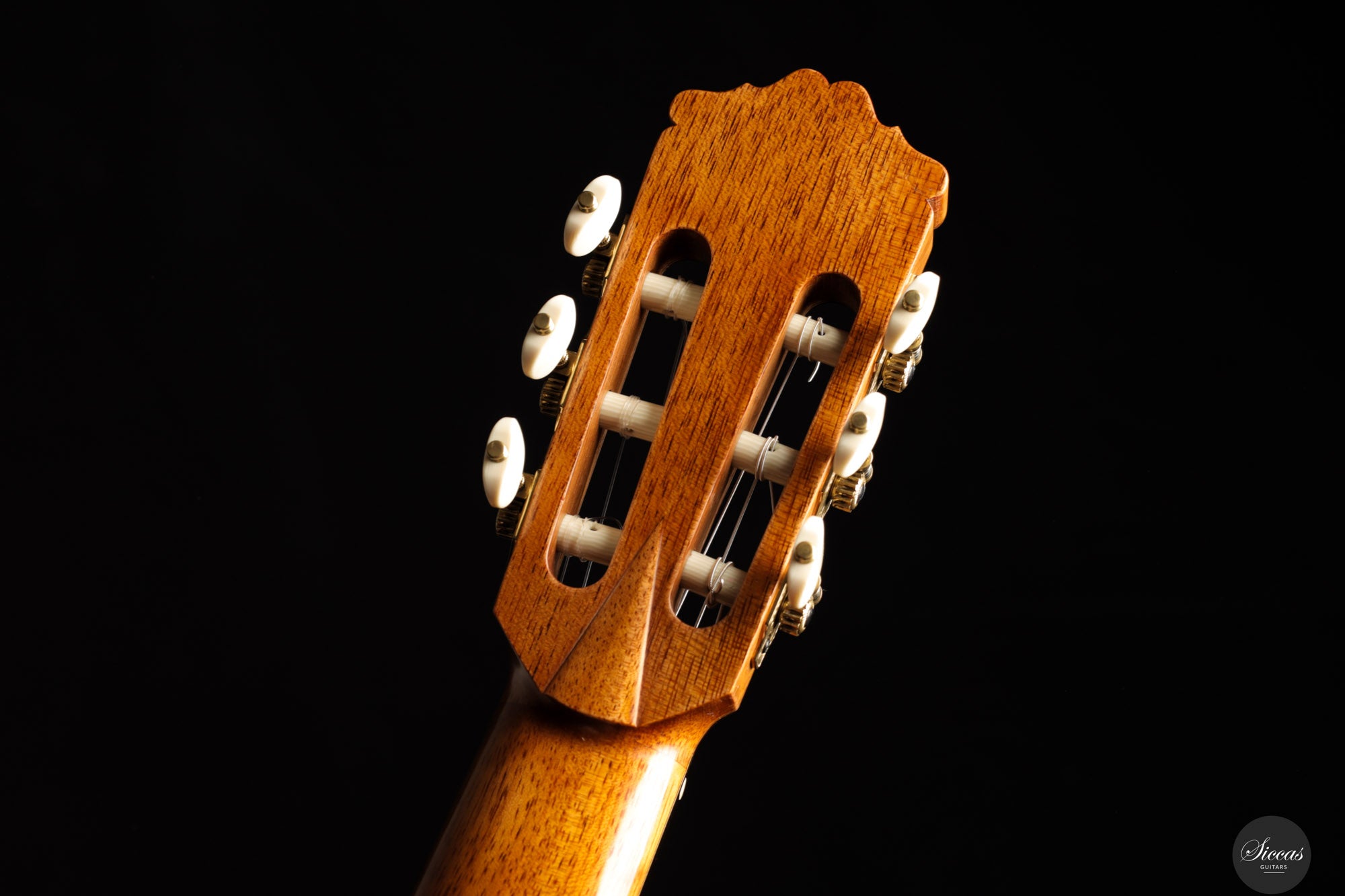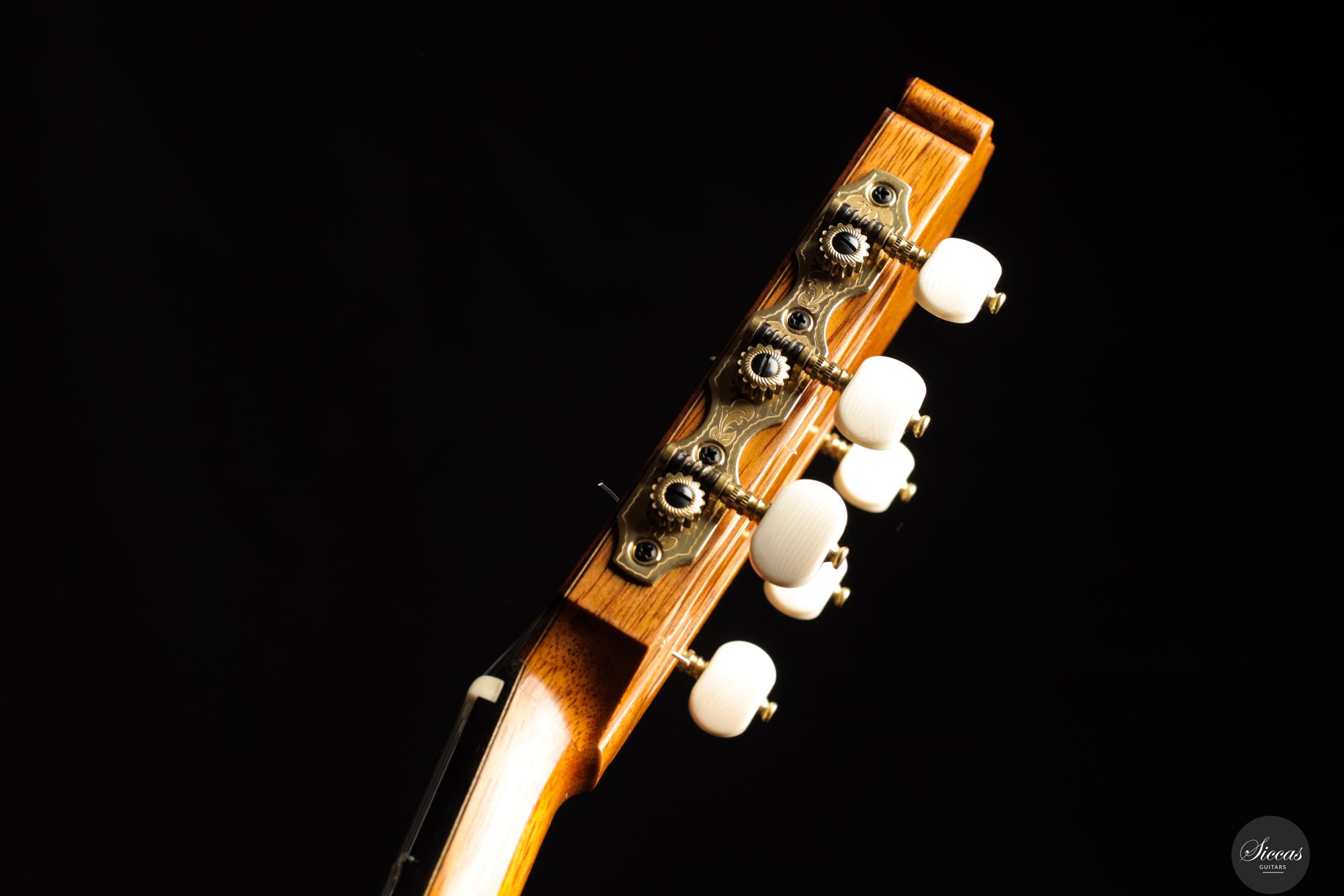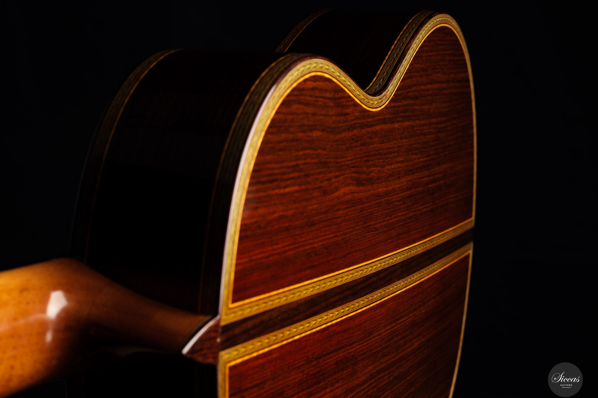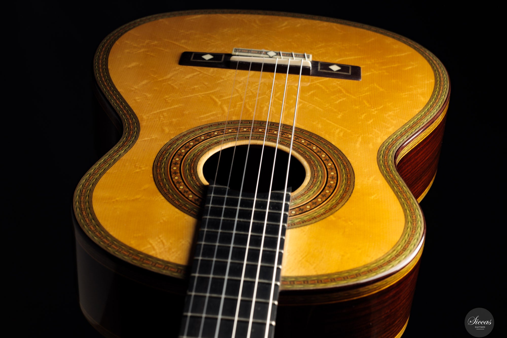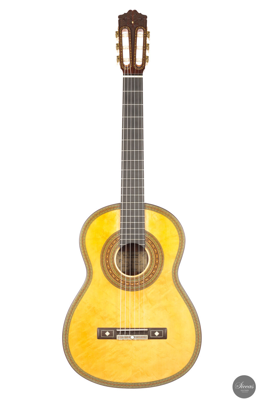 This 2010 guitar is Roy Fankhänel’s Meisterstück and reflects the culmination of his experience, skill, and artistic vision. Inspired by the work of Antonio de Torres, the instrument features intricate ornamentation on the rosette and purflings, decorative inlays on the bridge, and a finely carved headstock. A detailed V-joint at the neck-to-headstock connection further highlights Fankhänel’s commitment to time-honored construction methods.