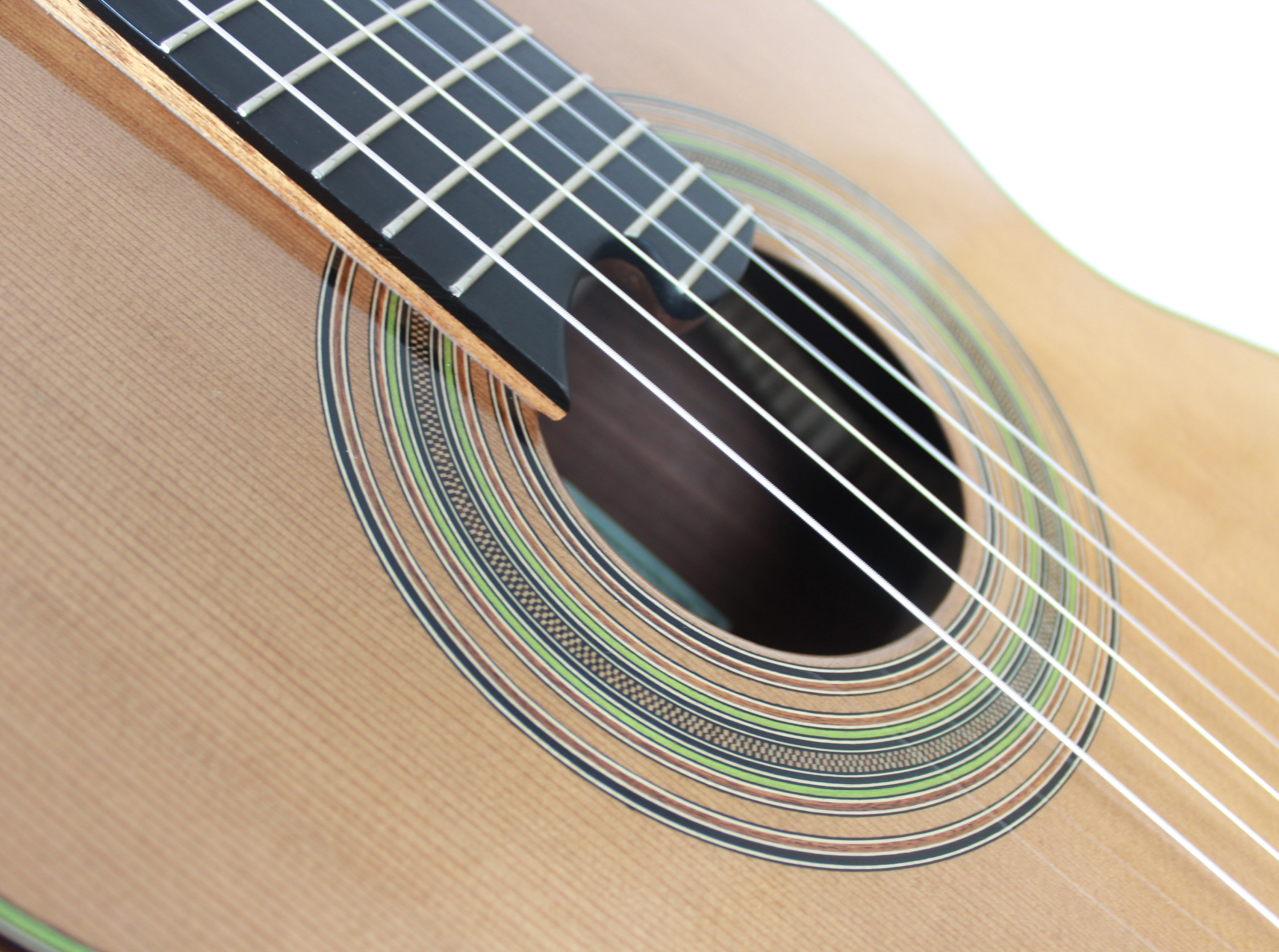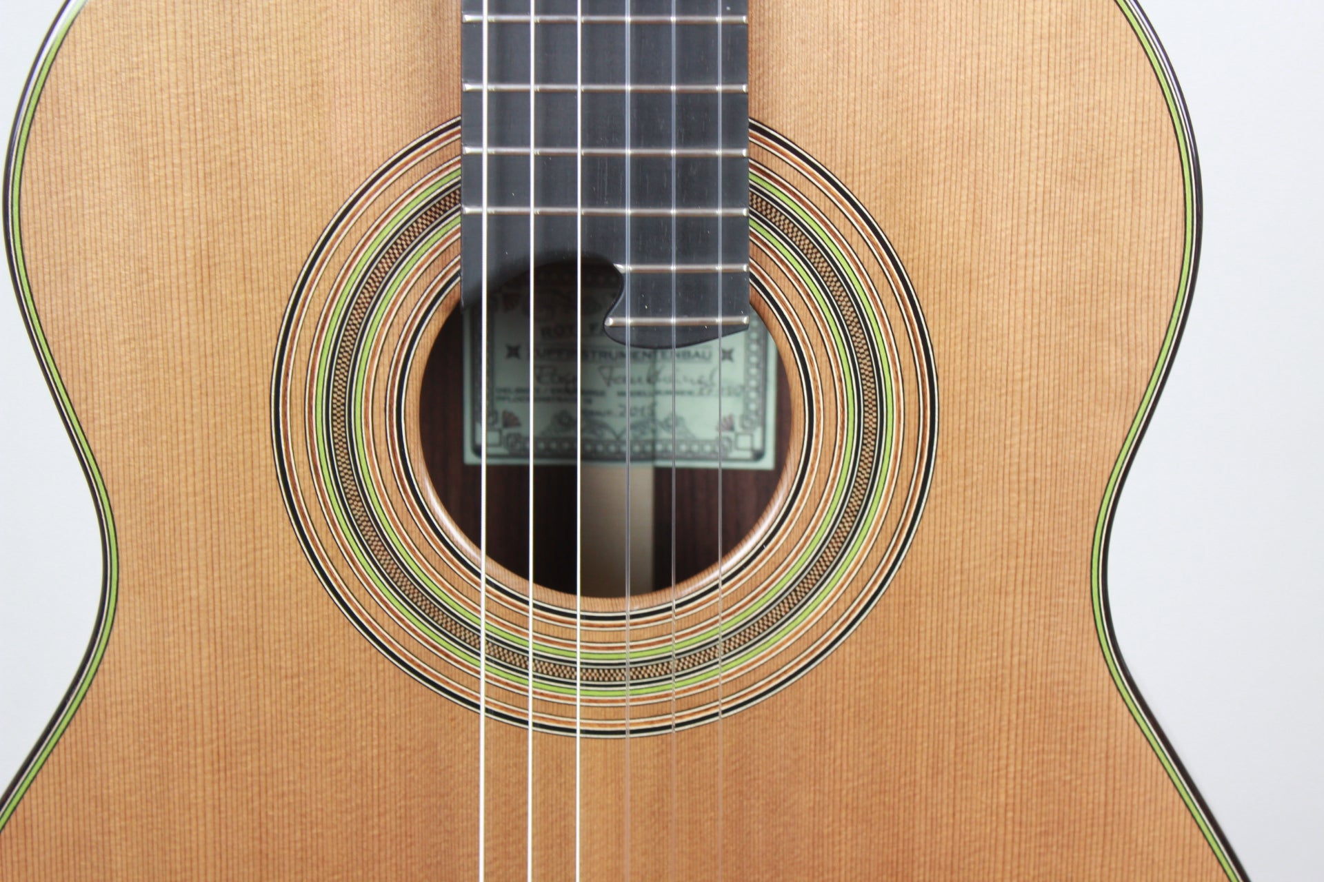 This beautiful guitar was developed in cooperation with „Siccas Guitars“. This guitar-type is a special edition which is only and exclusively available at “Siccas Guitars”. It has a variety of special features which can be found in this manner only on this guitar. The decorative elements like rosette and ornaments around the edge were specifically designed, and give the instrument a more traditional look. The bridge with its 12-hole-drilling fits perfectly into the overall picture of the guitar. Eye-catching are also the purflings made of ovangkol, which stress the precious character of the guitar. The raised fingerboard facilitates playing in the high registers and improves the sound in this area noticeable. Back and sides are made of Indian rosewood and the top is made of cedar. The machine heads are by Alessi.