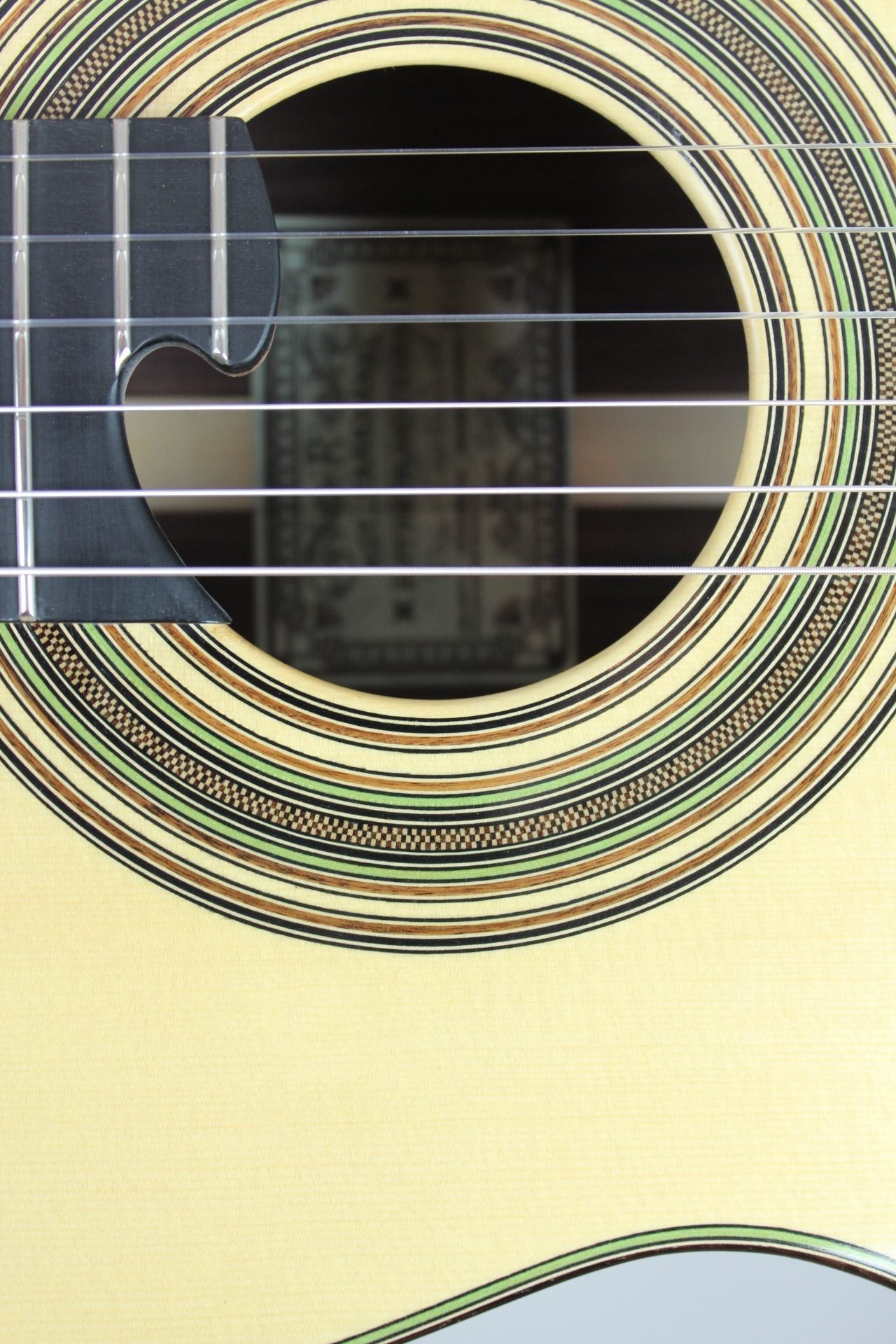 This beautiful guitar was developed in cooperation with „Siccas Guitars“. This guitar-type is a special edition which is only and exclusively available at “Siccas Guitars”. It has a variety of special features which can be found in this manner only on this guitar. The decorative elements like rosette and ornaments around the edge were specifically designed, and give the instrument a more traditional look. The bridge with its 12-hole-drilling fits perfectly into the overall picture of the guitar. Eye-catching are also the purflings made of ovangkol, which stress the precious character of the guitar. The raised fingerboard facilitates playing in the high registers and improves the sound in this area noticeable. Back and sides are made of Indian rosewood and the top is made of spruce. The tuning machines are by Alessi.