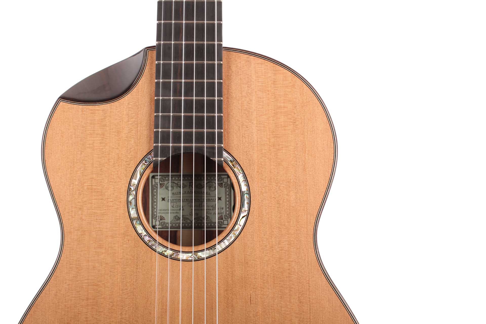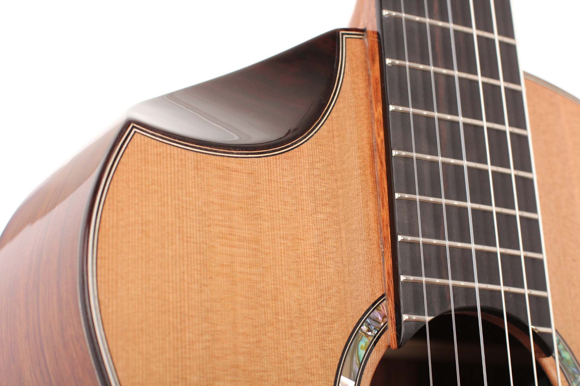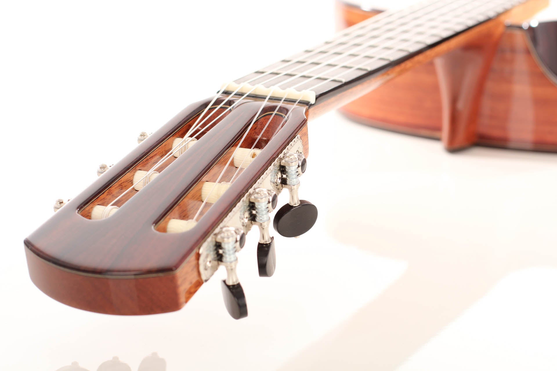 This lefthand guitar is based on the Special Edition model by Roy Fankhänel. The guitar has a cutaway and an elevated fretboard that makes it very easy to play the higher notes. The easy playability of Roy’s guitars makes them perfect instruments for professional virtuosos but also hobby musicians. His guitars are built in a traditional Spanish way but they have very powerful and modern sound. The bridge has twelve symmetric holes to fix the strings and a bone saddle that is formed for better compensation.