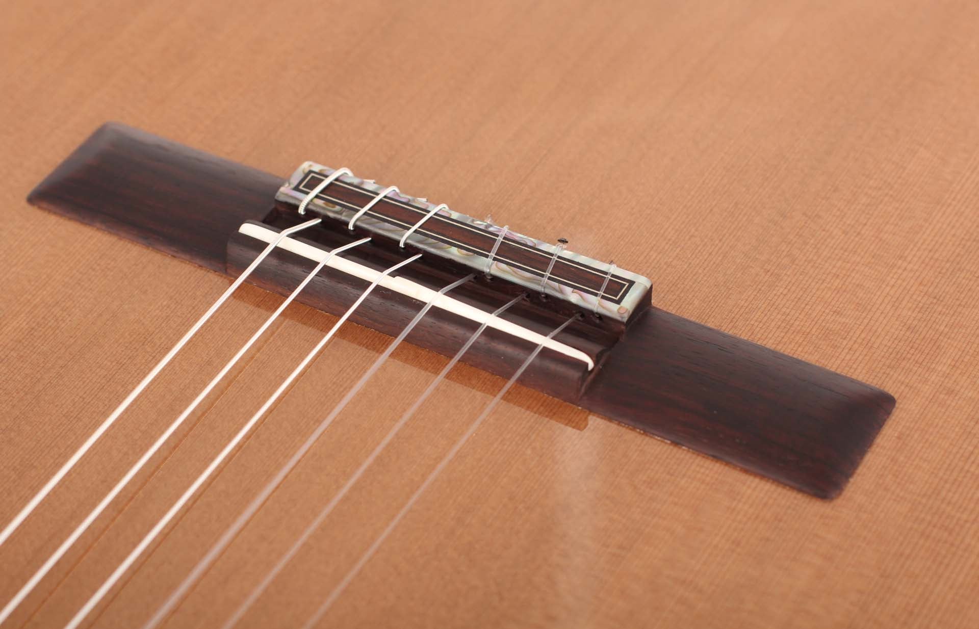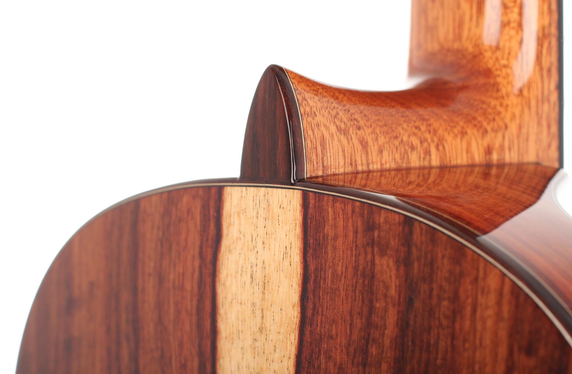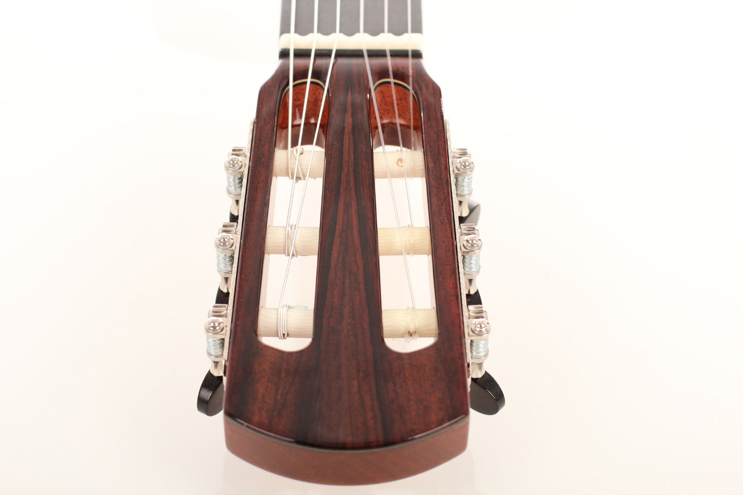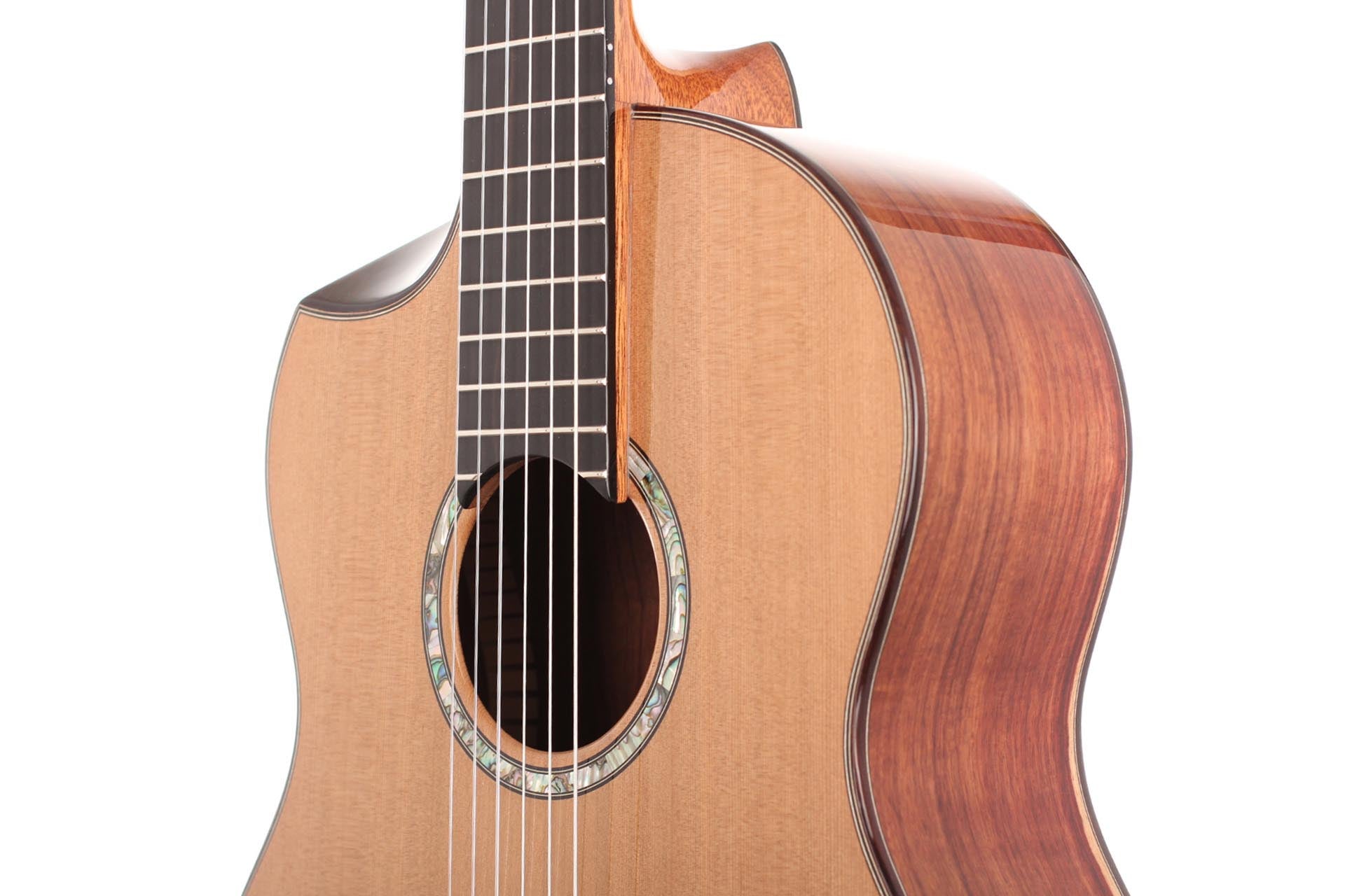 This lefthand guitar is based on the Special Edition model by Roy Fankhänel. The guitar has a cutaway and an elevated fretboard that makes it very easy to play the higher notes. The easy playability of Roy’s guitars makes them perfect instruments for professional virtuosos but also hobby musicians. His guitars are built in a traditional Spanish way but they have very powerful and modern sound. The bridge has twelve symmetric holes to fix the strings and a bone saddle that is formed for better compensation.