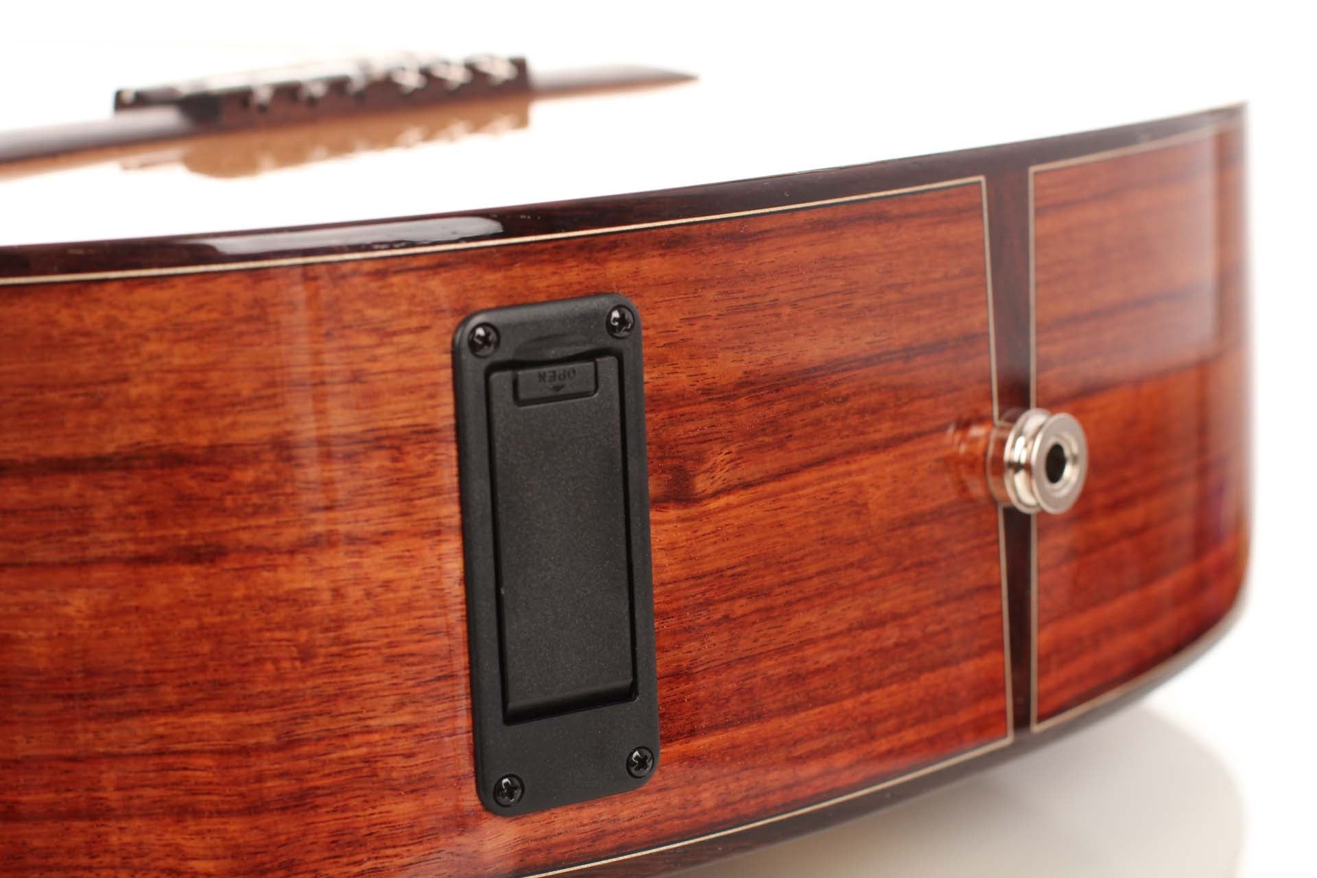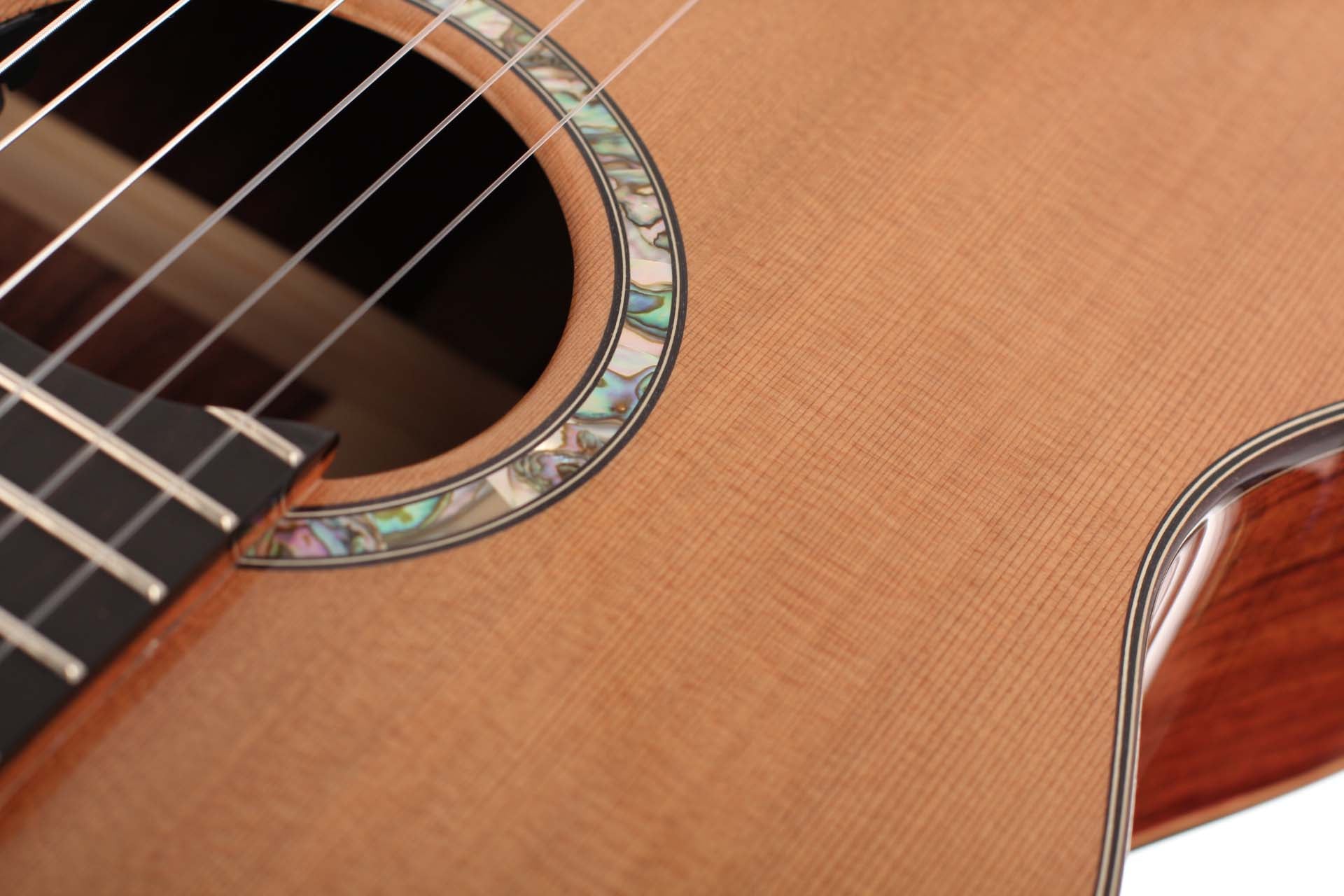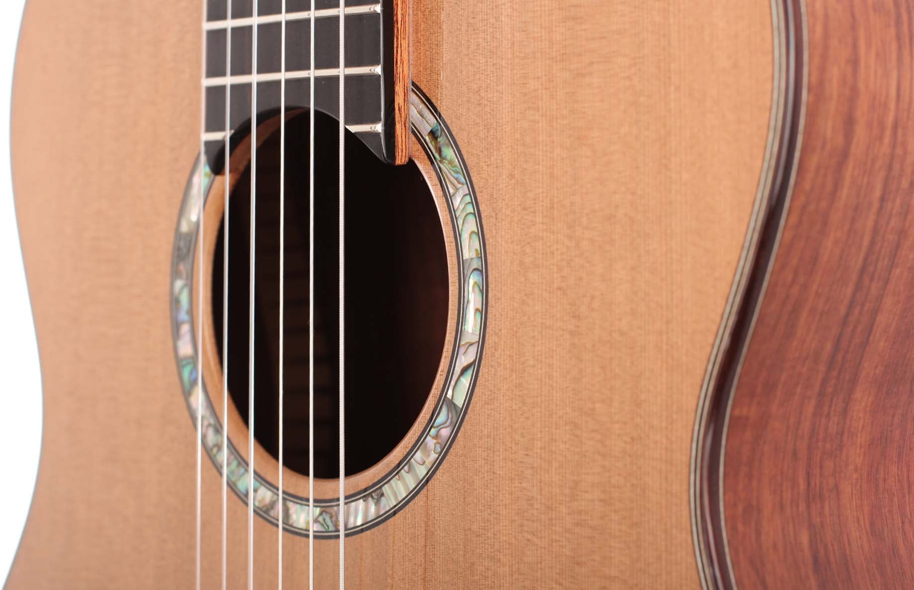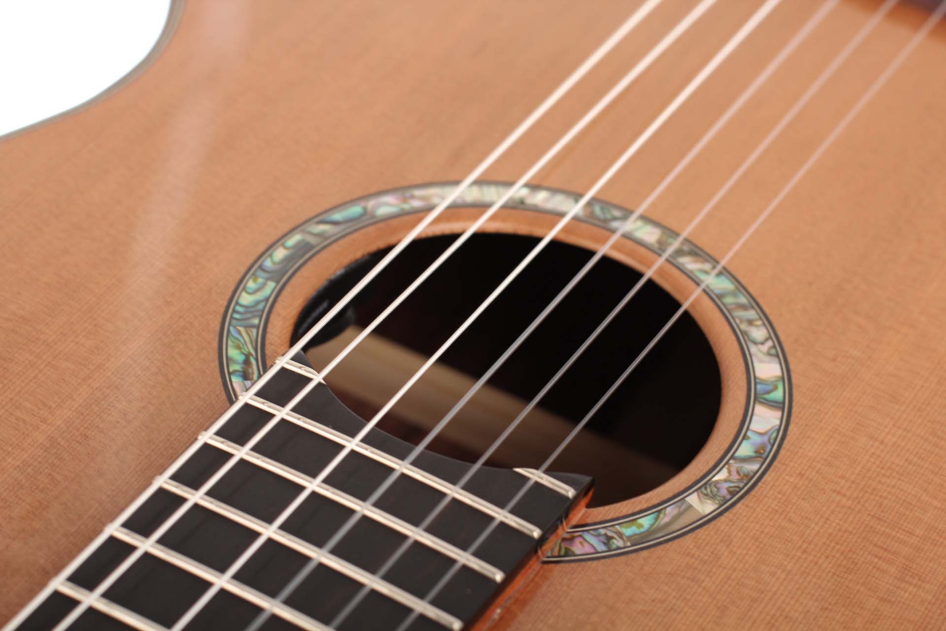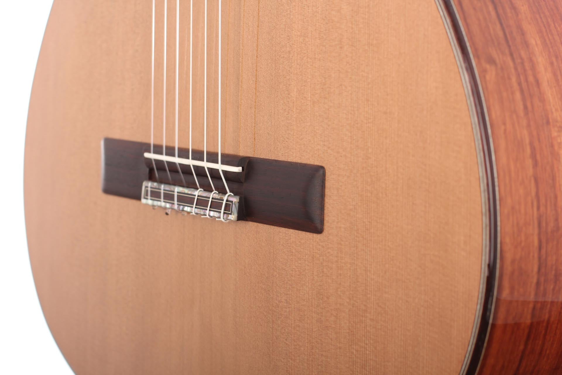 In addition this guitar has a variety of special features which can be found in this manner only on this guitar. The decorative elements like the mother of pearl rosette and ornaments of the binding were specifically designed, and give the instrument a beautiful modern look. The bridge with its 12-hole-drilling fits perfectly into the overall picture of the guitar. Eye-catching are also the purflings made of Indian rosewood, maple and pear wood which stress the precious character of the guitar. Back and sides are made of Caribbean rosewood and the top is made of cedar. The tuning machines are made by Rubner. A hardshellcase by Hiscox is included.