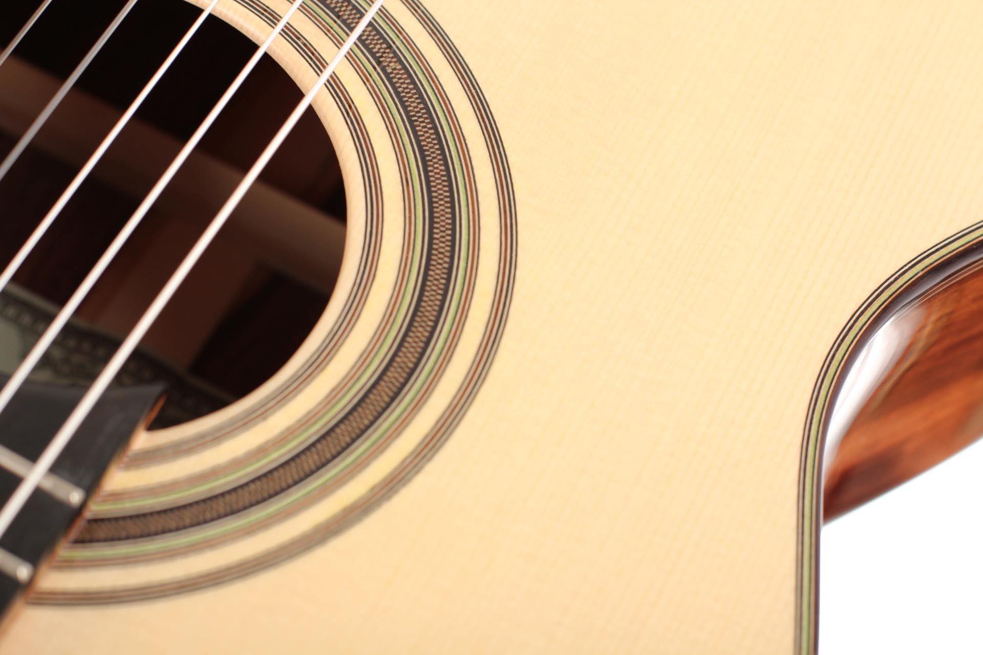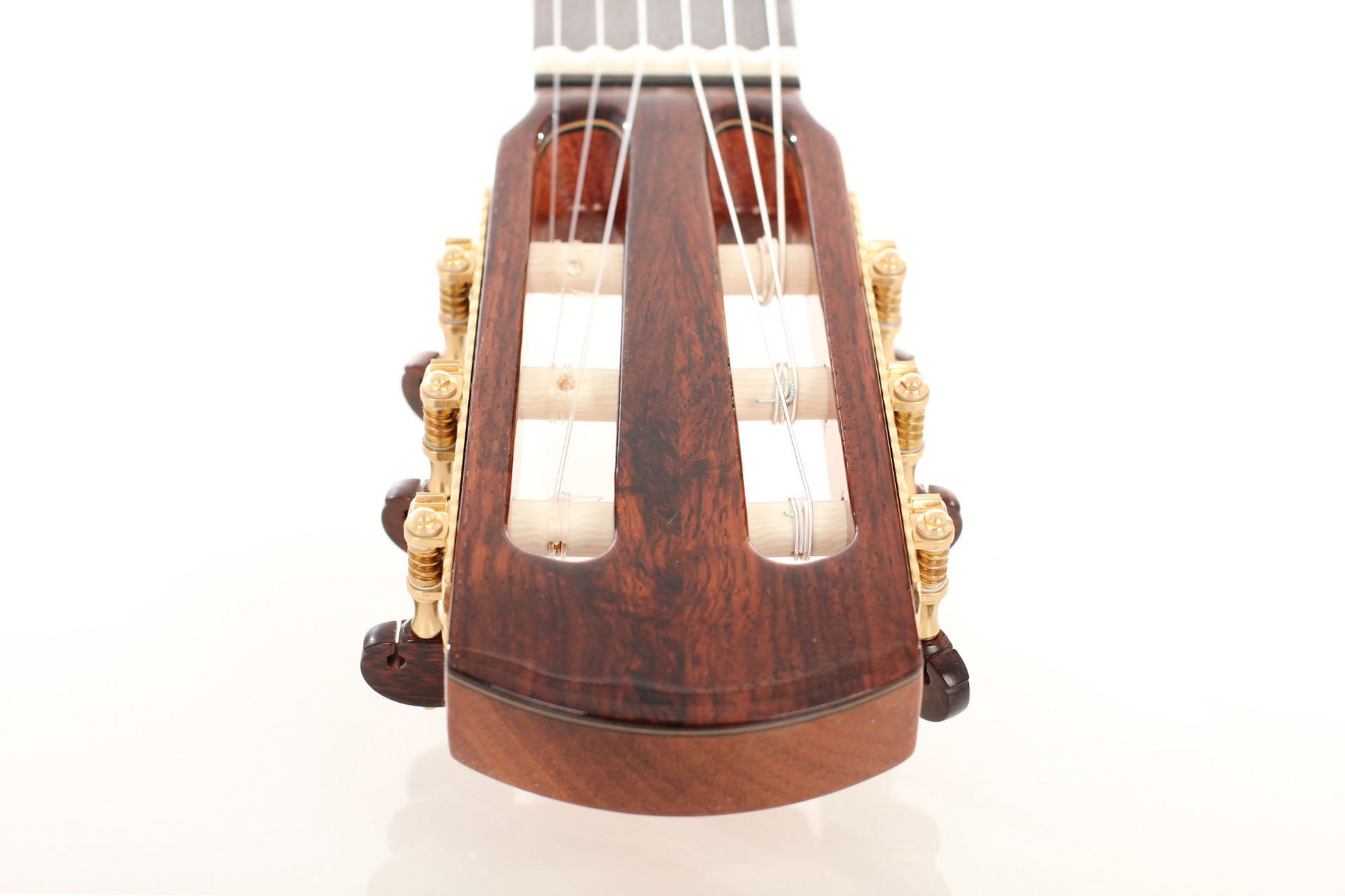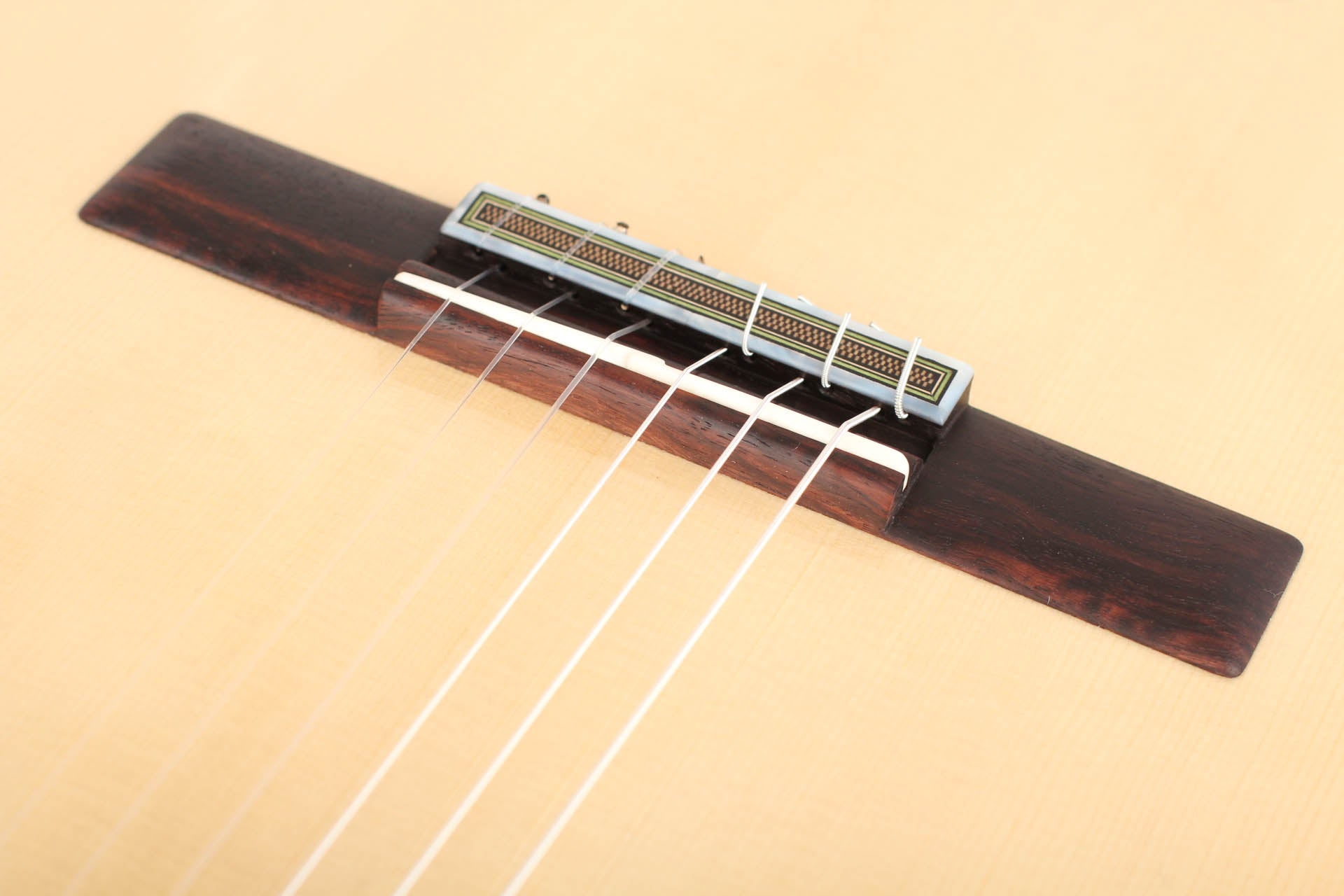 Roy Fankhänel guitars are characterized by a clear sound and well balanced basses that fit to the brilliant trebles. The easy playability of Roy’s guitars makes them perfect instruments for professional virtuosos but also hobby musicians. His guitars are built in a traditional Spanish way but they have very powerful and modern sound. The bridge has twelve symmetric holes to fix the strings and a bone saddle that is formed for better compensation. The bone nut is inlaid into the fingerboard.