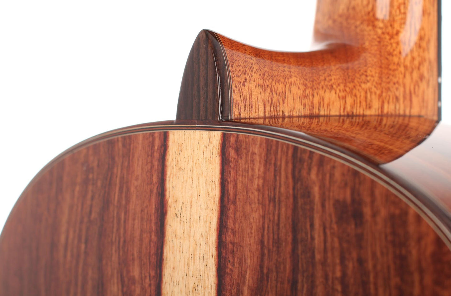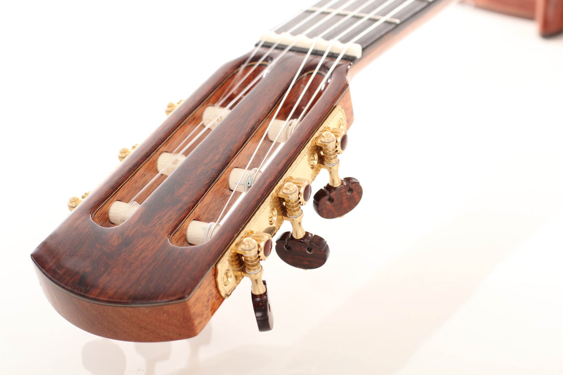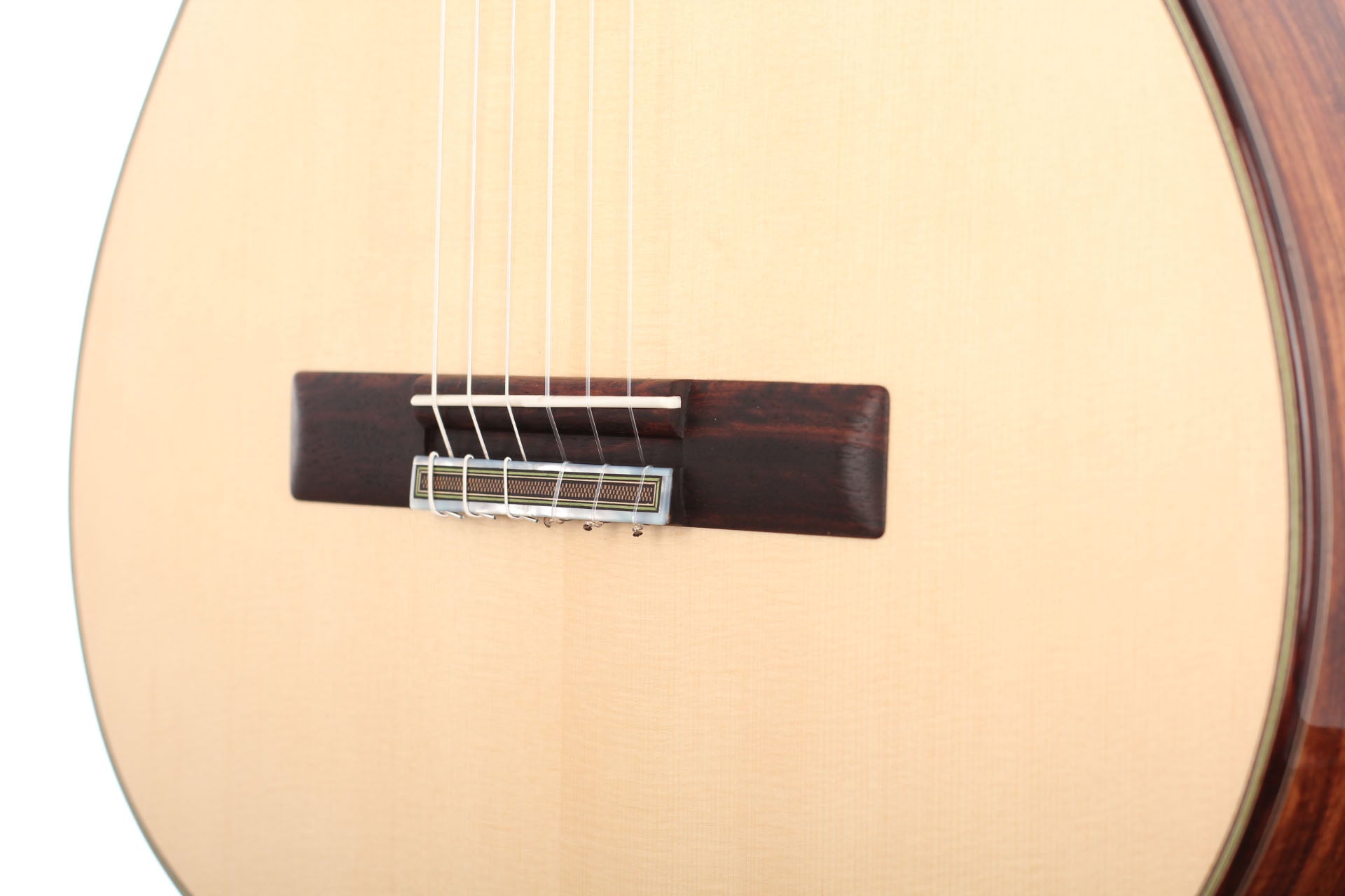 Roy Fankhänel guitars are characterized by a clear sound and well balanced basses that fit to the brilliant trebles. The easy playability of Roy’s guitars makes them perfect instruments for professional virtuosos but also hobby musicians. His guitars are built in a traditional Spanish way but they have very powerful and modern sound. The bridge has twelve symmetric holes to fix the strings and a bone saddle that is formed for better compensation. The bone nut is inlaid into the fingerboard.