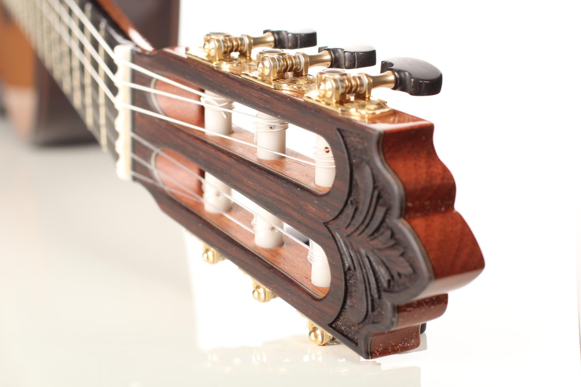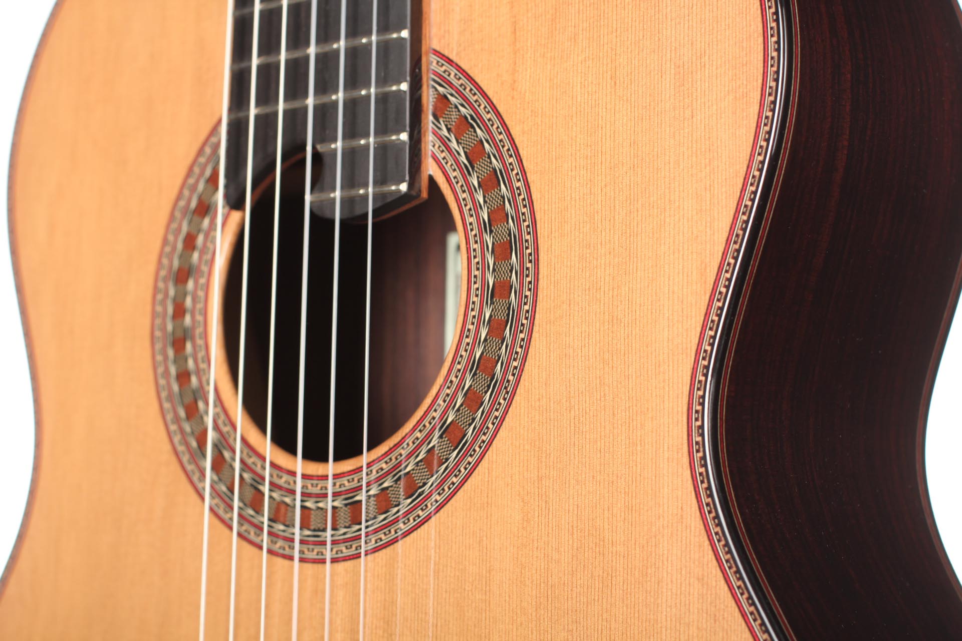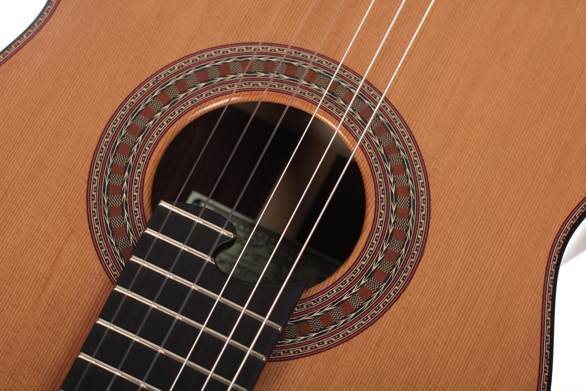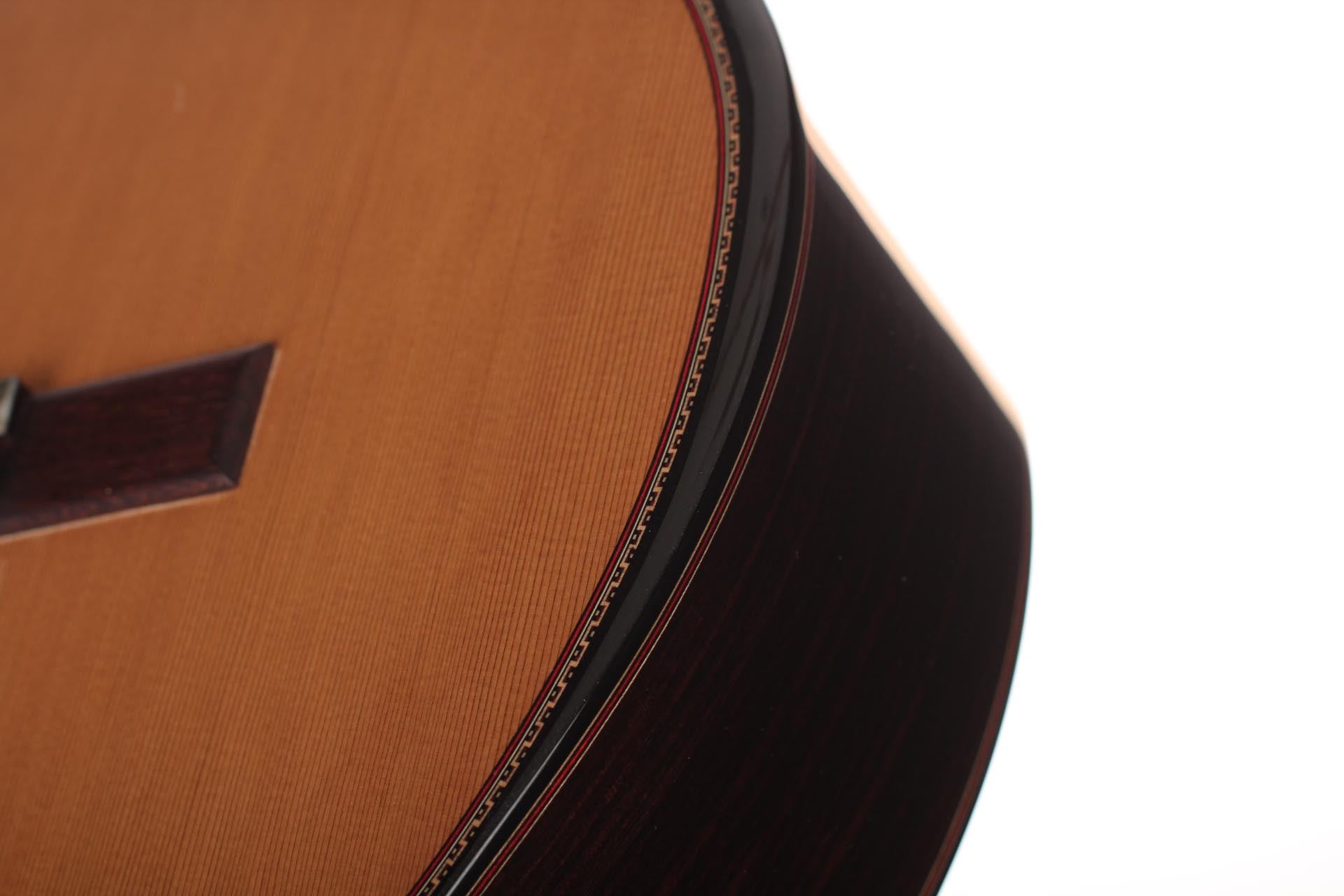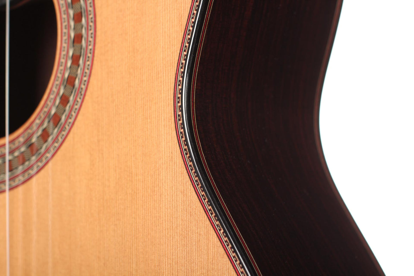 This beautiful guitar was developed in cooperation with „Siccas Guitars“. This guitar-type is a special edition which is only and exclusively available at “Siccas Guitars”. It has a variety of special features which can be found only on this guitar. The decorative elements like rosette and ornaments around the edge were specifically designed, and give the instrument a more traditional look. The head has a crown with carvings, which were especially created for this guitar. The bridge with its 12-hole-drilling fits perfectly into the overall picture of the guitar and is additionally decorated with a beautiful mother of pearl surrounding at its tie block. Eye-catching is also the purfling made of ovangkol, which stresses the precious character of the guitar. The insides, except of the top, are made of mahogany. The raised fingerboard facilitates playing in the high registers and improves the sound in this area noticeably. In addition, it has a bevel, that allows your arm to lie more comfortably on the edge. The top is made of cedar - back and sides are made of Indian rosewood. The machine heads are by Rubner. A Hiscox Pro II case is included.