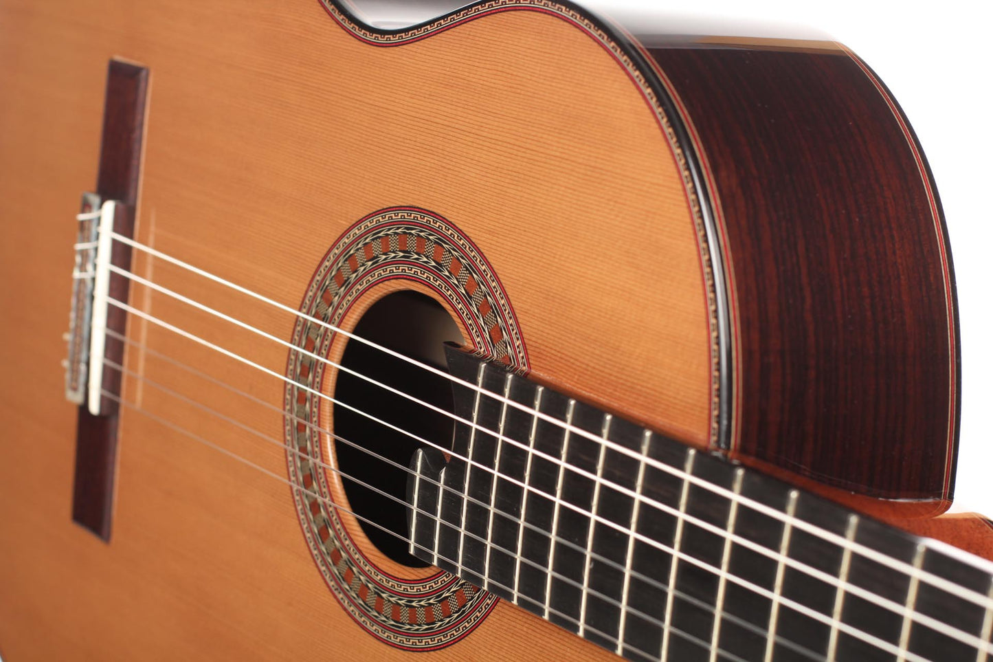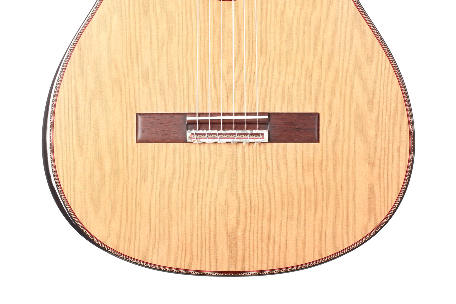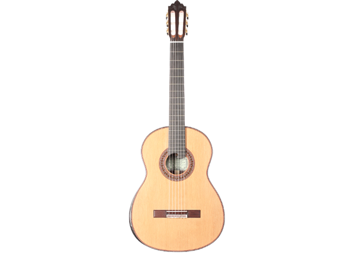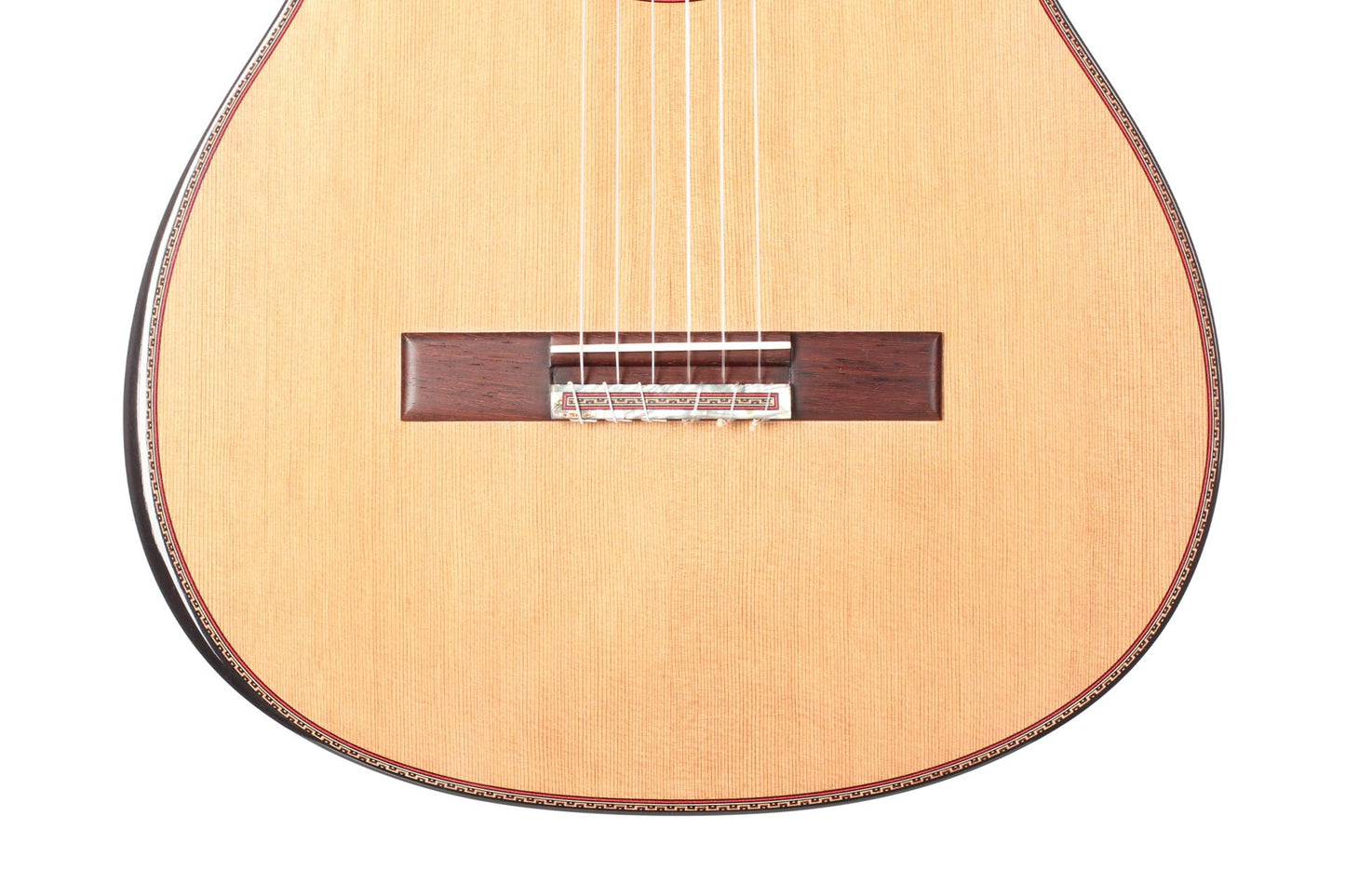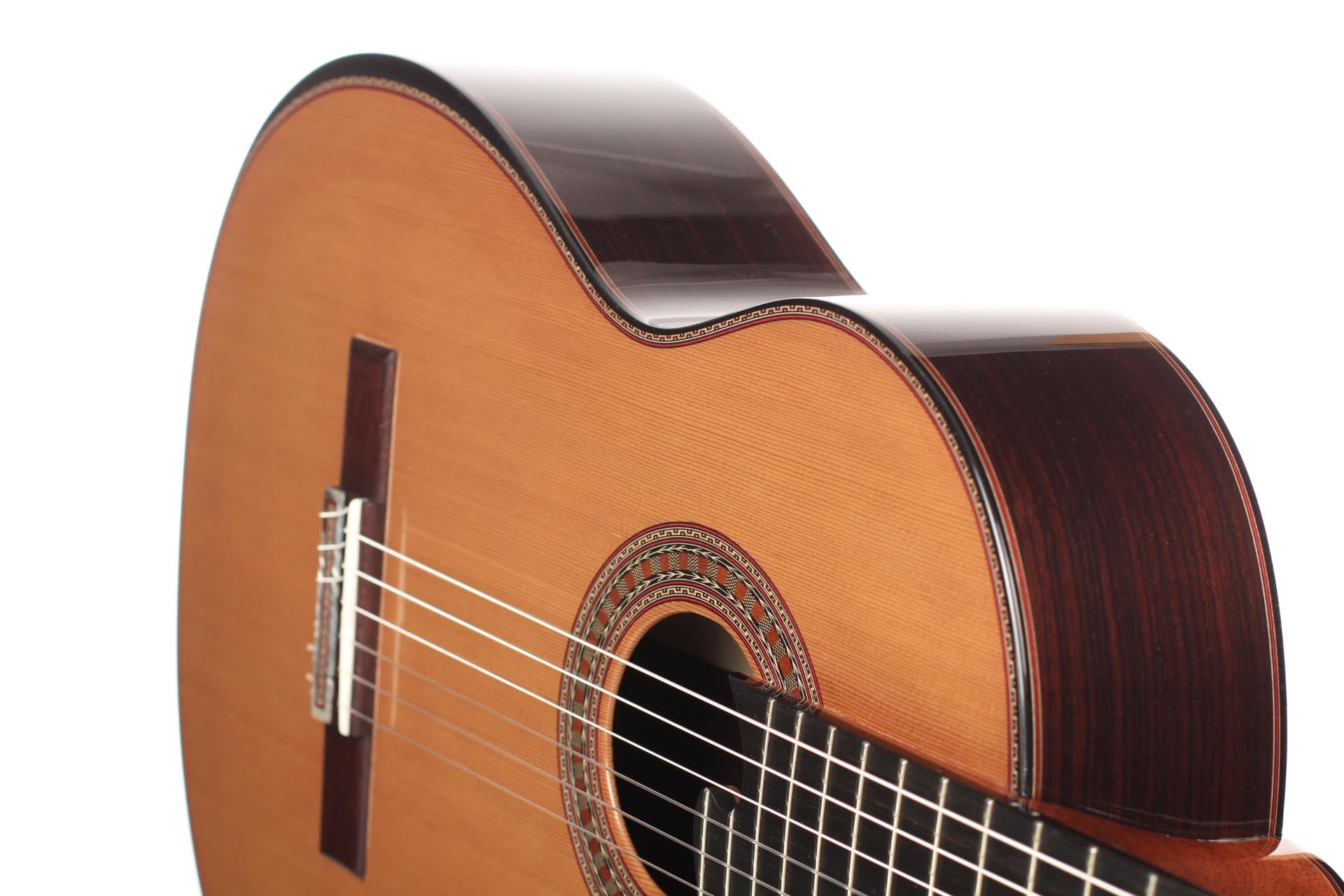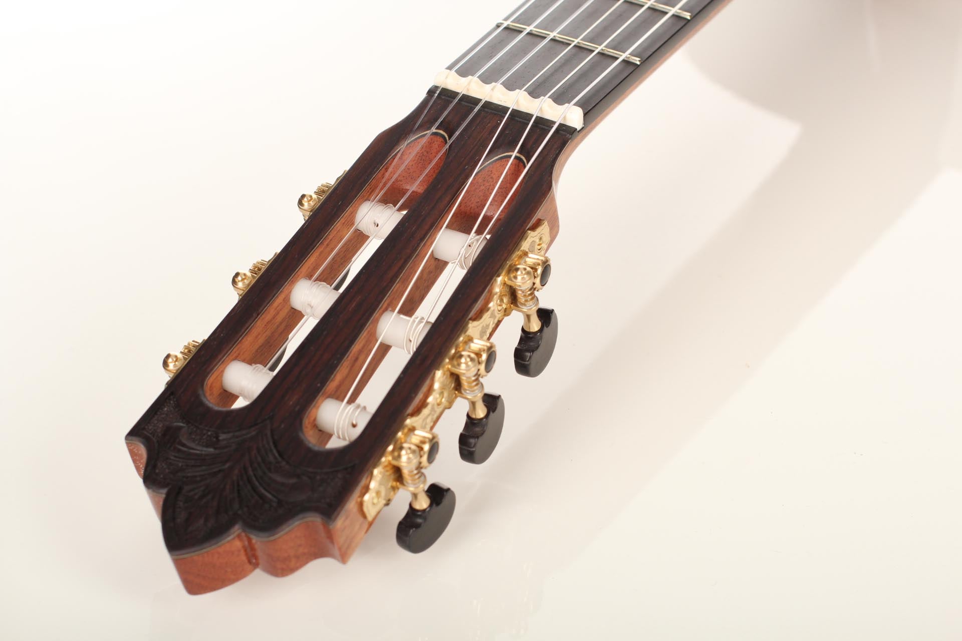 This beautiful guitar was developed in cooperation with „Siccas Guitars“. This guitar-type is a special edition which is only and exclusively available at “Siccas Guitars”. It has a variety of special features which can be found only on this guitar. The decorative elements like rosette and ornaments around the edge were specifically designed, and give the instrument a more traditional look. The head has a crown with carvings, which were especially created for this guitar. The bridge with its 12-hole-drilling fits perfectly into the overall picture of the guitar and is additionally decorated with a beautiful mother of pearl surrounding at its tie block. Eye-catching is also the purfling made of ovangkol, which stresses the precious character of the guitar. The insides, except of the top, are made of mahogany. The raised fingerboard facilitates playing in the high registers and improves the sound in this area noticeably. In addition, it has a bevel, that allows your arm to lie more comfortably on the edge. The top is made of cedar - back and sides are made of Indian rosewood. The machine heads are by Rubner. A Hiscox Pro II case is included.