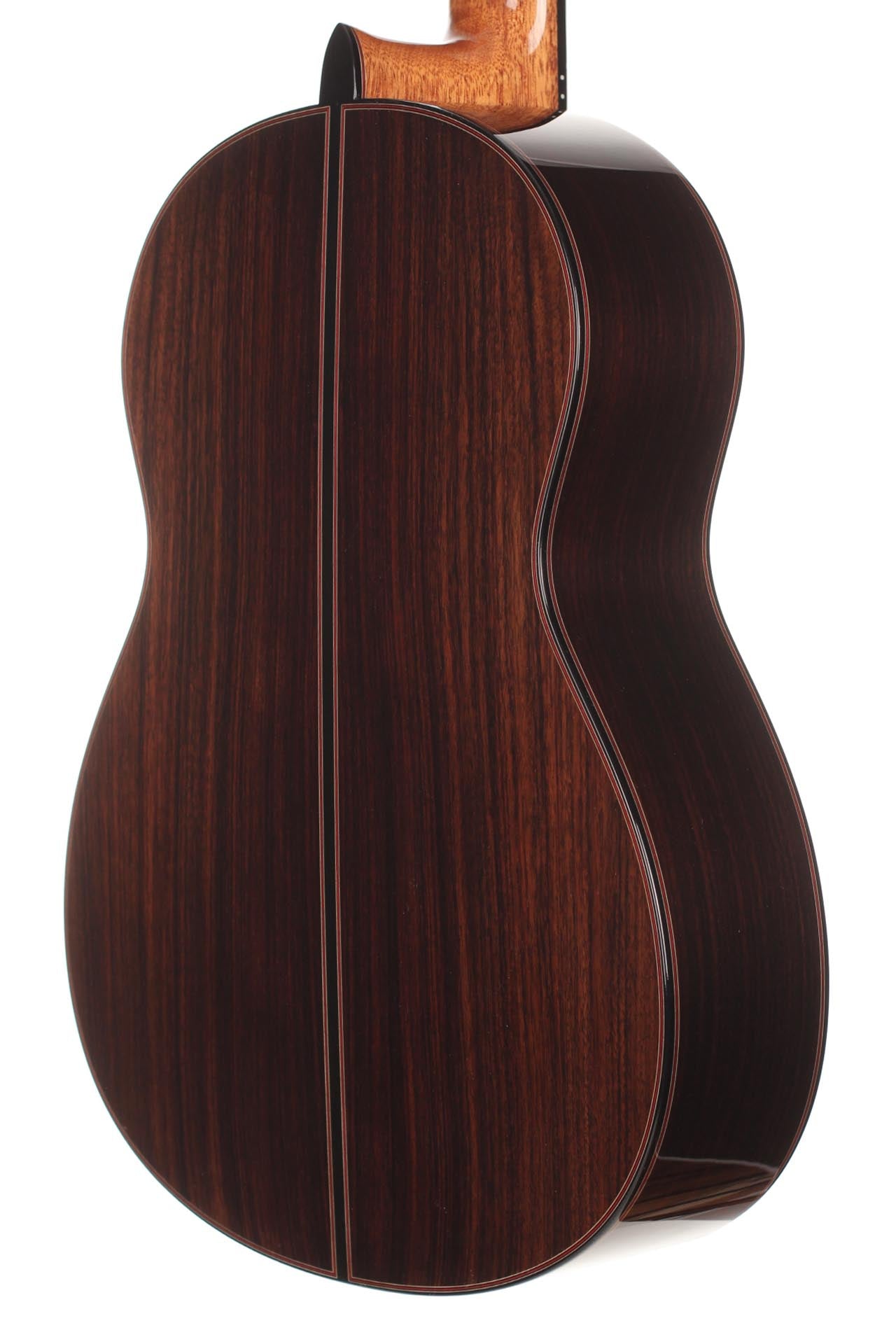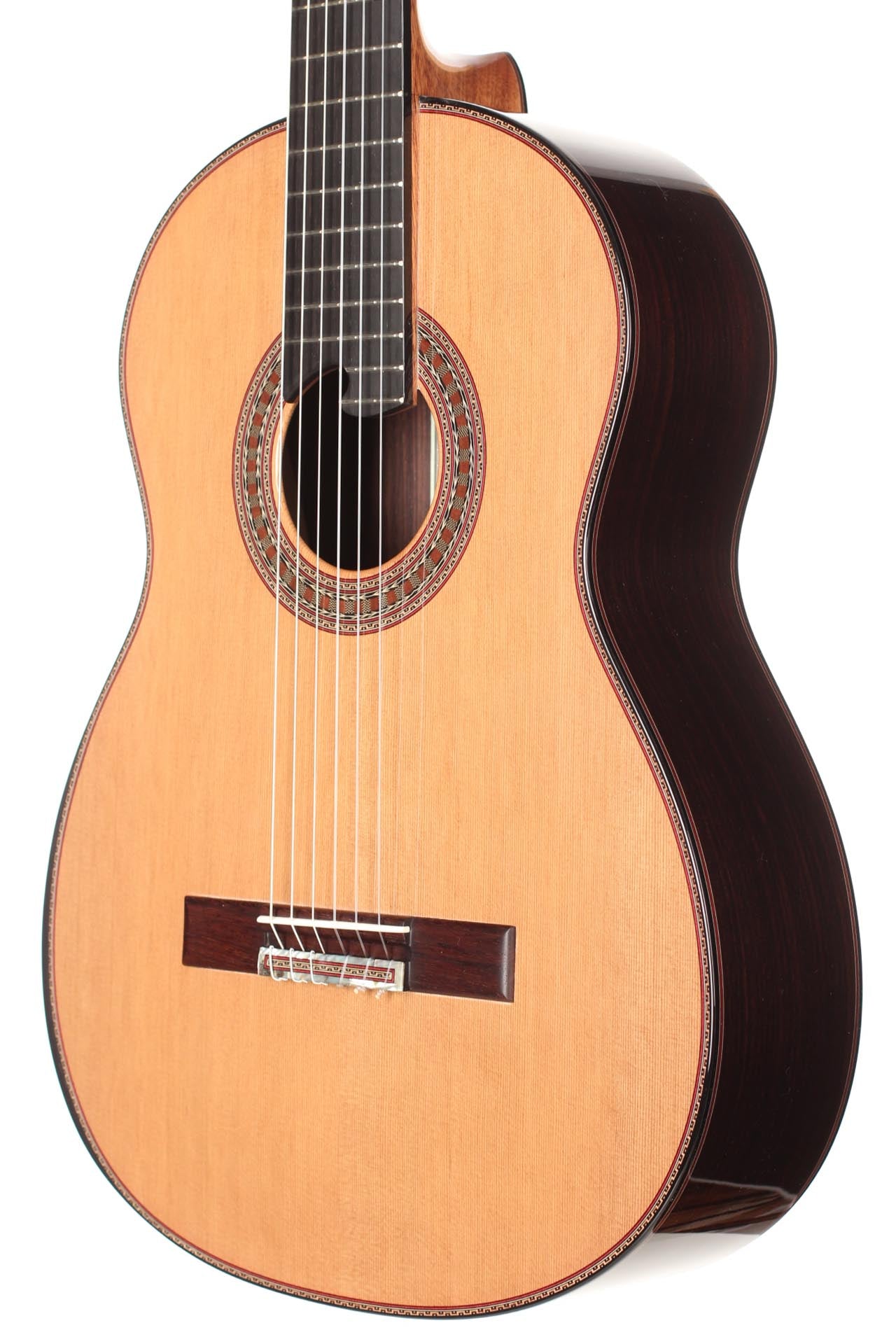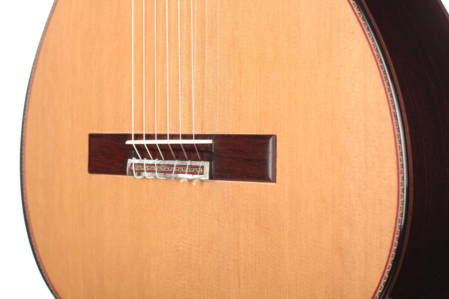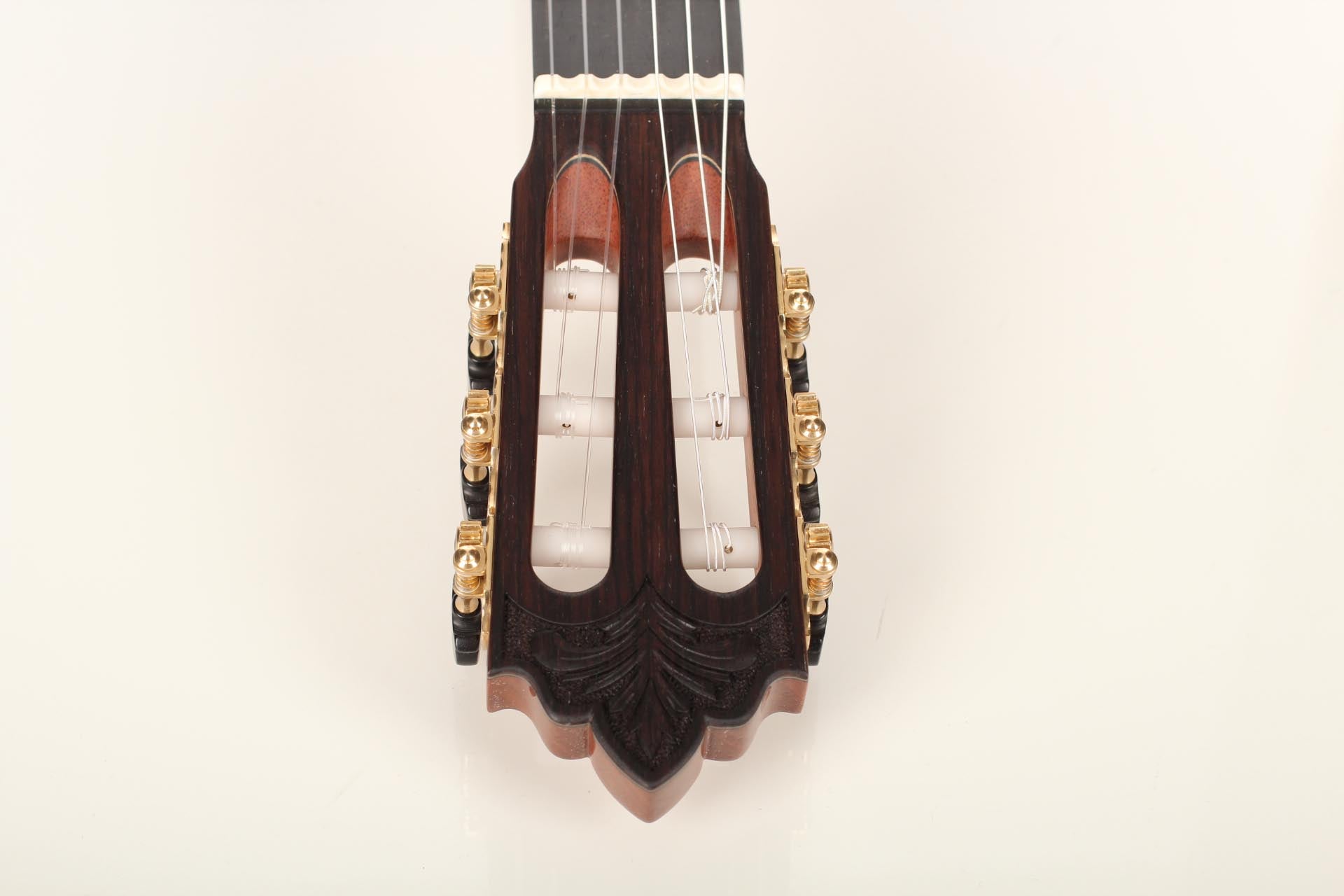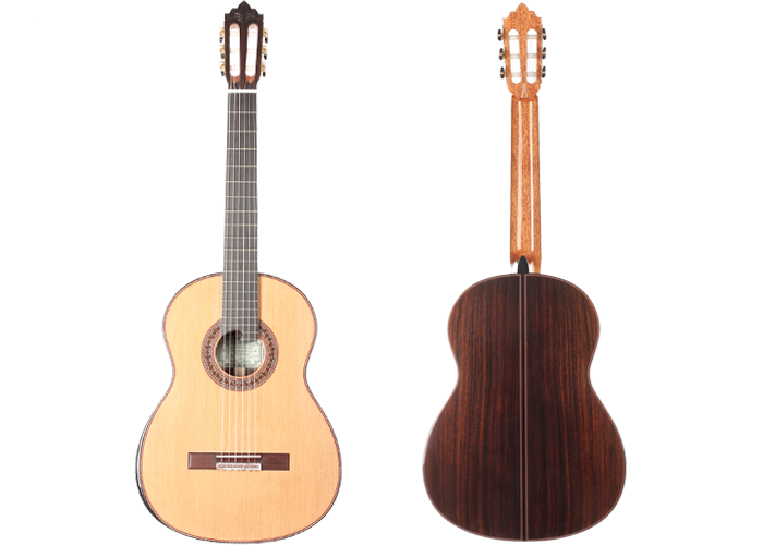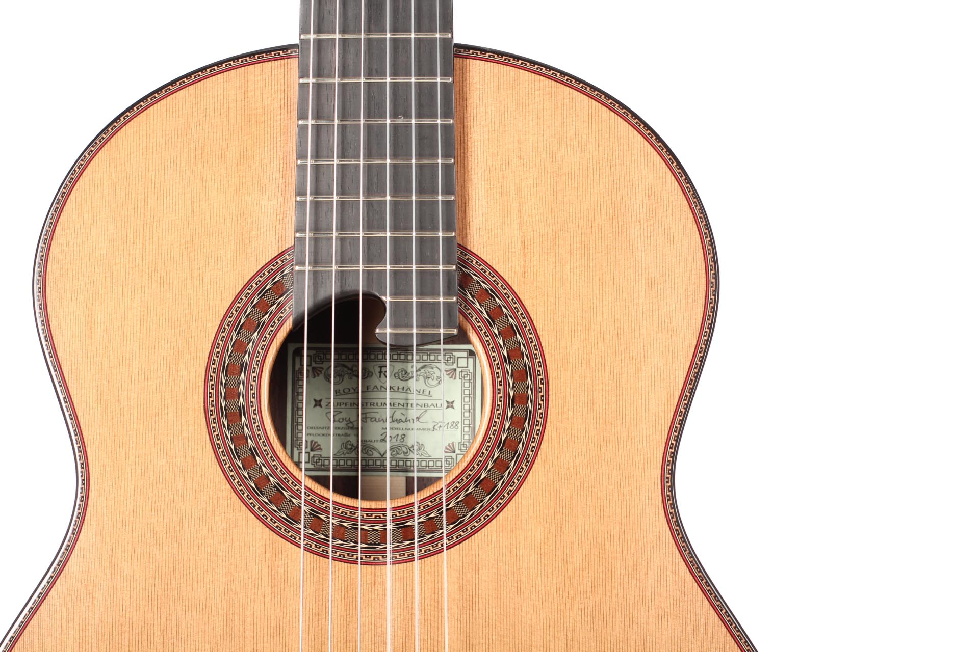 This beautiful guitar was developed in cooperation with „Siccas Guitars“. This guitar-type is a special edition which is only and exclusively available at “Siccas Guitars”. It has a variety of special features which can be found only on this guitar. The decorative elements like rosette and ornaments around the edge were specifically designed, and give the instrument a more traditional look. The head has a crown with carvings, which were especially created for this guitar. The bridge with its 12-hole-drilling fits perfectly into the overall picture of the guitar and is additionally decorated with a beautiful mother of pearl surrounding at its tie block. Eye-catching is also the purfling made of ovangkol, which stresses the precious character of the guitar. The insides, except of the top, are made of mahogany. The raised fingerboard facilitates playing in the high registers and improves the sound in this area noticeably. In addition, it has a bevel, that allows your arm to lie more comfortably on the edge. The top is made of cedar - back and sides are made of Indian rosewood. The machine heads are by Rubner. A Hiscox Pro II case is included.