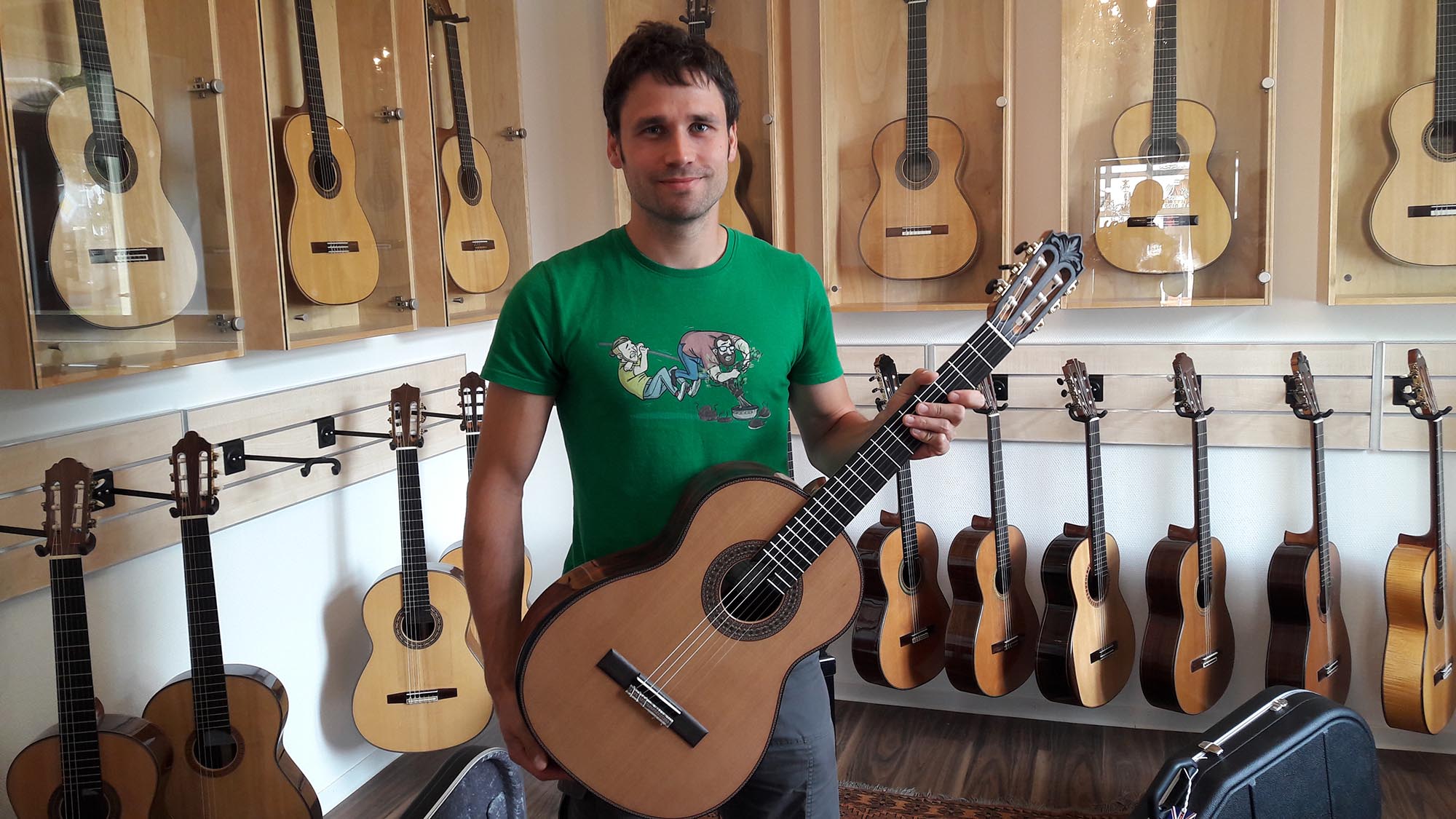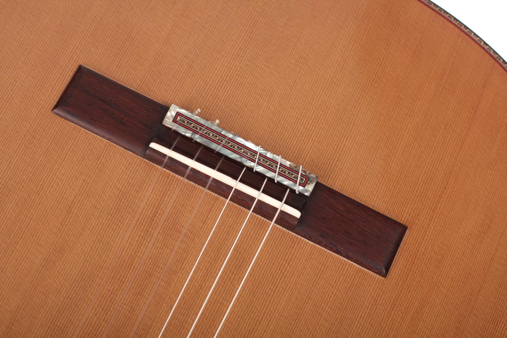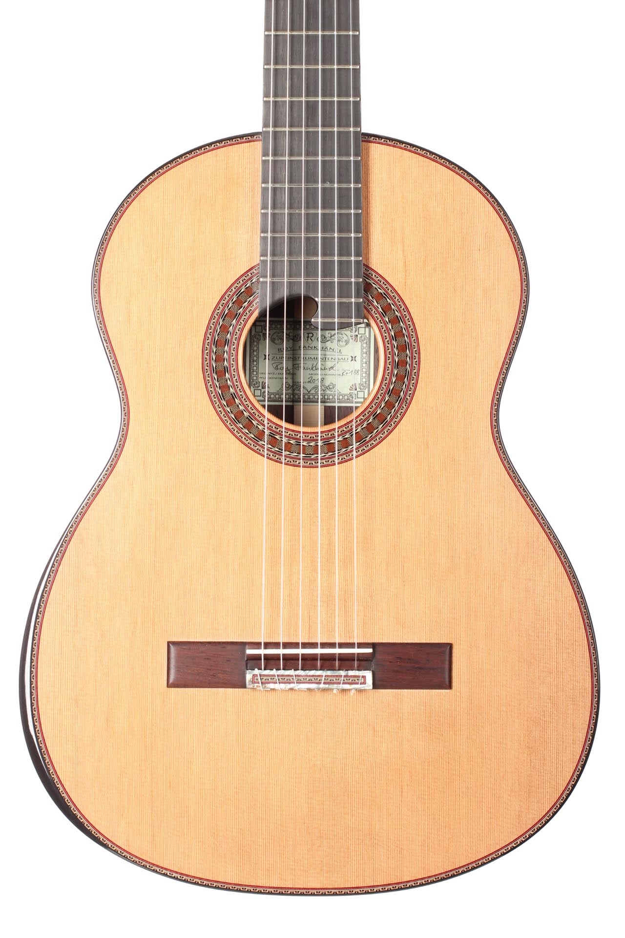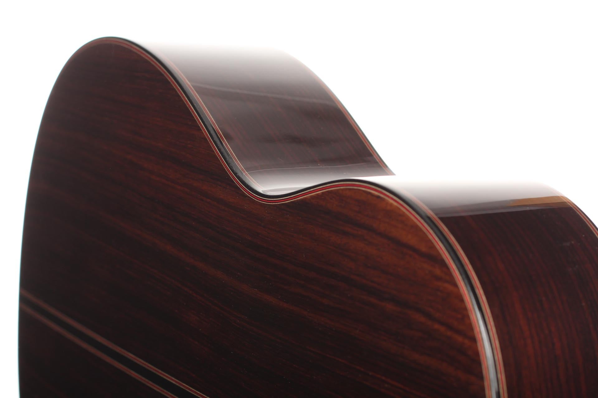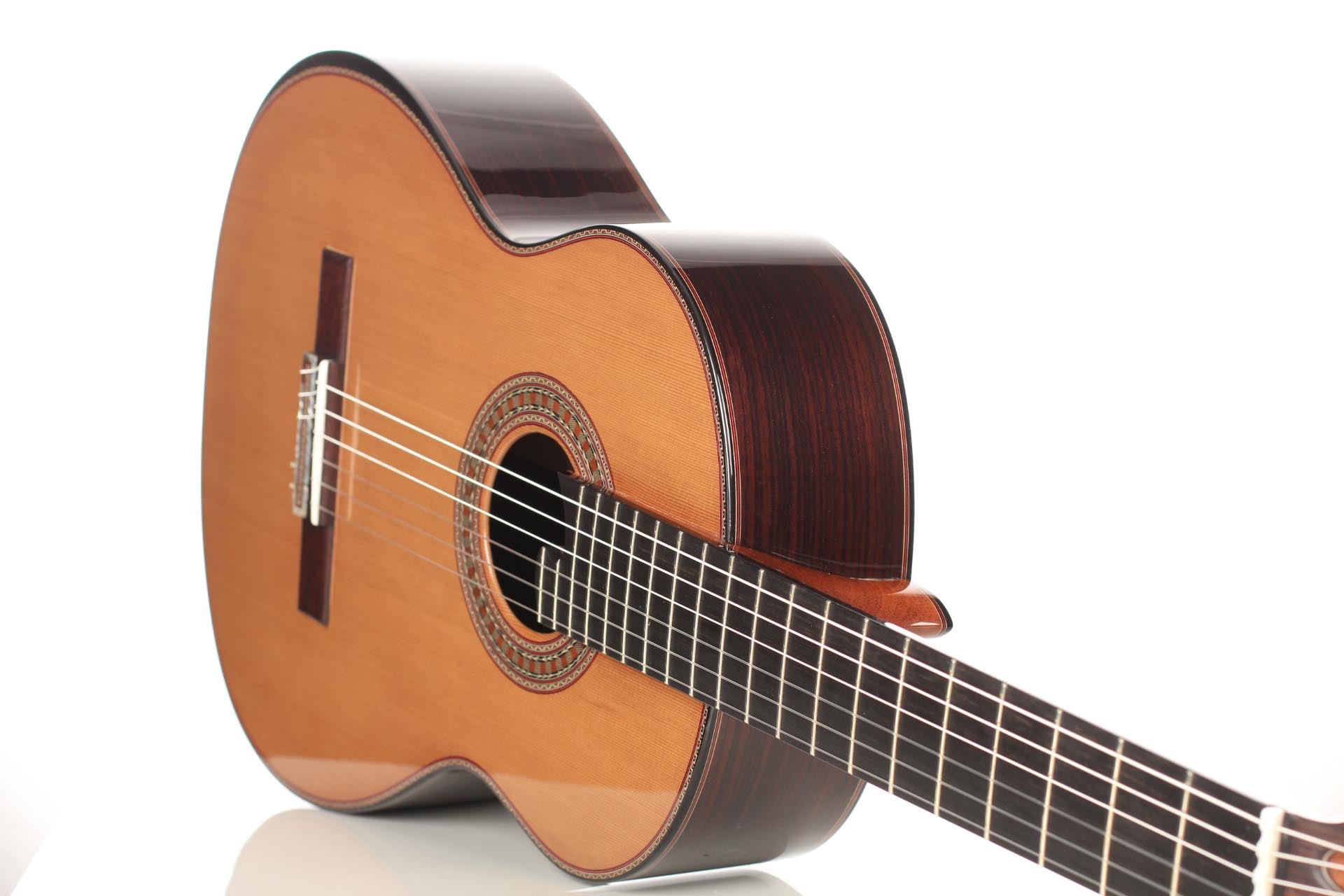 This beautiful guitar was developed in cooperation with „Siccas Guitars“. This guitar-type is a special edition which is only and exclusively available at “Siccas Guitars”. It has a variety of special features which can be found only on this guitar. The decorative elements like rosette and ornaments around the edge were specifically designed, and give the instrument a more traditional look. The head has a crown with carvings, which were especially created for this guitar. The bridge with its 12-hole-drilling fits perfectly into the overall picture of the guitar and is additionally decorated with a beautiful mother of pearl surrounding at its tie block. Eye-catching is also the purfling made of ovangkol, which stresses the precious character of the guitar. The insides, except of the top, are made of mahogany. The raised fingerboard facilitates playing in the high registers and improves the sound in this area noticeably. In addition, it has a bevel, that allows your arm to lie more comfortably on the edge. The top is made of cedar - back and sides are made of Indian rosewood. The machine heads are by Rubner. A Hiscox Pro II case is included.