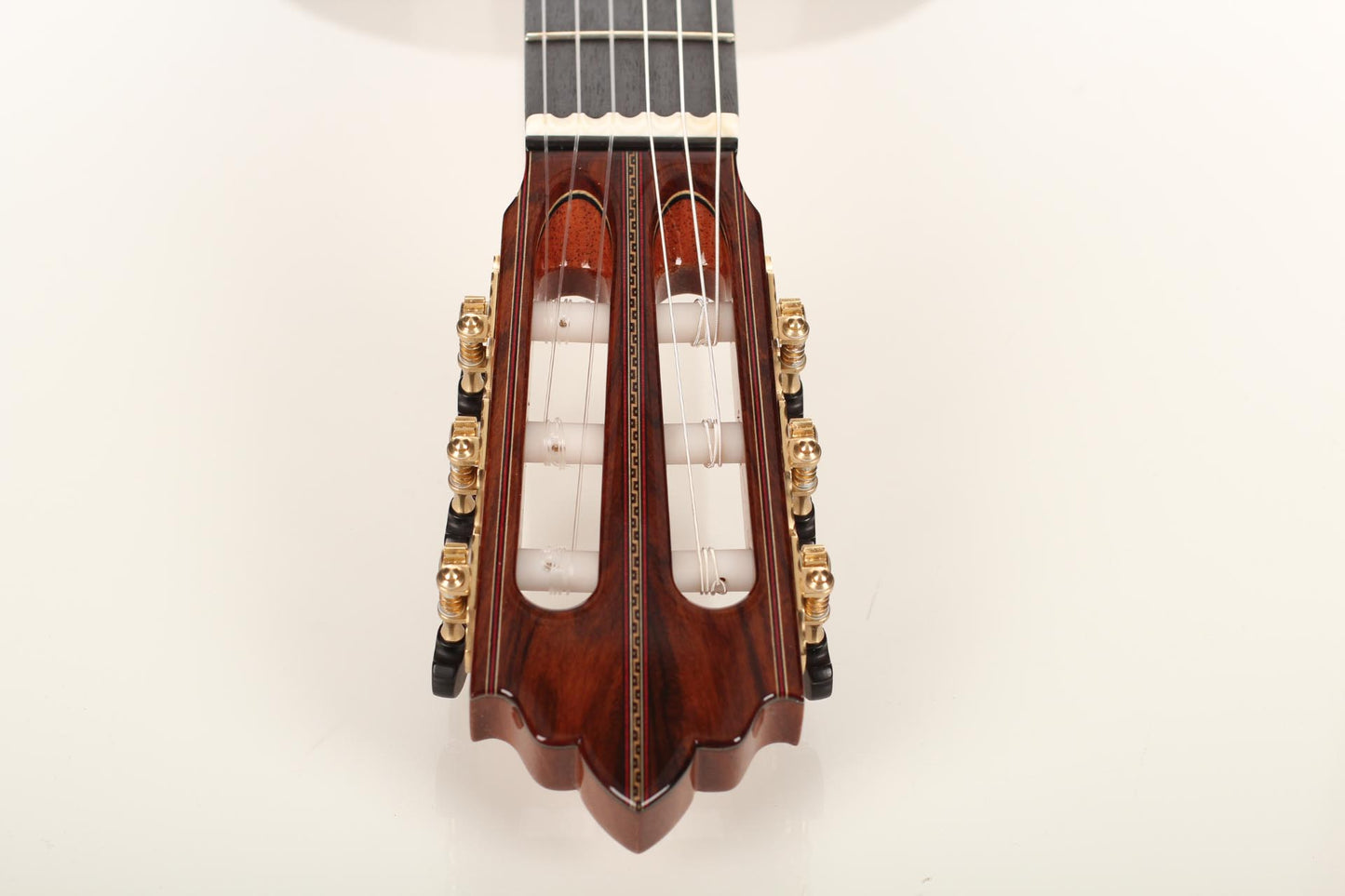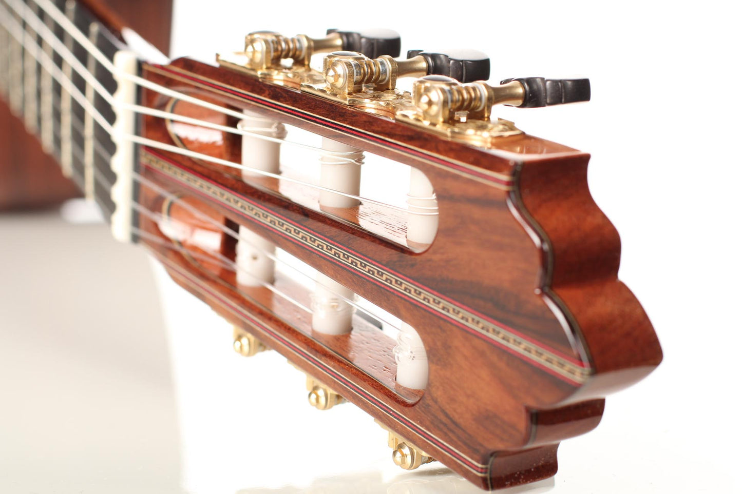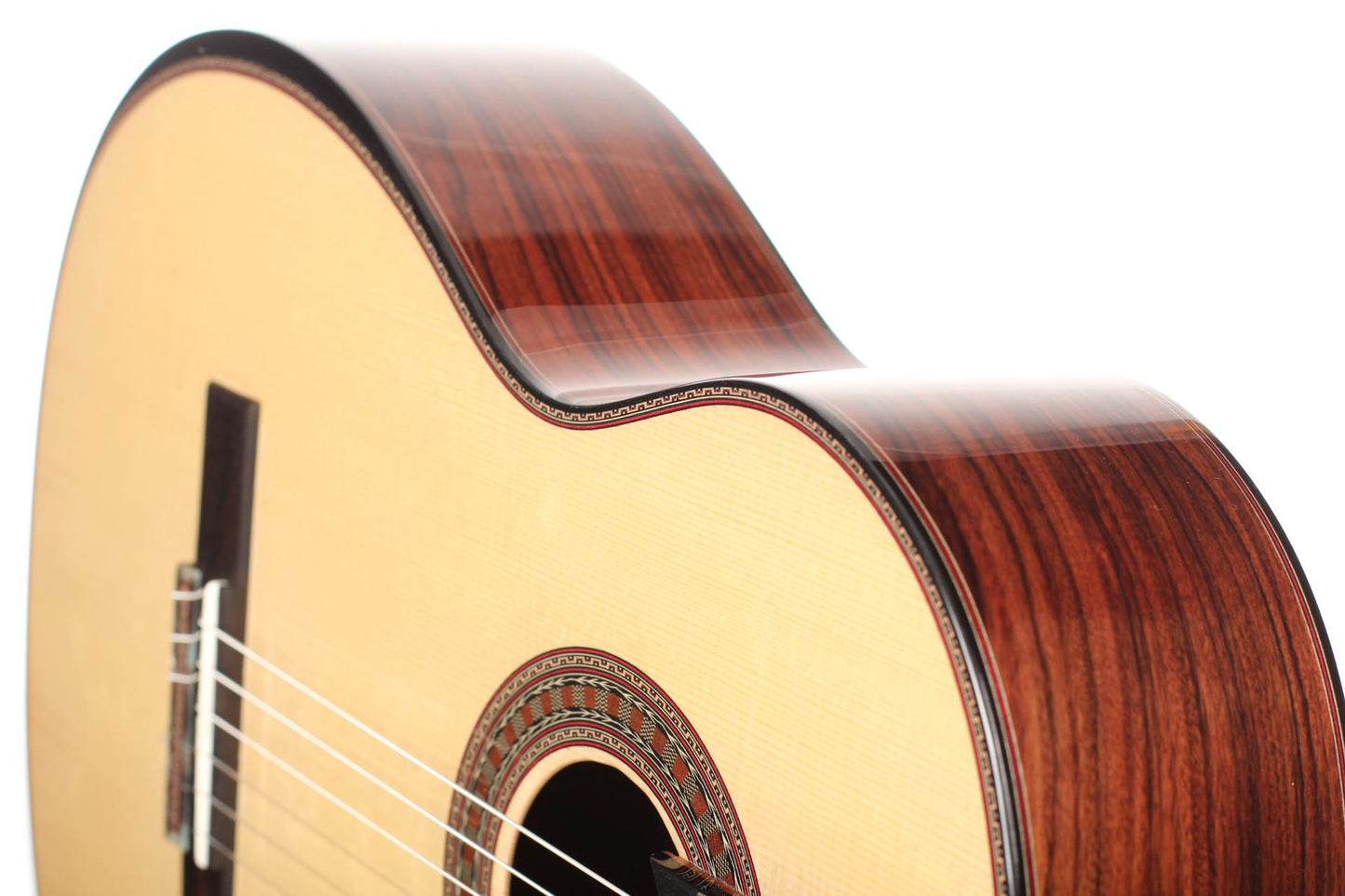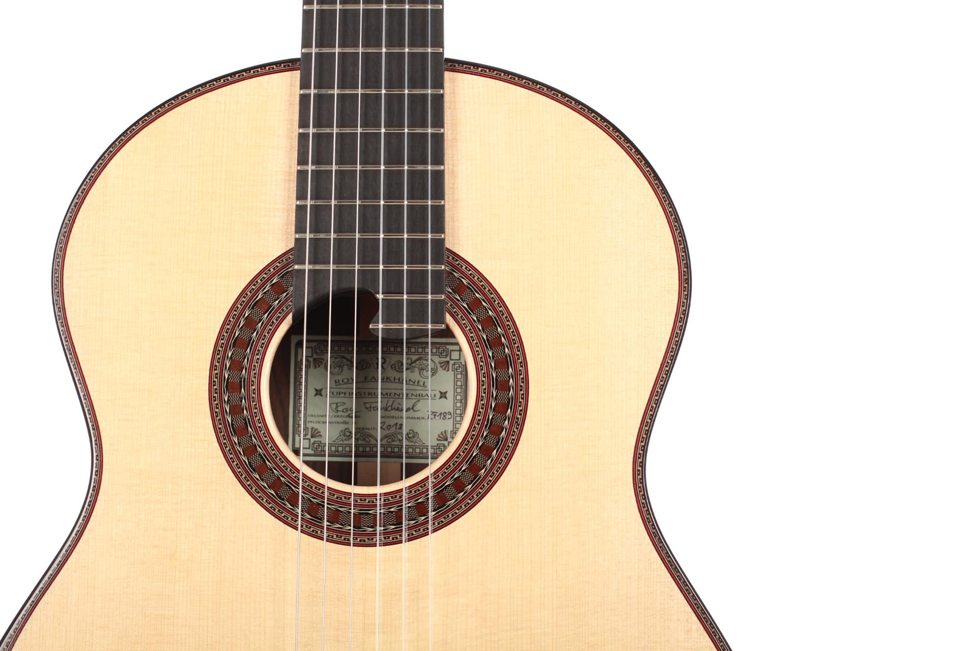 This beautiful guitar was developed in cooperation with „Siccas Guitars“. It has a variety of special features which can be found only on this guitar model. The decorative elements like rosette and ornaments around the edge were specifically designed, and give the instrument a more traditional look. The head has a crown with carvings, which were especially created for this guitar. The bridge with its 12-hole-drilling fits perfectly into the overall picture of the guitar and is additionally decorated with a beautiful mother of pearl surrounding at its tie block. In addition, it has a bevel, that allows your arm to lie more comfortably on the edge. The marvelously worked wave-like end of the fingerboard over the rosette matches the rounded wooden tuning pegs perfectly. To simplify barré, the fingerboard is horizontally arched, and furthermore raised to enable the easy use of higher frets. In fact, the playability is amazing. It is a stunning concert guitar that can fill great auditoriums as well as smaller intimate concert halls. Its generous sound is projected to the back door with great ease and comfort for the player as well as for the audience. These qualities are truly special for a freshly built spruce top guitar and are one of Roy’s great achievements. This guitar allows great dynamics, from cello to harpsichord and from whole orchestra to single singer. This is a great instrument that will blossom in the hands of a committed guitarist. The tuners are made by Rubner. A Hiscox Pro II hard-shell case is included. This guitar is CITES-free (CF).