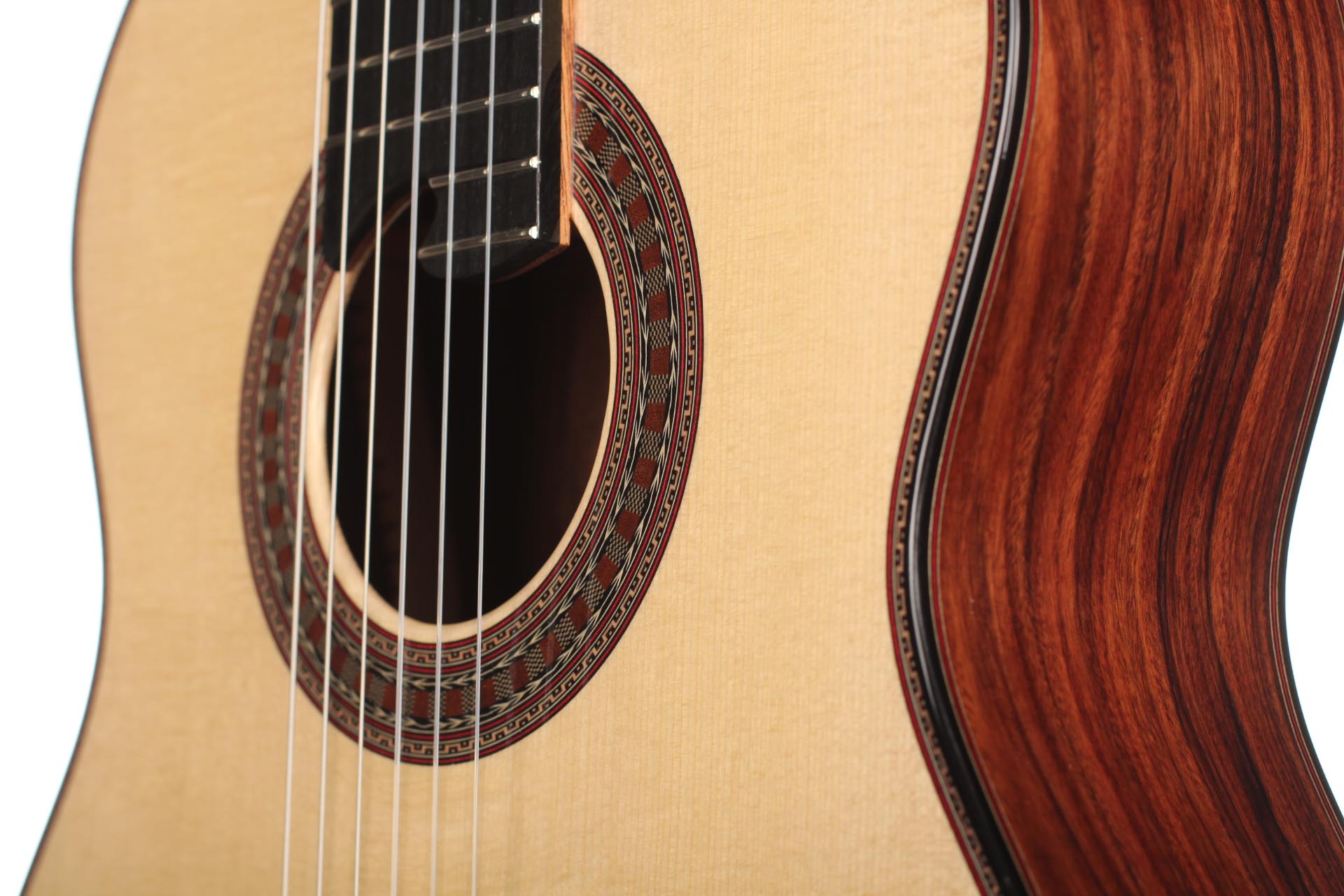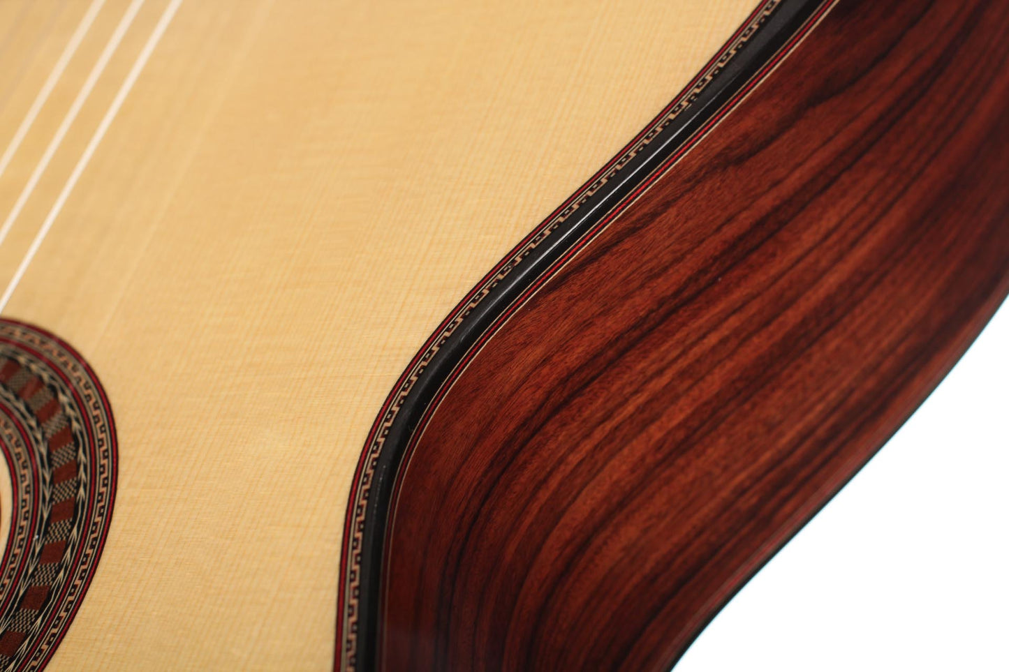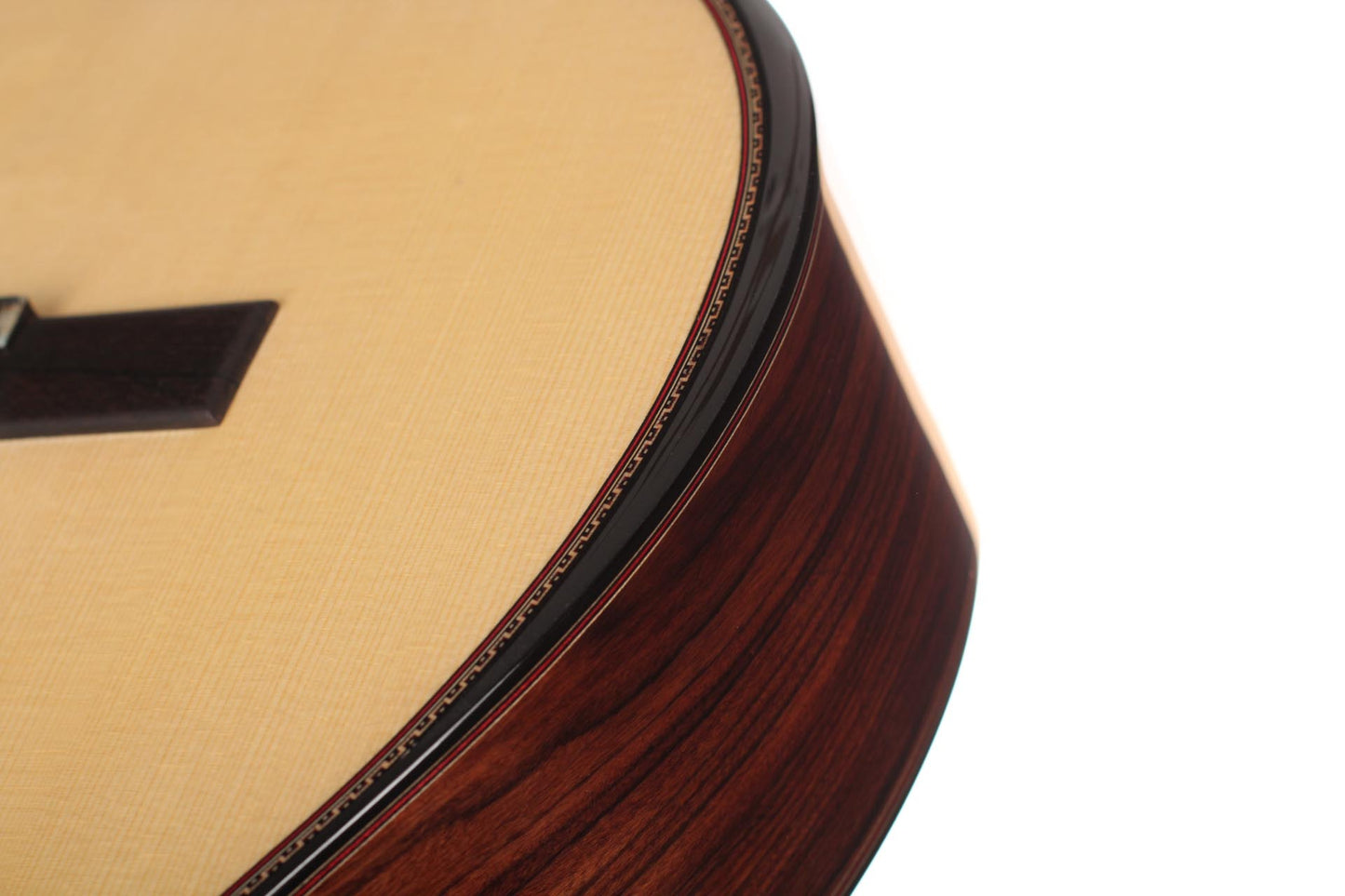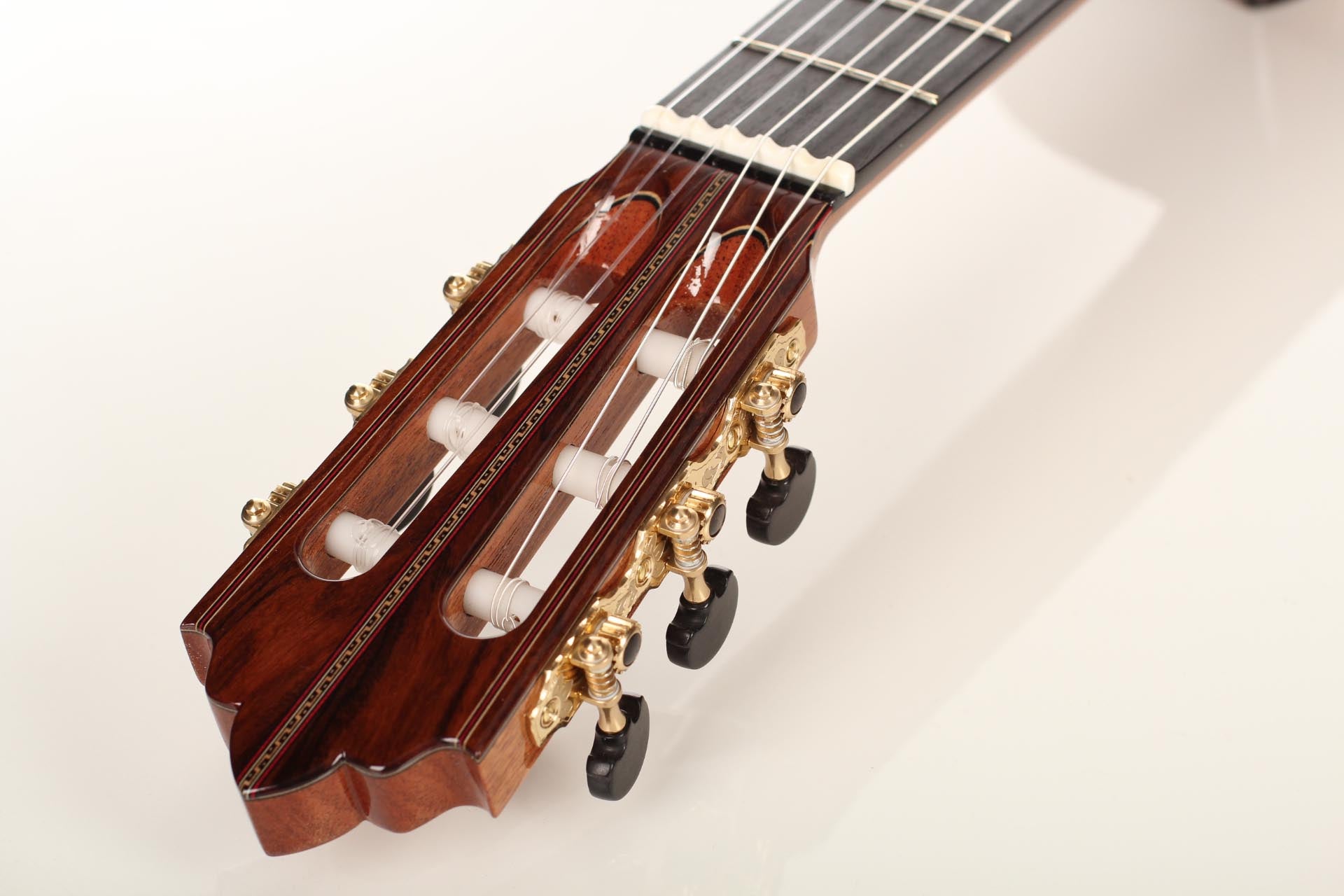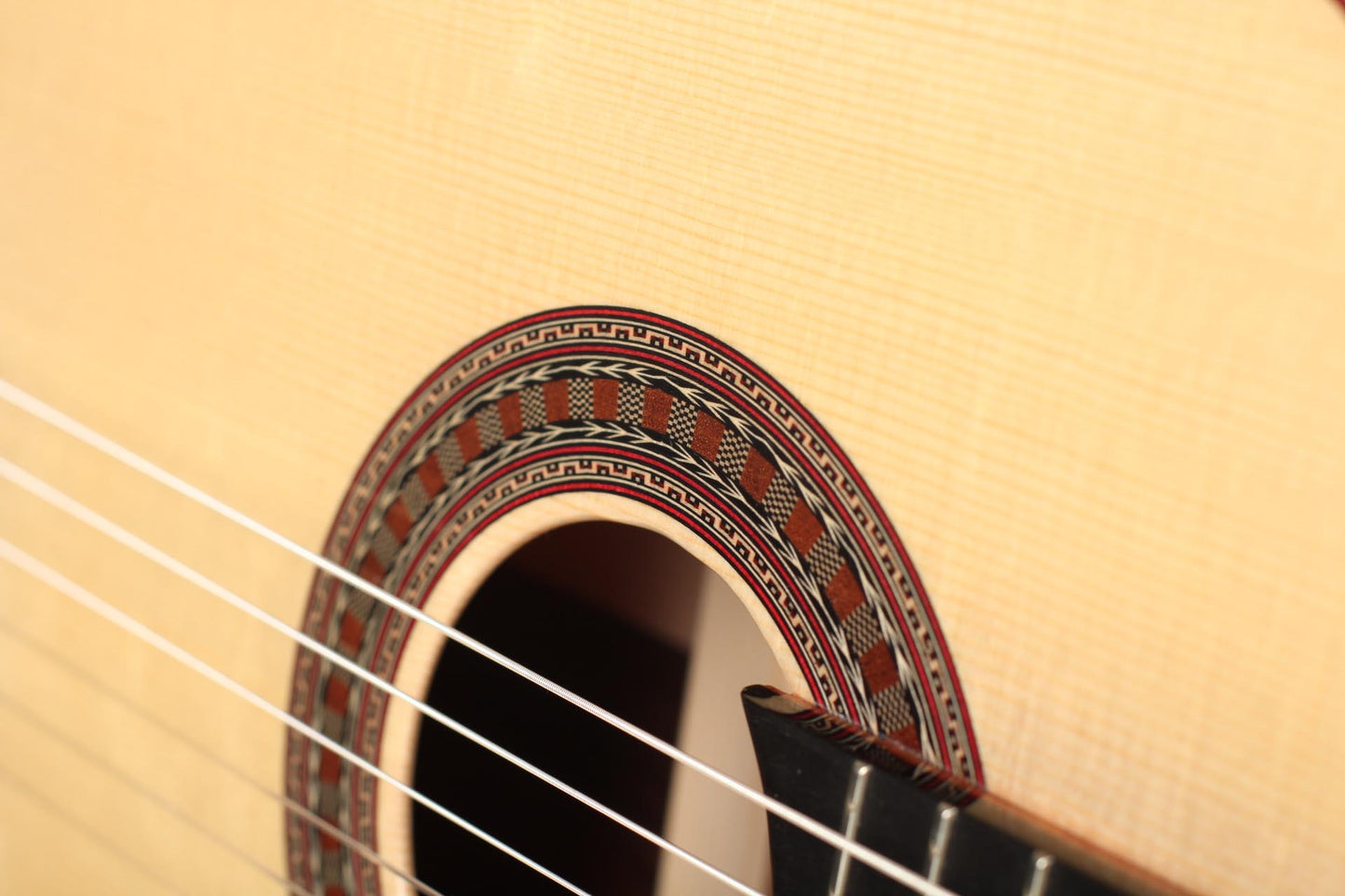 This beautiful guitar was developed in cooperation with „Siccas Guitars“. It has a variety of special features which can be found only on this guitar model. The decorative elements like rosette and ornaments around the edge were specifically designed, and give the instrument a more traditional look. The head has a crown with carvings, which were especially created for this guitar. The bridge with its 12-hole-drilling fits perfectly into the overall picture of the guitar and is additionally decorated with a beautiful mother of pearl surrounding at its tie block. In addition, it has a bevel, that allows your arm to lie more comfortably on the edge. The marvelously worked wave-like end of the fingerboard over the rosette matches the rounded wooden tuning pegs perfectly. To simplify barré, the fingerboard is horizontally arched, and furthermore raised to enable the easy use of higher frets. In fact, the playability is amazing. It is a stunning concert guitar that can fill great auditoriums as well as smaller intimate concert halls. Its generous sound is projected to the back door with great ease and comfort for the player as well as for the audience. These qualities are truly special for a freshly built spruce top guitar and are one of Roy’s great achievements. This guitar allows great dynamics, from cello to harpsichord and from whole orchestra to single singer. This is a great instrument that will blossom in the hands of a committed guitarist. The tuners are made by Rubner. A Hiscox Pro II hard-shell case is included. This guitar is CITES-free (CF).