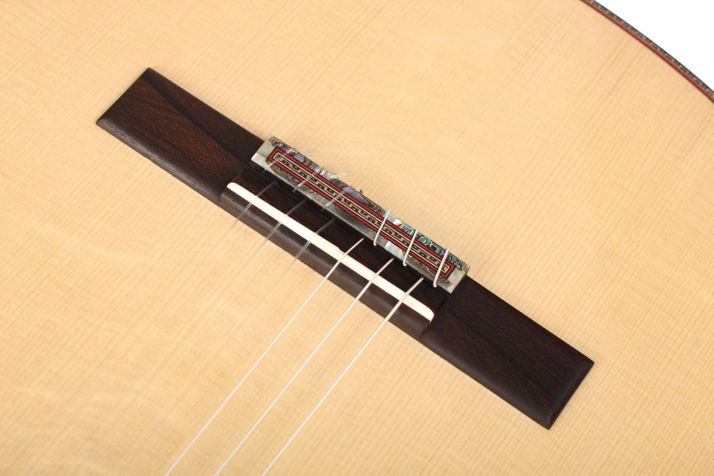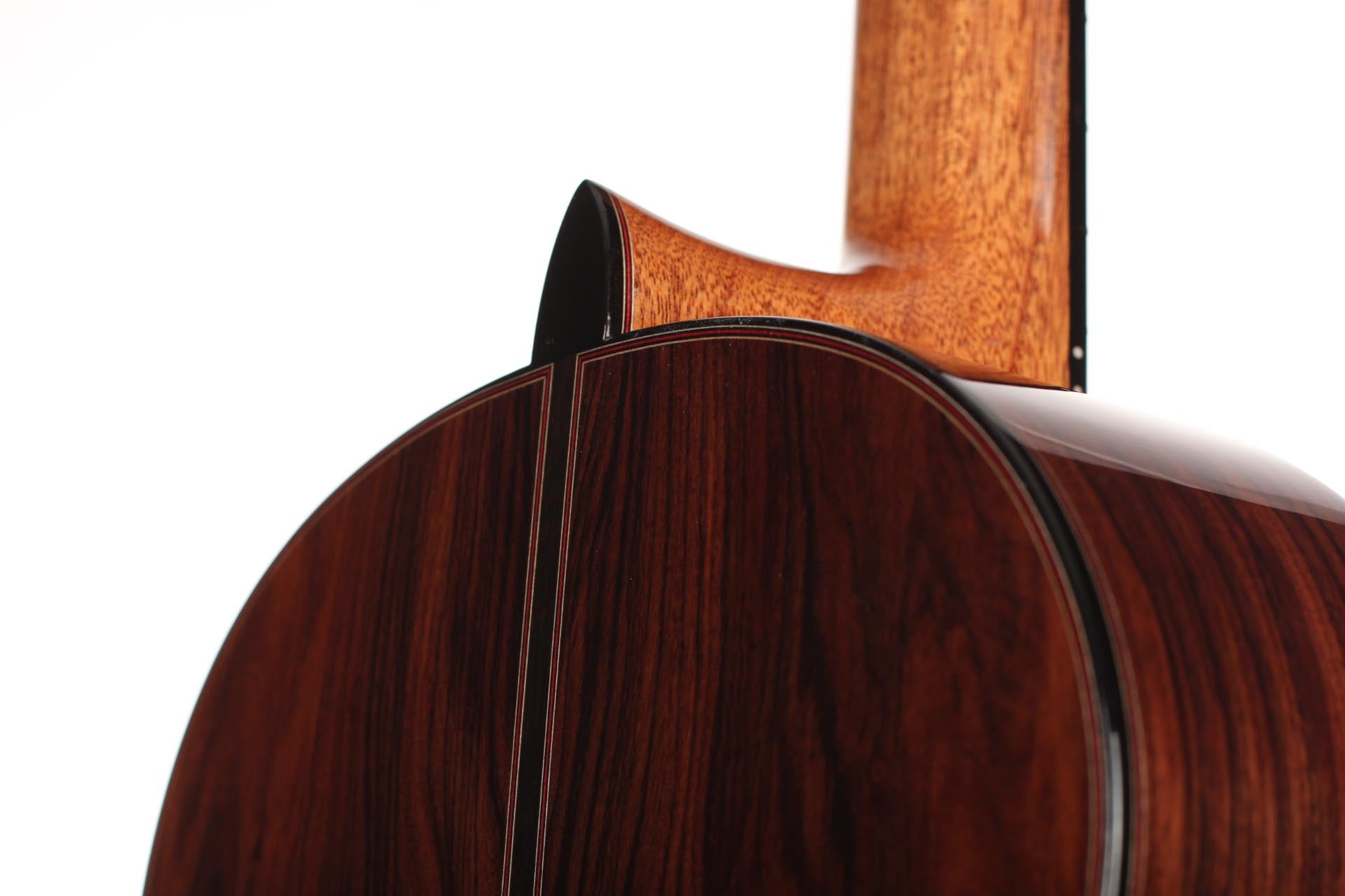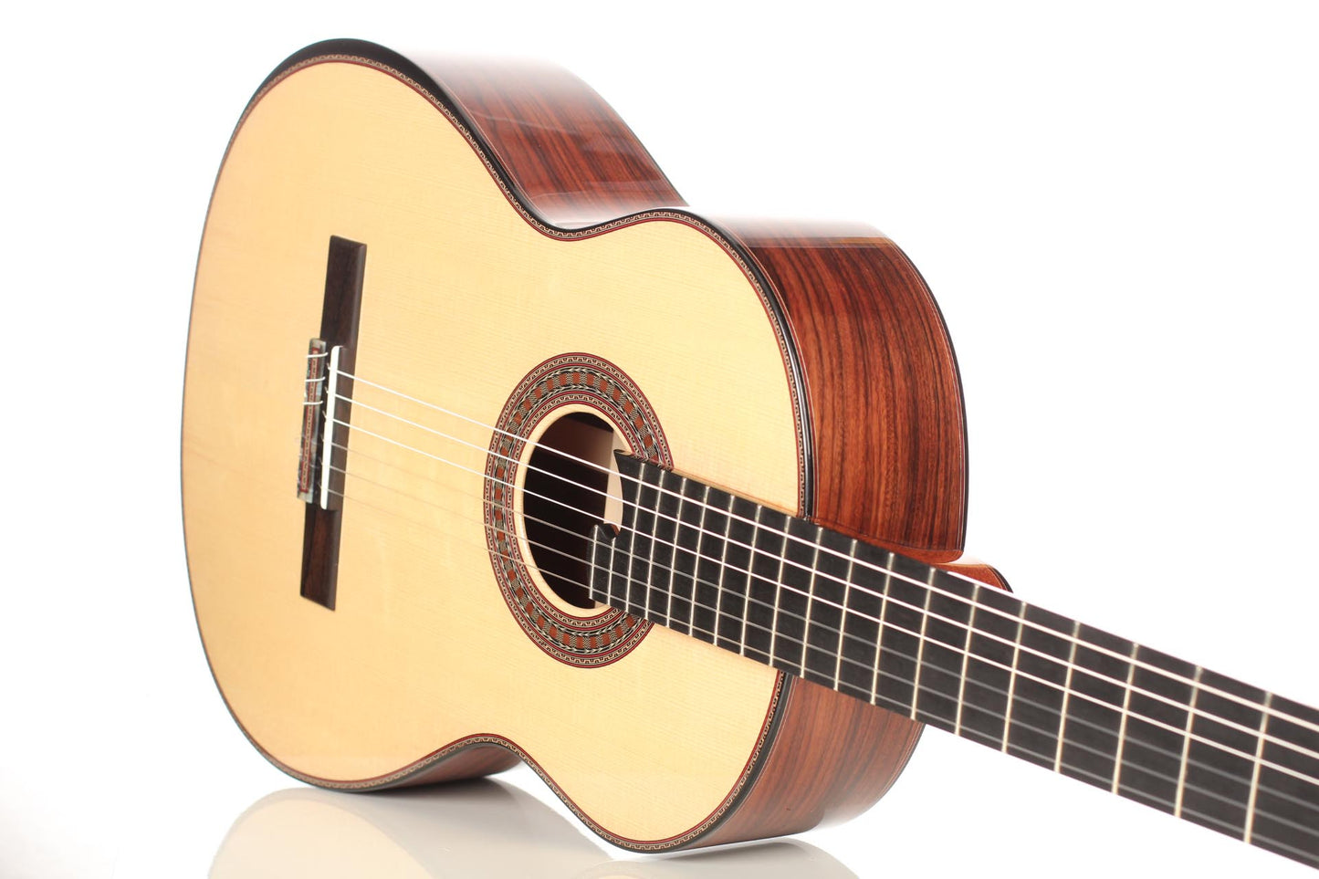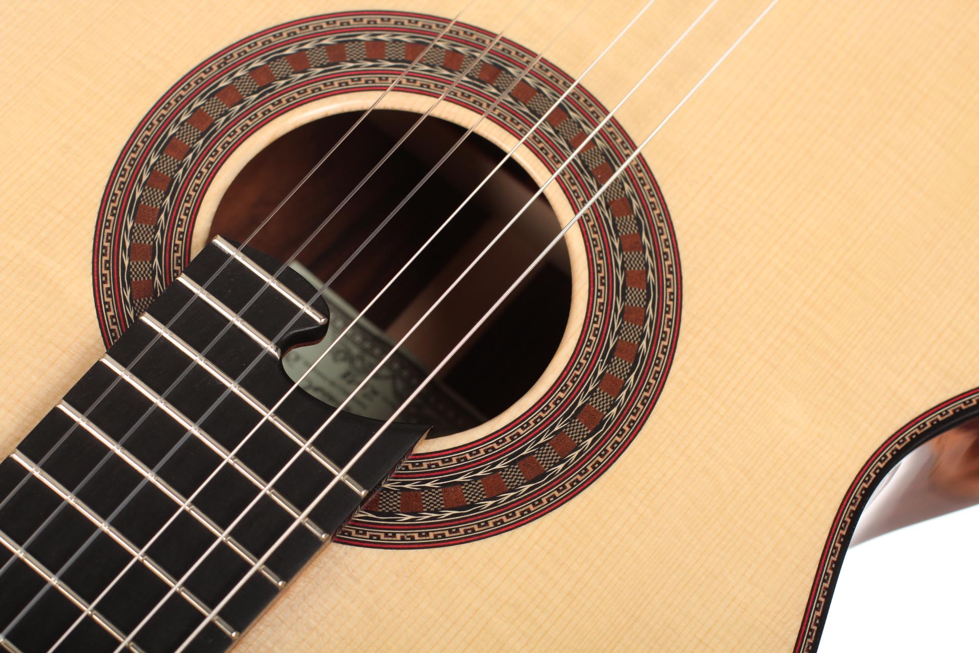 This beautiful guitar was developed in cooperation with „Siccas Guitars“. It has a variety of special features which can be found only on this guitar model. The decorative elements like rosette and ornaments around the edge were specifically designed, and give the instrument a more traditional look. The head has a crown with carvings, which were especially created for this guitar. The bridge with its 12-hole-drilling fits perfectly into the overall picture of the guitar and is additionally decorated with a beautiful mother of pearl surrounding at its tie block. In addition, it has a bevel, that allows your arm to lie more comfortably on the edge. The marvelously worked wave-like end of the fingerboard over the rosette matches the rounded wooden tuning pegs perfectly. To simplify barré, the fingerboard is horizontally arched, and furthermore raised to enable the easy use of higher frets. In fact, the playability is amazing. It is a stunning concert guitar that can fill great auditoriums as well as smaller intimate concert halls. Its generous sound is projected to the back door with great ease and comfort for the player as well as for the audience. These qualities are truly special for a freshly built spruce top guitar and are one of Roy’s great achievements. This guitar allows great dynamics, from cello to harpsichord and from whole orchestra to single singer. This is a great instrument that will blossom in the hands of a committed guitarist. The tuners are made by Rubner. A Hiscox Pro II hard-shell case is included. This guitar is CITES-free (CF).