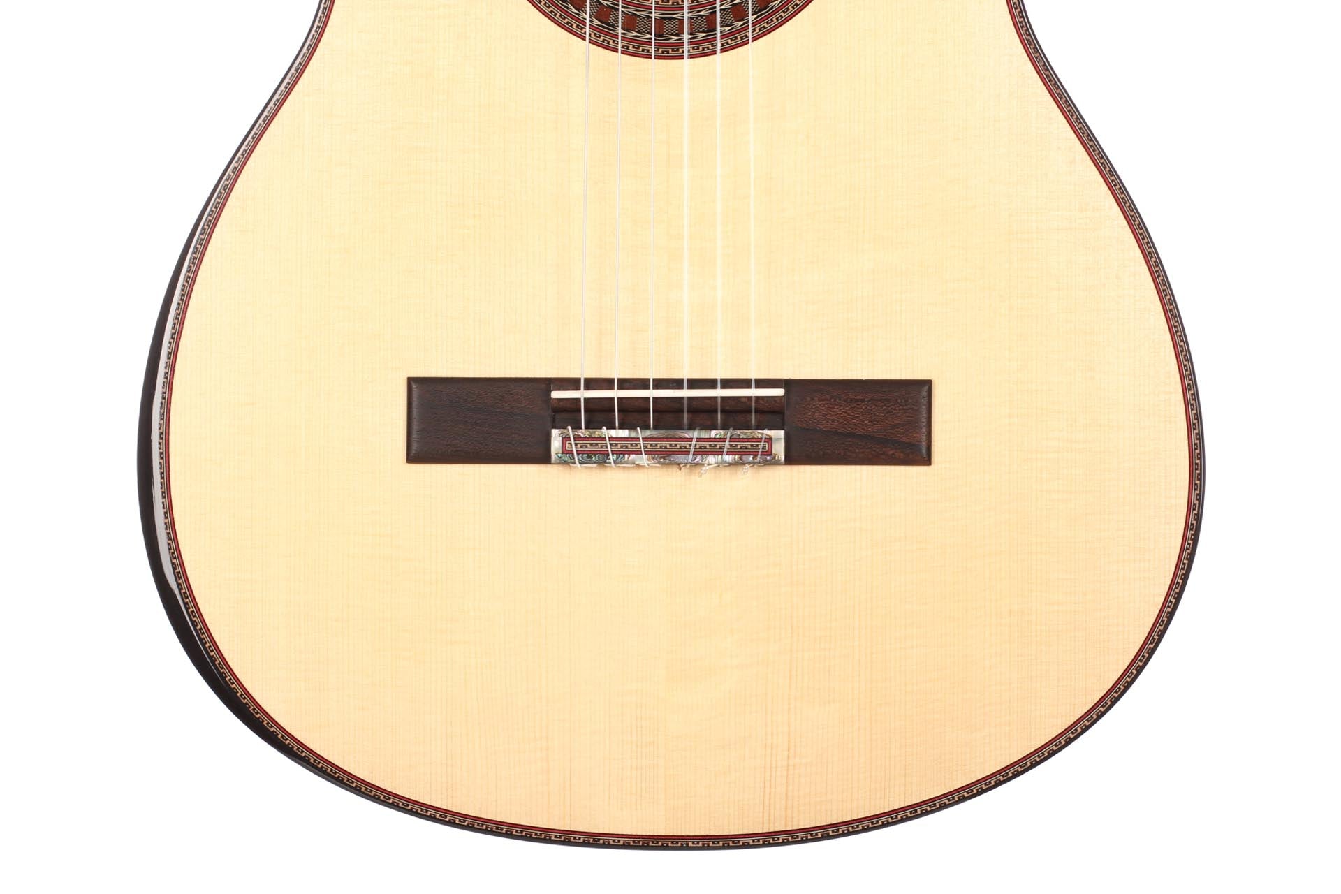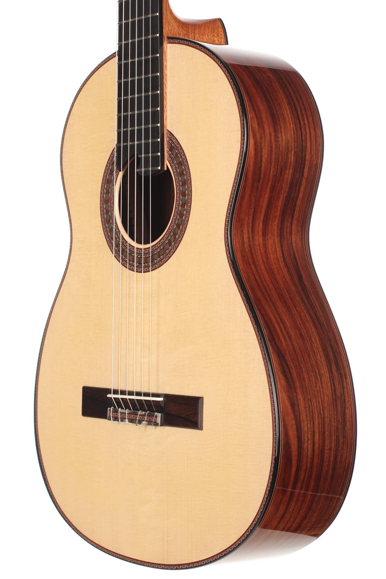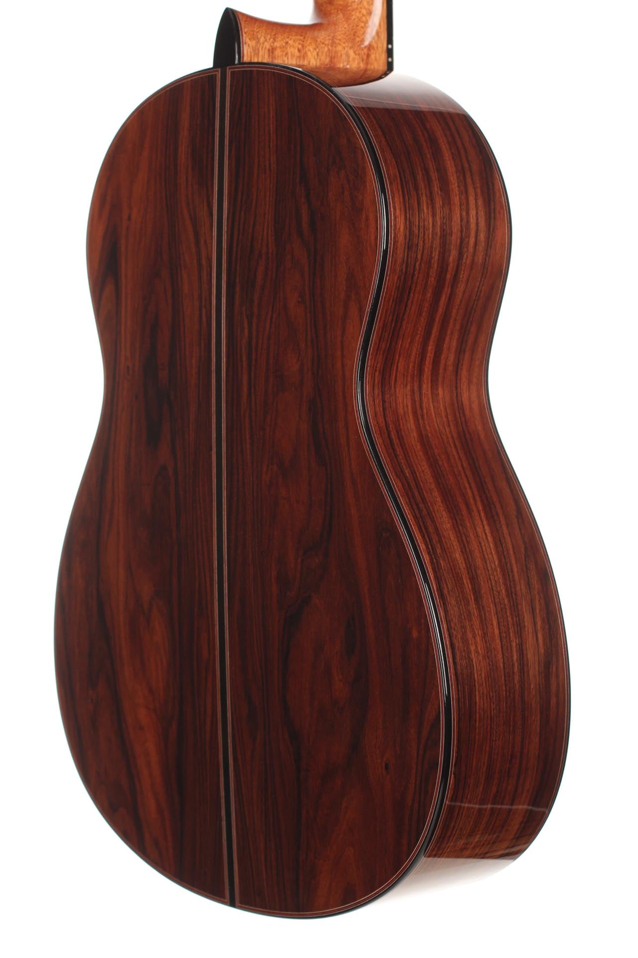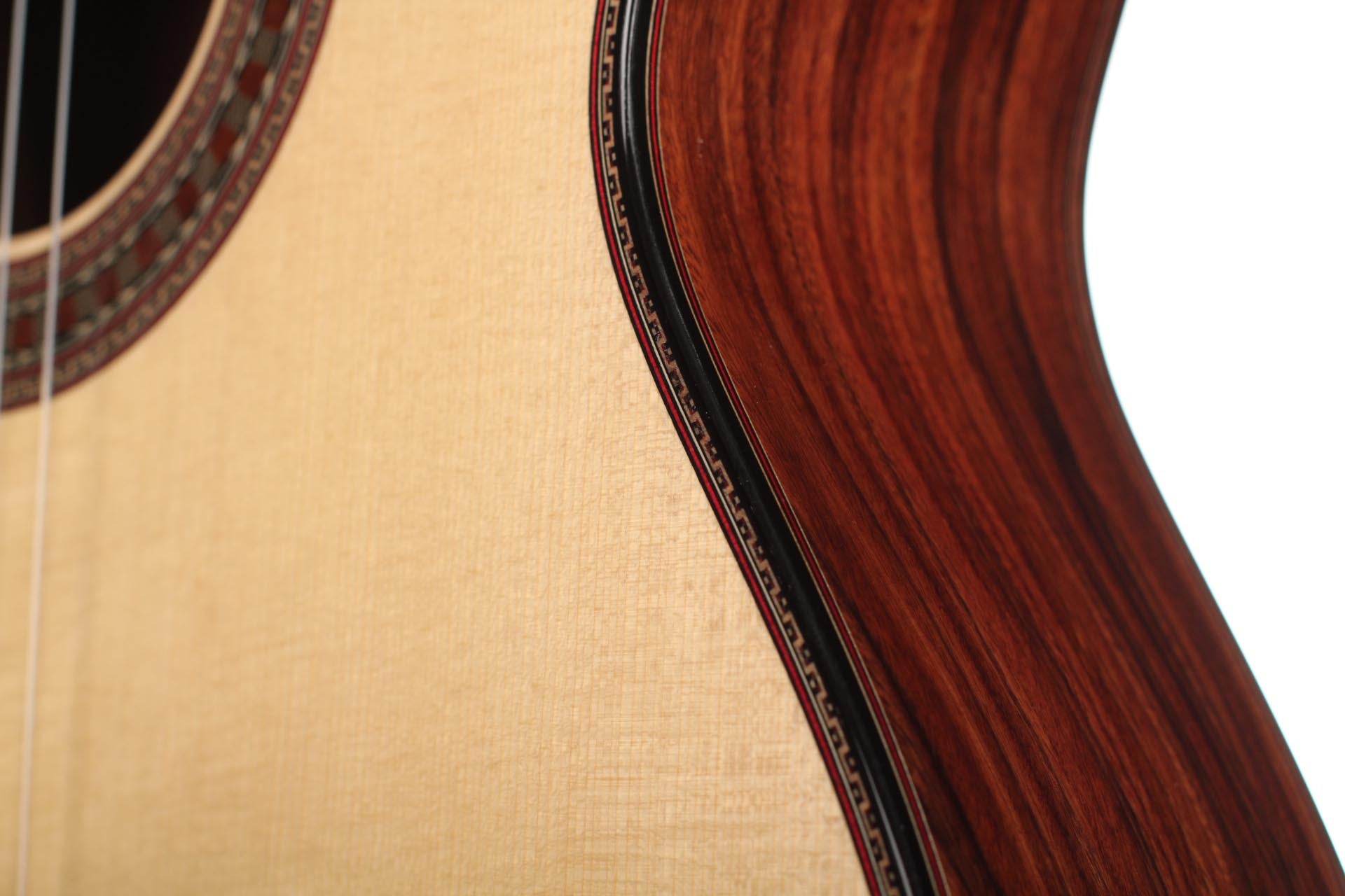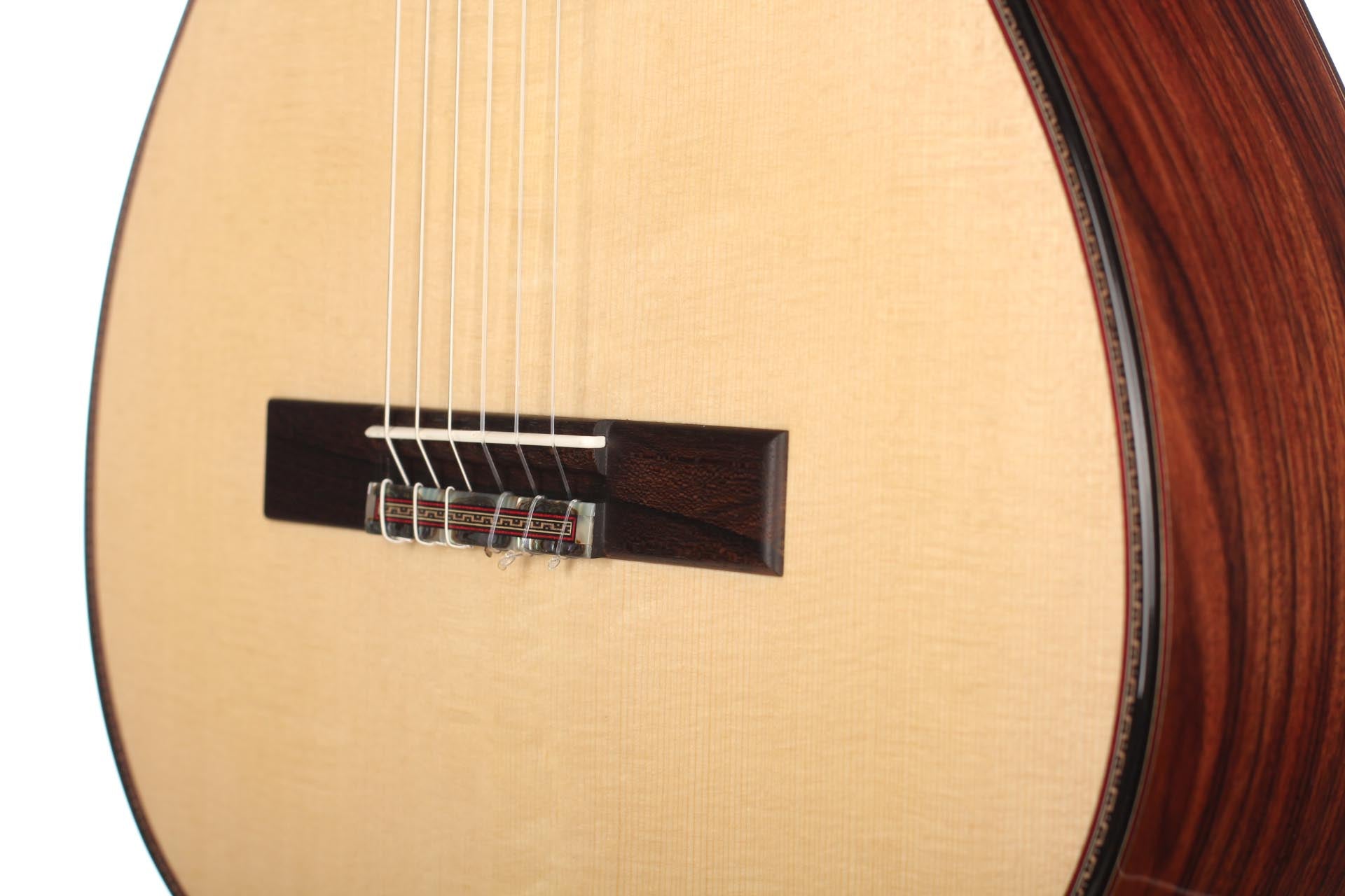 This beautiful guitar was developed in cooperation with „Siccas Guitars“. It has a variety of special features which can be found only on this guitar model. The decorative elements like rosette and ornaments around the edge were specifically designed, and give the instrument a more traditional look. The head has a crown with carvings, which were especially created for this guitar. The bridge with its 12-hole-drilling fits perfectly into the overall picture of the guitar and is additionally decorated with a beautiful mother of pearl surrounding at its tie block. In addition, it has a bevel, that allows your arm to lie more comfortably on the edge. The marvelously worked wave-like end of the fingerboard over the rosette matches the rounded wooden tuning pegs perfectly. To simplify barré, the fingerboard is horizontally arched, and furthermore raised to enable the easy use of higher frets. In fact, the playability is amazing. It is a stunning concert guitar that can fill great auditoriums as well as smaller intimate concert halls. Its generous sound is projected to the back door with great ease and comfort for the player as well as for the audience. These qualities are truly special for a freshly built spruce top guitar and are one of Roy’s great achievements. This guitar allows great dynamics, from cello to harpsichord and from whole orchestra to single singer. This is a great instrument that will blossom in the hands of a committed guitarist. The tuners are made by Rubner. A Hiscox Pro II hard-shell case is included. This guitar is CITES-free (CF).